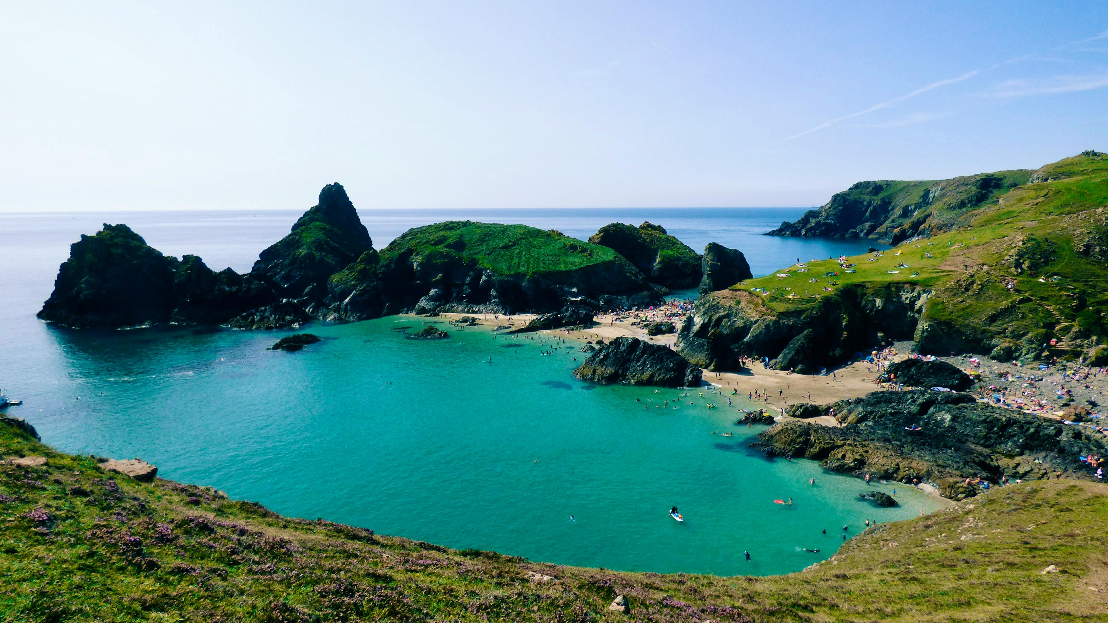 | Kynance Cove | Cornwall | Exploring caves, coastal walks, swimming | National Trust café, toilets, scenic views | 10–15 min walk from car park, uneven paths |