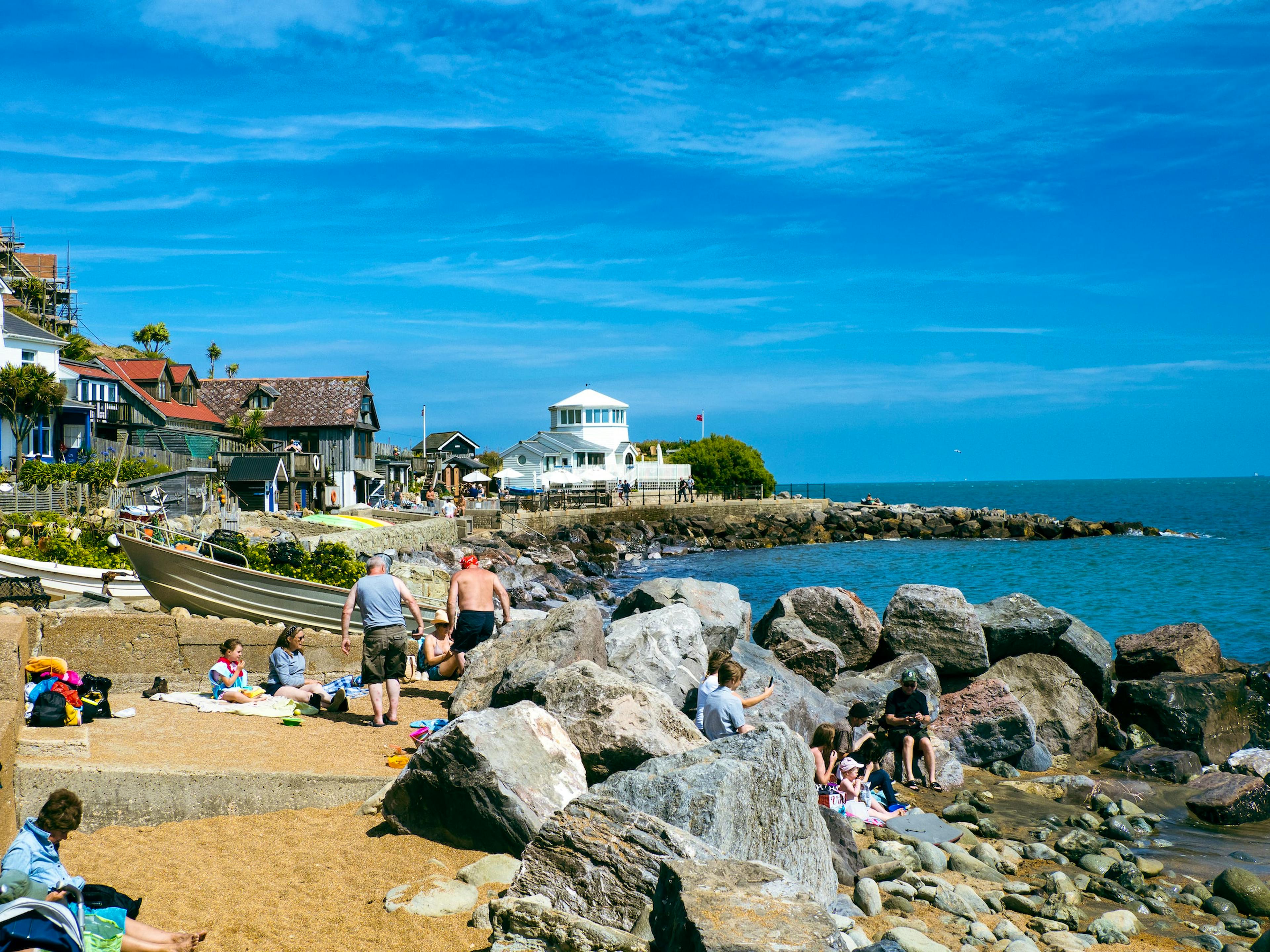 | Steephill Cove | Isle of Wight | Peaceful days, seafood, family visits | Café, deckchairs, beach huts, no road access | Footpath from Ventnor, no direct vehicle access |