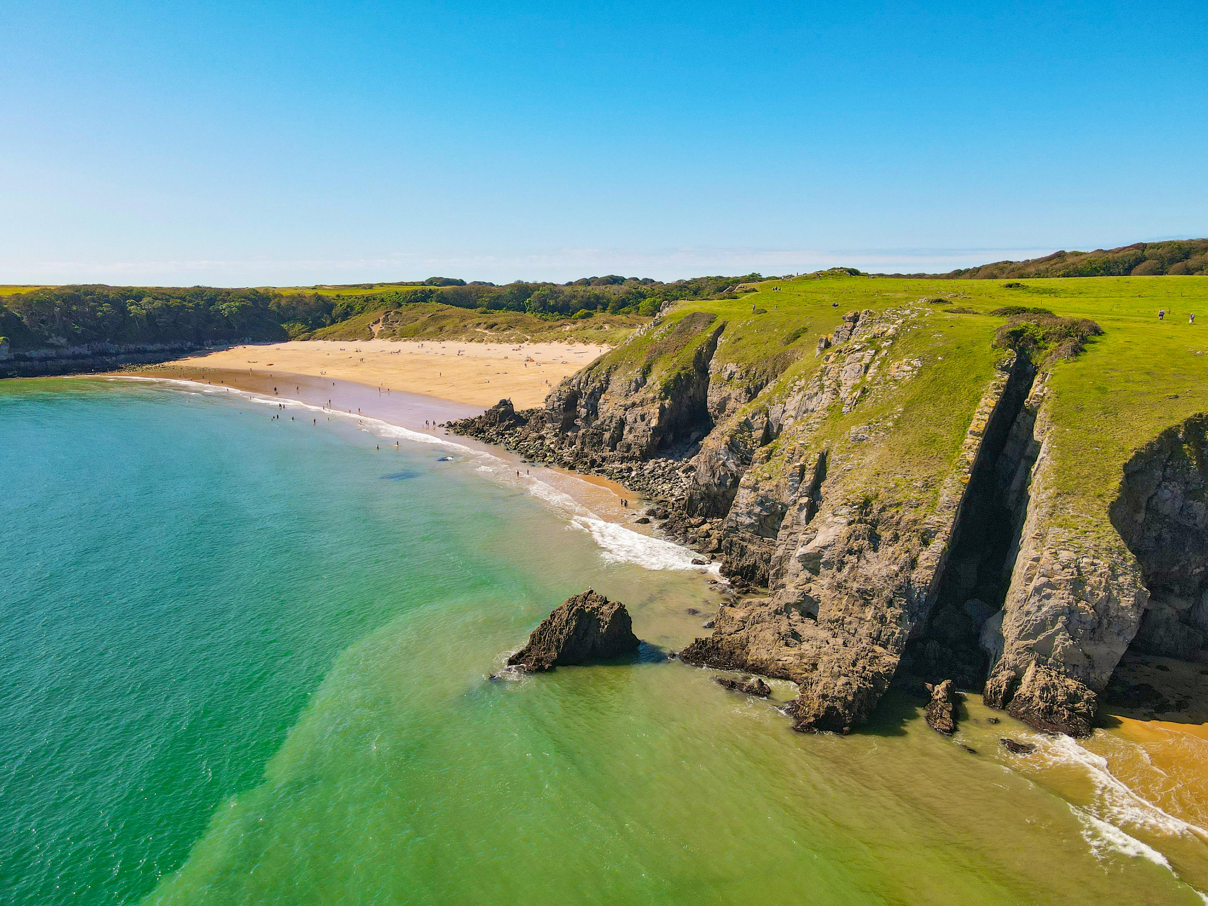 Barafundle Bay in Pembrokeshire is often named the most secluded Welsh beach. Accessible only by a half-mile walk along a cliff path, it rewards visitors with golden sand, turquoise waters, and peaceful surroundings. Its remote setting and lack of facilities make it a perfect choice for picnics and quiet escapes.