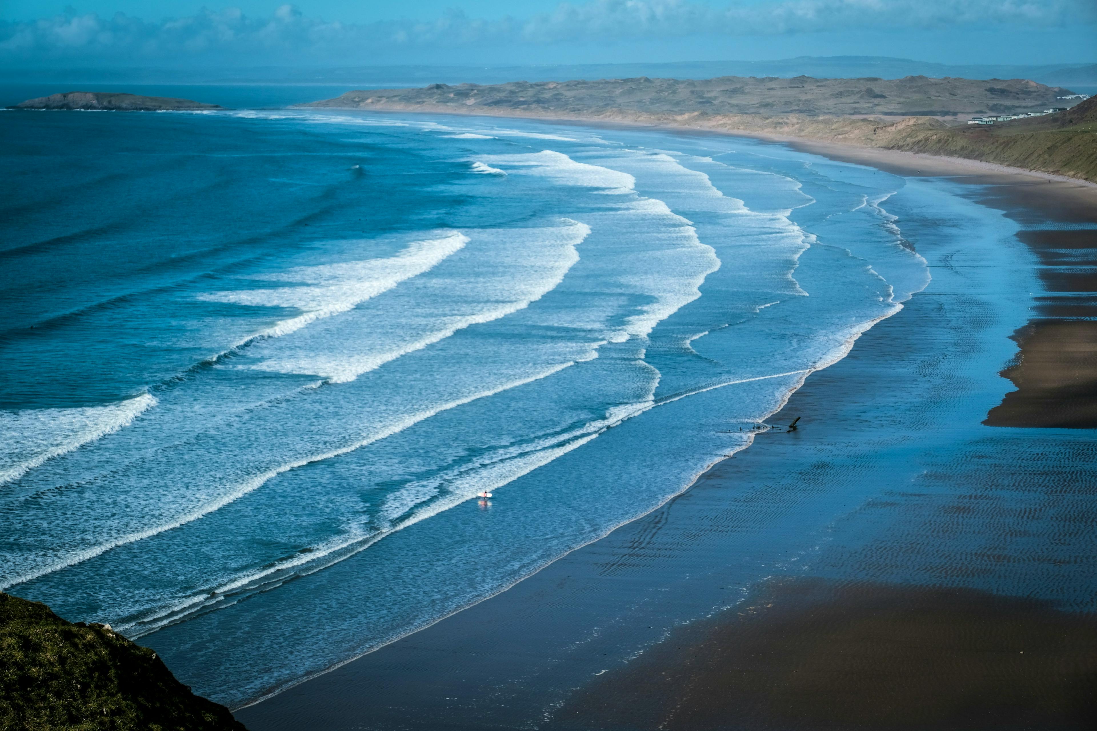 Llangennith Beach on the Gower Peninsula is the top surfing spot in Wales. Known for consistent waves and long sandy stretches, it’s perfect for beginners and advanced surfers alike. Surf schools and board rentals are available nearby, and its relaxed atmosphere makes it a favorite year-round destination for wave seekers.