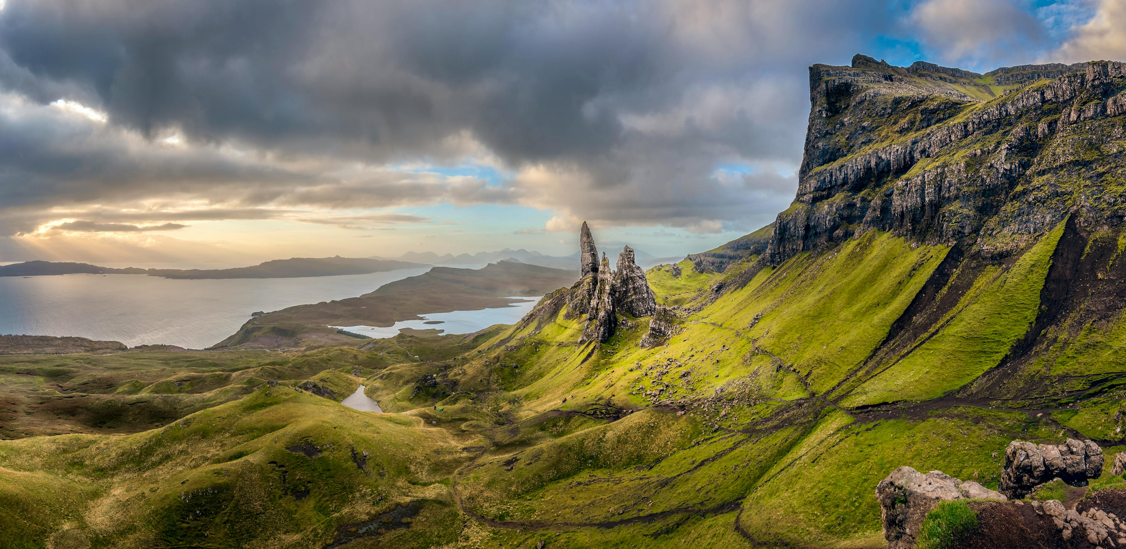 The Quiraing is a striking formation of rocks on the northernmost tip of the Trotternish Ridge. It’s a vast circle of jagged peaks surrounding a hollow, within which is a raised plateau about the size of a football pitch, called ‘the Table’. The rocks themselves have menacing nicknames like ‘the Prison’ and ‘the Needle’. It’s a striking, mysterious spot, the sort of place you can imagine druids meeting to perform ancient rites. Although these days you’re more likely to find hikers enjoying the fantastic views.