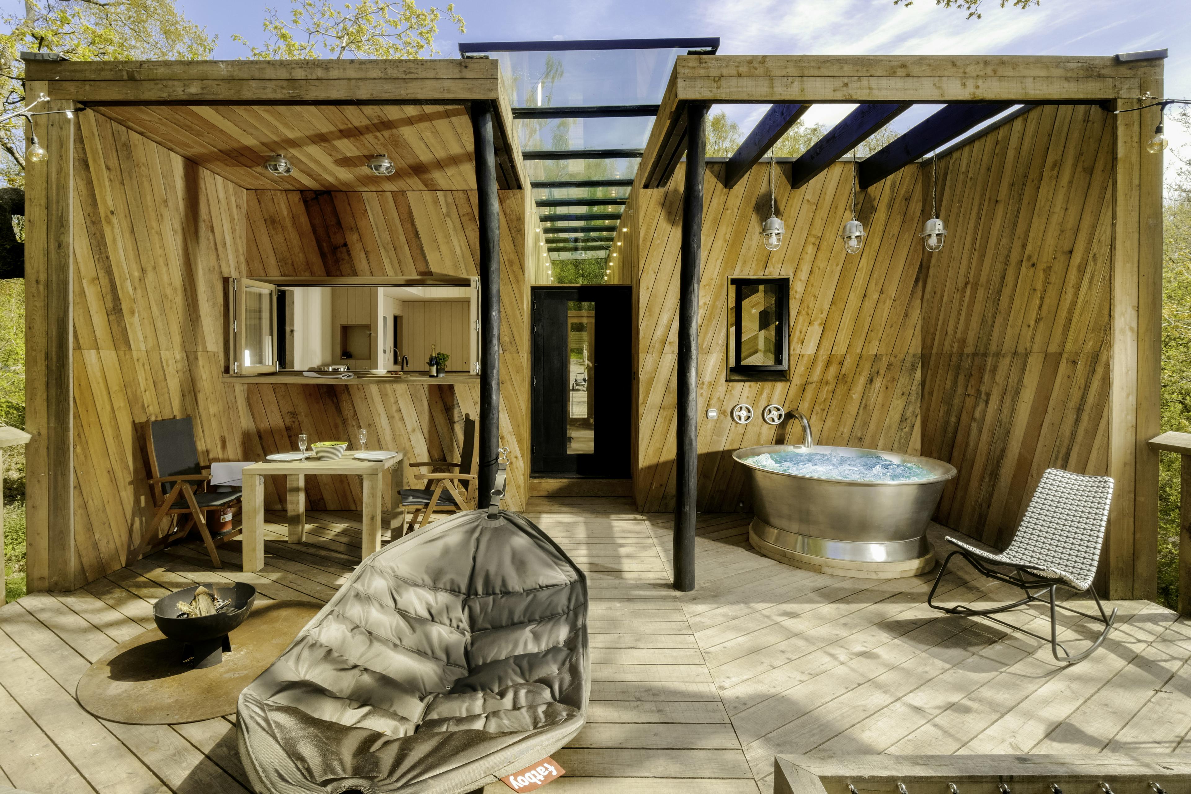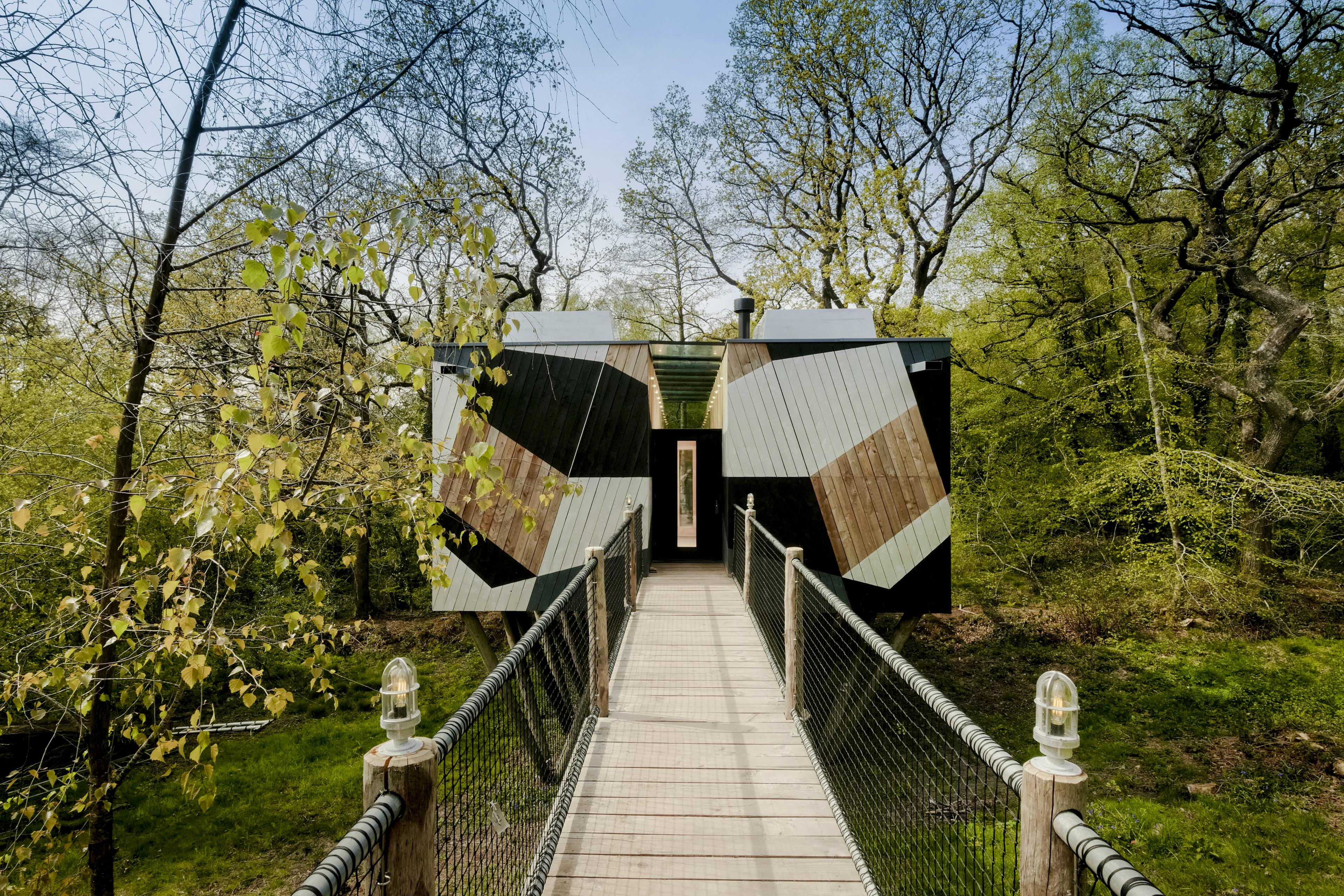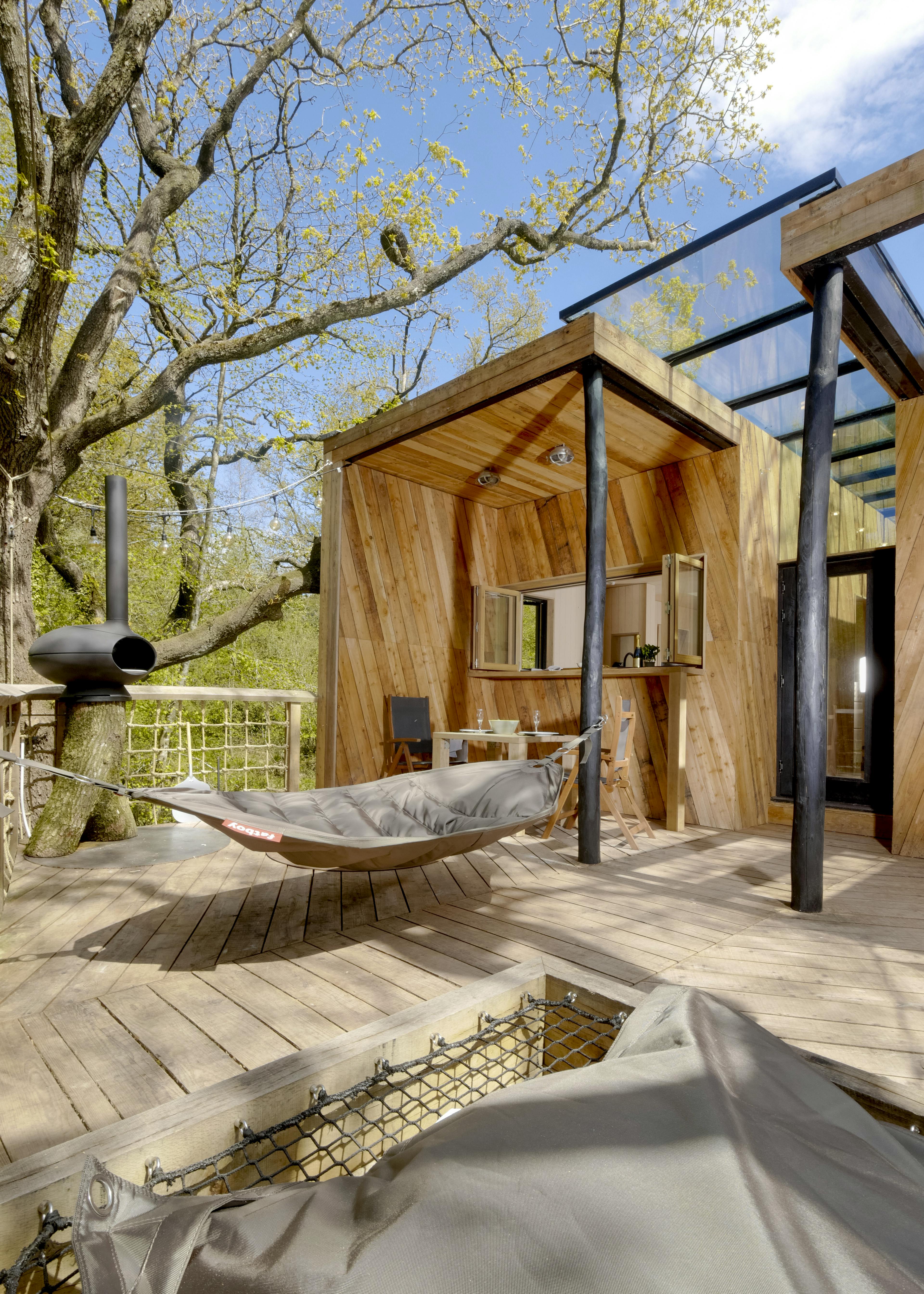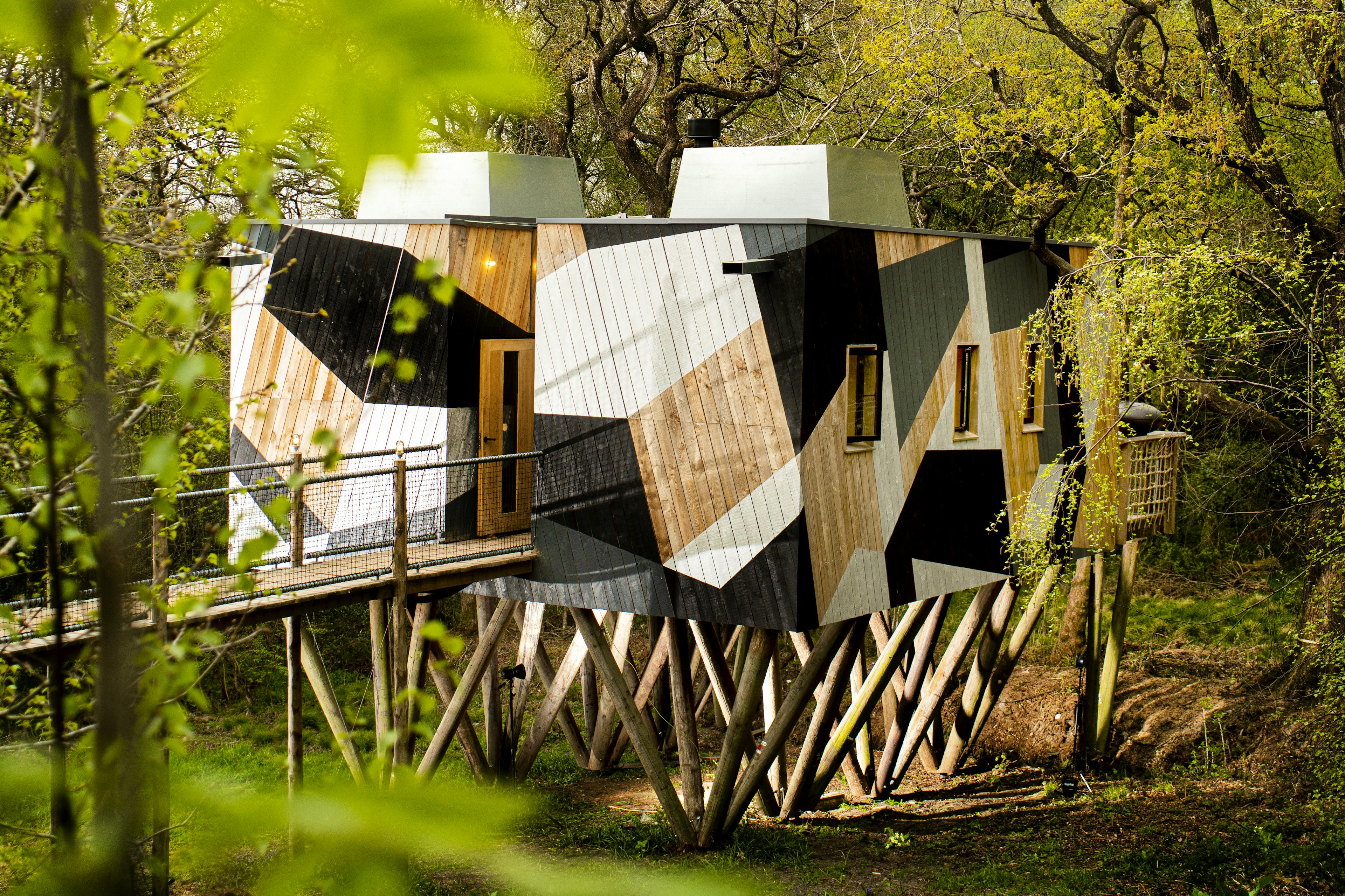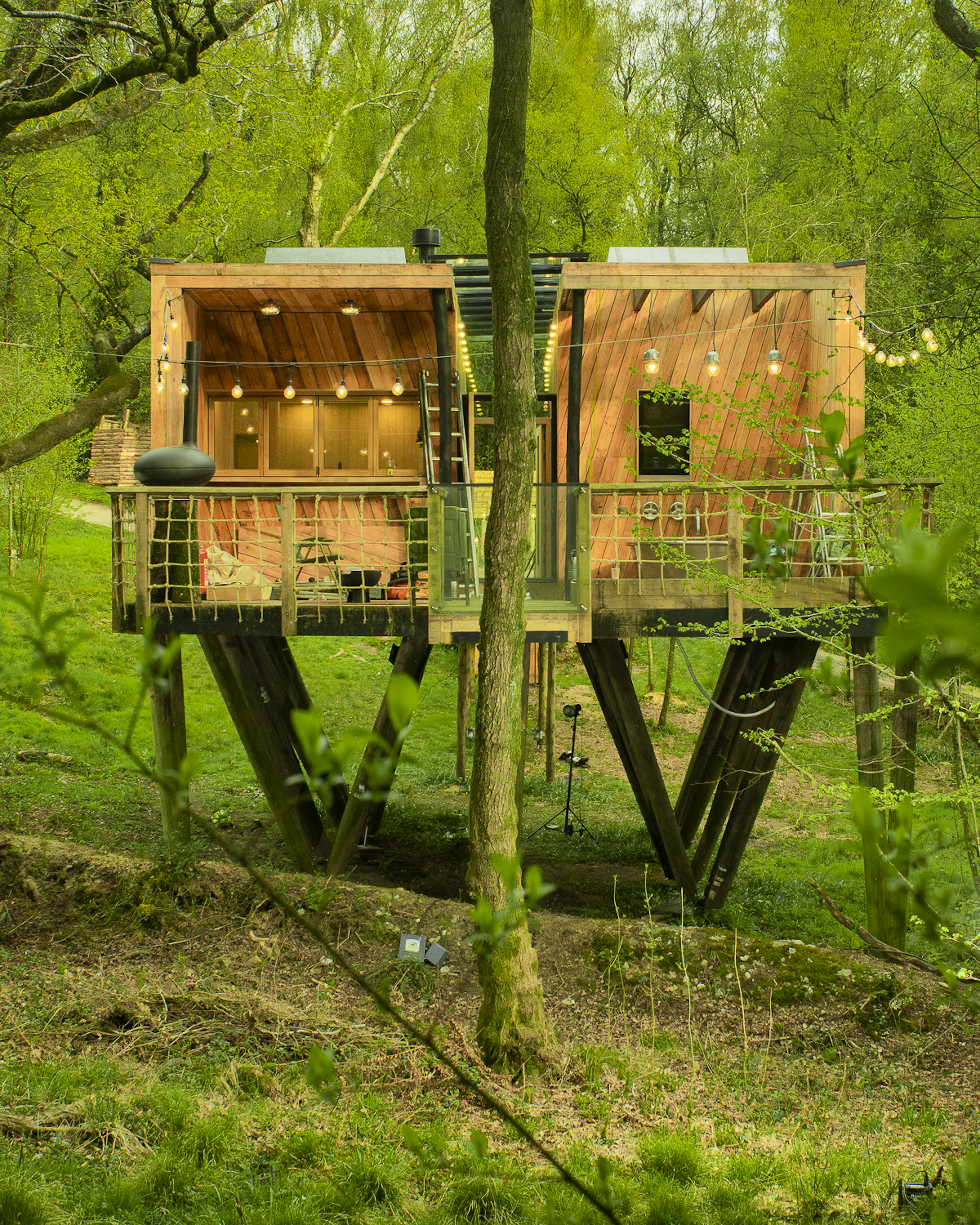 Architecturally extraordinary contemporary treehouse in Dorset from award-winning designers, with hot tub and pizza oven.