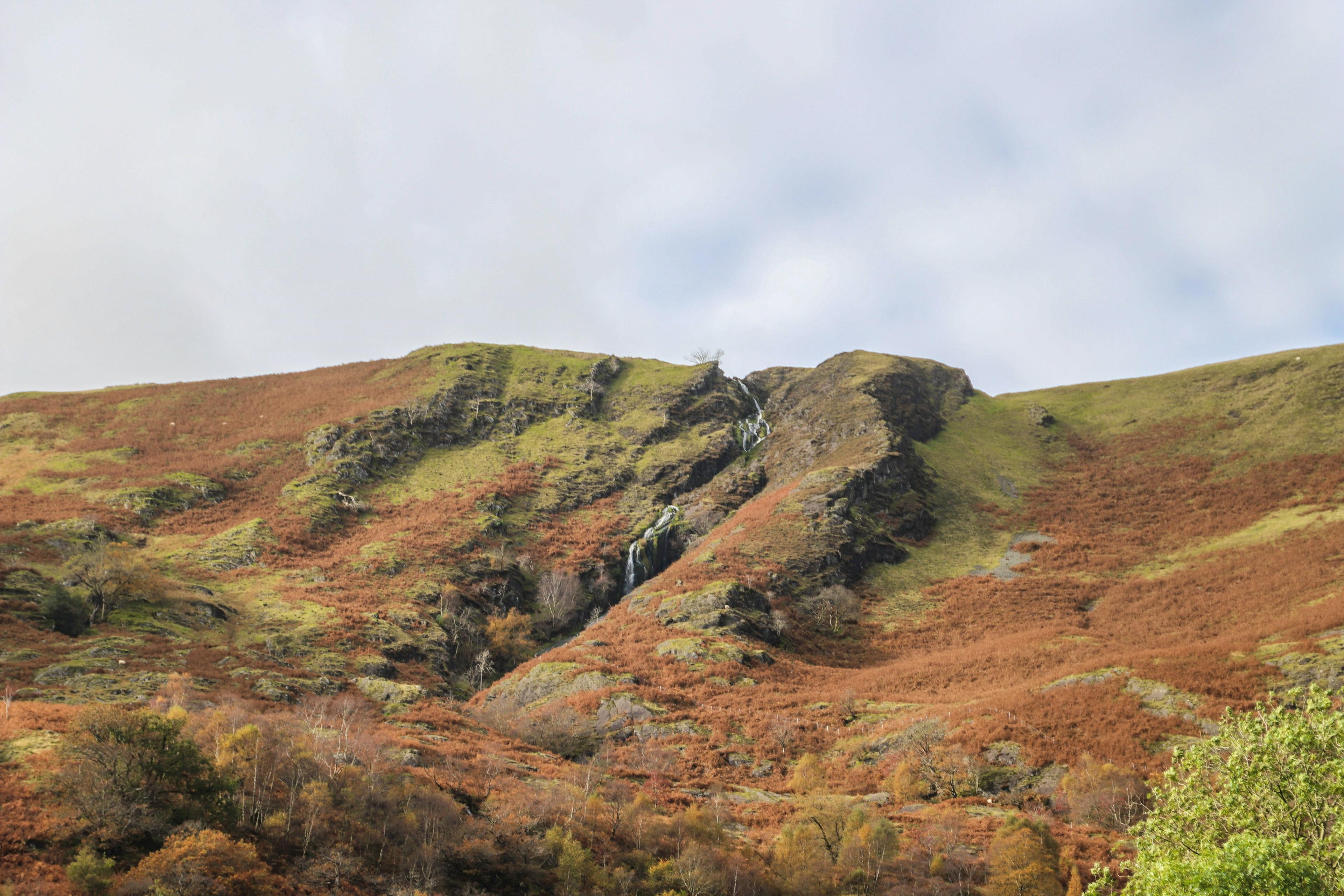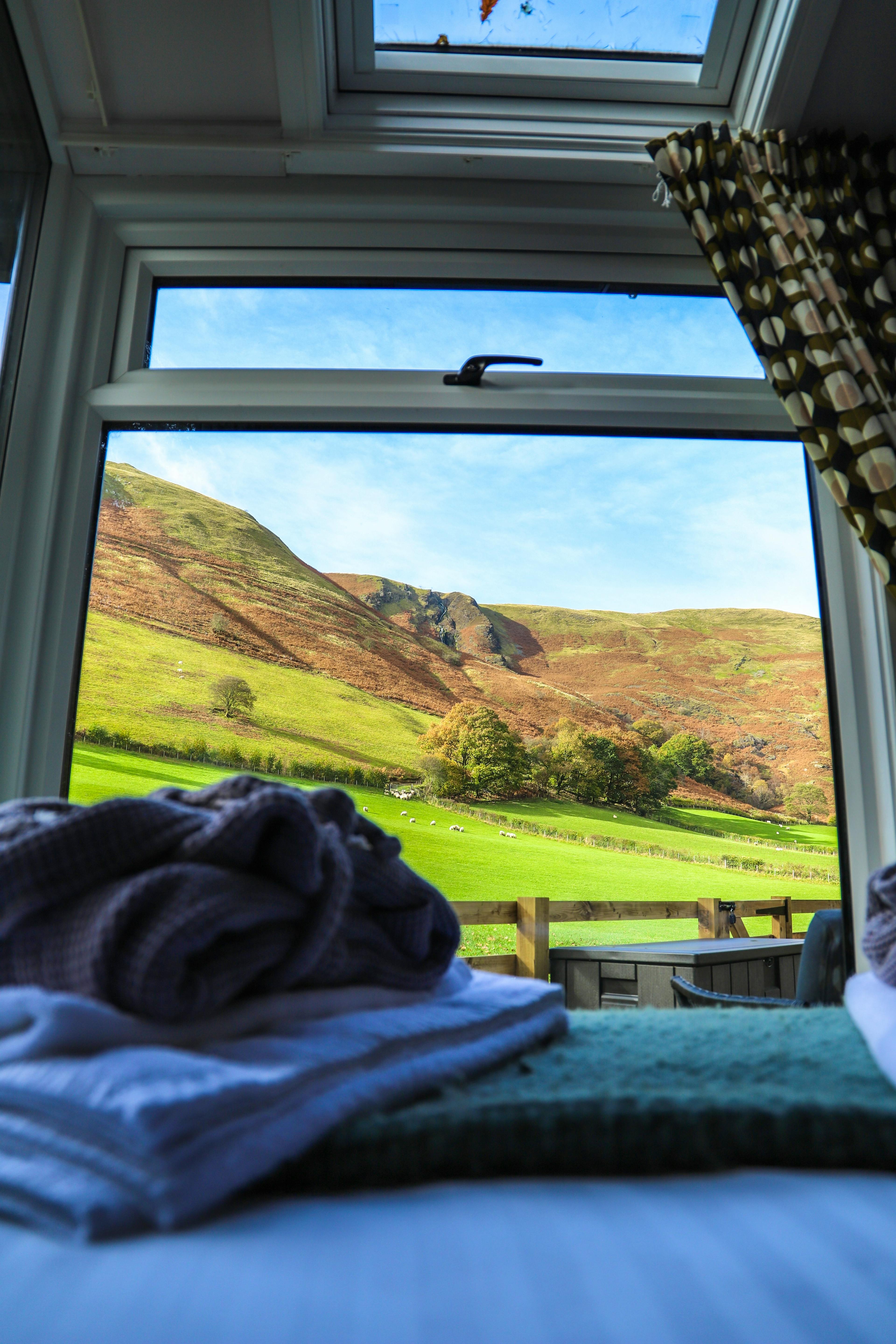 Nant Gwenyn’s double bed perfectly positioned to overlook a cascading waterfall through the trees.