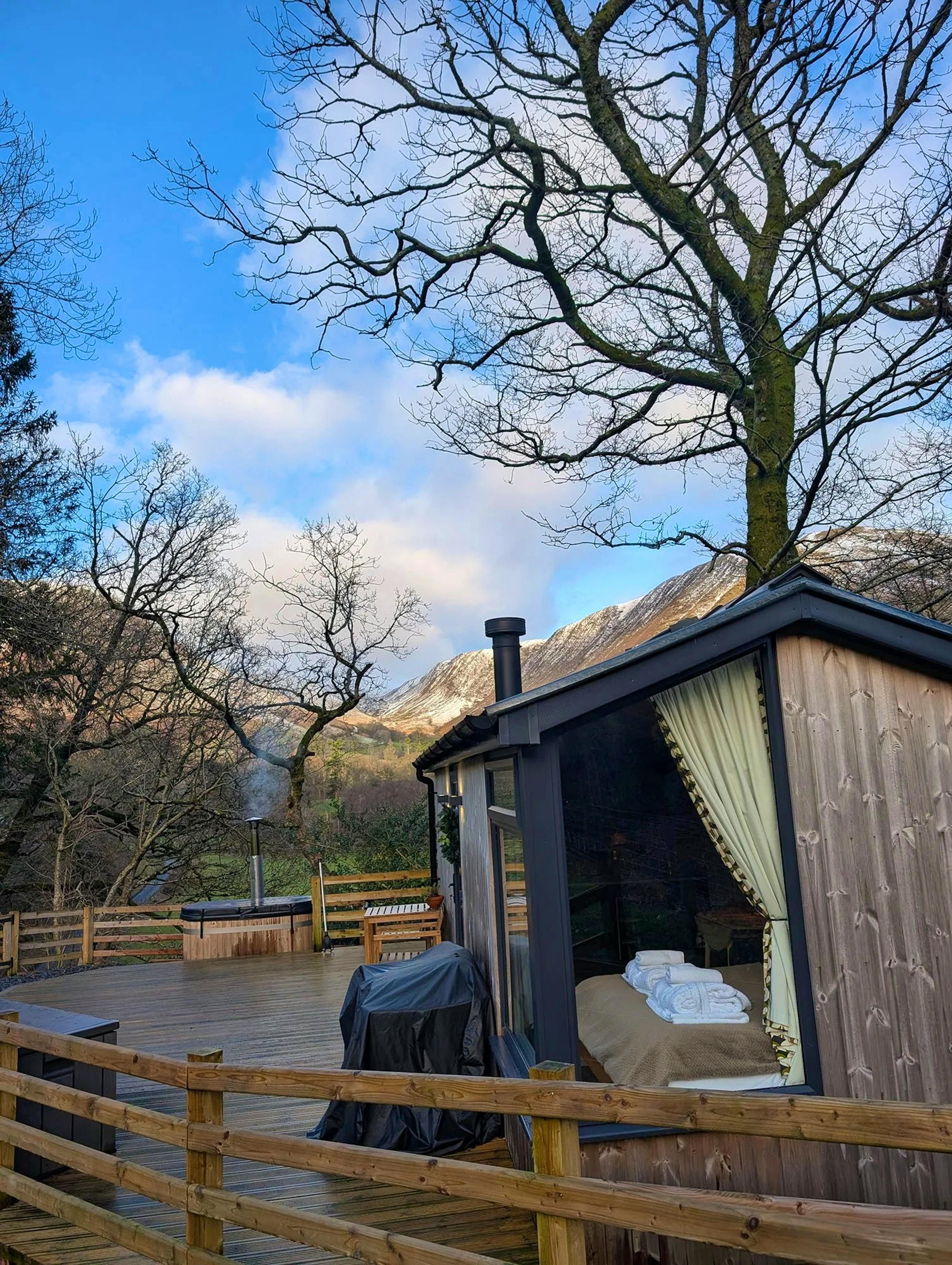 Secluded mountain cabins in South Eryri with waterfall views, wood-fired hot tubs and wild Welsh beauty.
