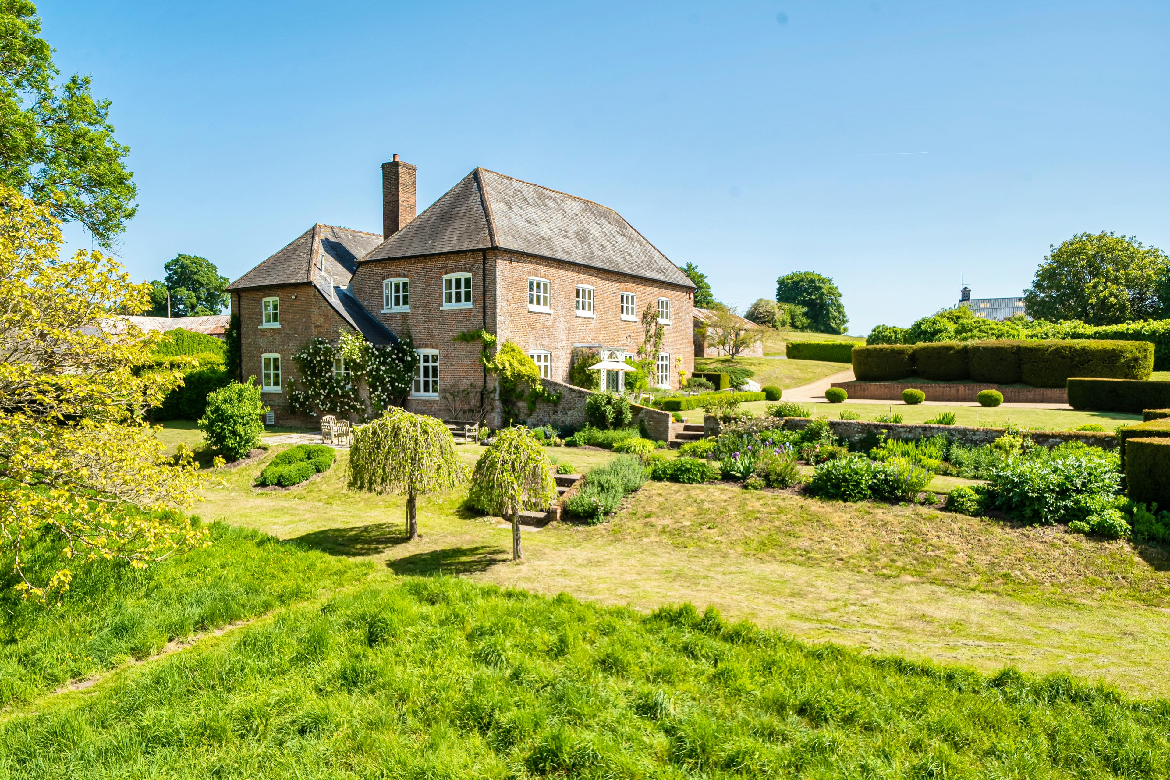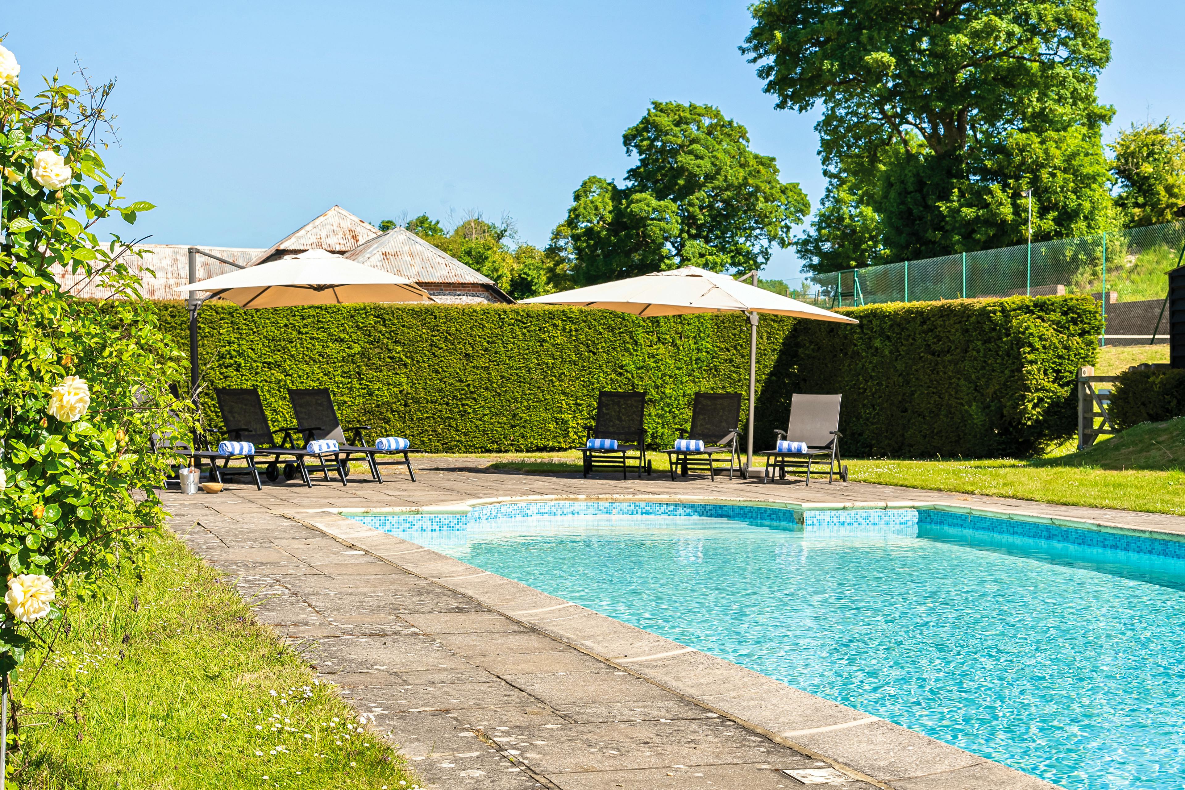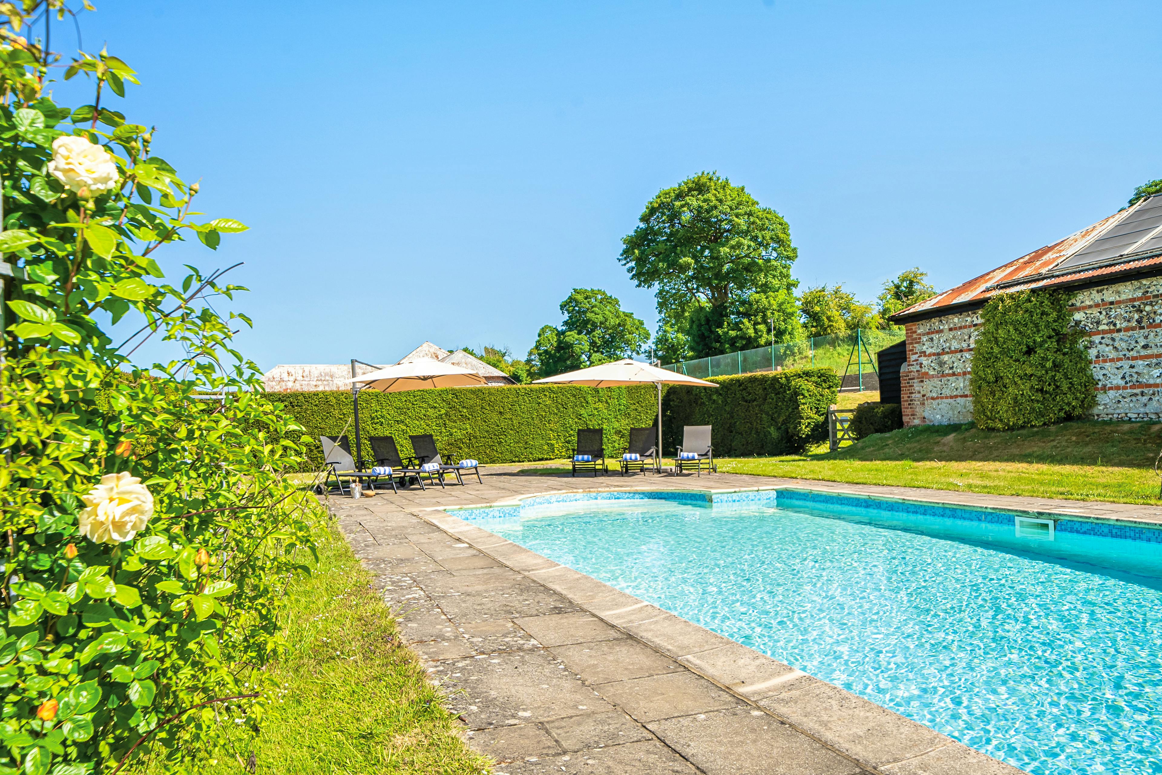 Unwind in this charming property tucked away on a stunning estate in the heart of Hampshire with a swimming pool, tennis court and sprawling grounds.
