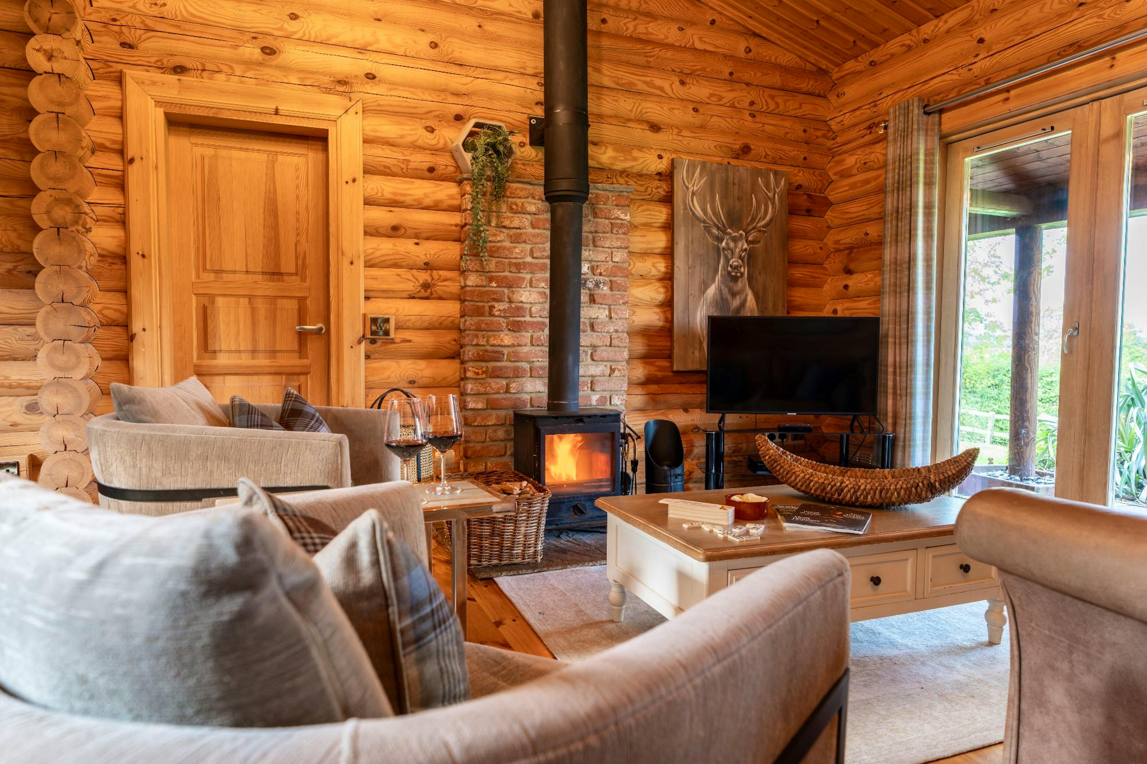 Open-plan living space with sofas, log burner, Smart TV and French doors opening onto the terrace for seamless indoor-outdoor living.