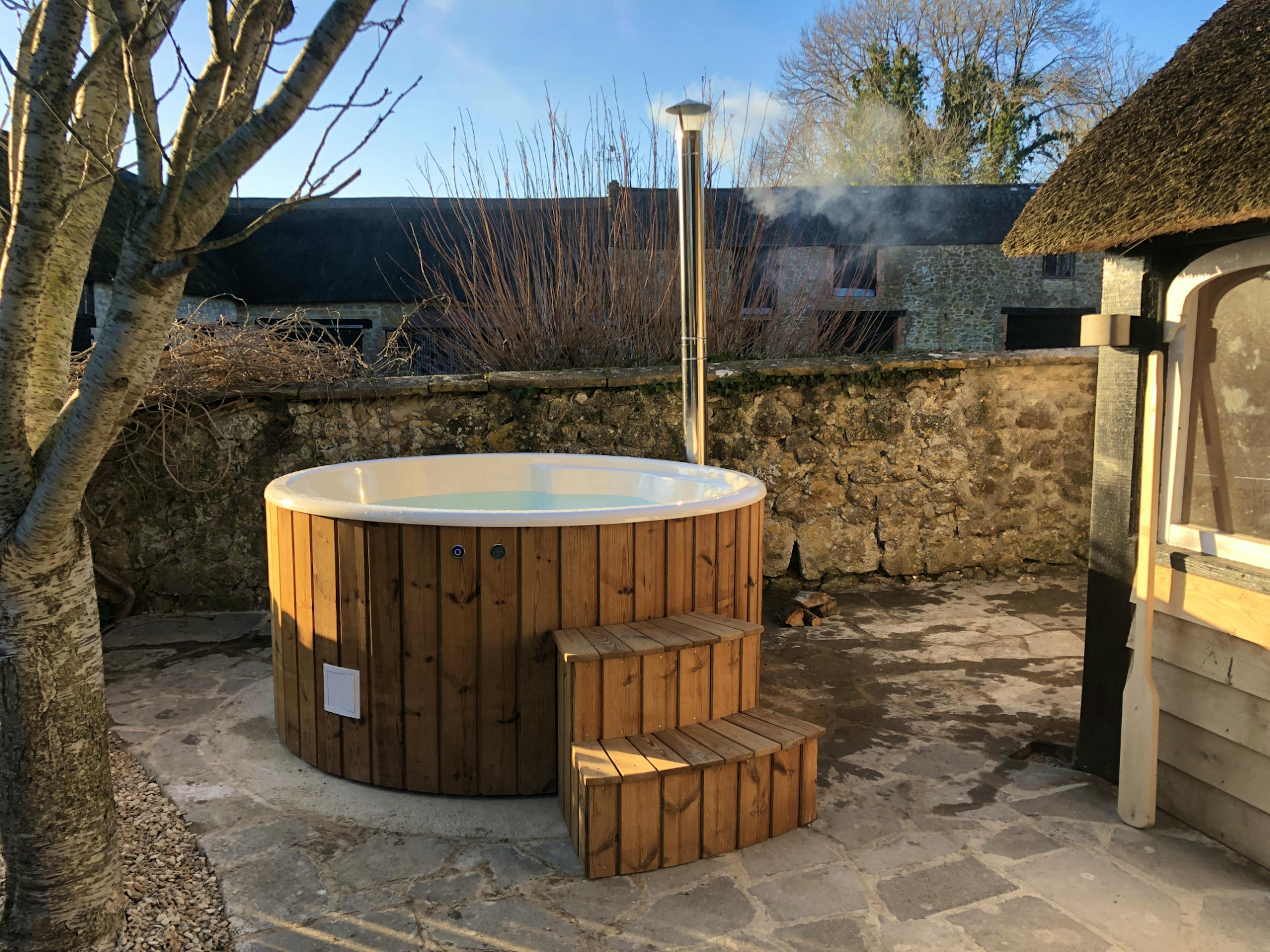 Wooden hot-tub complete with lights and an air-bubble system.
