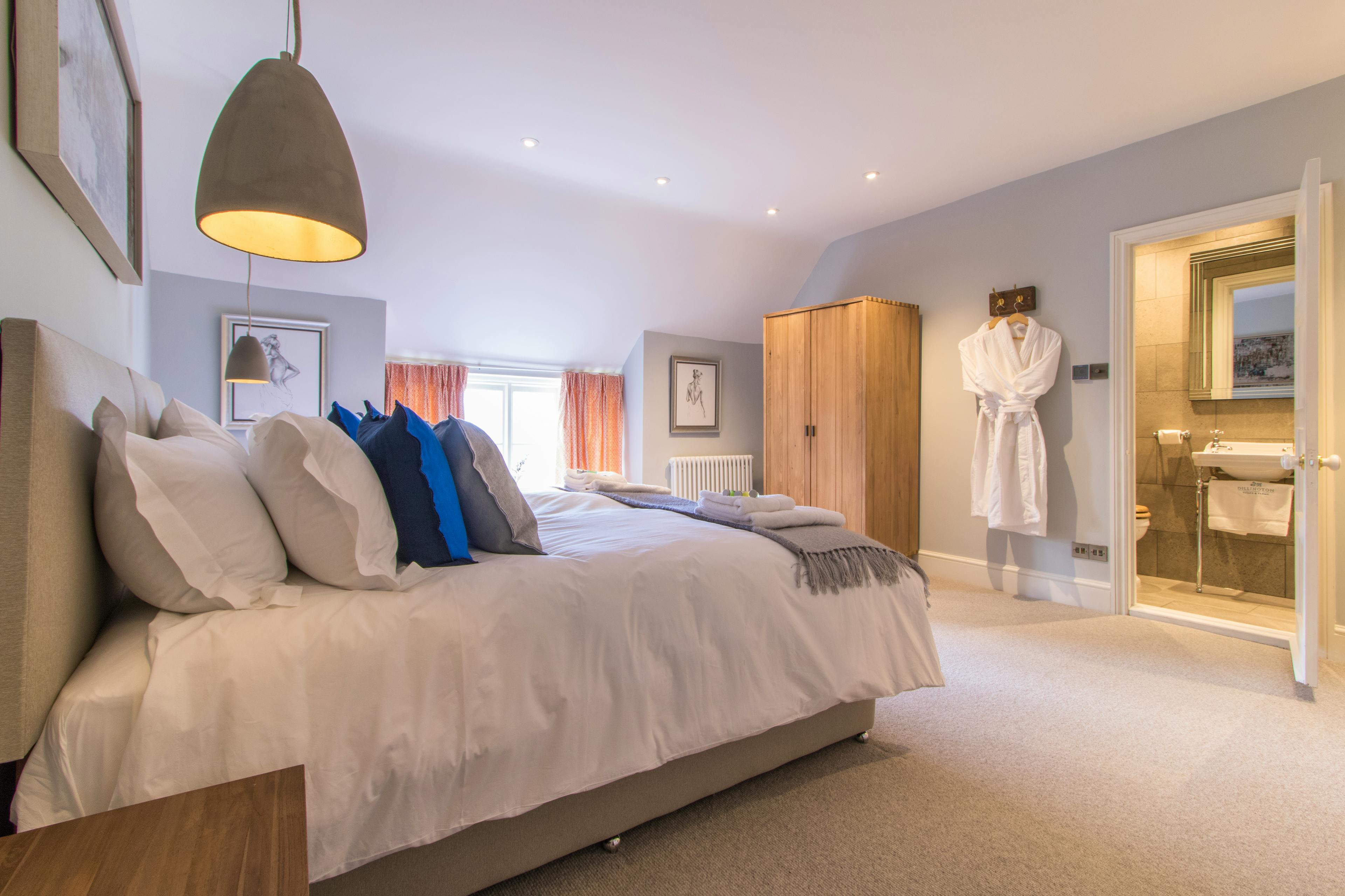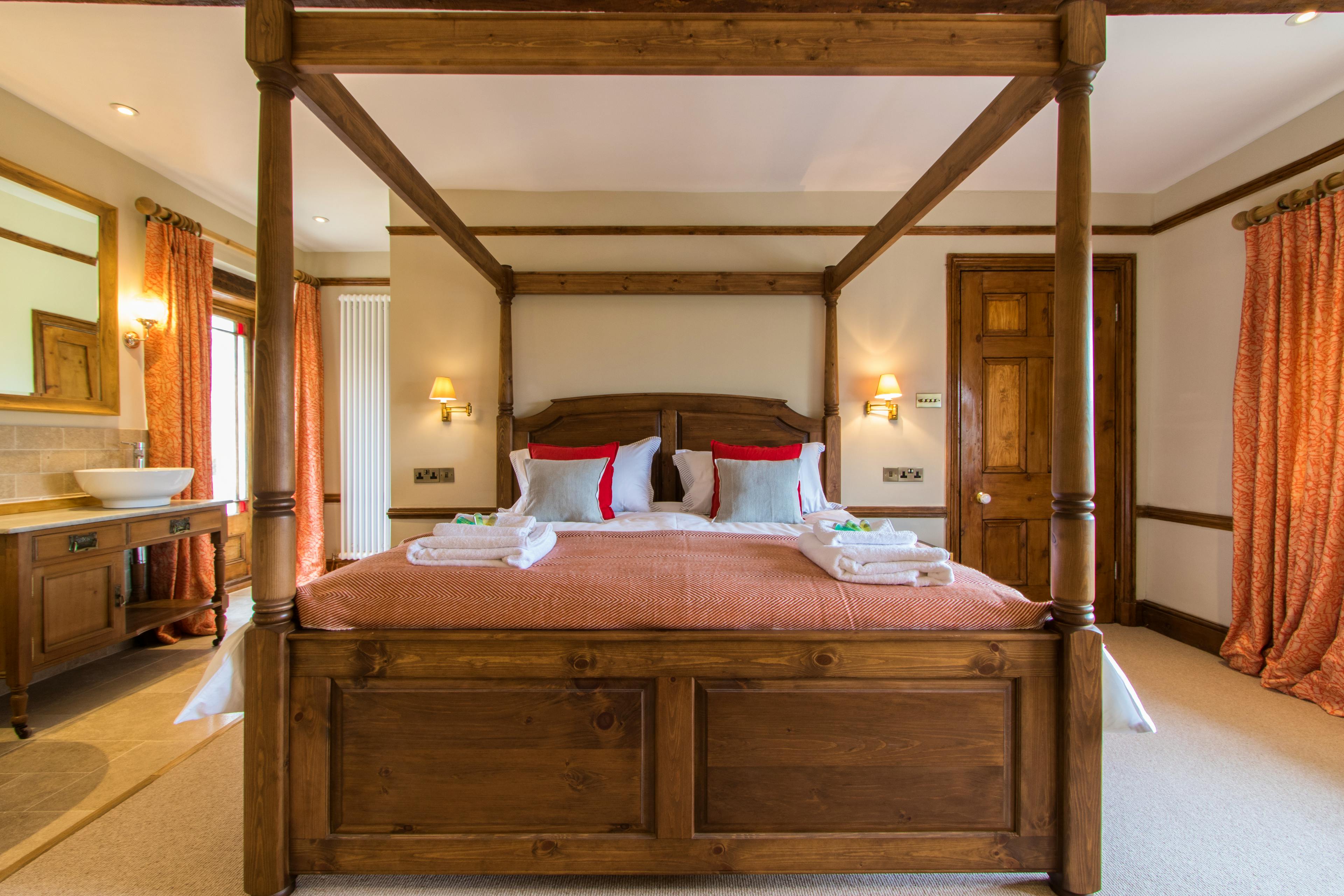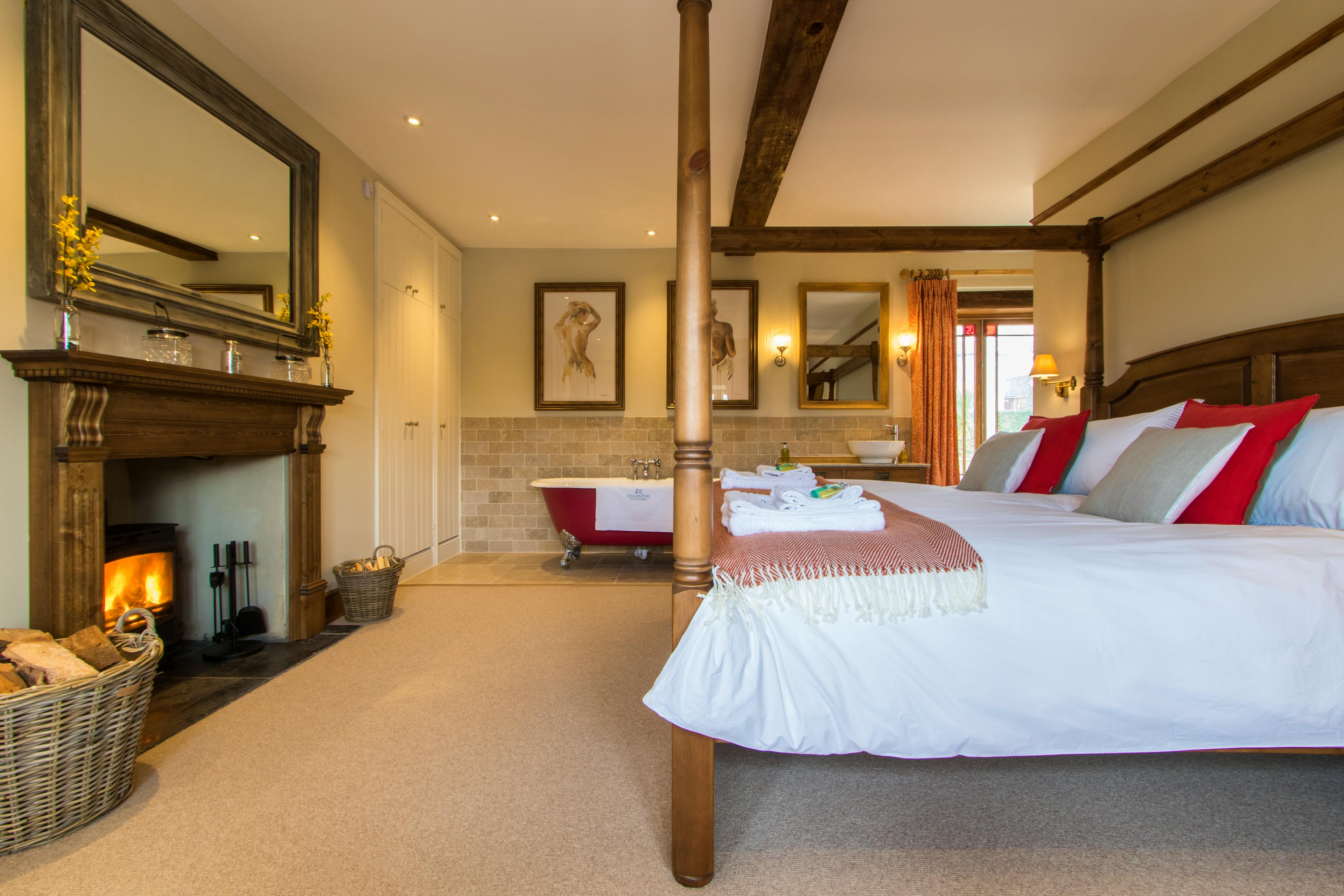 A master bedroom with a king-sized four poster bed, roll top bath and wood-burning stove.