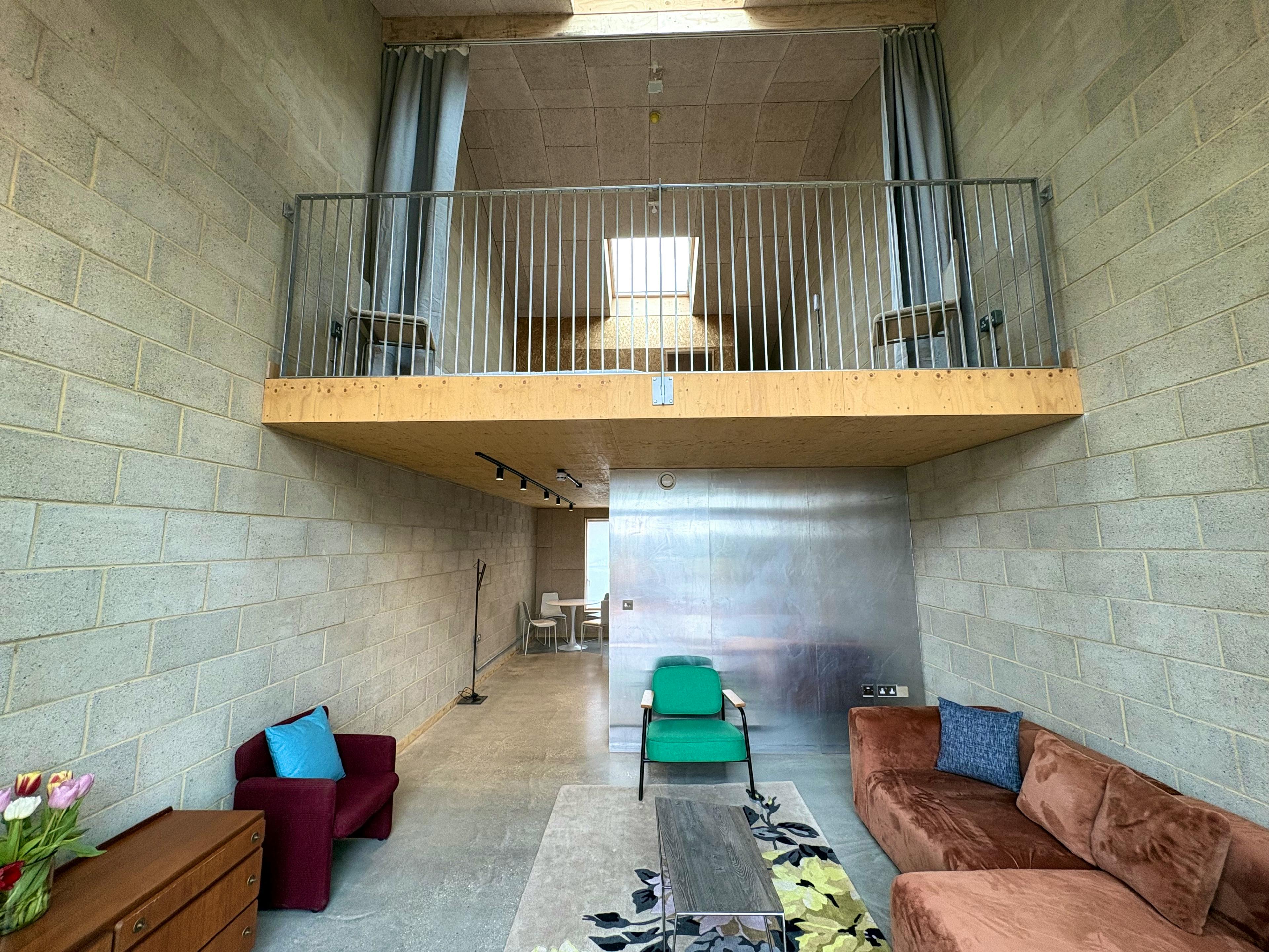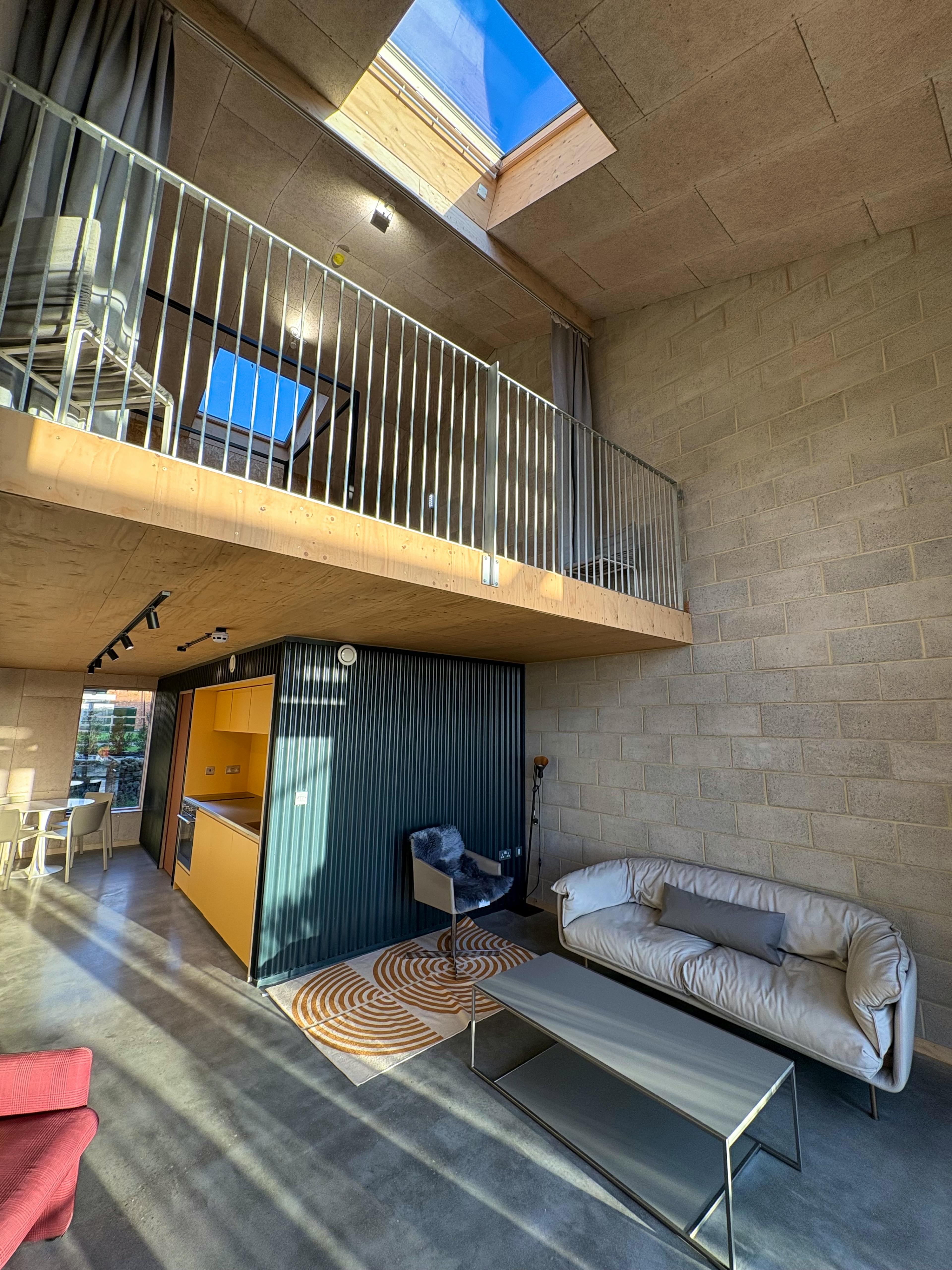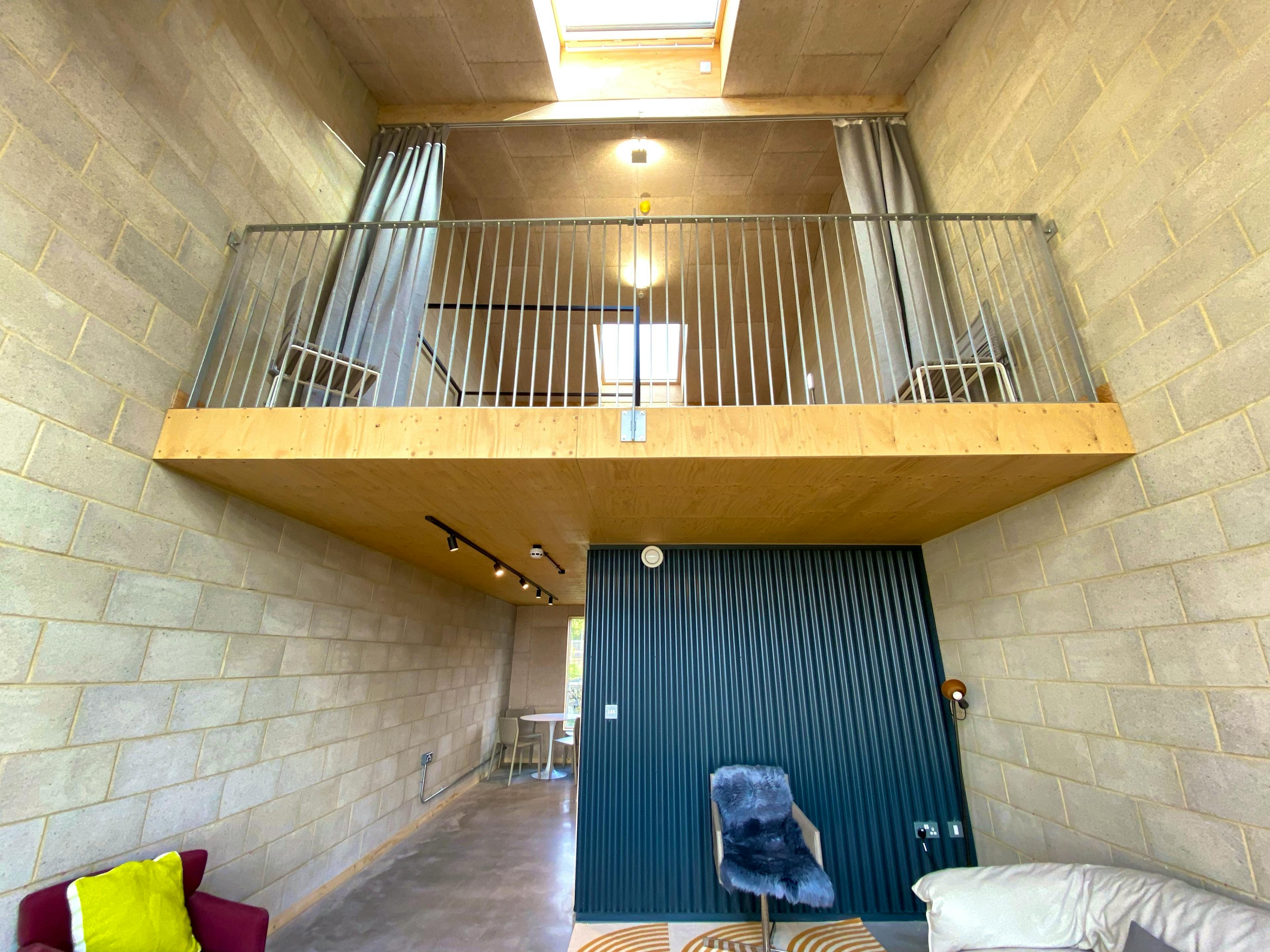 Double-height living spaces with mezzanine sleeping, polished concrete floors and exposed structural materials.