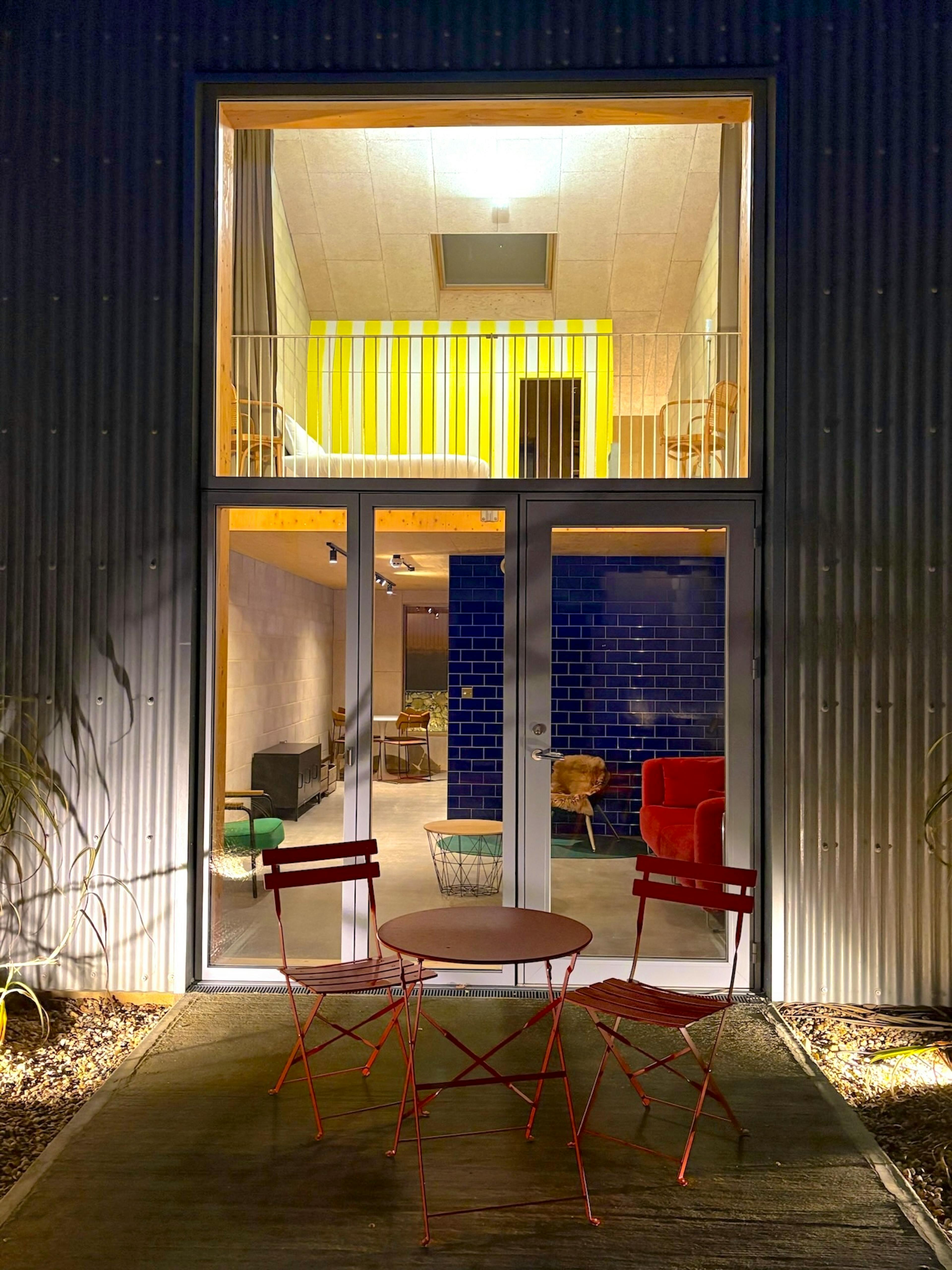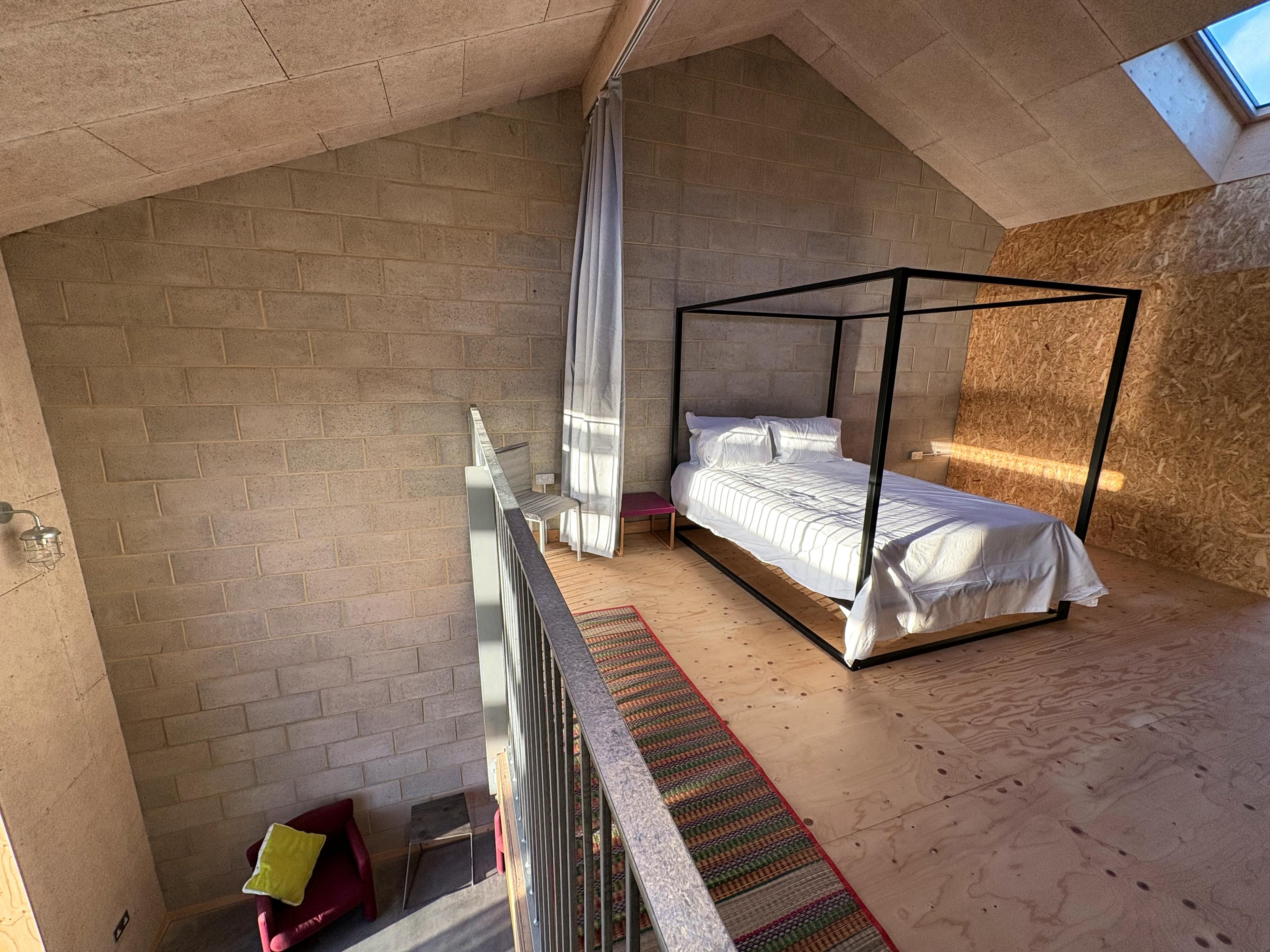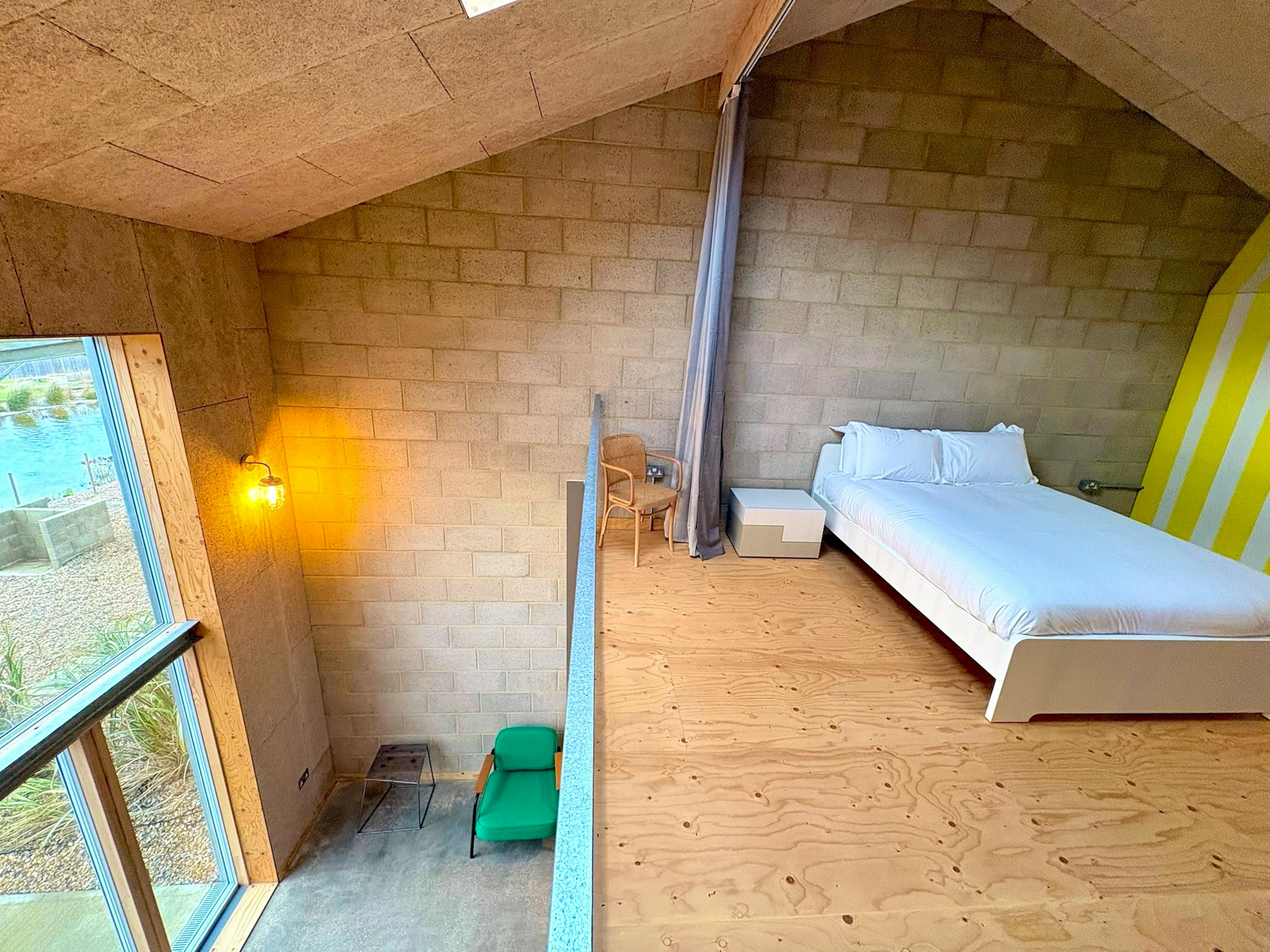 Double-height living spaces with mezzanine sleeping, polished concrete floors and exposed structural materials.