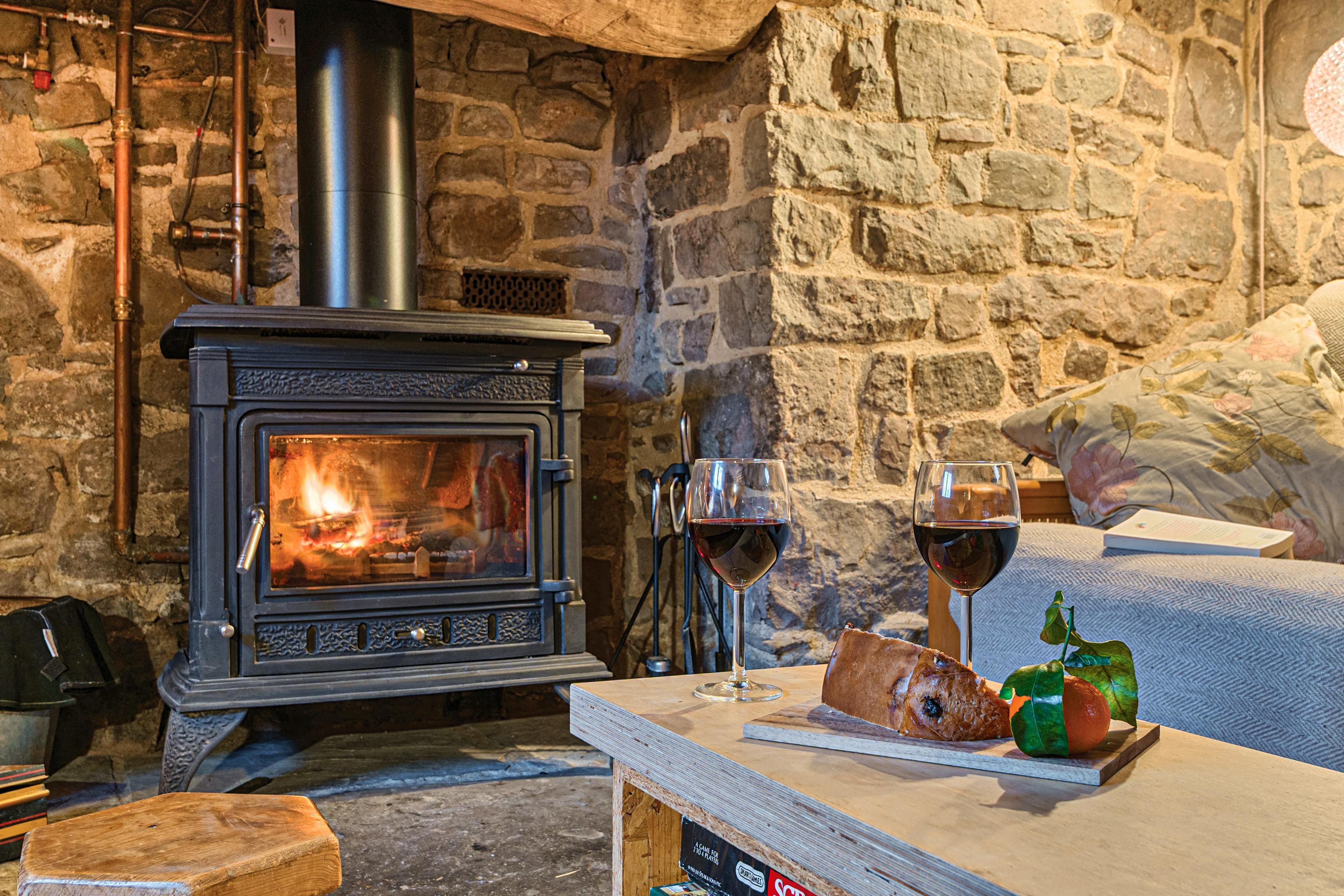 Cosy living room with wood burner, deep sofas and sustainable heating systems for year-round comfort.