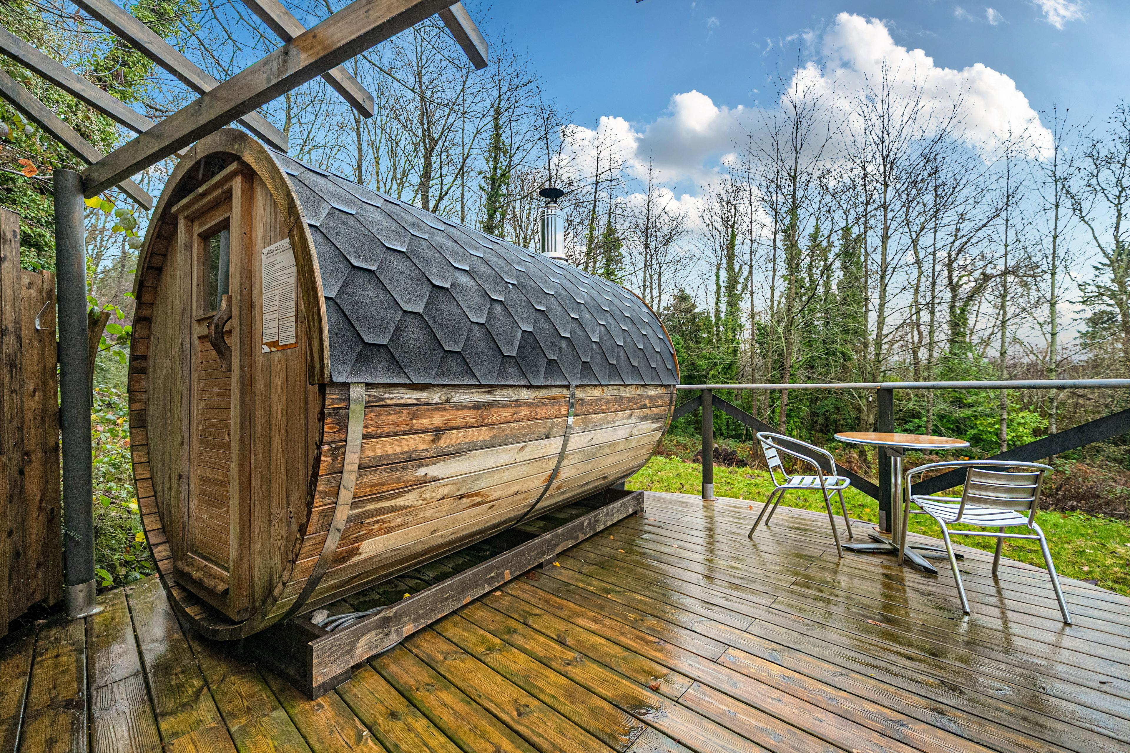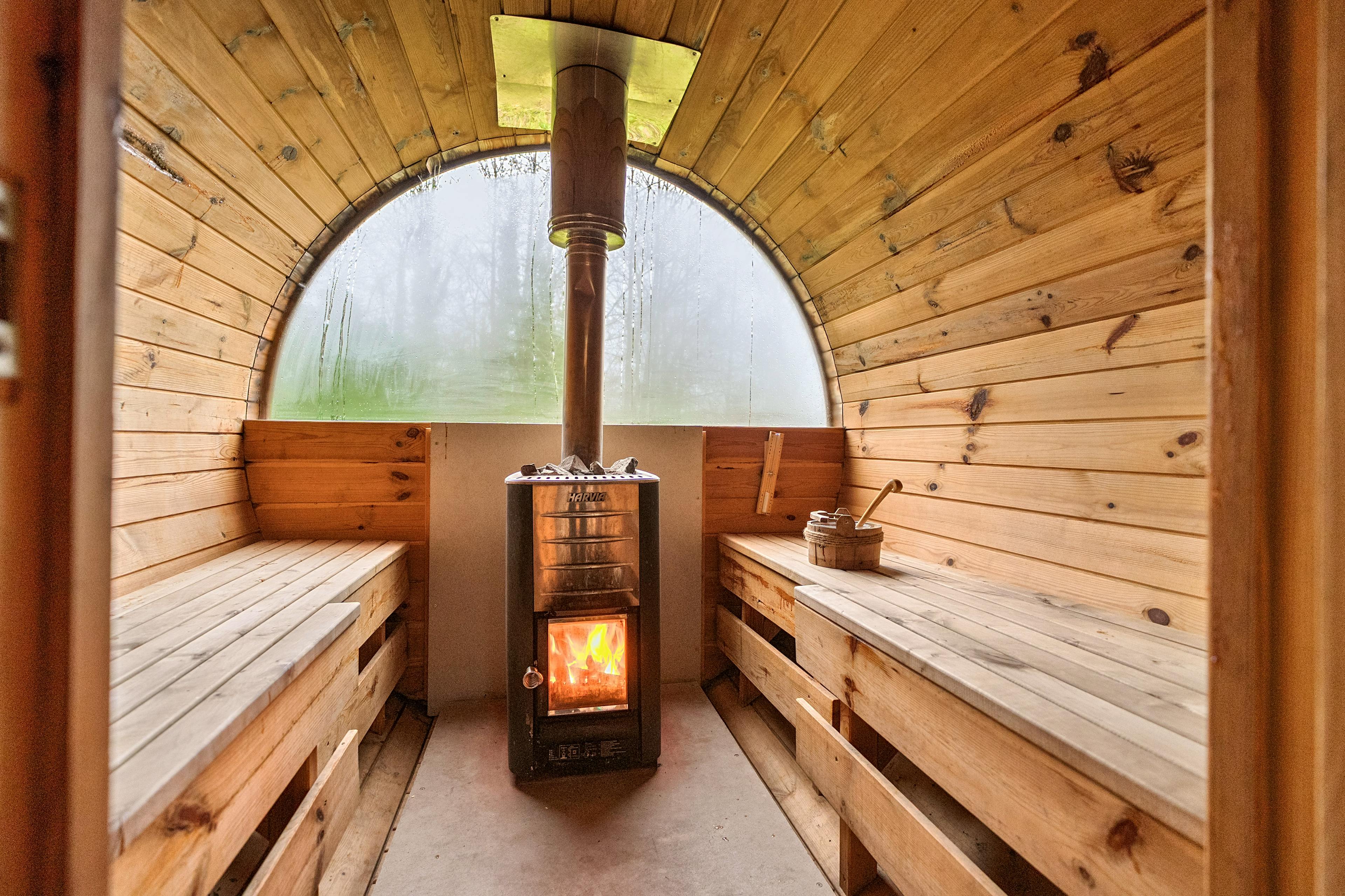 A secluded woodland sauna cabin with cold shower, perfect for post-walk relaxation and quiet moments.