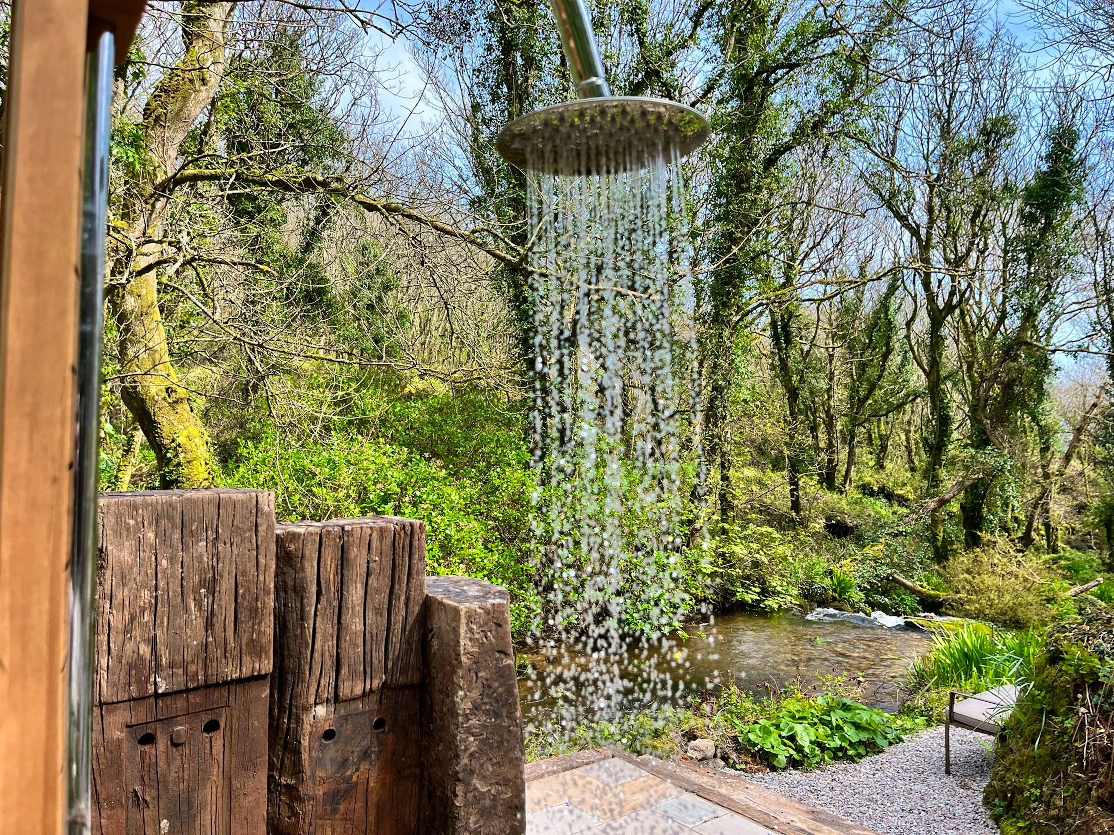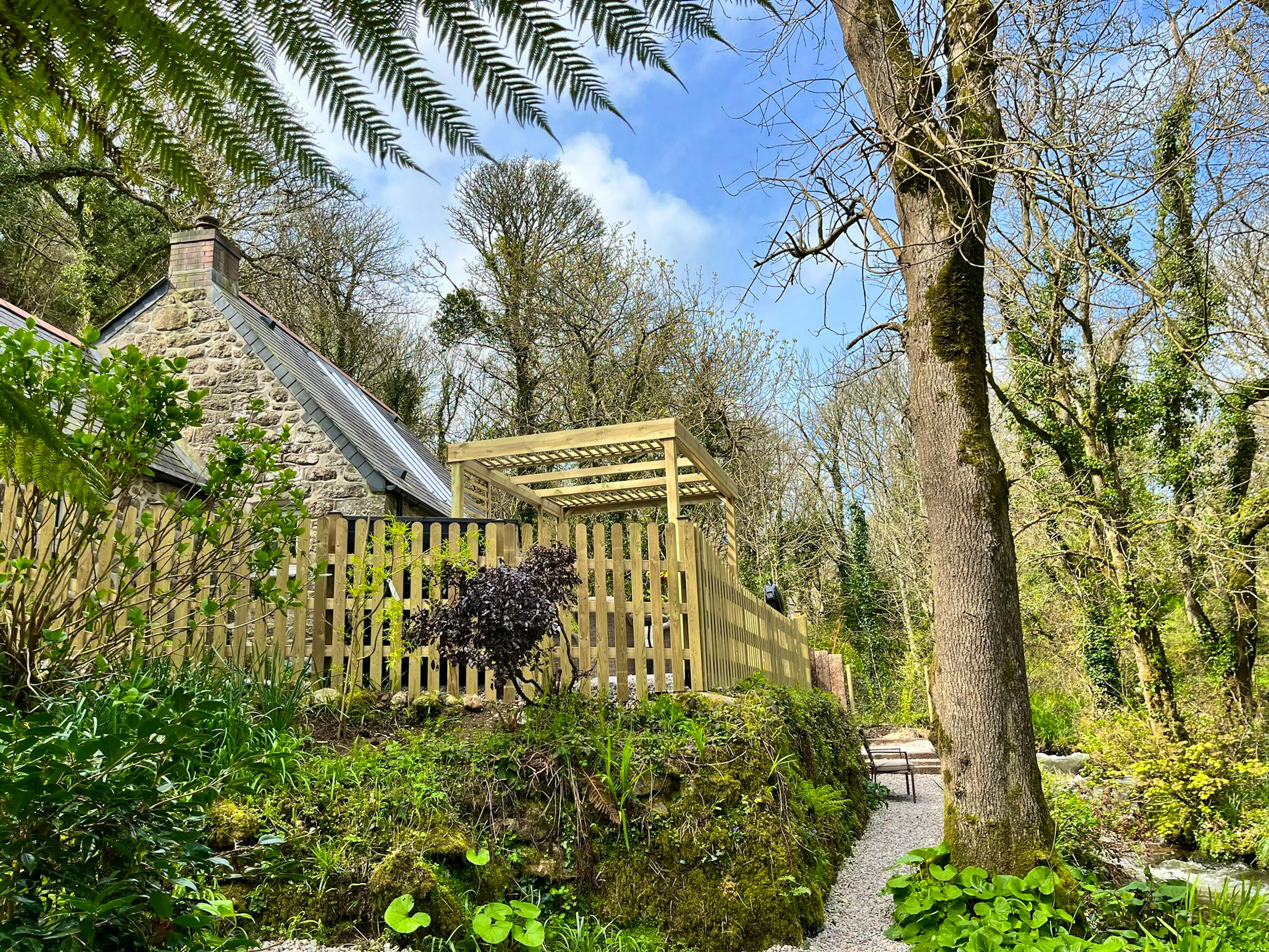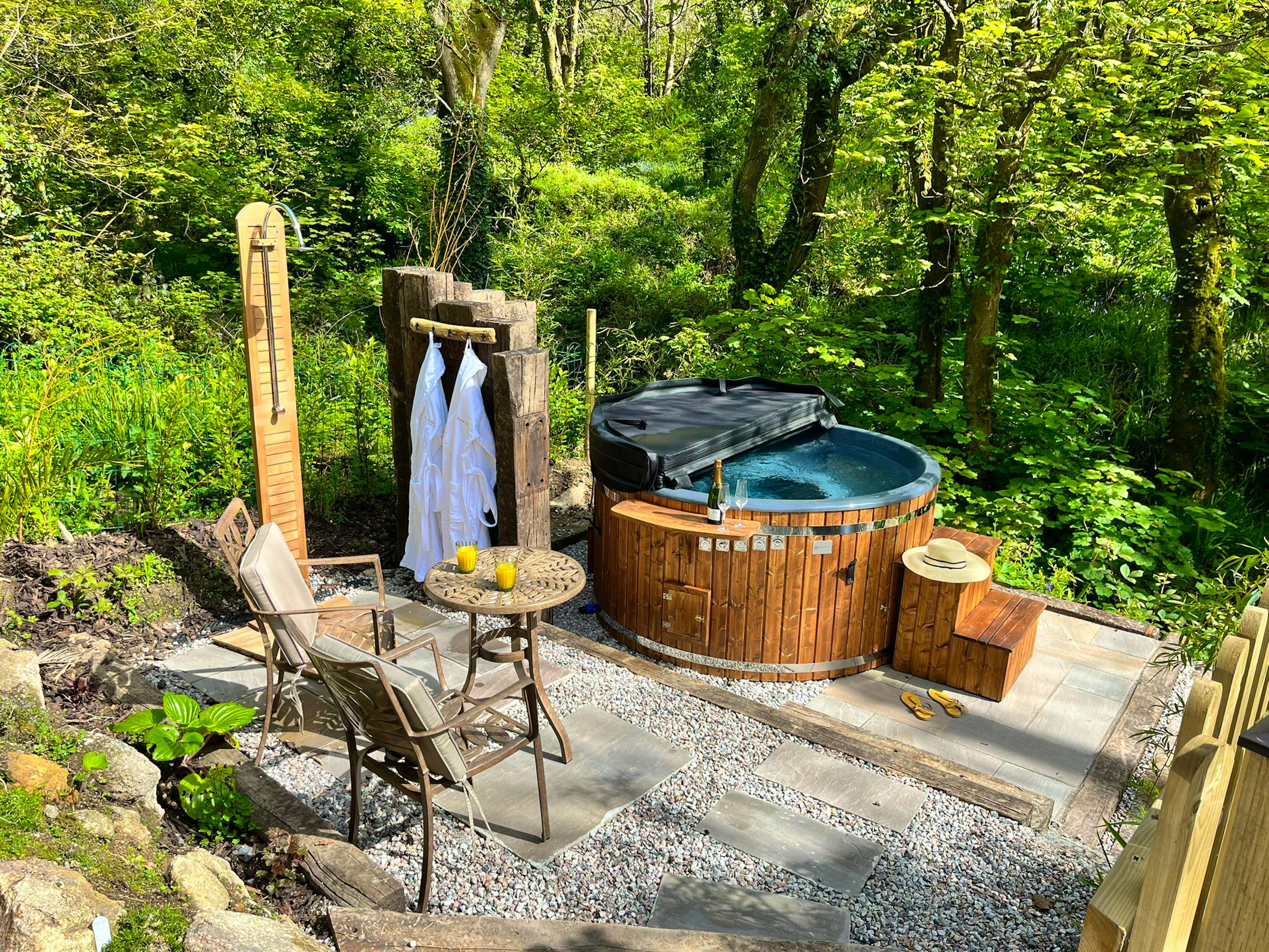 Former artist's studio in Cornwall hidden in a peaceful wood by the edge of a trickling stream, with a hot tub, sauna and a beautiful beach within walking distance.