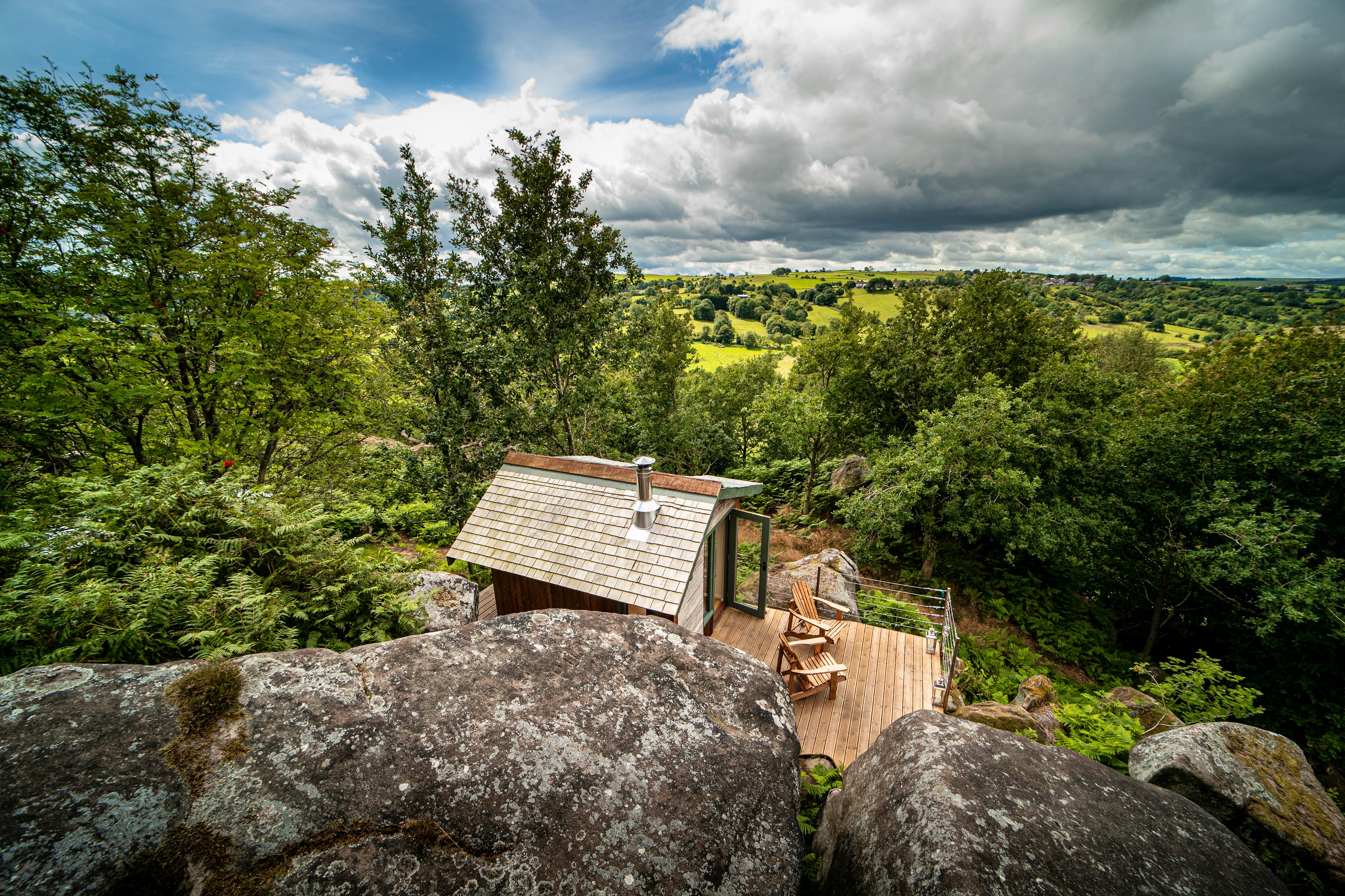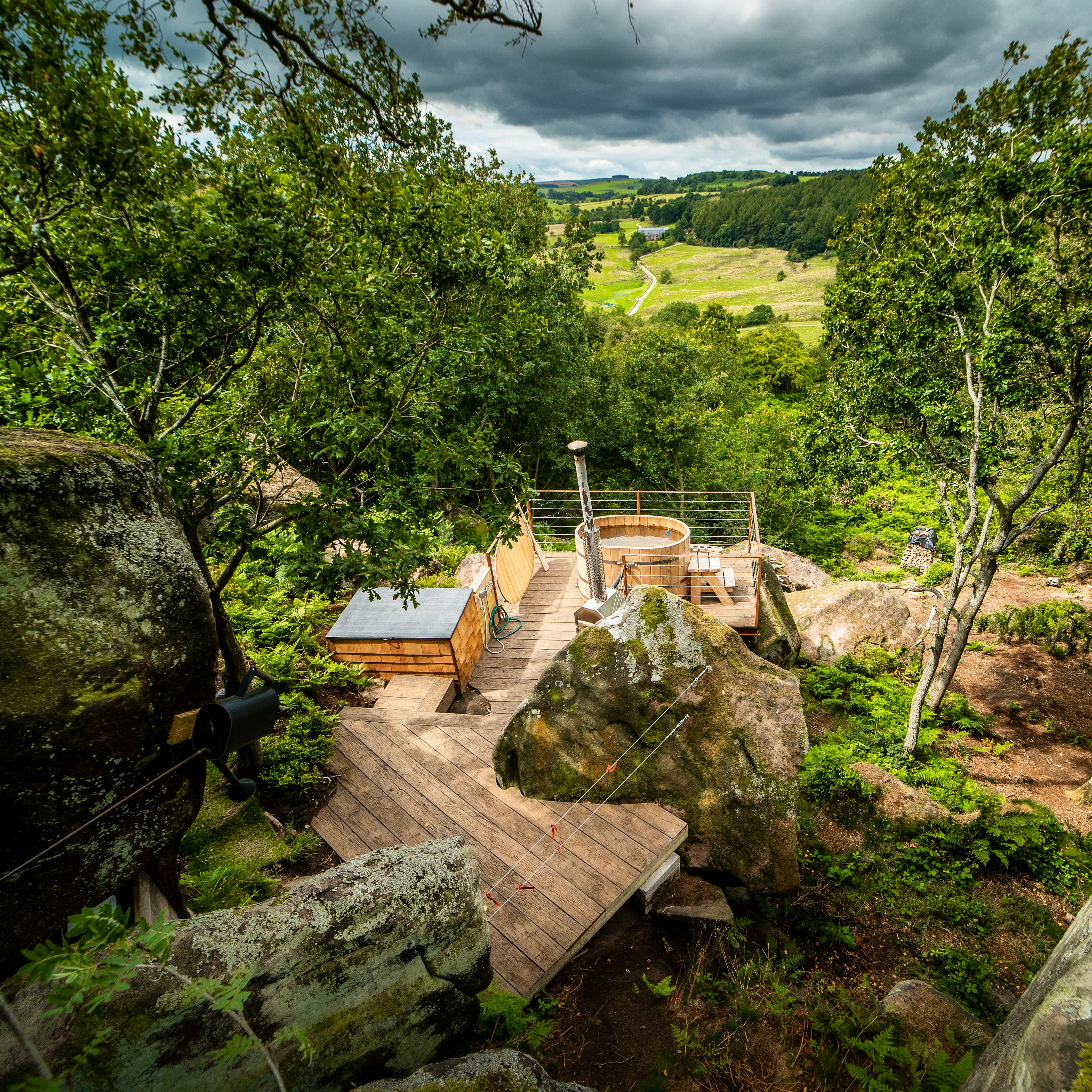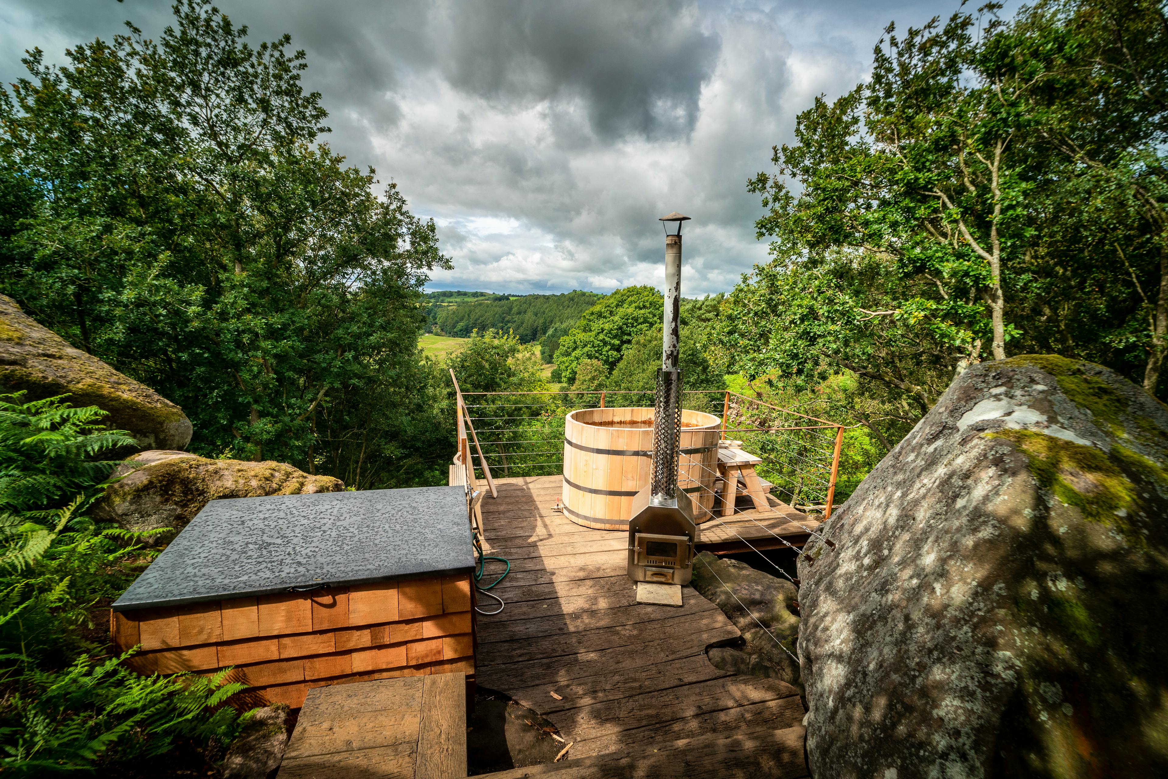 Charming hillside cabin in the Peak District with wood fired hot tub and incredible views across the valley.