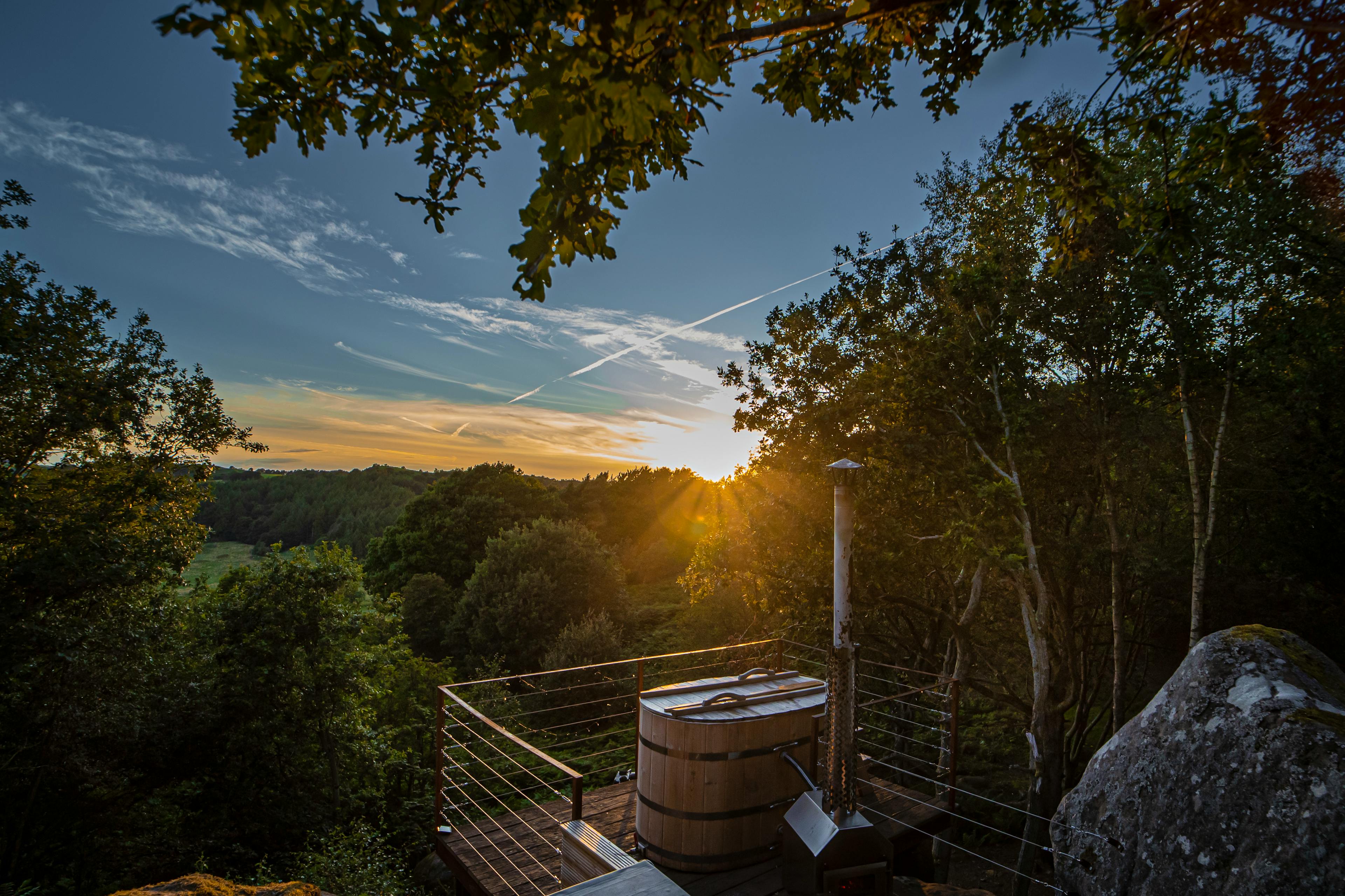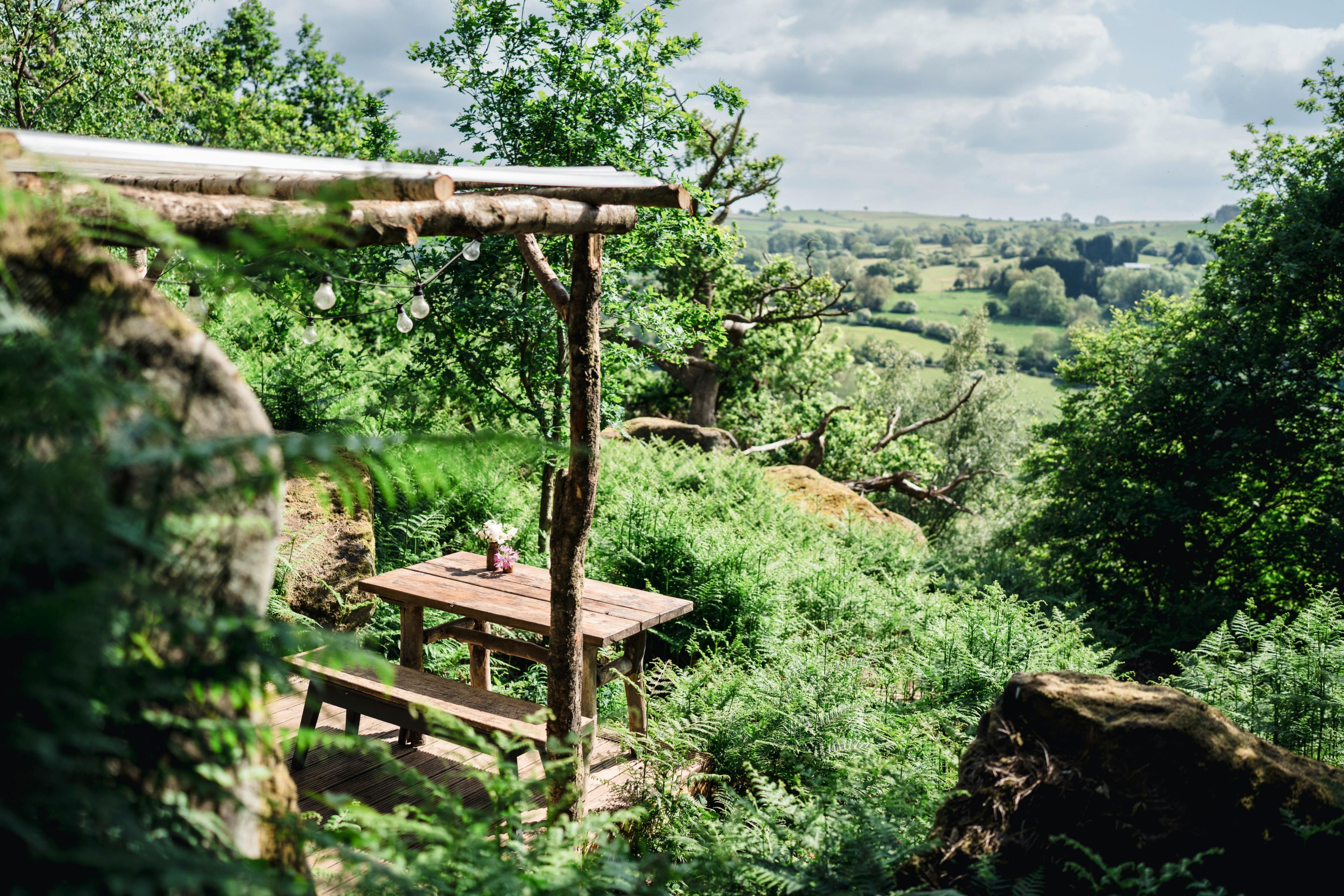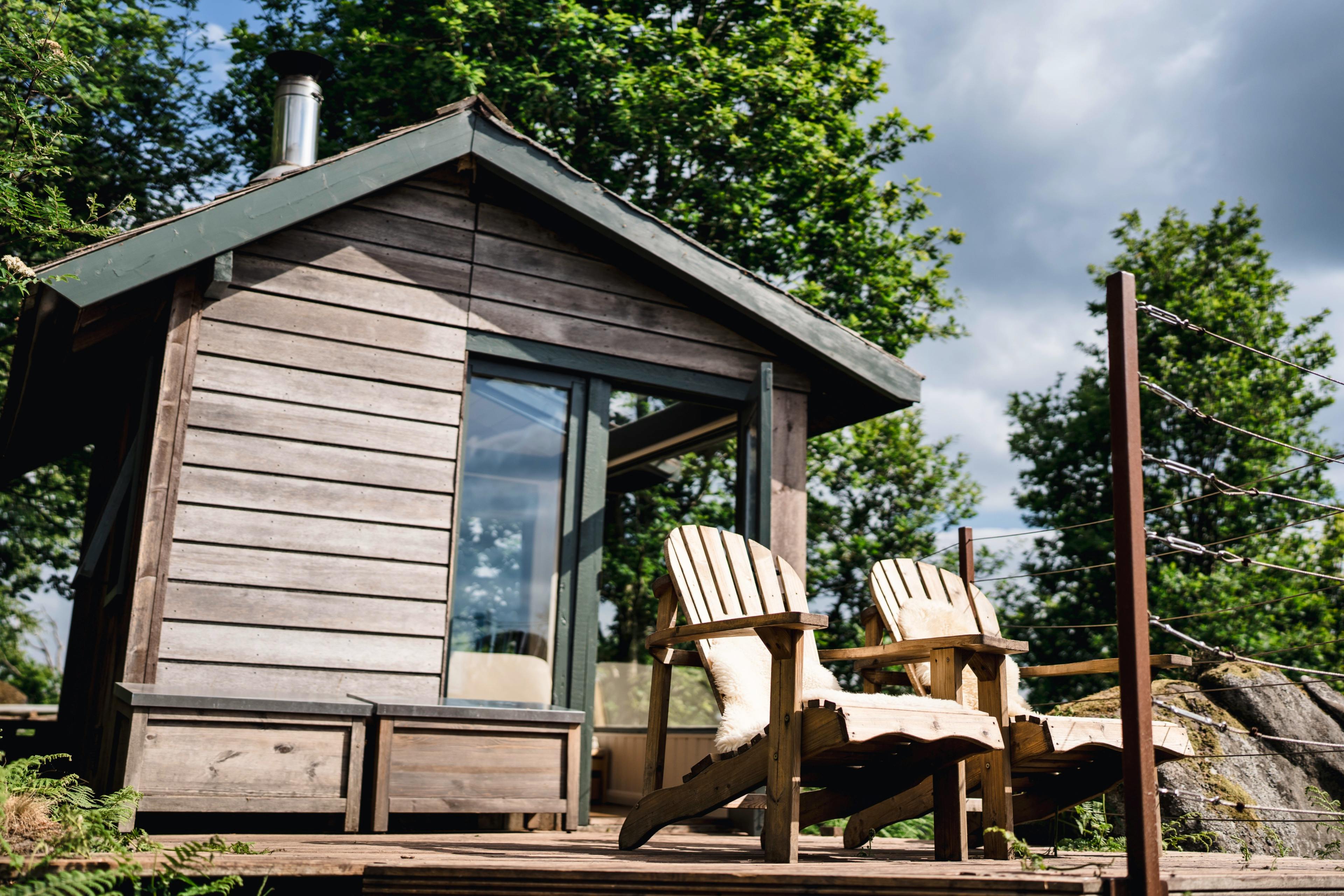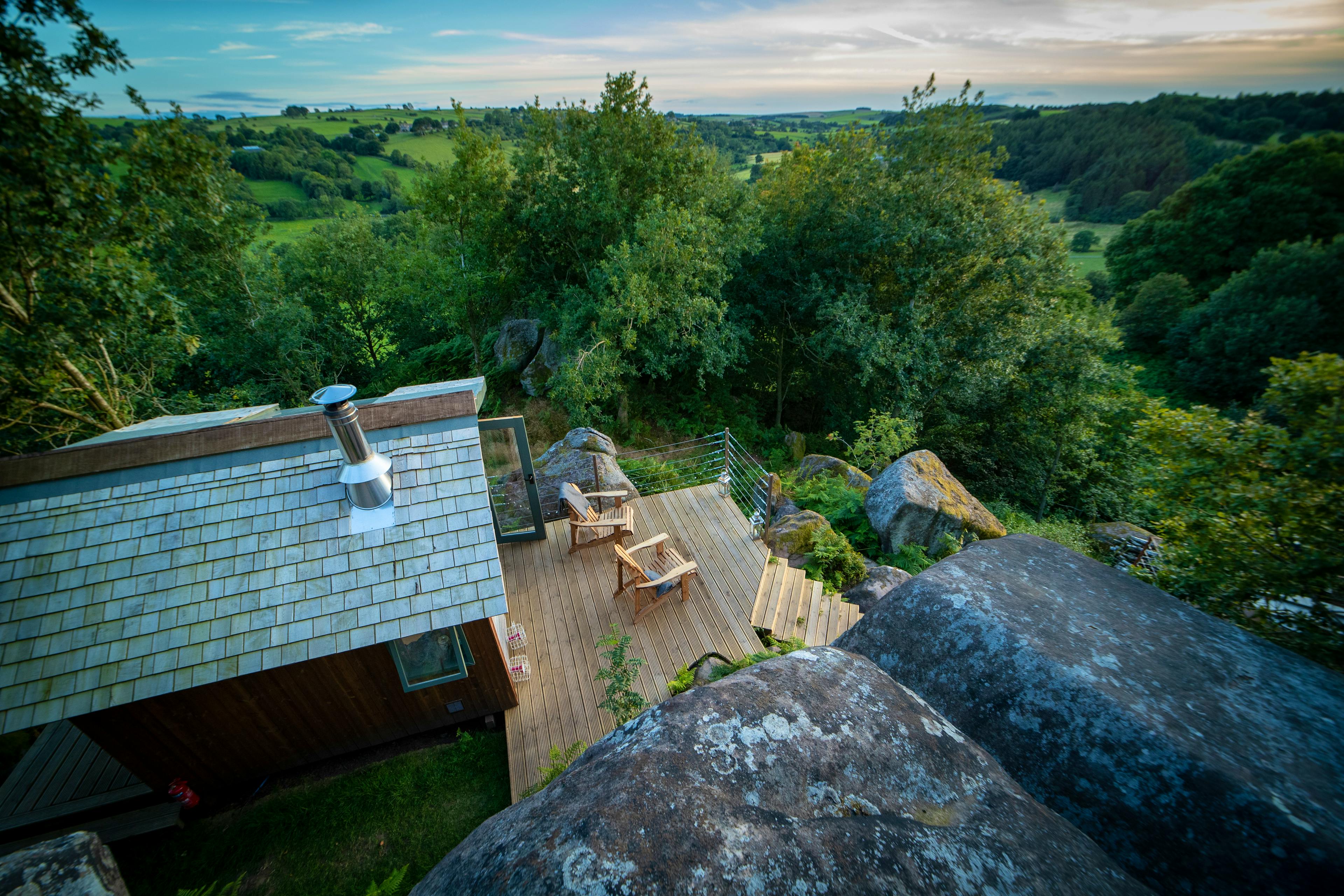 Charming hillside cabin in the Peak District with wood fired hot tub and incredible views across the valley.