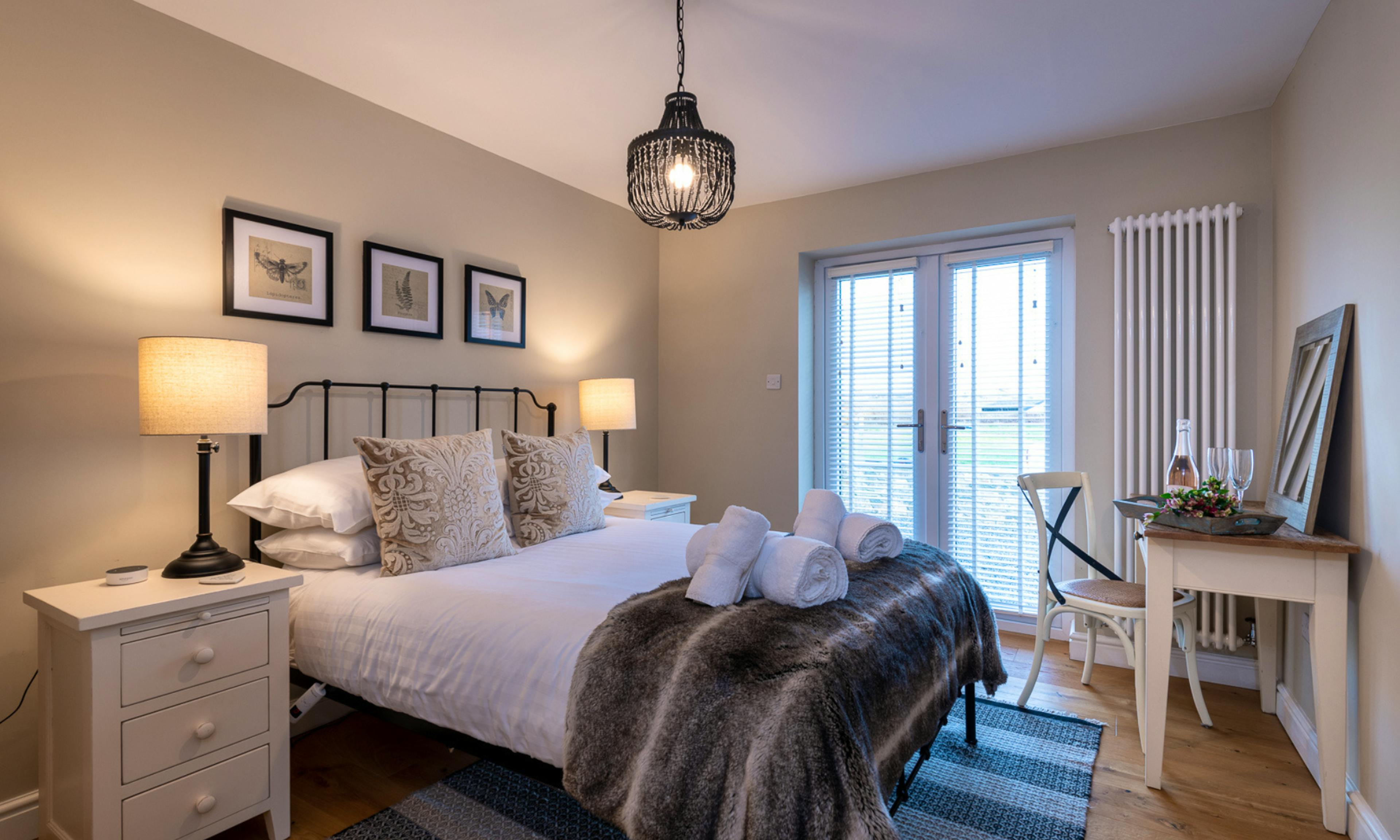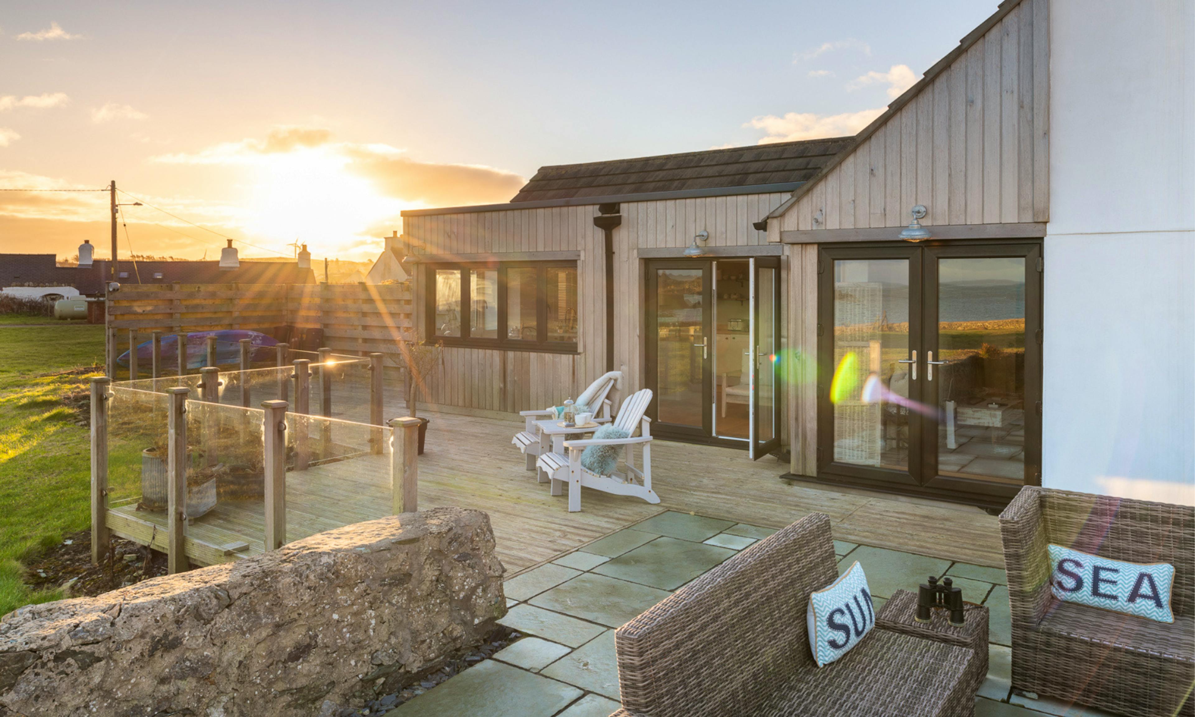 Outside, French doors open onto a wood-decked terrace with panoramic views, while the enclosed garden is great for dogs and children to enjoy the fresh sea air.