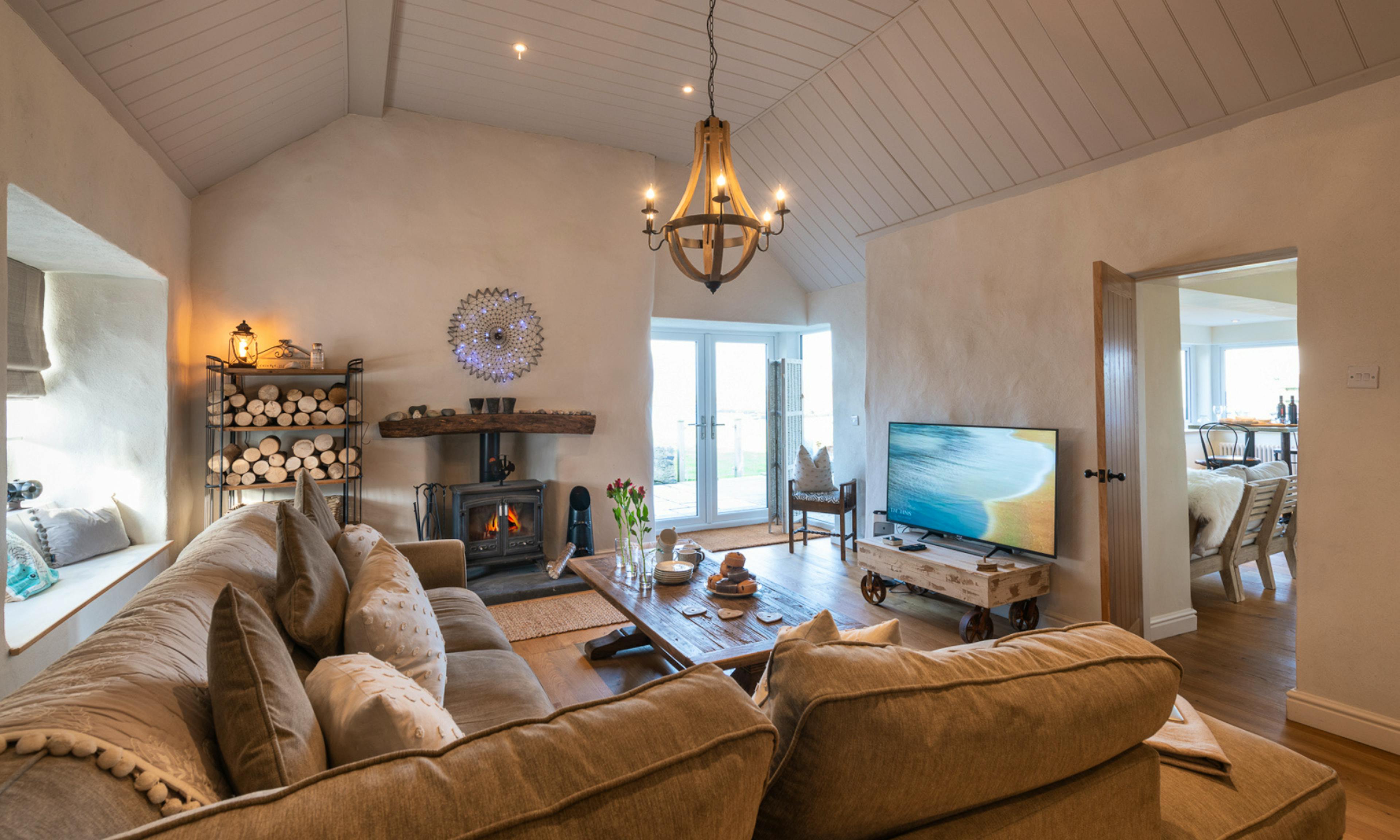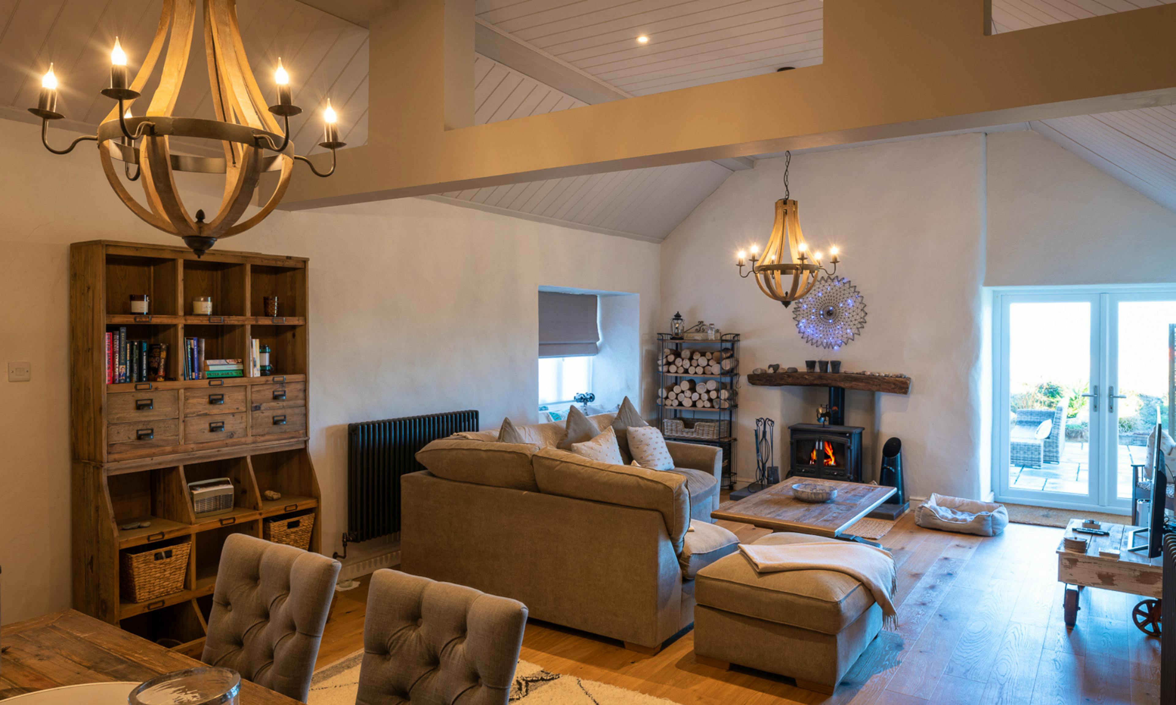 The open-plan lounge and dining area features vaulted ceilings, an Inglenook stove and a large L-shaped sofa, creating a cosy, inviting space perfect for year-round stays.