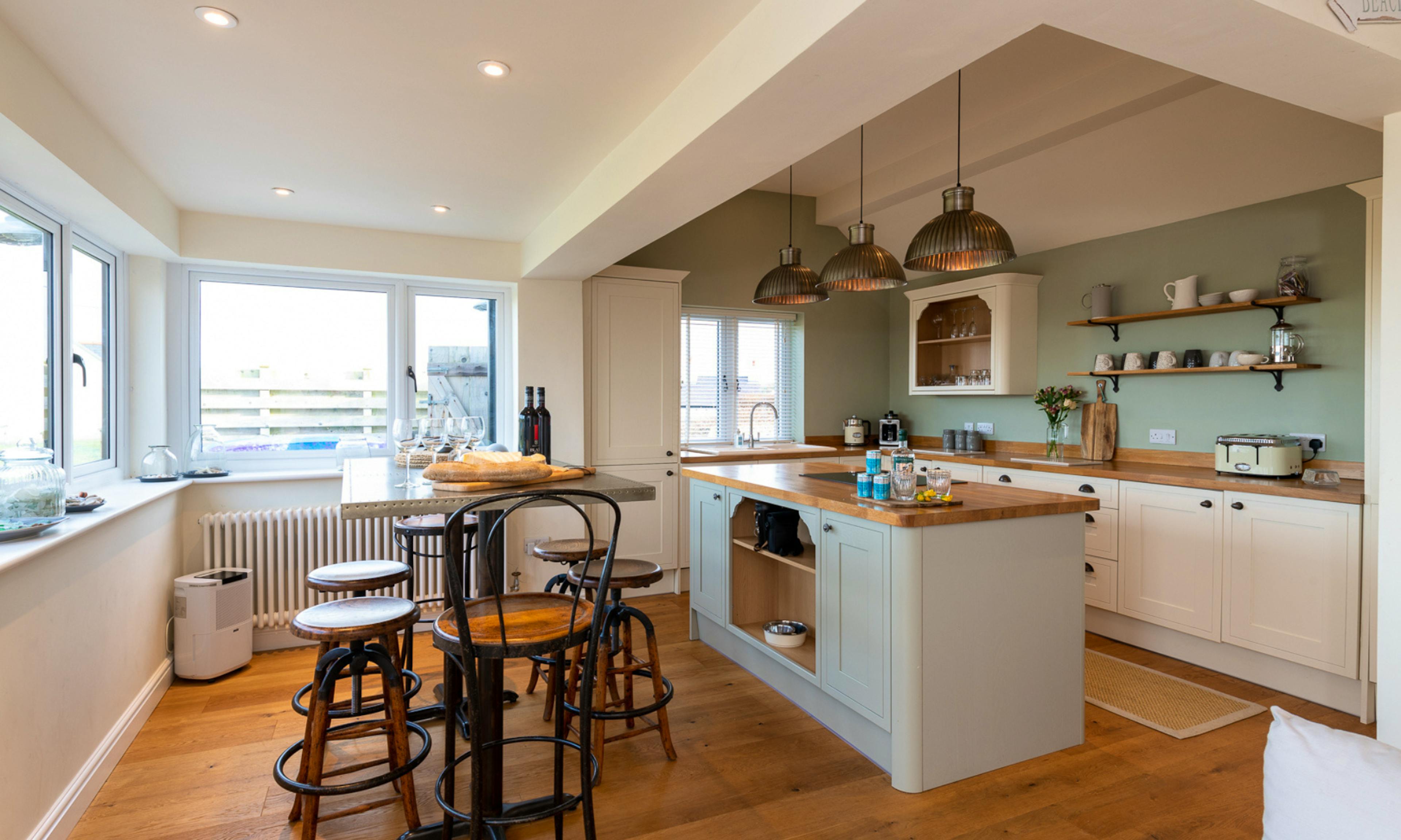 A second seating area leads to a fully equipped kitchen with everything needed for cooking up delicious feasts during your stay.