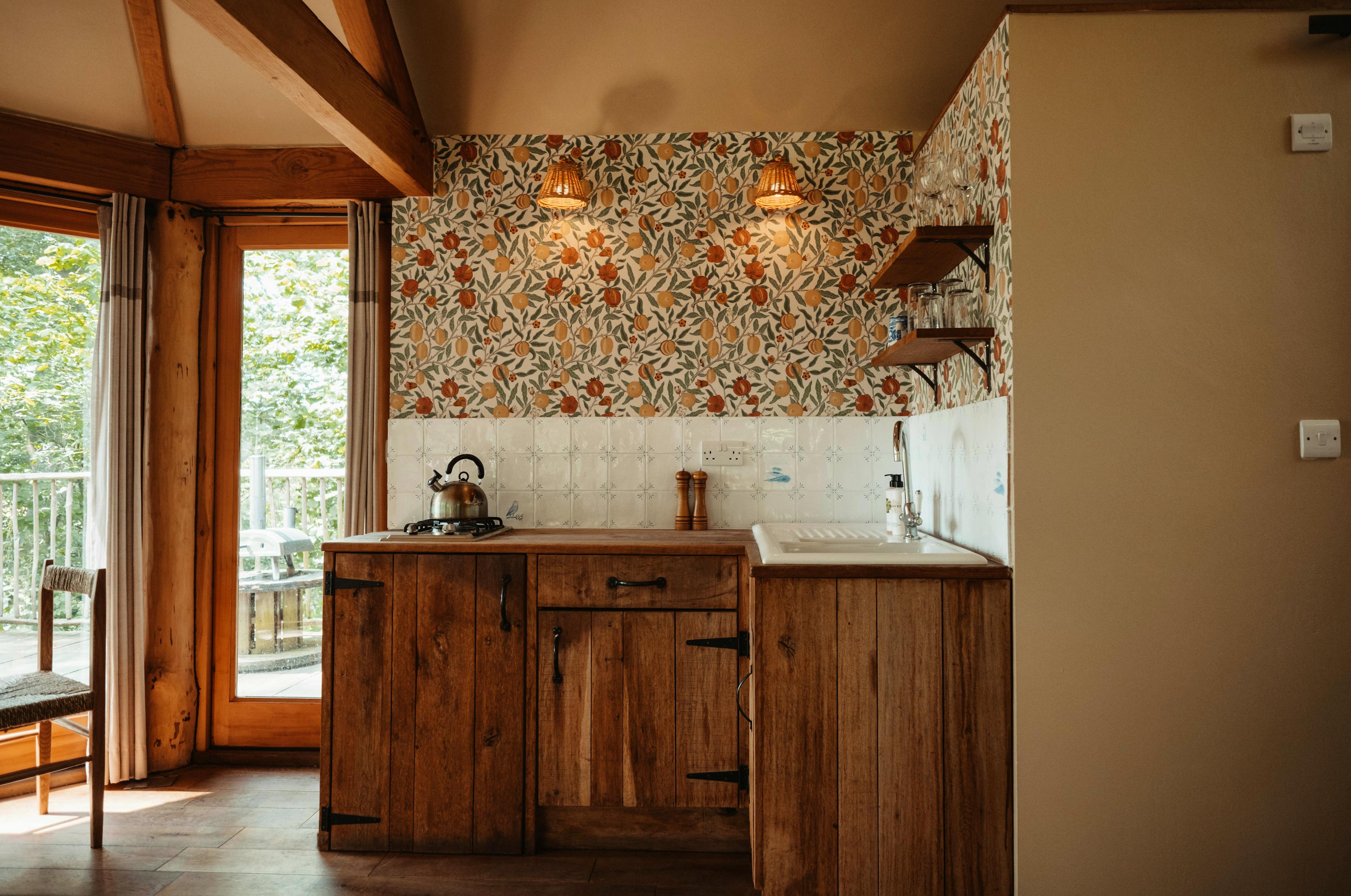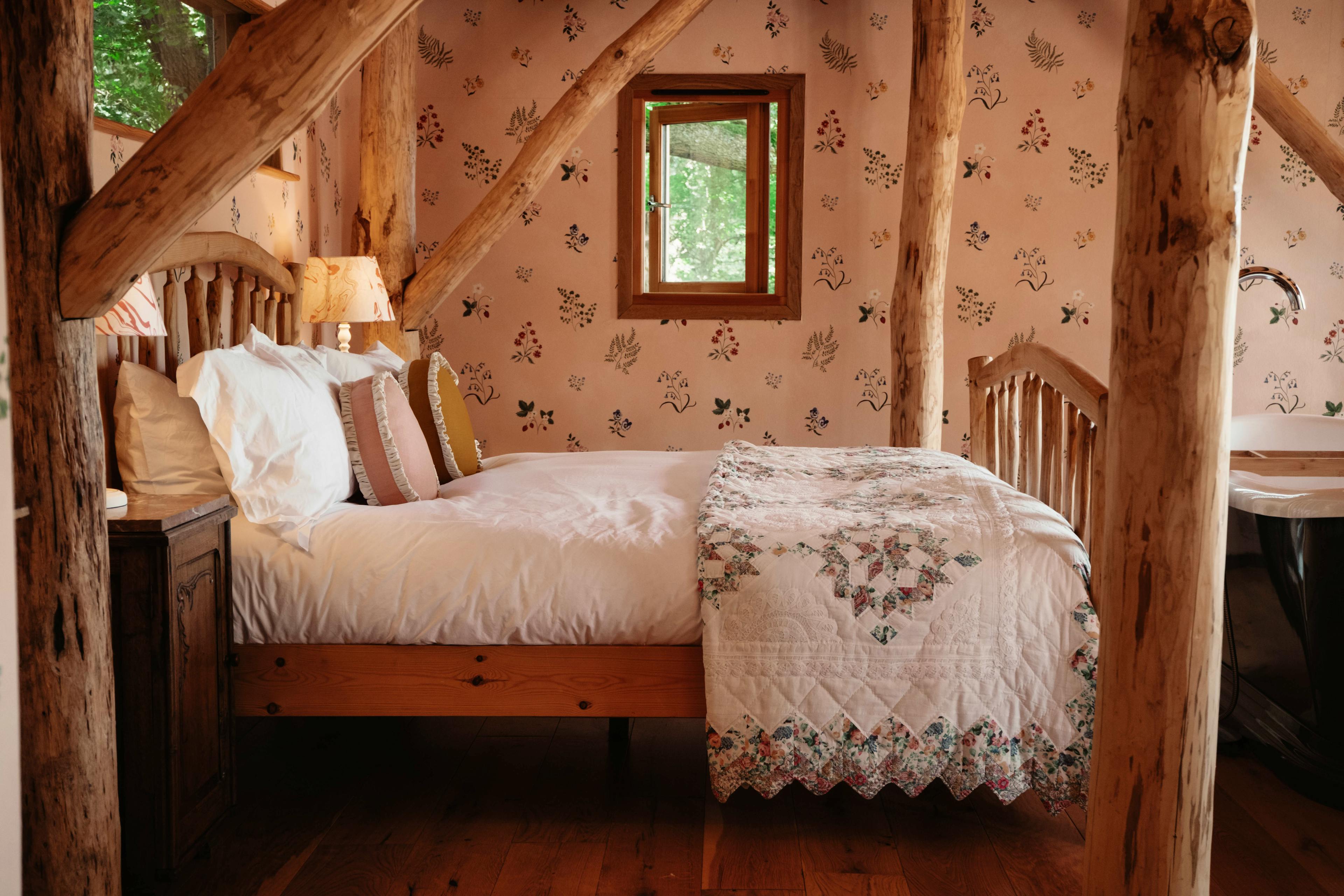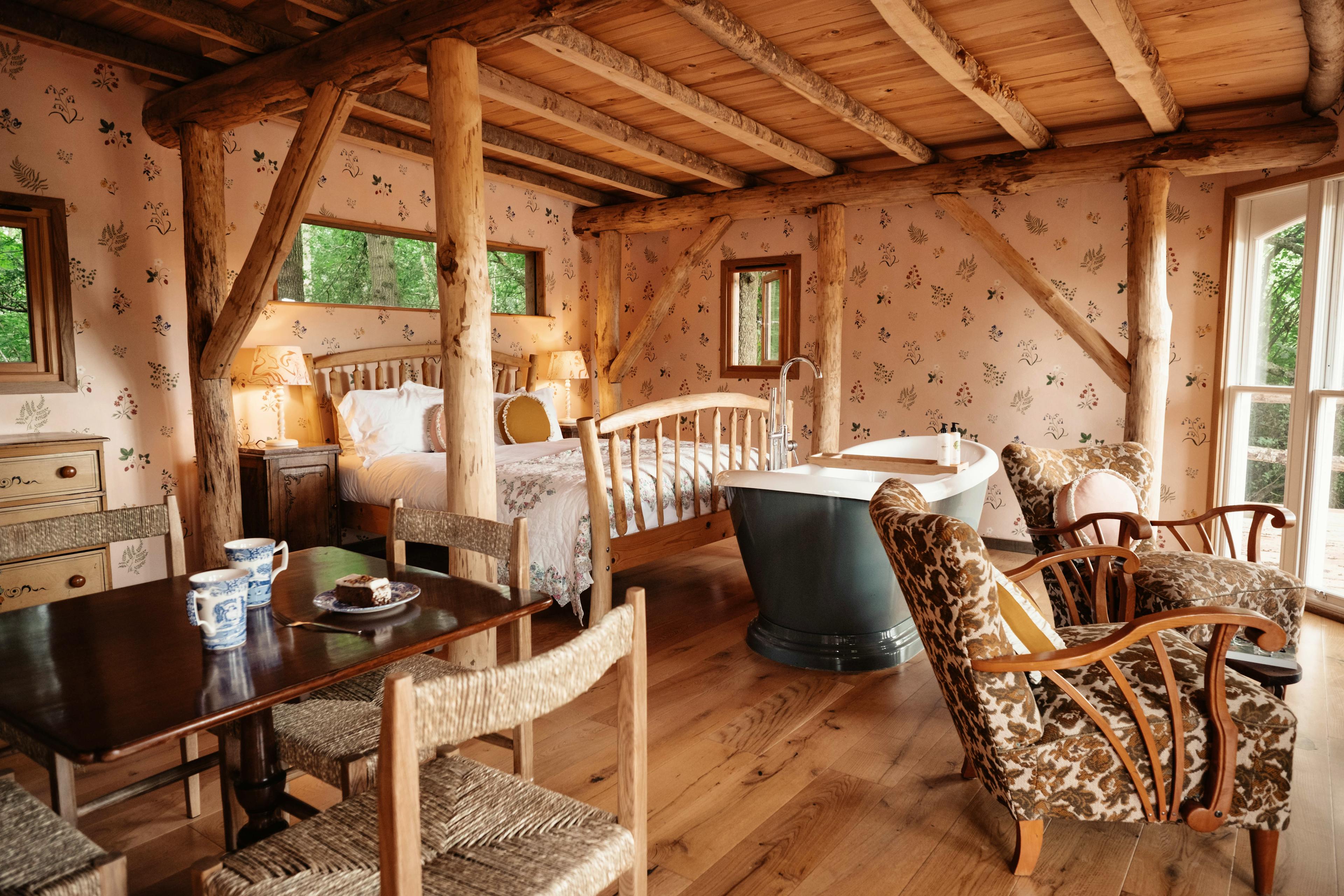 Brook House Woods is a boutique collection of four enchanting treehouses and cabins, each offering a unique escape amidst over 60 acres of lush Herefordshire woodland. Nestled within a sprawling 300-acre farm, this is a haven for nature lovers and adventurers alike. Wander through tranquil trails with birdsong as your soundtrack and unwind on your own private deck with breathtaking views. As the sun sets, fire up the pizza oven and enjoy a perfect evening surrounded by serene countryside. The four treehouse cabins are called Humboldt, Oriana, Venn and Walden. Humboldt is a dreamy retreat with jaw-dropping views and a glorious outdoor roll-top bath where you can enjoy an indulgent soak in nature’s beauty. Inside, the cabin boasts a luxurious king size bed adorned with premium linens and fluffy towels. The woodburner warms the cosy seating area, which is the perfect spot to curl up with a good book and a glass of wine. Tucked slightly away for added privacy, Oriana is a secluded haven for two. The spacious deck, furnished with comfy chairs, is ideal for soaking up the scenery. Inside, wildflower wallpaper sets a lovely tone, complemented by an opulent roll-top bath for pure relaxation. There’s also an elegant dining space whilst the two vintage armchairs by the fire provide a cosy spot to unwind. The king size bed, dressed in sumptuous linens, guarantees a restful night’s sleep. Set against the backdrop of the stunning Frome Valley, Venn is a romantic escape with spectacular views. A large deck leads directly to the countryside, perfect for wandering or dining outdoors. Snuggle in the vintage armchairs by the woodburner before enjoying a lovely night’s sleep in the comfy king size bed, dressed in high-end linens. The cabin’s bathroom features an indoor shower and there’s another outdoor bath for starry soaks. Nestled deep in ancient woodland, Walden is a romantic hideaway made for two. The expansive deck invites you to stargaze and as you step indoors you’ll be able to get comfy in the cosy seating area, with vintage armchairs and a woodburner. This cabin has another king size bed and yet more luxurious linens, to ensure total relaxation. There’s an indoor shower and toilet, plus another sumptuous outdoor bath for soaking in the sights and sounds of nature. Each of the four cabins also has its own spacious and private deck, complete with a pizza oven and a BBQ. So whichever cabin you choose, you can step outside and grill some delicious local produce or create the perfect pizza to enjoy alfresco in the sunshine. And if you want to cook inside, the cabins all have nicely equipped kitchens with a gas stove and a fridge, as well as lots of essentials such as milk, coffee and tea. Guests can also make use of the Woodland Outdoor Ciname, which is open April-October. This cinema can sit two people at a time and comes with a small selection of DVDs but guests are welcome to bring their own films with them. There are no streaming facilities and wired headphones are required. Once you have a reservation you can book a timeslot at the cinema for you and your loved one. Guests can also book one of a number of meal kits, which provide you with hampers that are delivered to your cabin prior to arrival ready for you to prepare on your BBQ/pizza oven. These include breakfast hampers, grazing hampers, BBQ hampers and more. Be sure to enquire with the owner when booking to find out more. For those looking to explore, the surrounding area is brimming with scenic beauty and activities. Stroll through the tranquil farm or follow the Herefordshire Trail, which conveniently winds its way through the property. For more adventures, a woodland path leads to Bromyard Downs and Bringsty Common, while a short drive brings you to the stunning Malvern Hills, famous for their sweeping views and exceptional hiking opportunities. Back on-site, enjoy a match on the private tennis court, or embrace total relaxation with a soothing massage or a tailored yoga session, all set against the serene backdrop of nature.