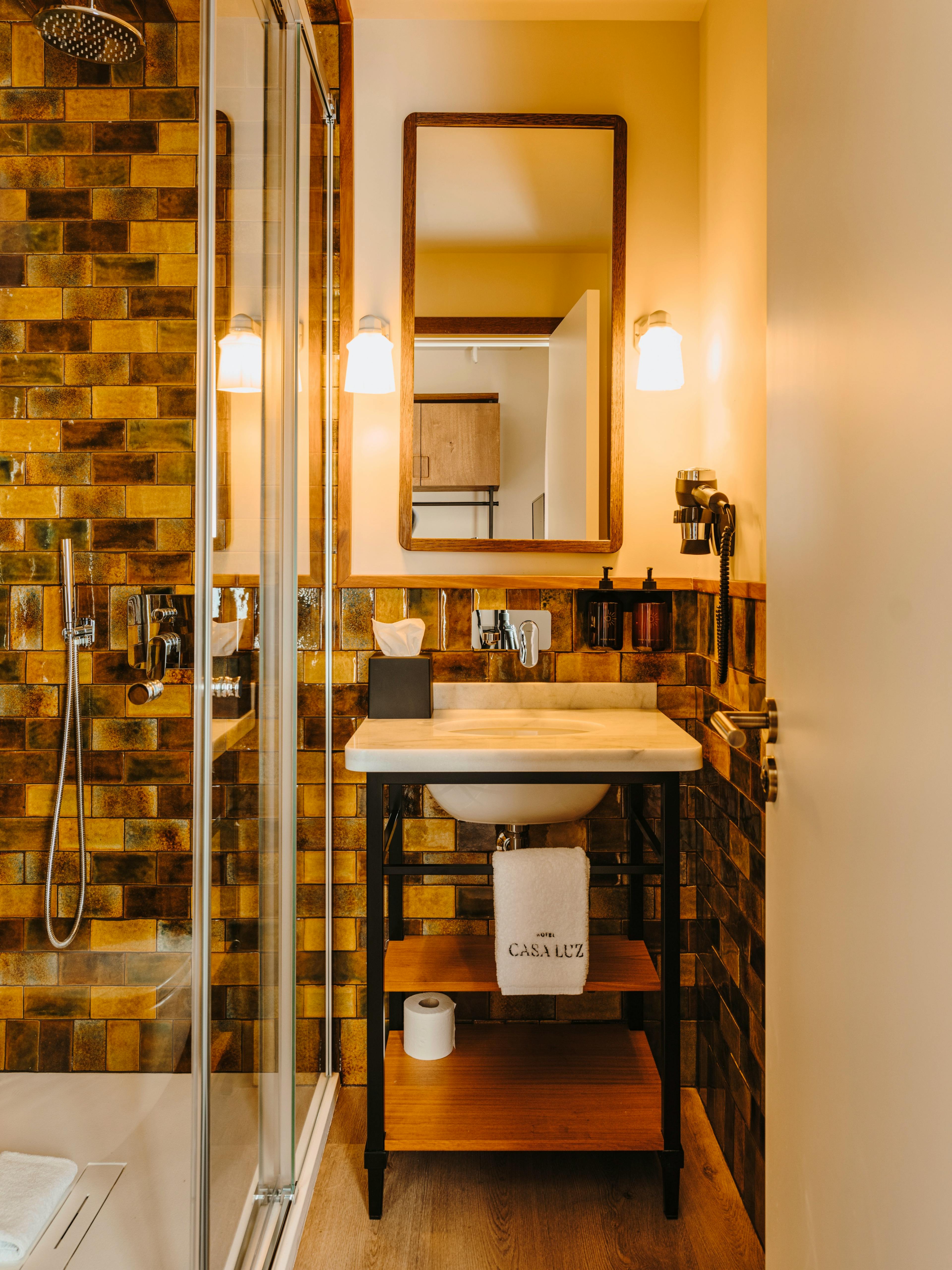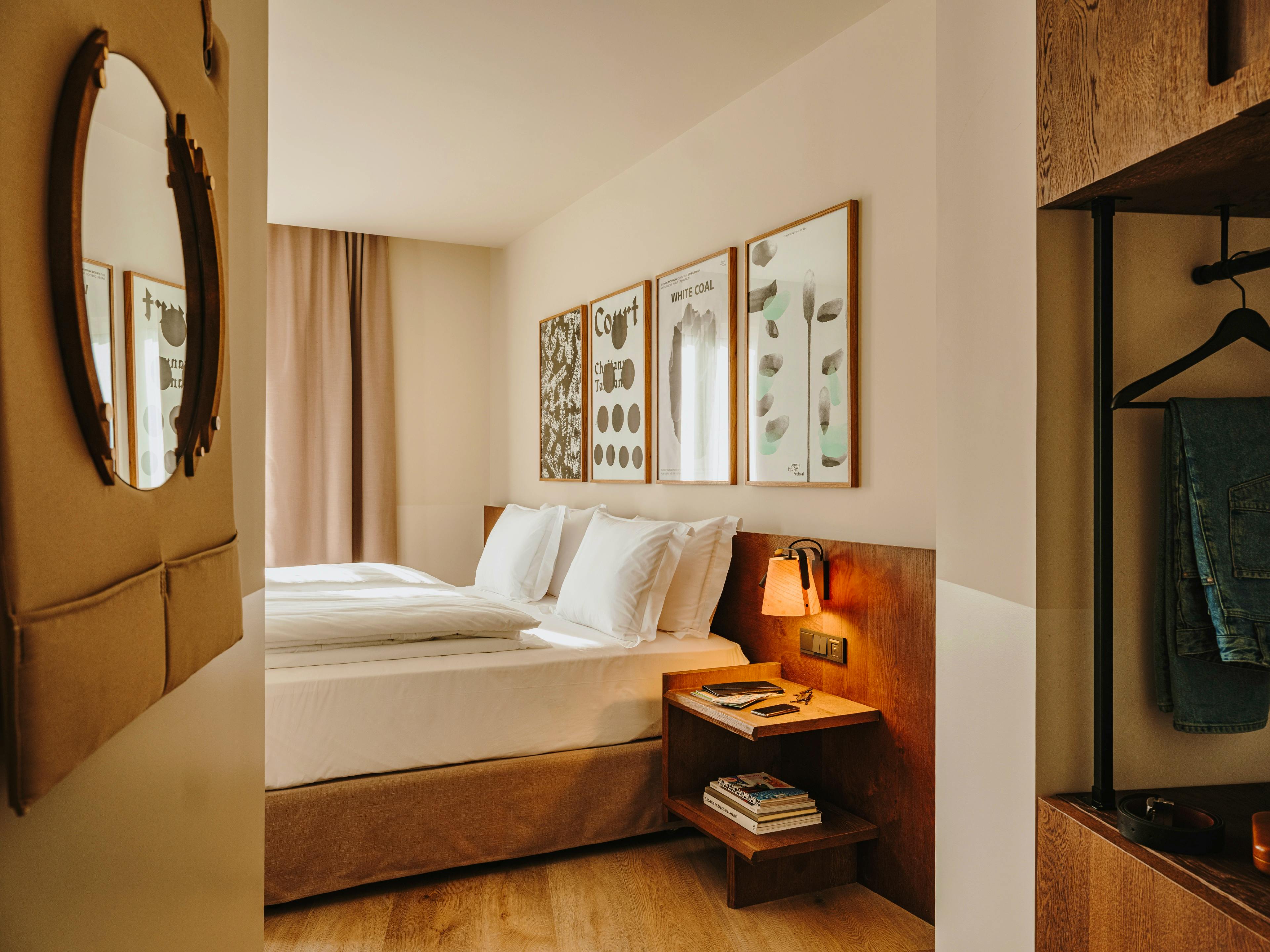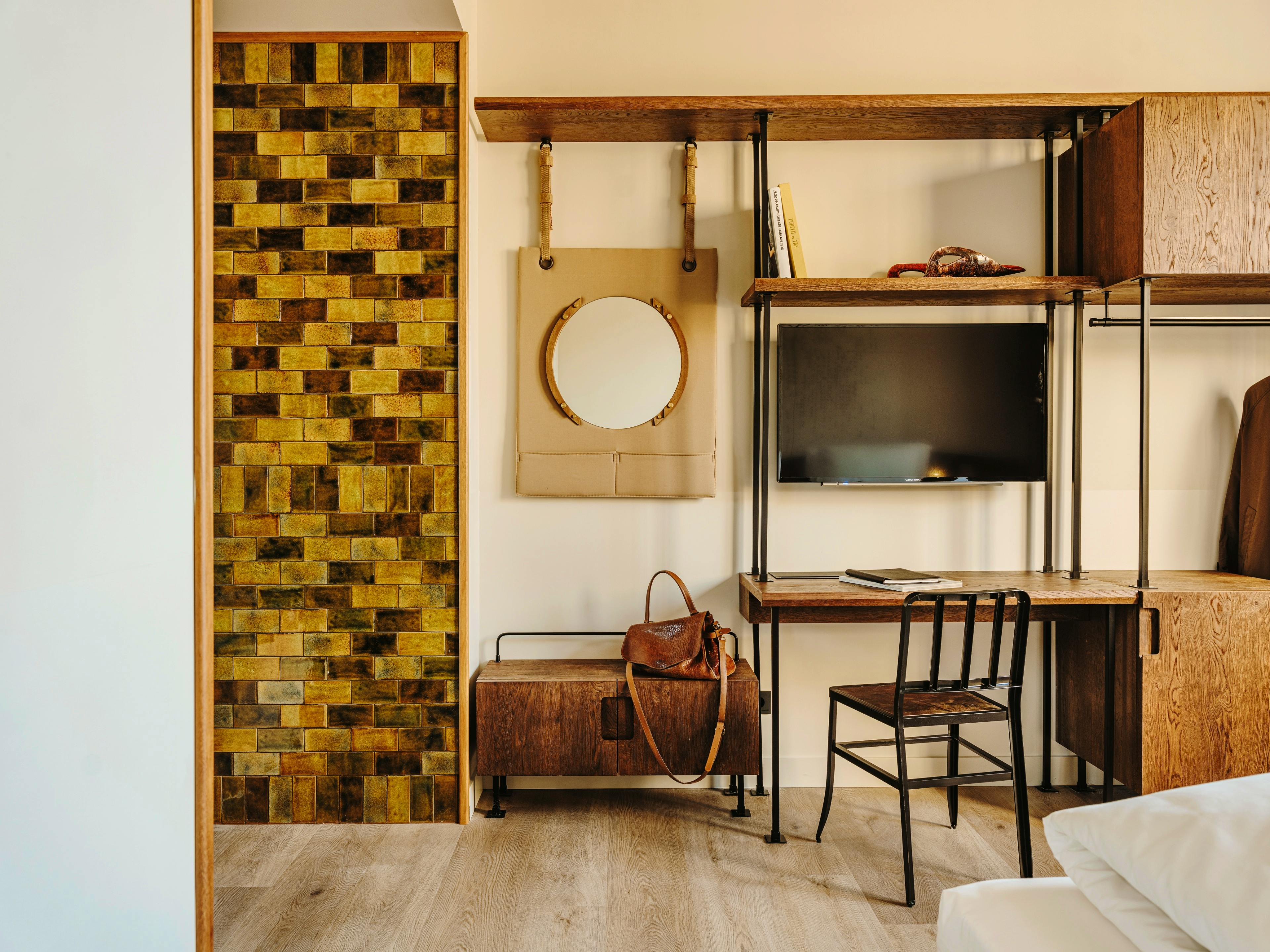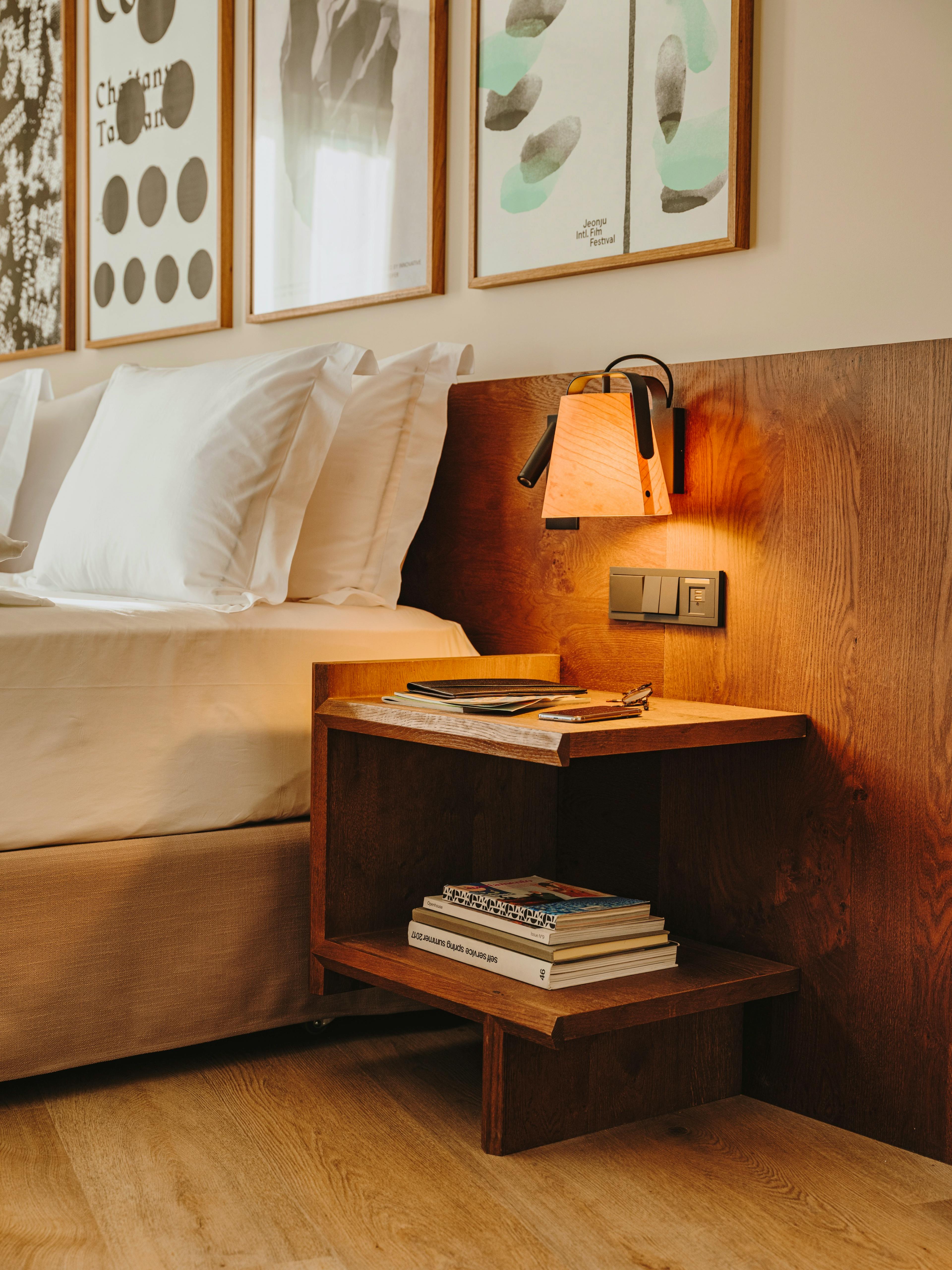 Calm, minimalist rooms with warm wood furnishings and amber tiles, offering a peaceful retreat from the vibrant streets below.