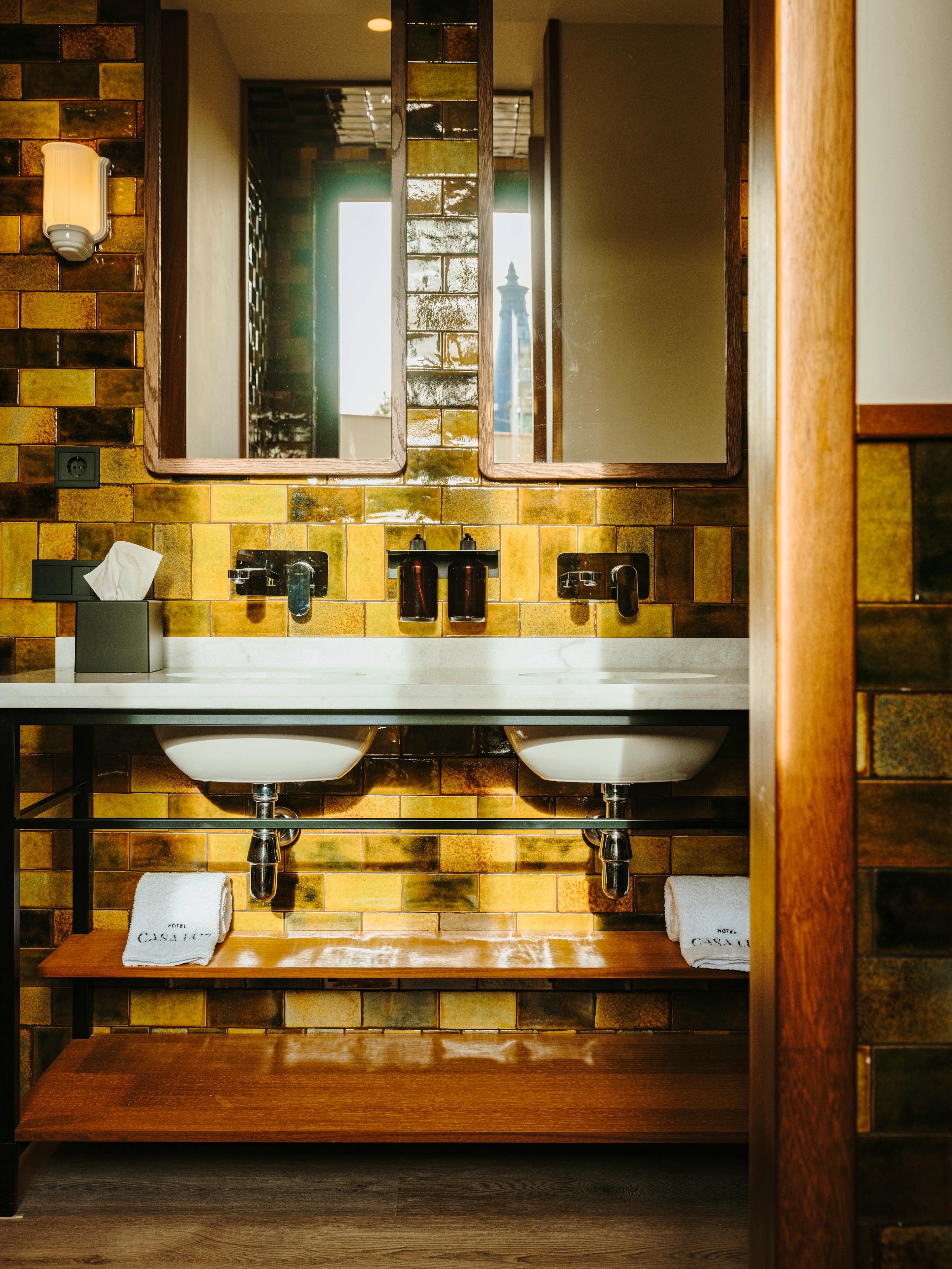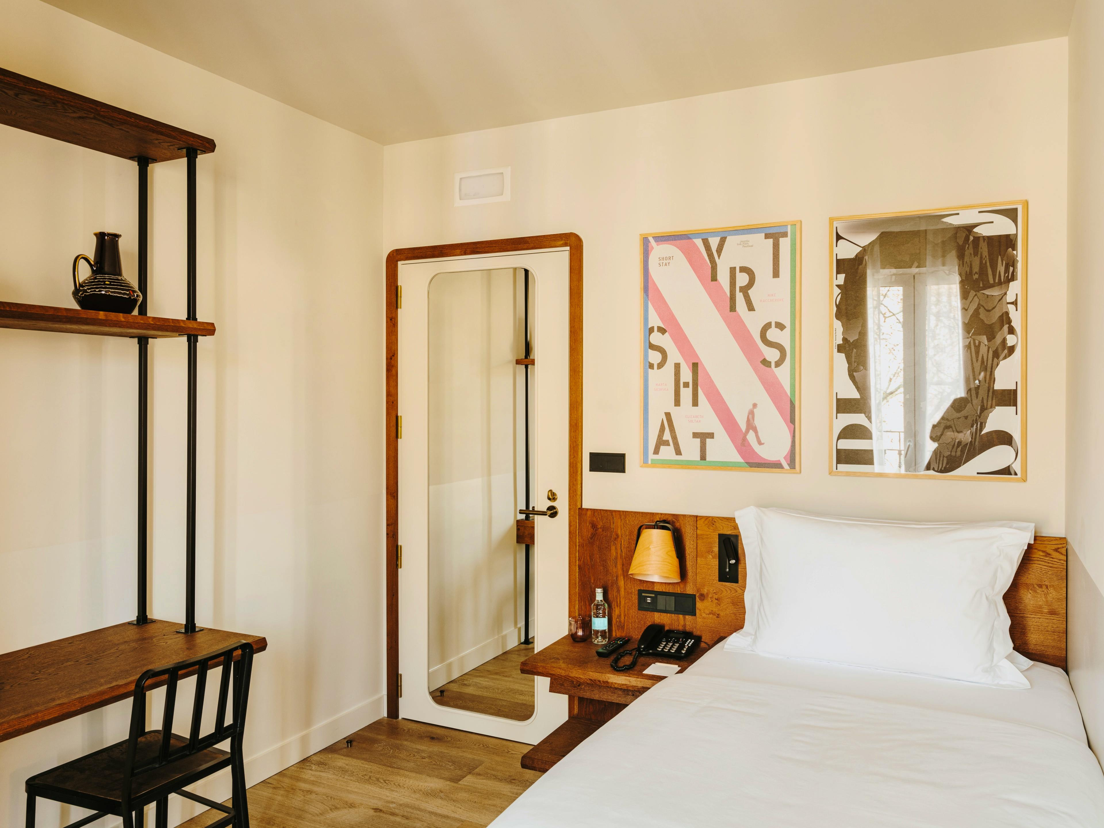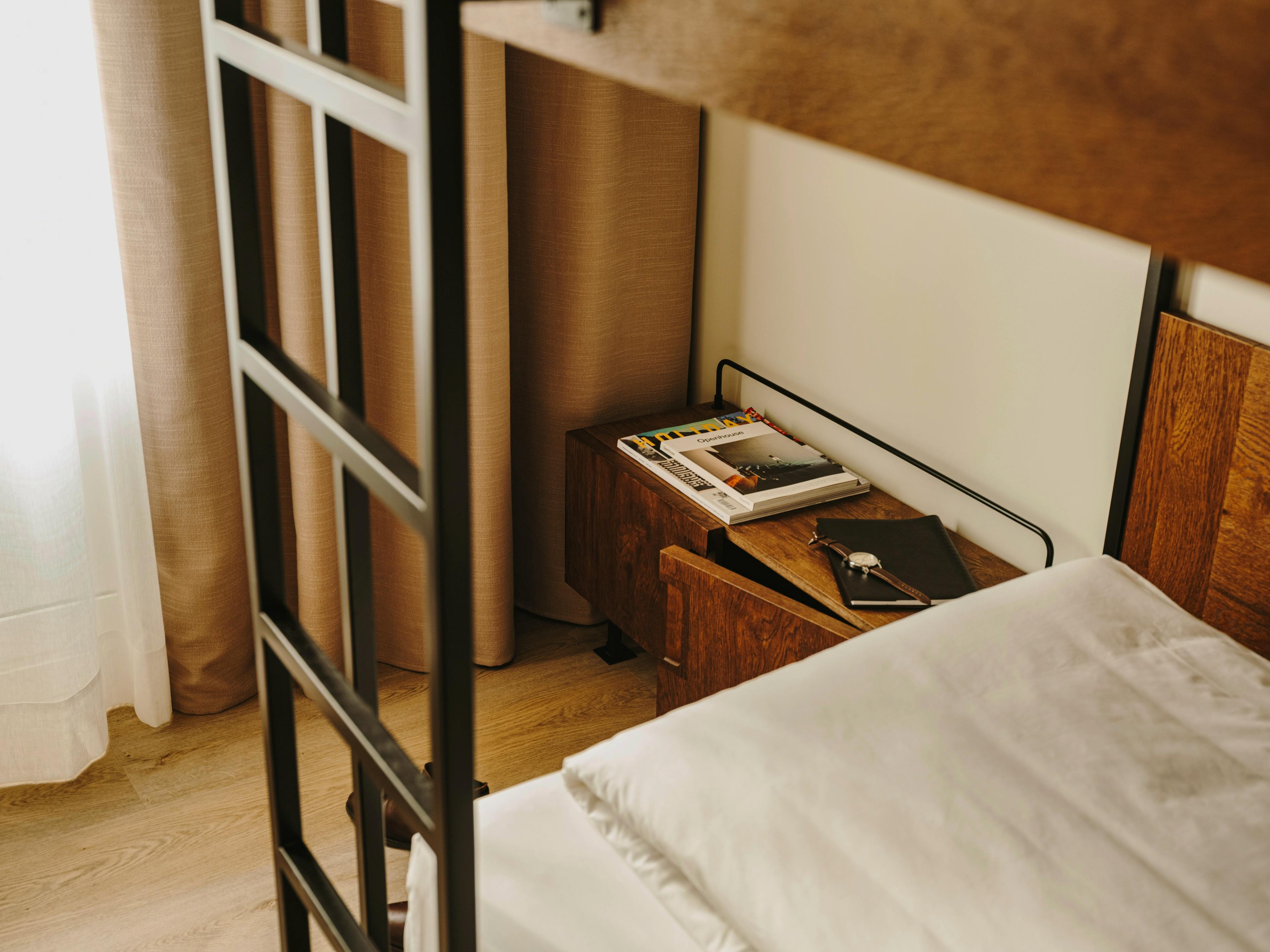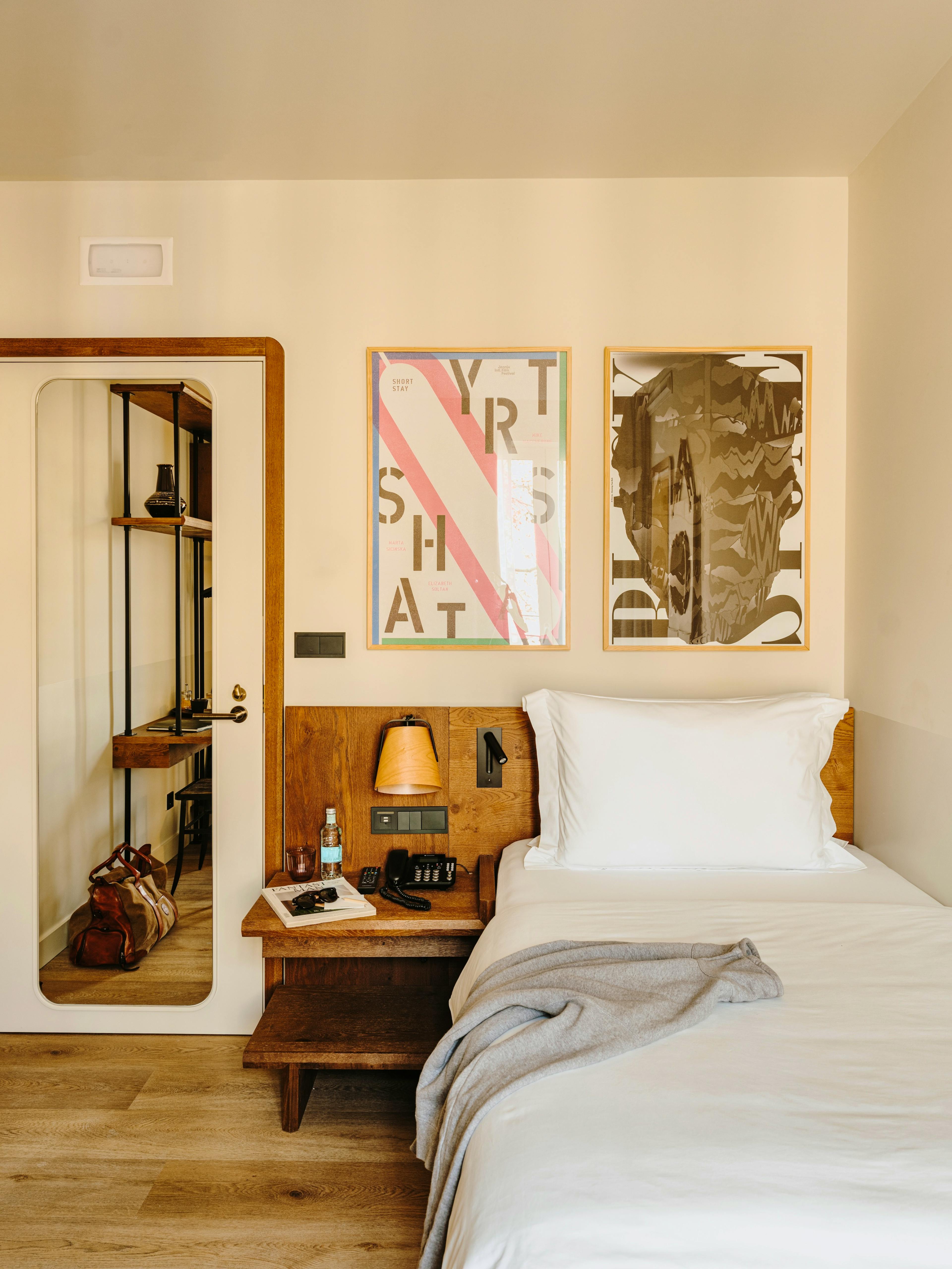 Calm, minimalist rooms with warm wood furnishings and amber tiles, offering a peaceful retreat from the vibrant streets below.