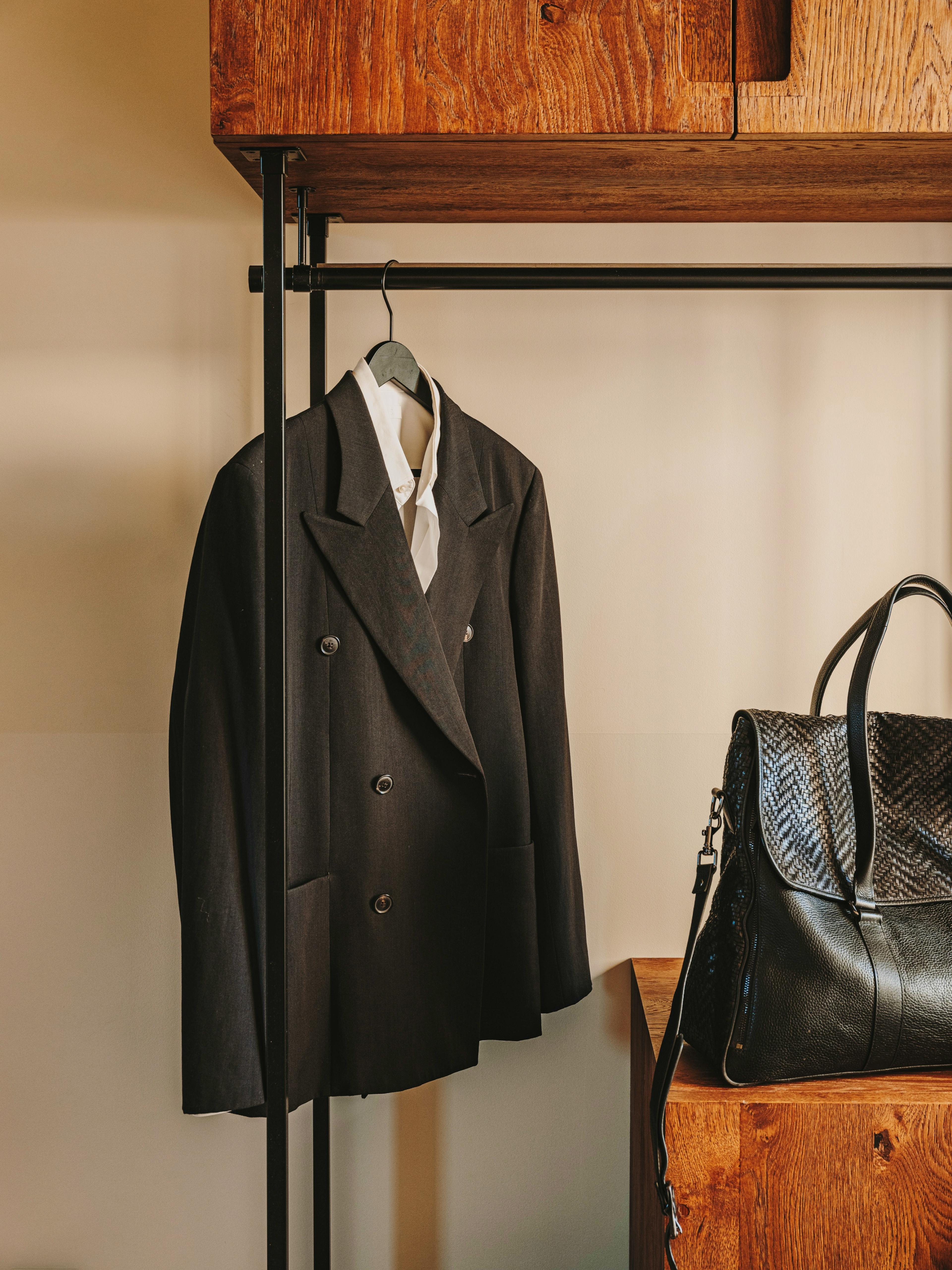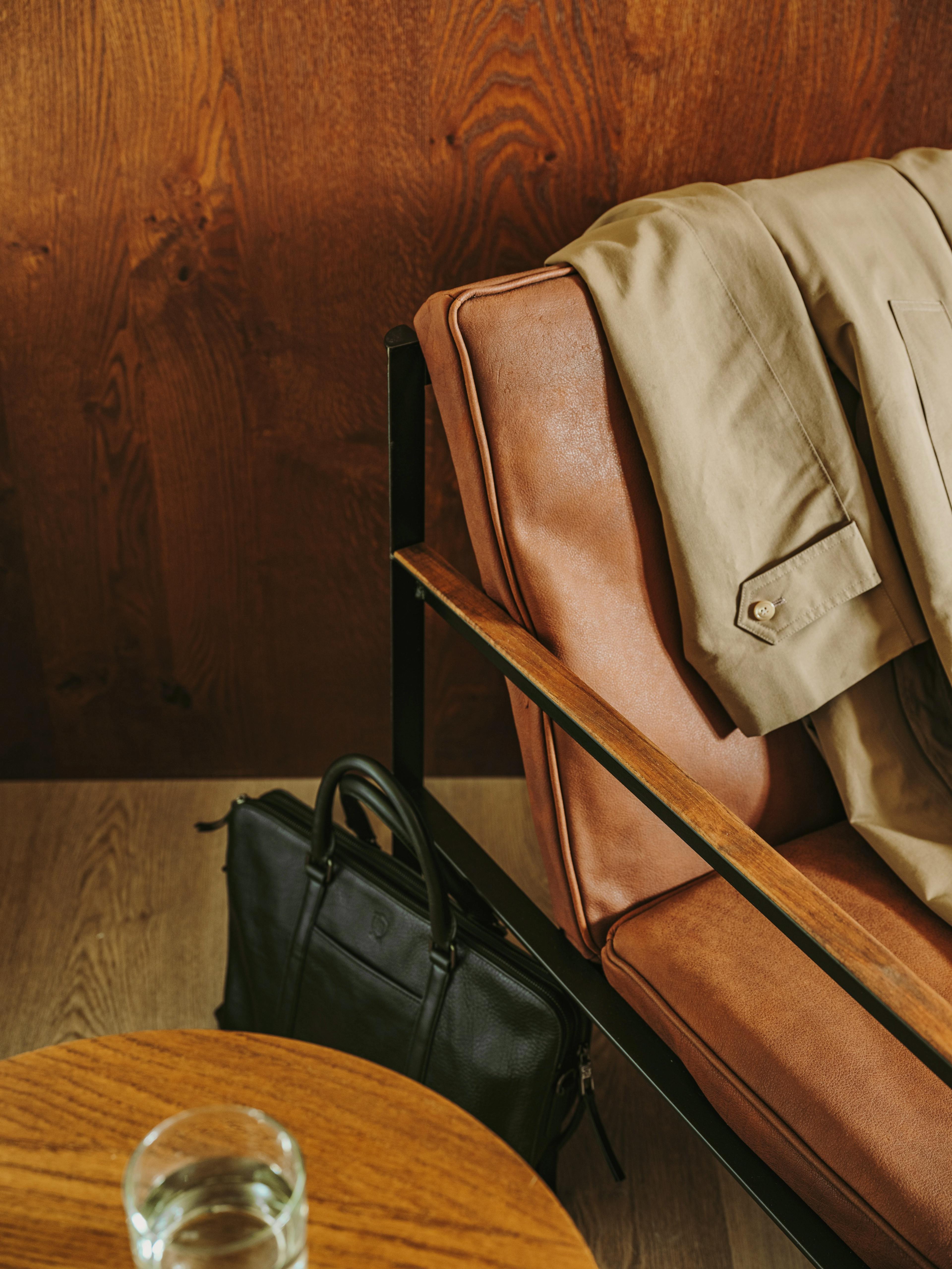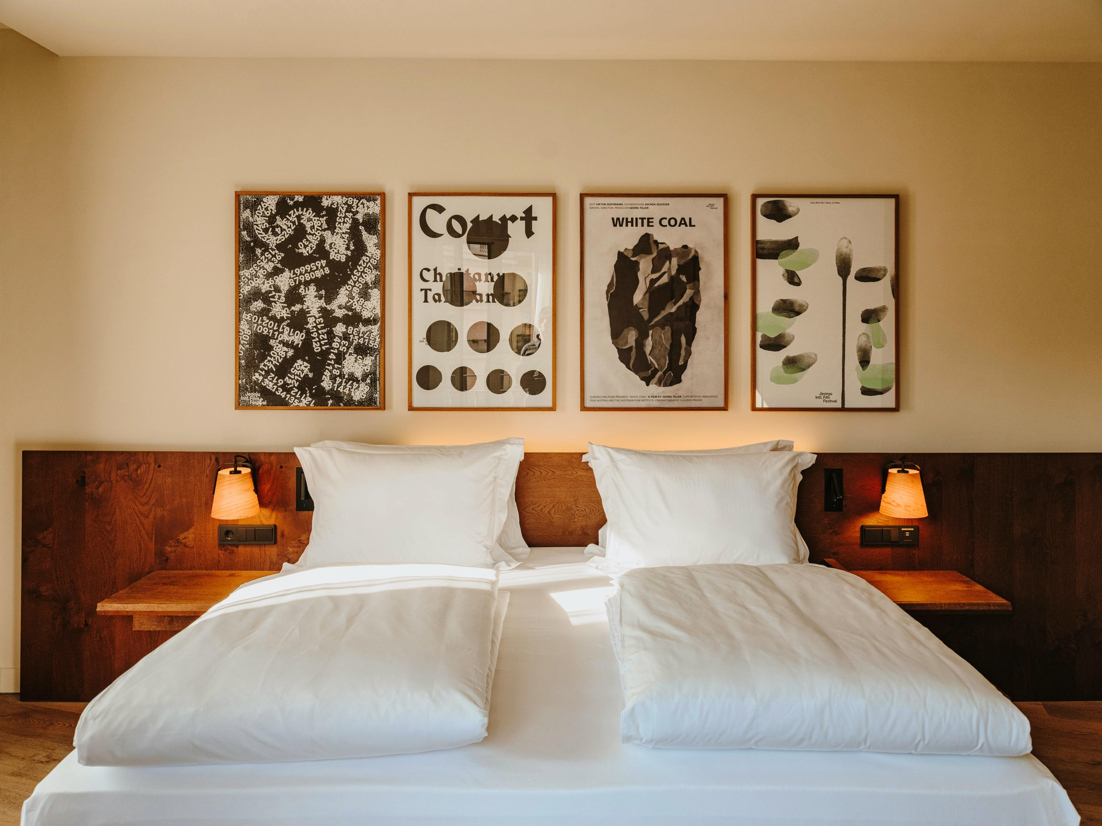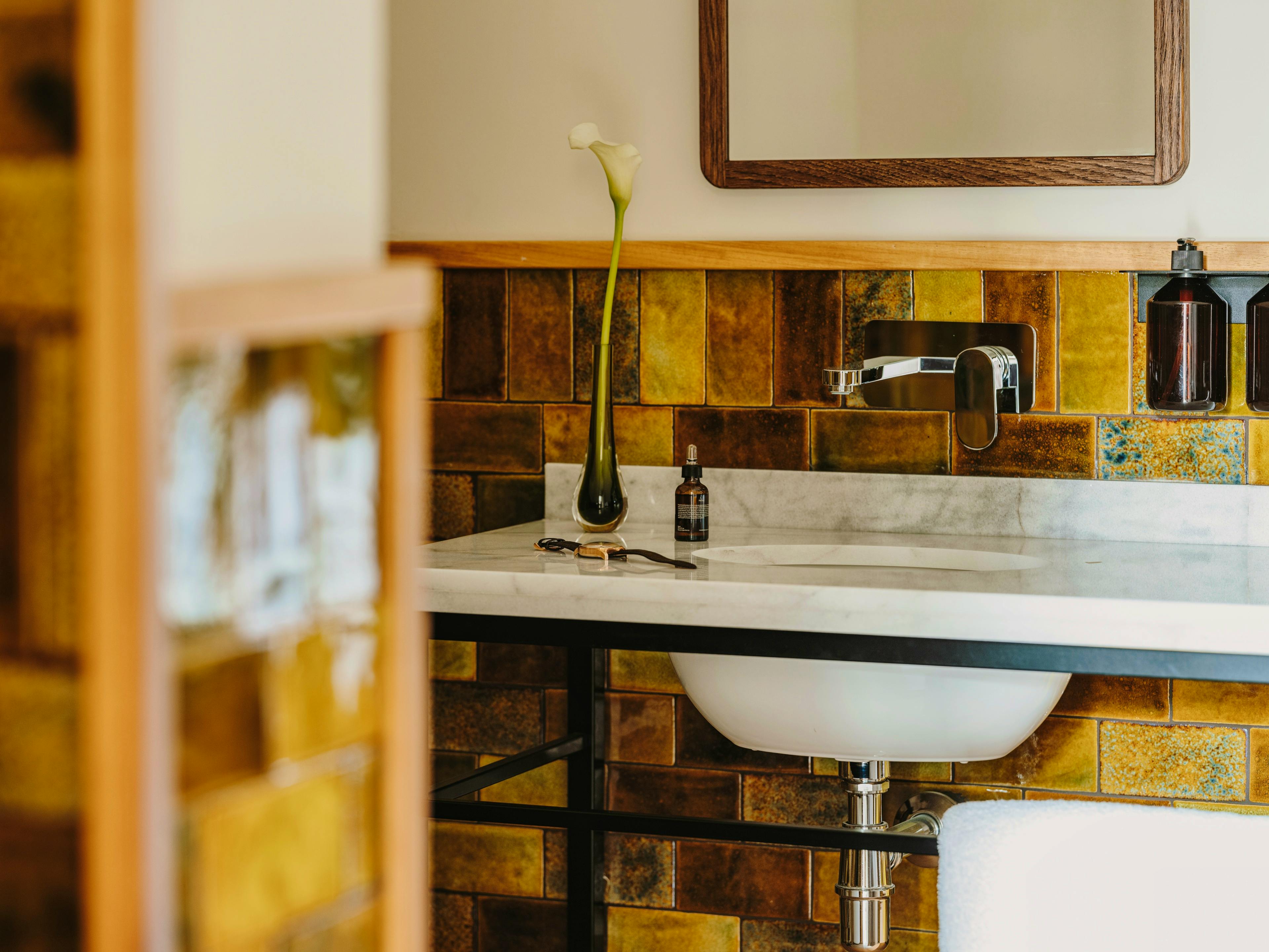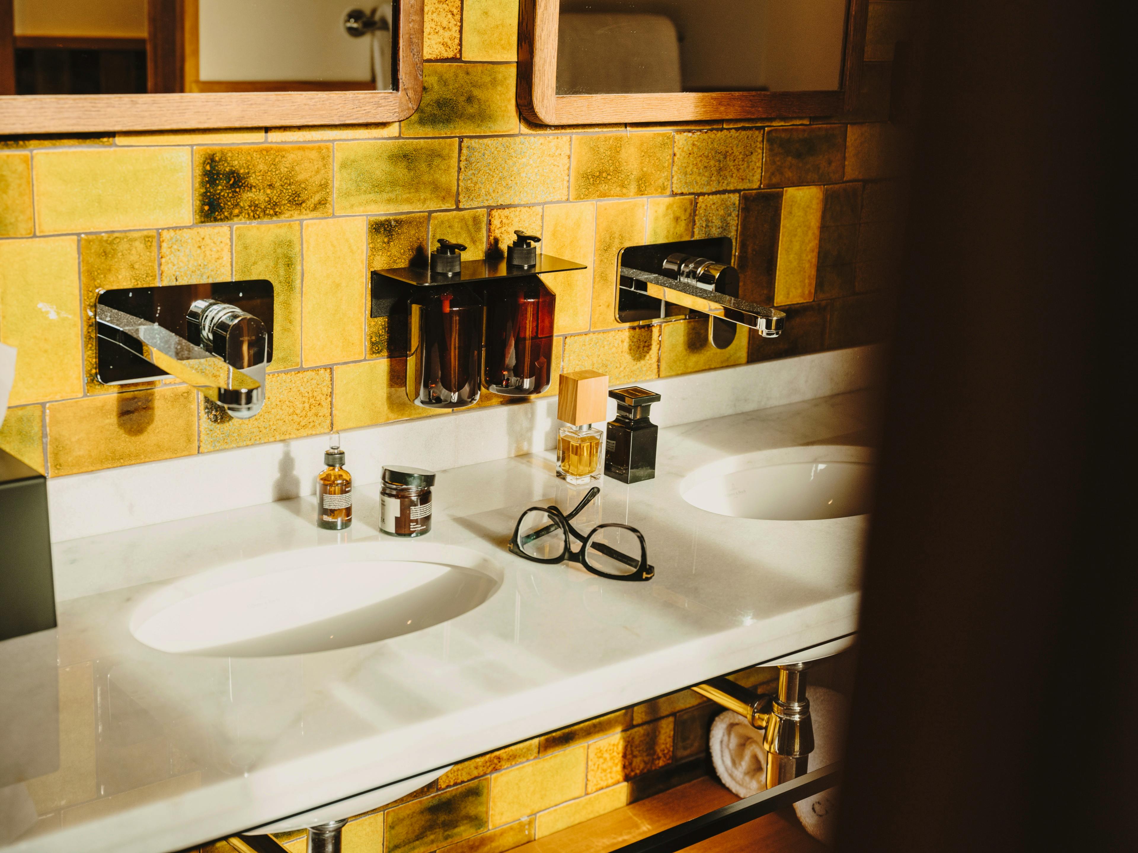 Calm, minimalist rooms with warm wood furnishings and amber tiles, offering a peaceful retreat from the vibrant streets below.