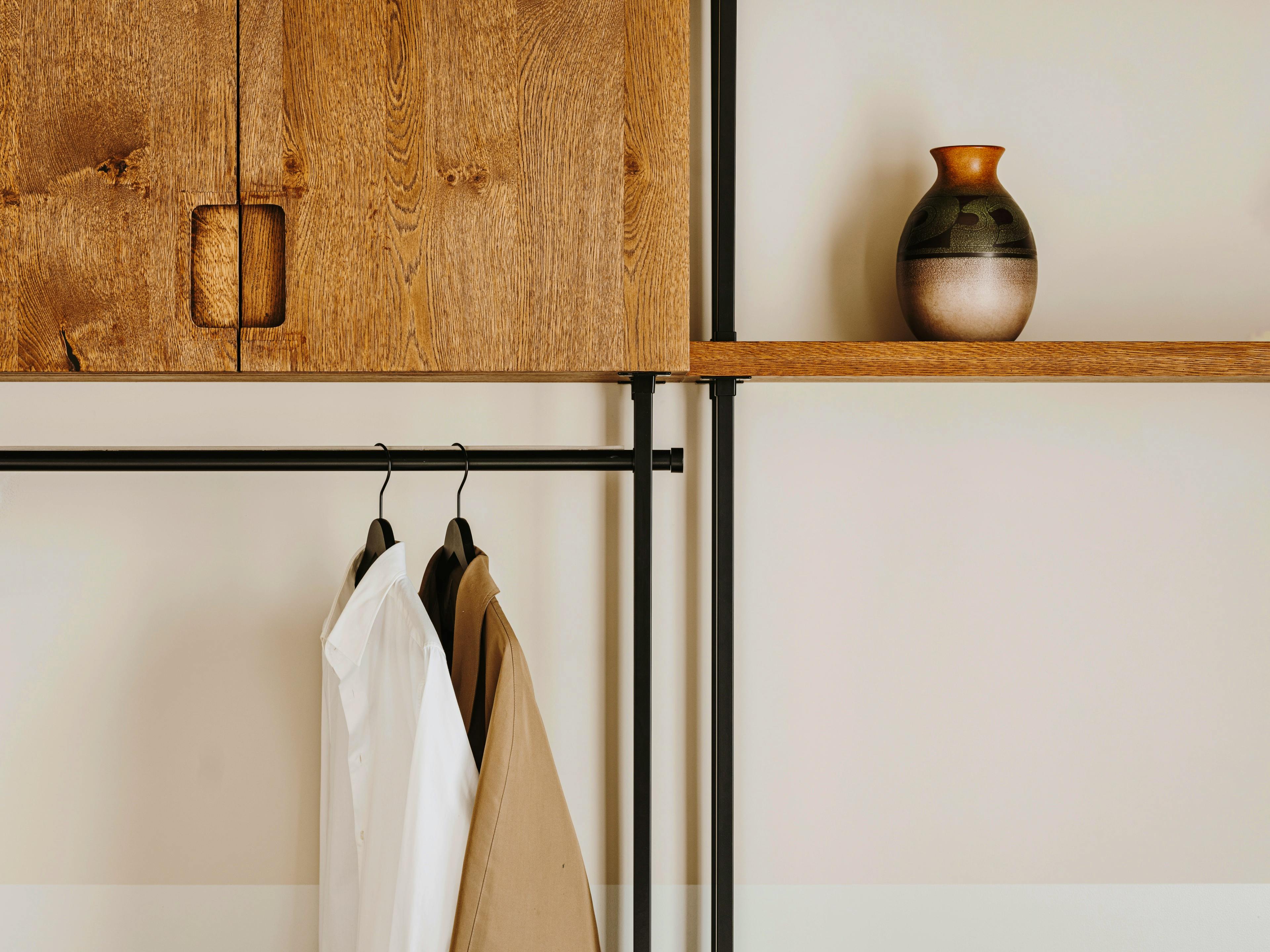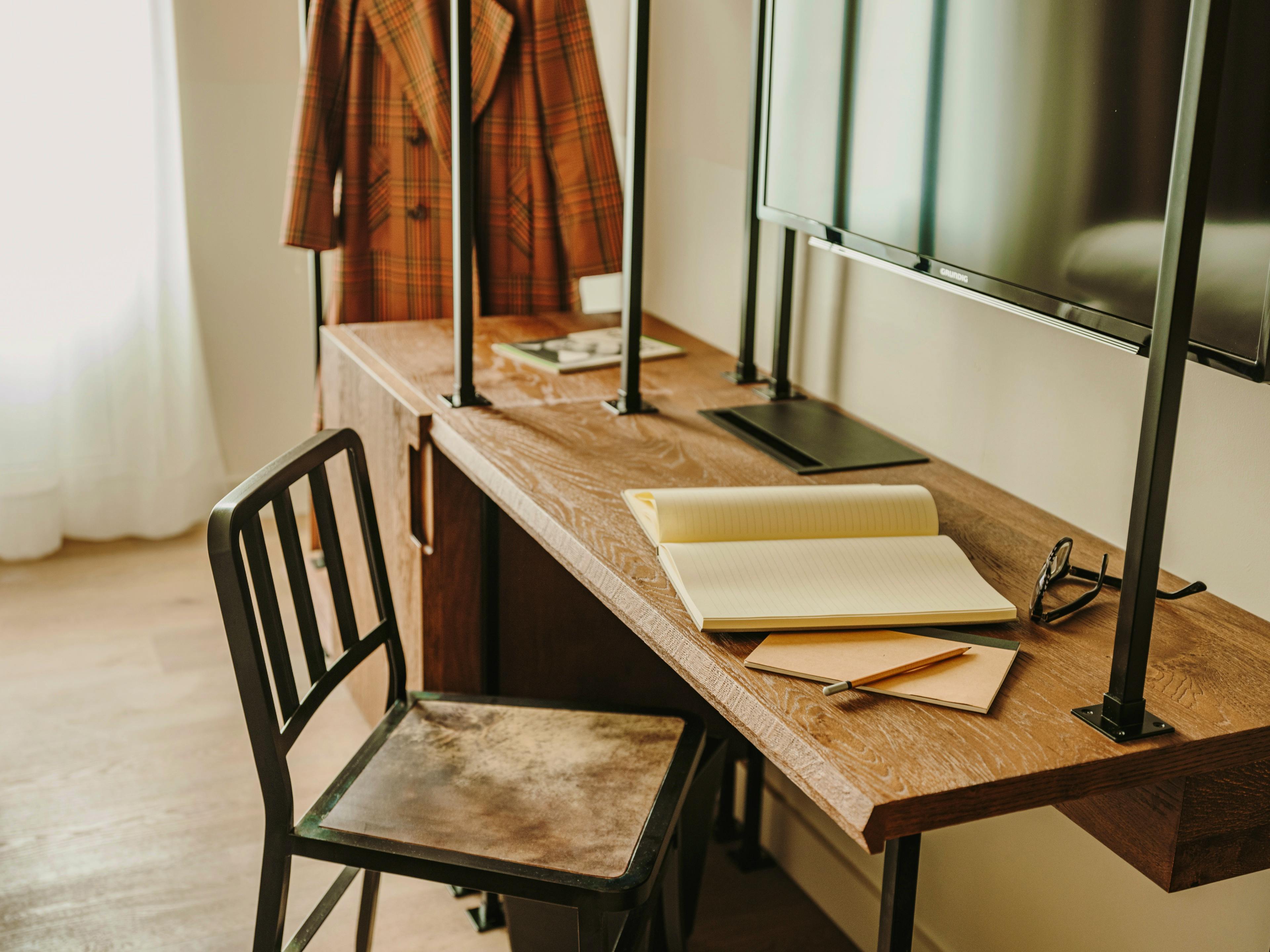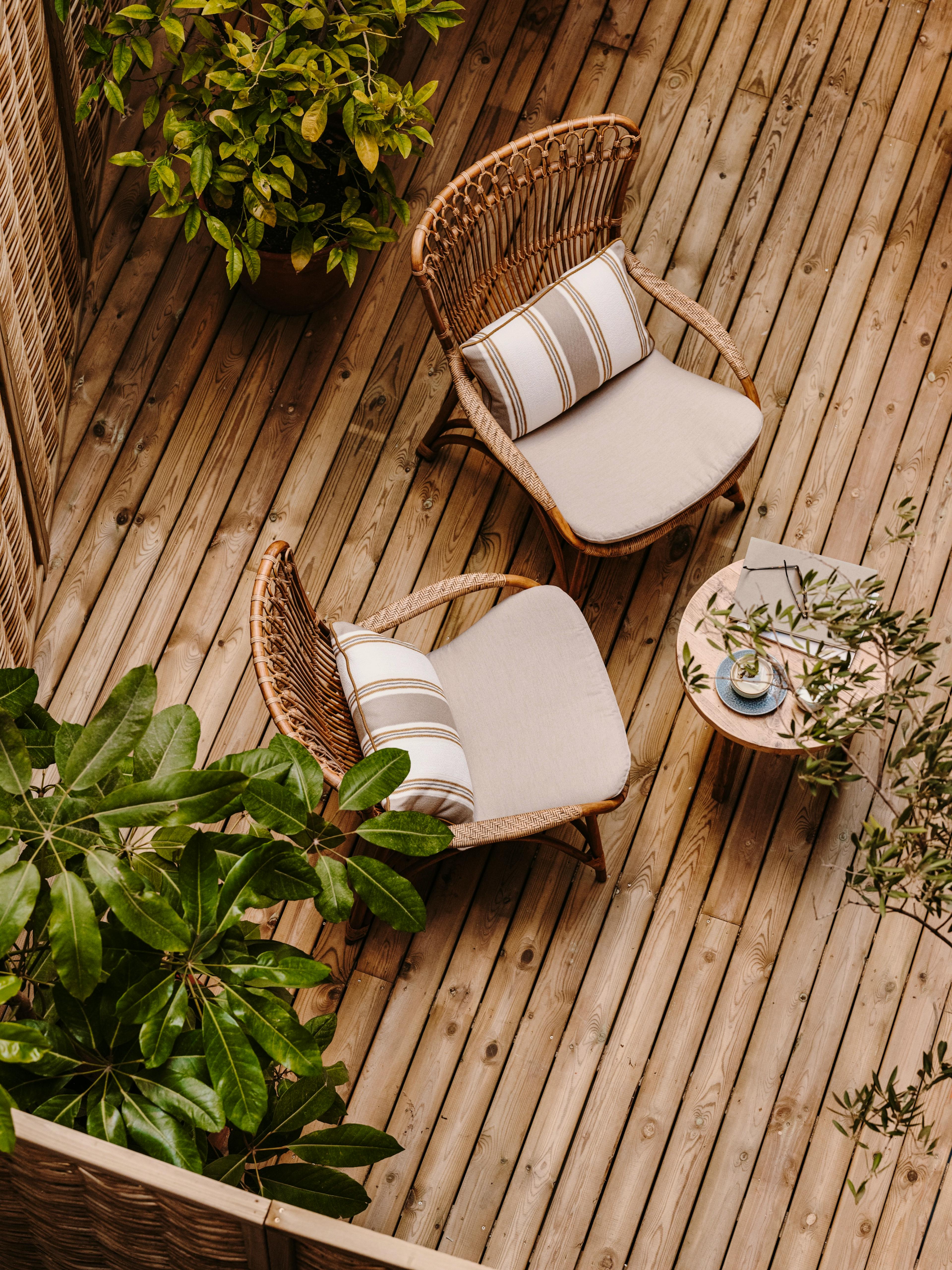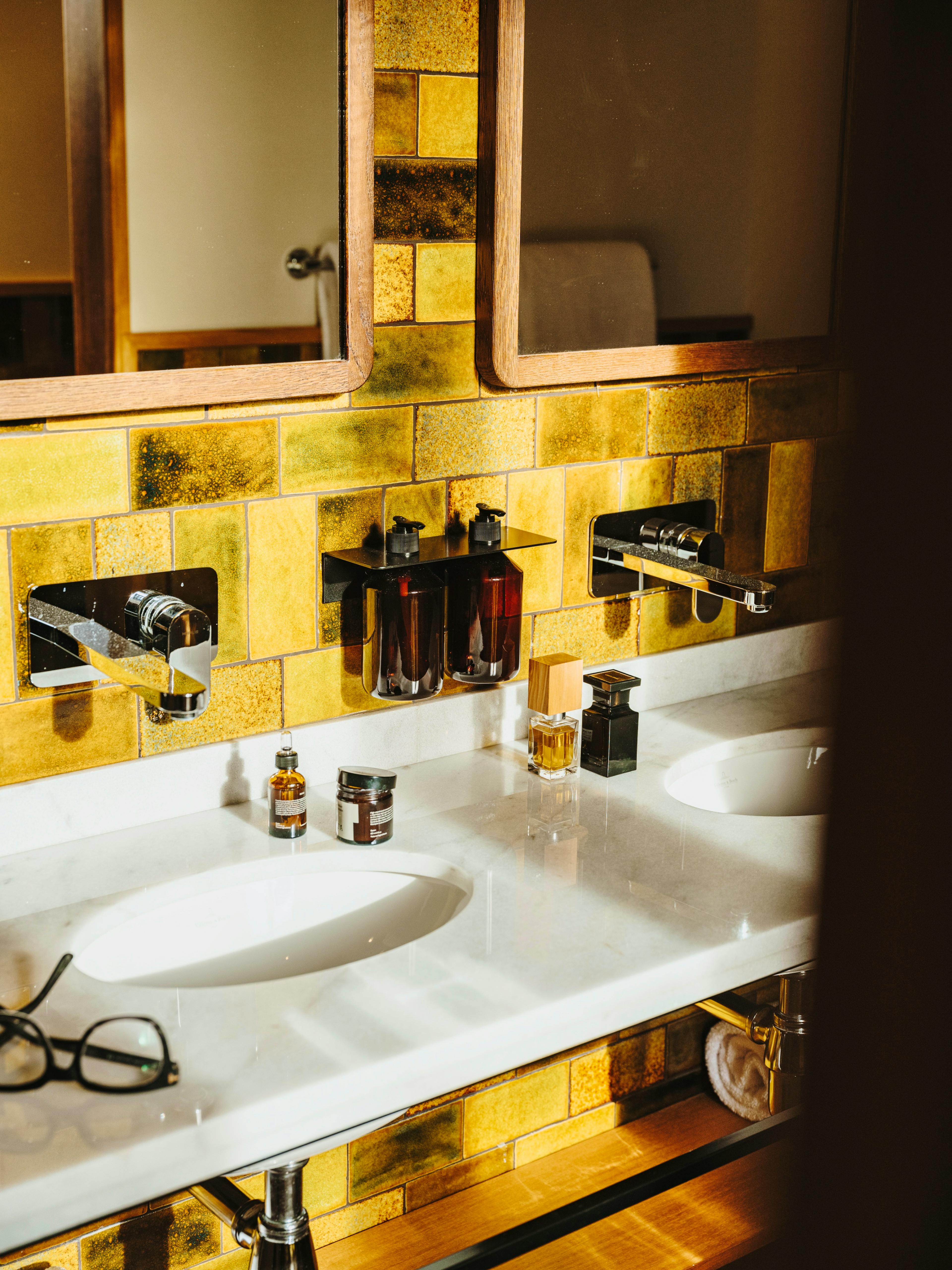 Calm, minimalist rooms with warm wood furnishings and amber tiles, offering a peaceful retreat from the vibrant streets below.