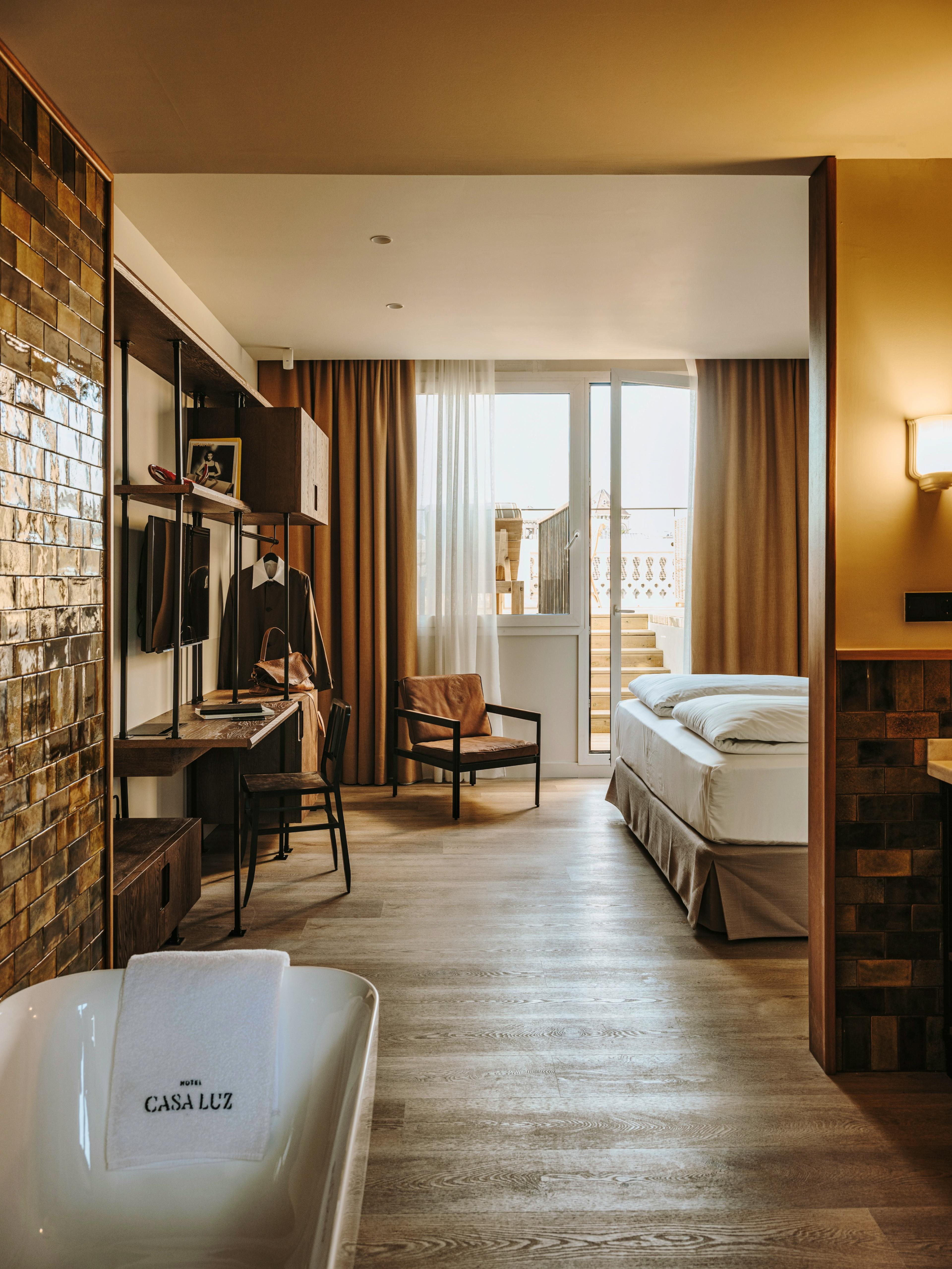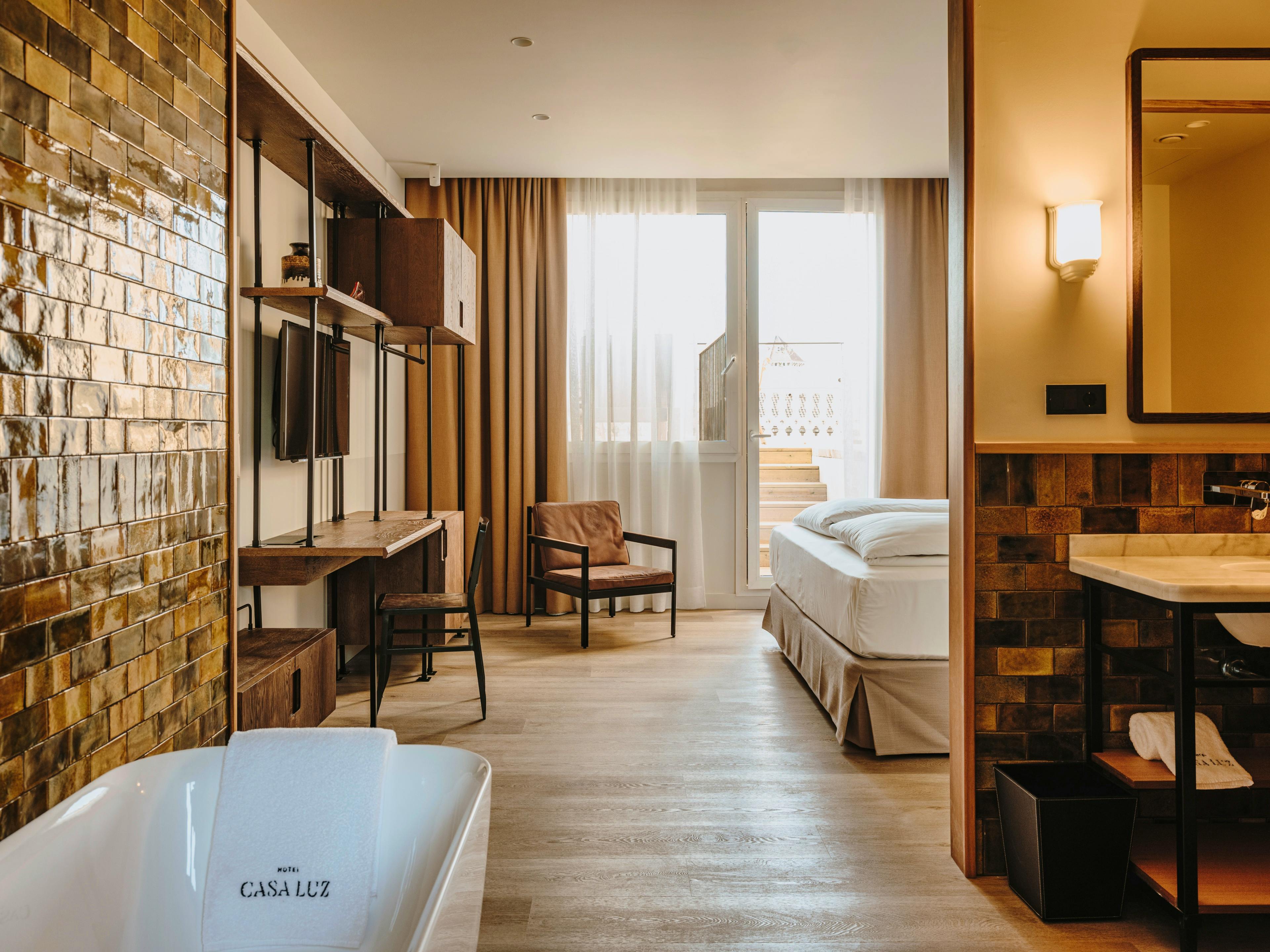 Right on one of Barcelona’s most iconic corners, Casa Luz is a design-led hotel that places you at the very heart of the city, with sweeping rooftop views, a lively restaurant and the energy of Barcelona unfolding just beyond the front door. Set on Plaça Universitat, this is a place to rest, live, eat and share, whether you’re here for culture, cuisine or simply soaking up the rhythm of the city. Inside, a handsome sandstone exterior gives way to calm, minimalist interiors designed by the renowned interior designer Lázaro Rosa-Violán, whose signature style blends timeless elegance with contemporary comfort. Rooms are warm and welcoming, styled with natural wood furnishings, amber tiles and a soothing, neutral palette that offers a peaceful retreat from the buzz outside. Thoughtful touches like daily housekeeping, WiFi and cable television make it effortless to settle in and feel at home after a day exploring. The true heart of Casa Luz sits on the sixth floor. From sunrise to sunset, the rooftop terrace is a place you’ll keep returning to. Start the day with breakfast as the city slowly wakes below you, then linger with a coffee, a book or a quiet moment in the fresh air. As evening arrives and the light softens, the terrace becomes a relaxed social space for cocktails and tapas, with panoramic views stretching across Barcelona’s rooftops. Dining here is a celebration of the city itself. The Casa Luz restaurant champions healthy, flavour-packed dishes and tapas rooted firmly in local Catalan traditions. Sustainability runs through everything, from energy efficiency and materials to the food on your plate, reflecting a genuine commitment to the planet and the city Casa Luz calls home. Step outside and Barcelona is yours. Wander the historic streets of the Gothic Quarter, browse the boutiques and restaurants of the Eixample, or lose yourself in the creative pulse of El Raval. MACBA, La Boqueria and Las Ramblas are all moments away, with the seafront within easy reach. Wherever the day takes you, Casa Luz is perfectly placed to welcome you back.