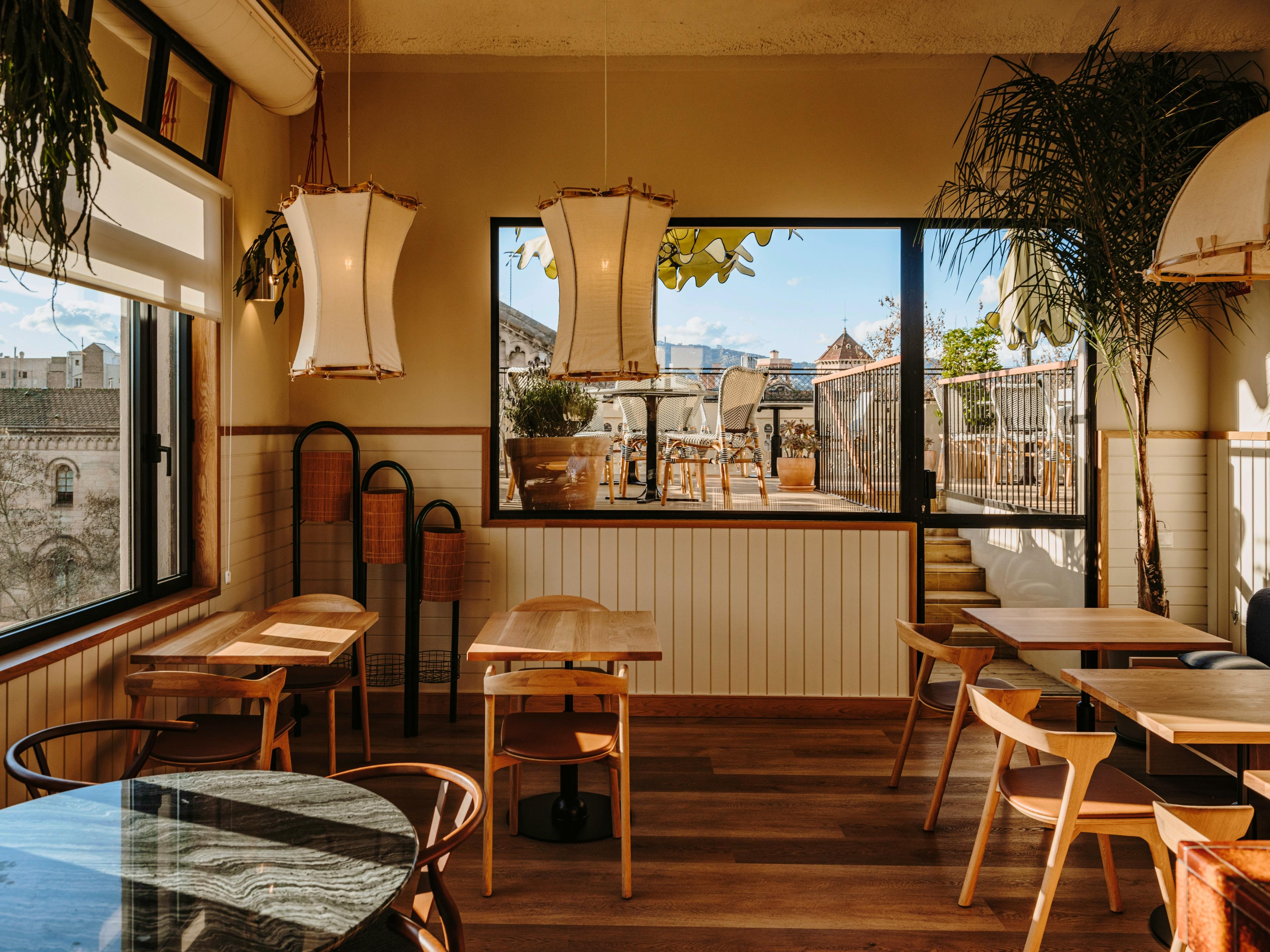 Sixth-floor rooftop terrace, open from sunrise to sunset, with panoramic city views, cocktails and tapas high above Barcelona’s rooftops.