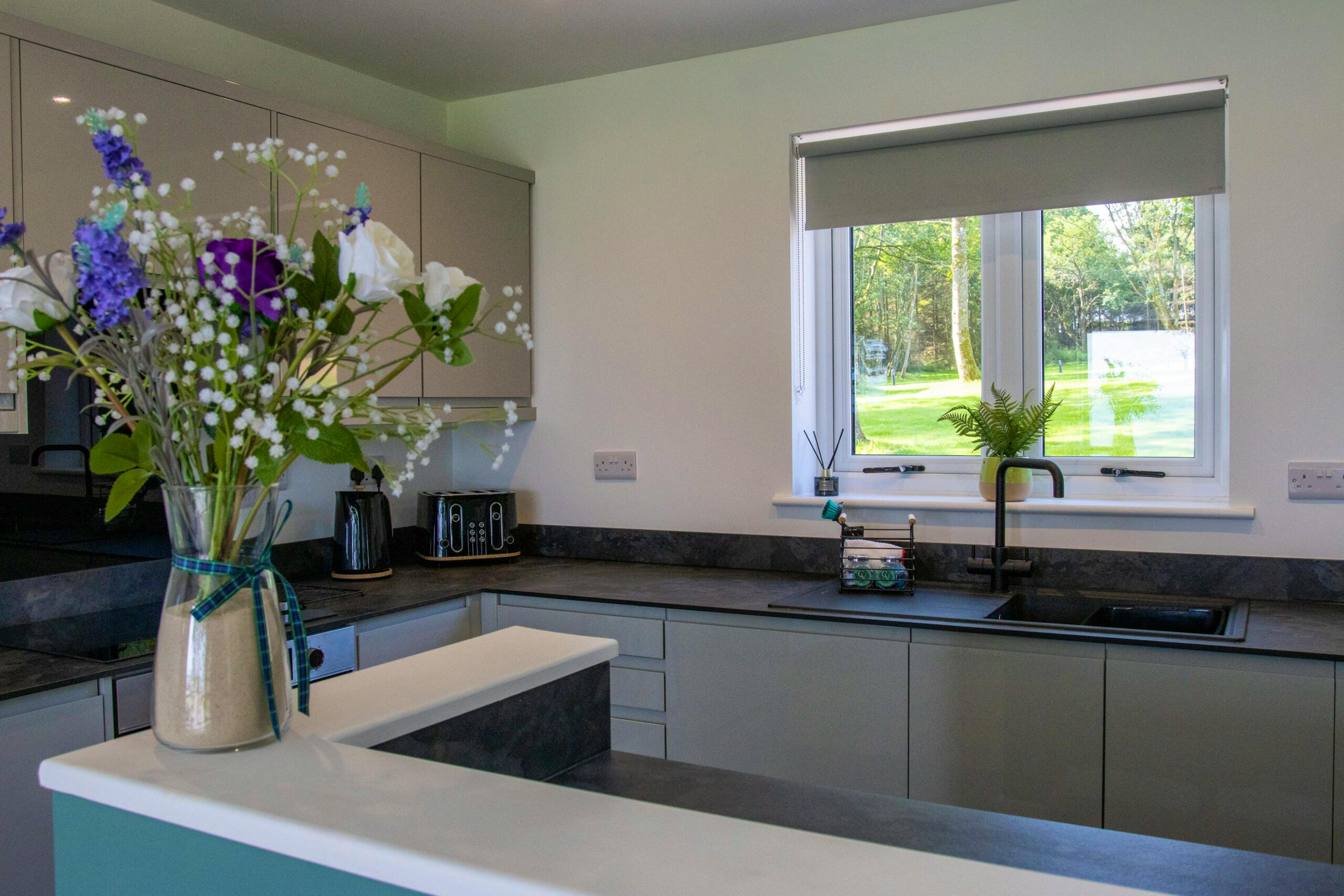 Enjoy leisurely breakfasts and long dinners in the fully equipped kitchen, with wide windows framing the countryside beyond.