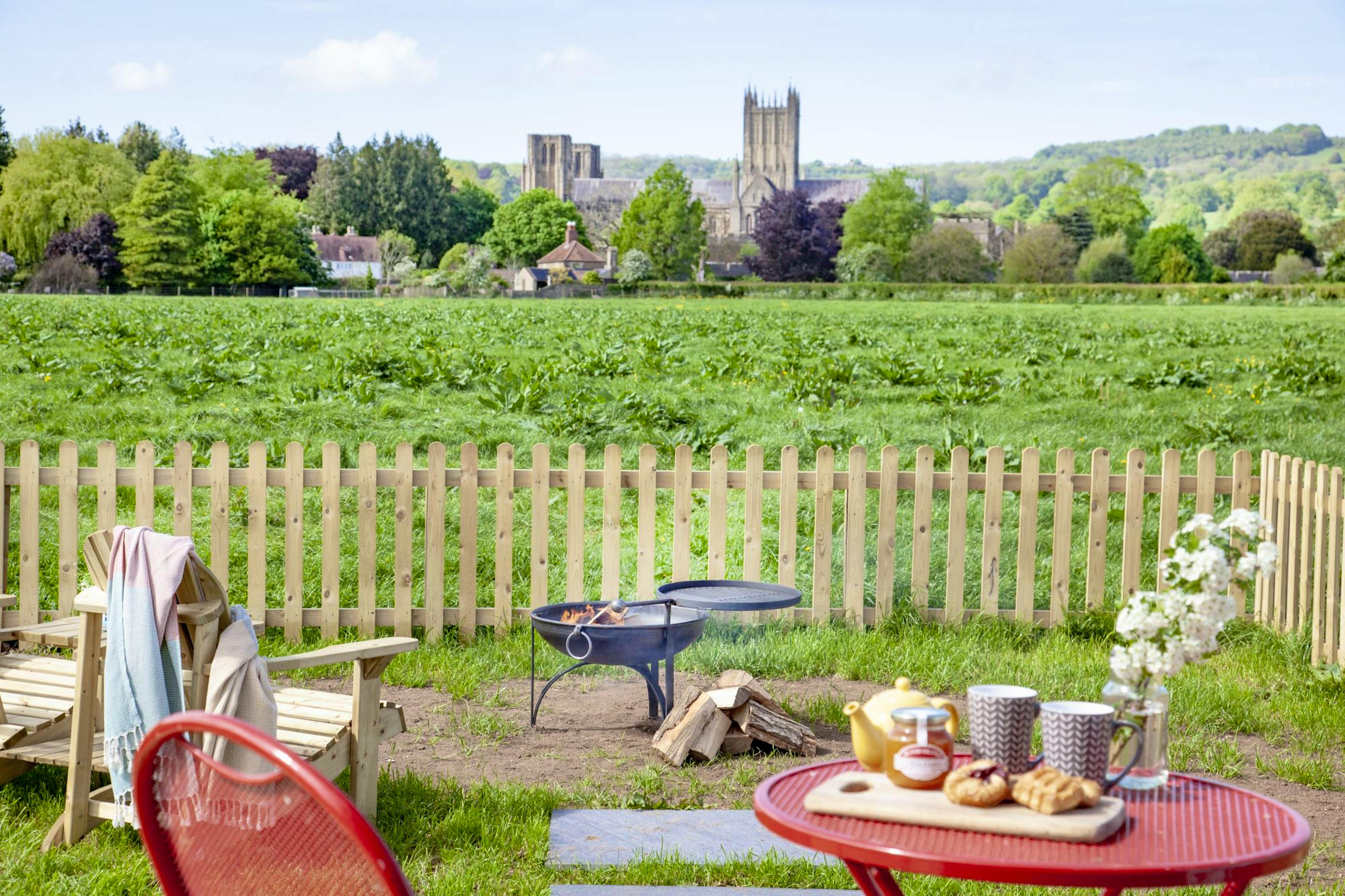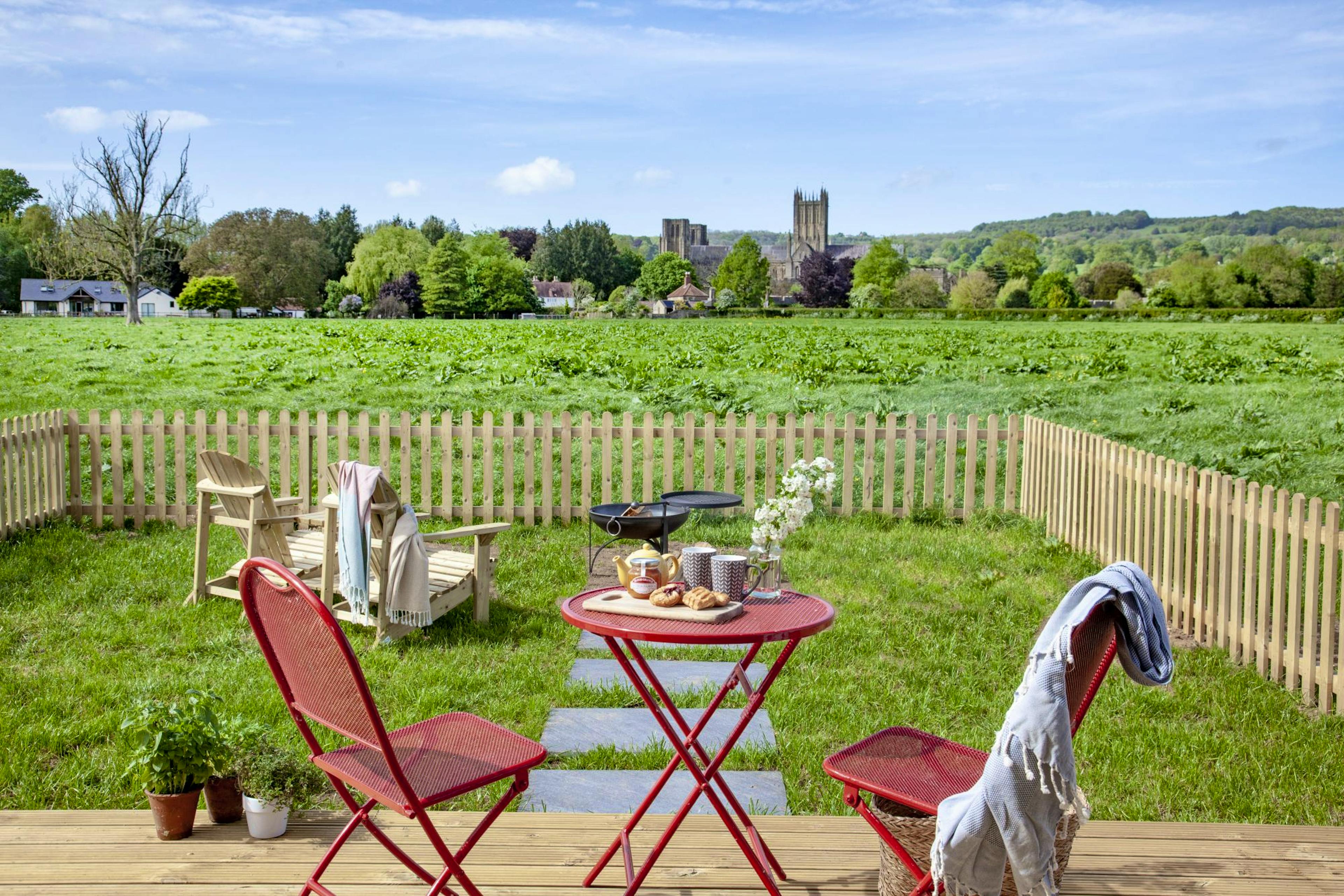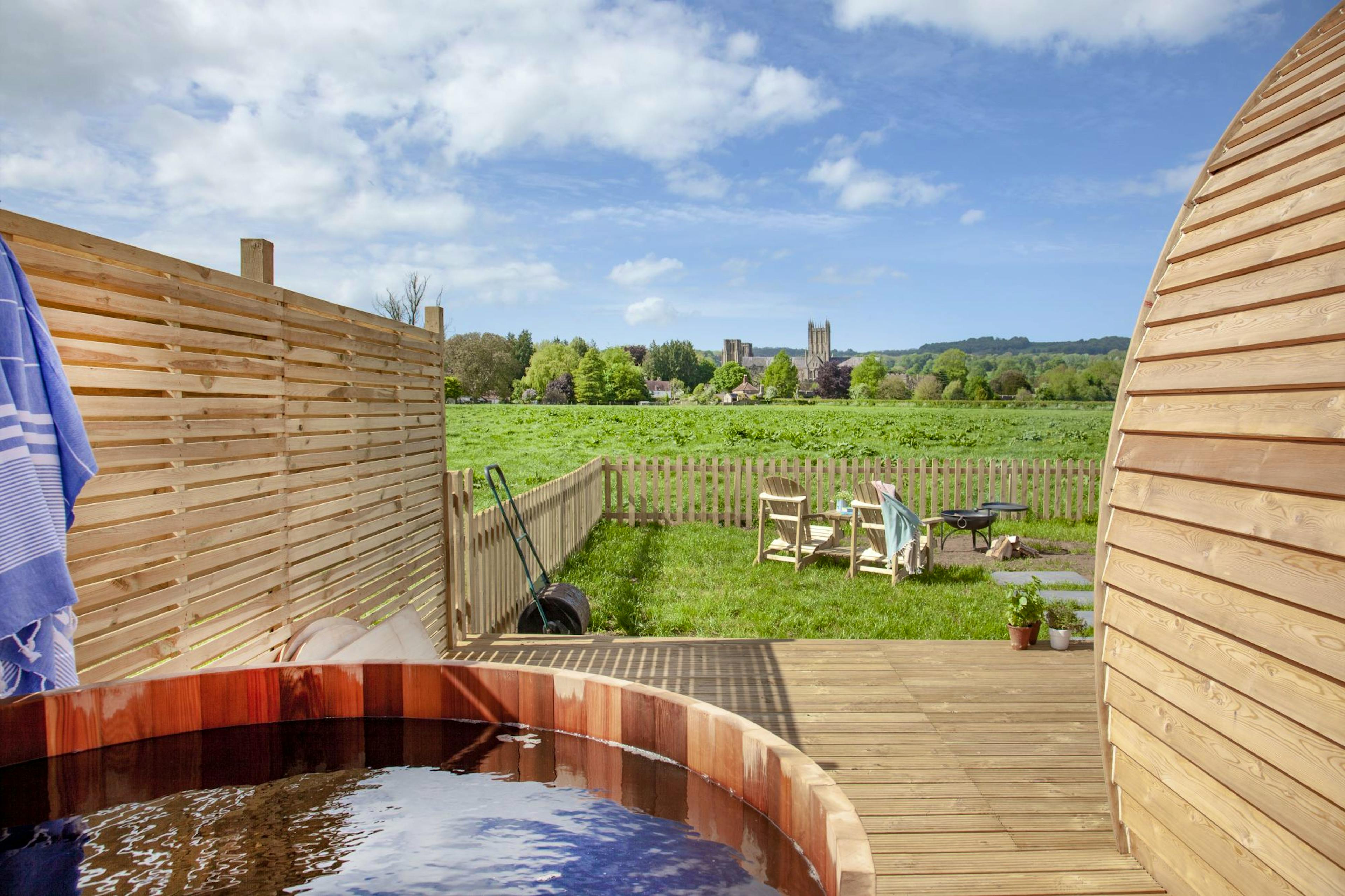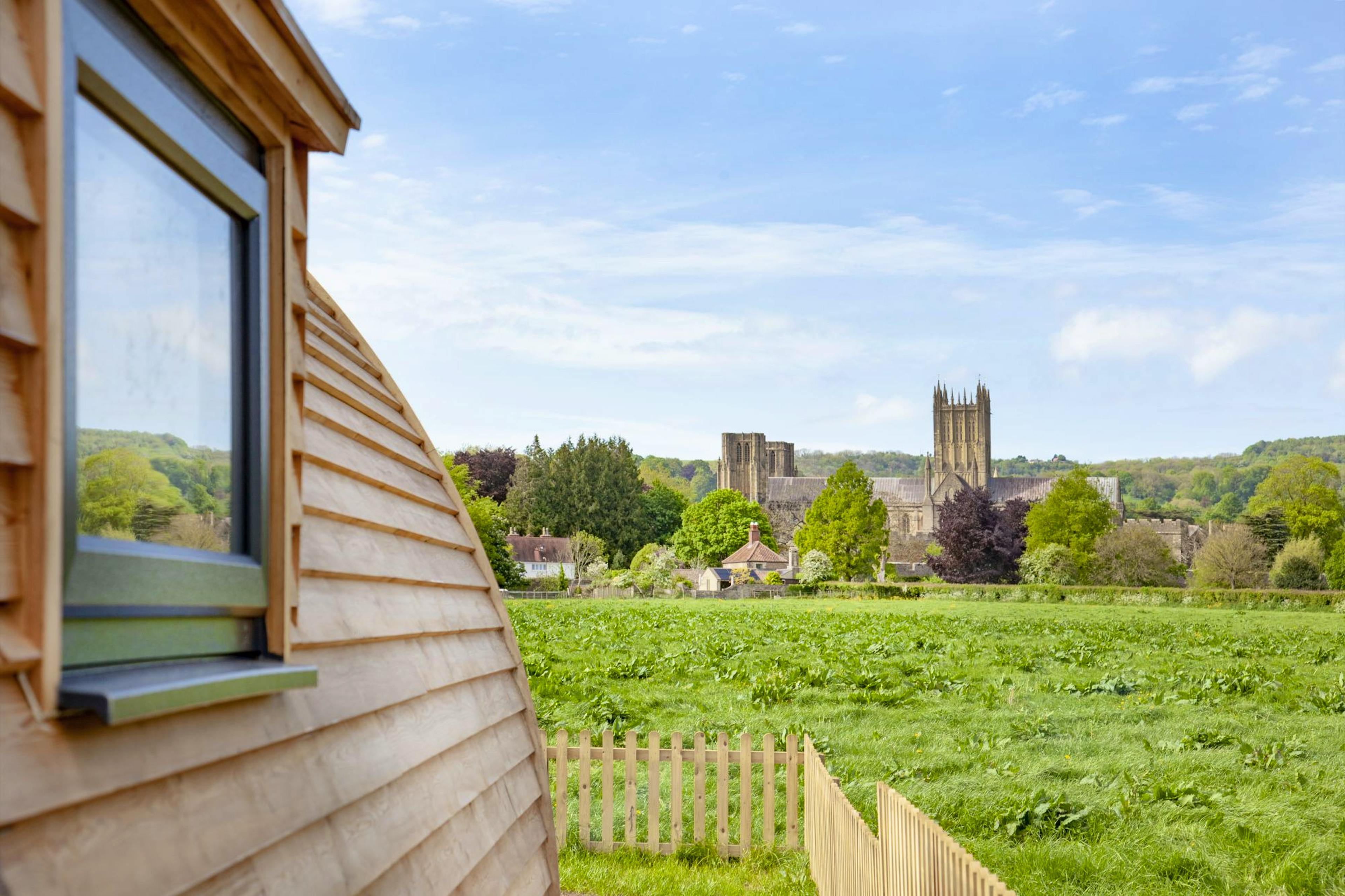 The city of Wells is by no means sprawling (in fact it's the smallest in England), however what it lacks in size it more than makes up for in sheer enchantment with its cobbled streets and market village atmosphere. It also happens to boast one of the most marvellous Medieval cathedrals in the land, and it's one that has been attracting at first pilgrims then visitors by their droves since the 13th Century. Huddled in the heart of rural Somerset at the foot of the Mendhips, Wells is a merge of two attractive worlds, one of Gothic architecture, narrow streets, pavement cafes and independent shops, and the other of countryside quiet and nature-infused pursuits. With its secluded setting and sweeping outlook over private farmland, this gorgeous glamping pod is a little slice of rural perfection, but what makes it completely unique is its staggering, uninterrupted view of Wells Cathedral. The ideal balance between countryside escapism and city break, Chapterhouse offers couples a truly idyllic place to unwind away from a busy schedule while being just a stroll from Wells city and all it has to offer. Designed with perfect proportions that feel more boutique retreat than rustic, the pod’s interior feels contemporary, spacious and airy, with creature comforts galore. There’s a dining area, living room, kitchen and bedroom all laid out as open plan and a separate bathroom which includes a large walk-in shower complete with rain head. French doors open the entire space outside to a timber deck where you’ll be able to unwind in complete solitude, barbecuing in the sunshine or indulgently soaking in the wood-fired hot tub which has been tucked away to the side of the lodge. Guests with their four-legged companions in tow will be pleased to know Chapterhouse welcomes pets, so for peace of mind, the fence surrounding the property completely encloses the space. There are also many lovely walks in the area for both humans and canines to explore including a public bridle way that lies directly behind the field. Of course, Wells is a mere stroll away, so you’ll be able to enjoy a coffee or luncheon at The Bishop’s Table within minutes of leaving your front door.