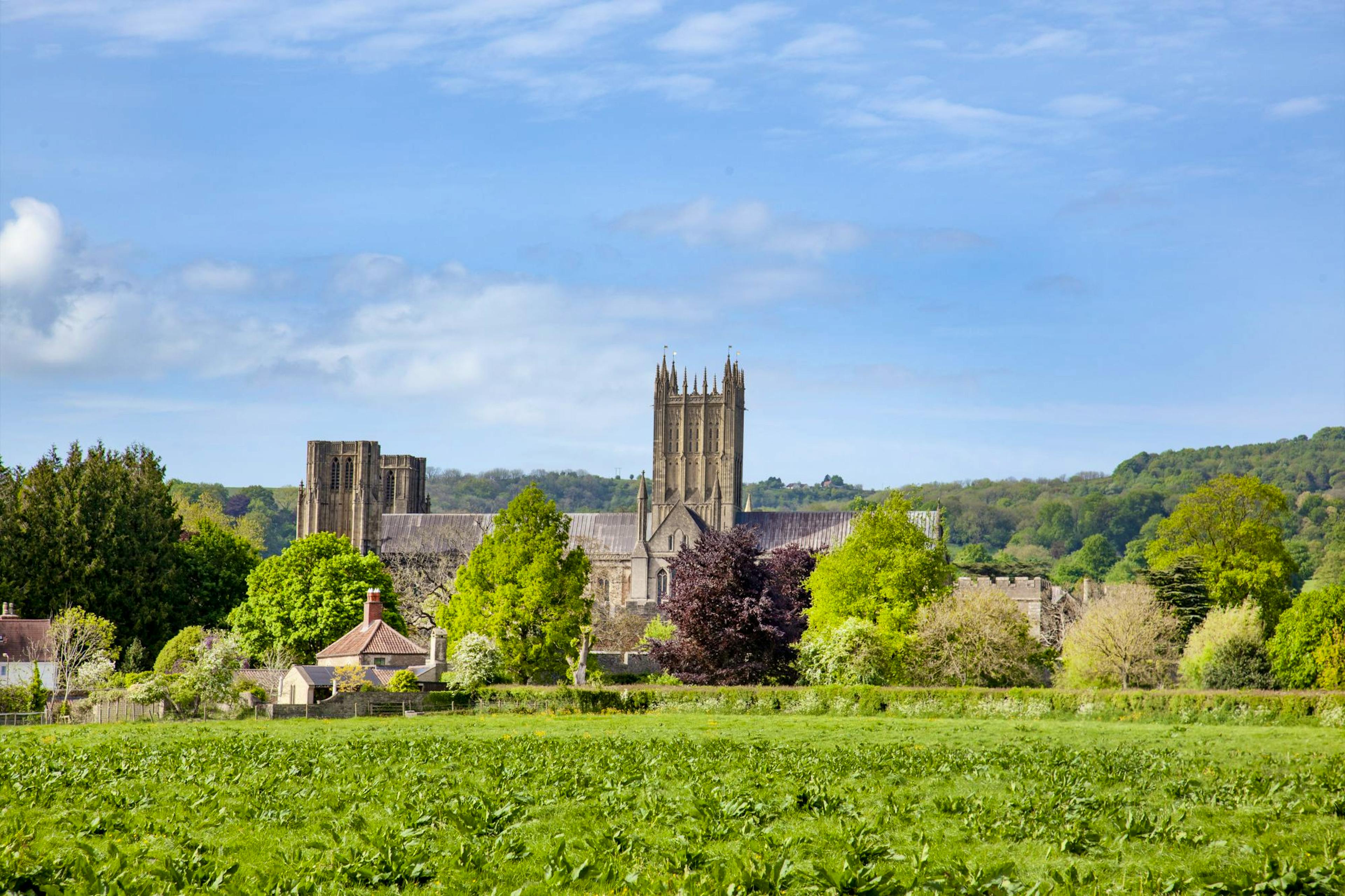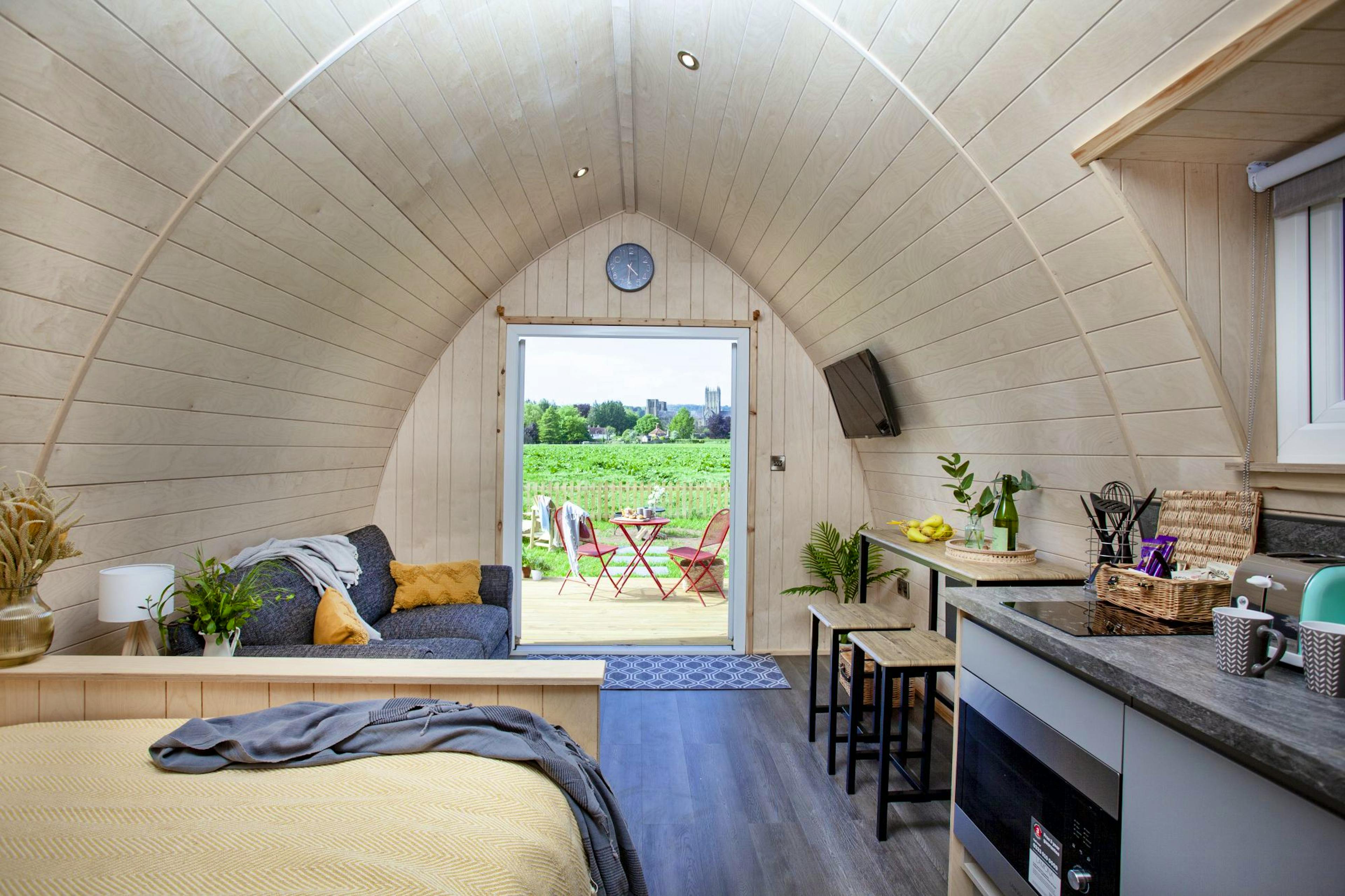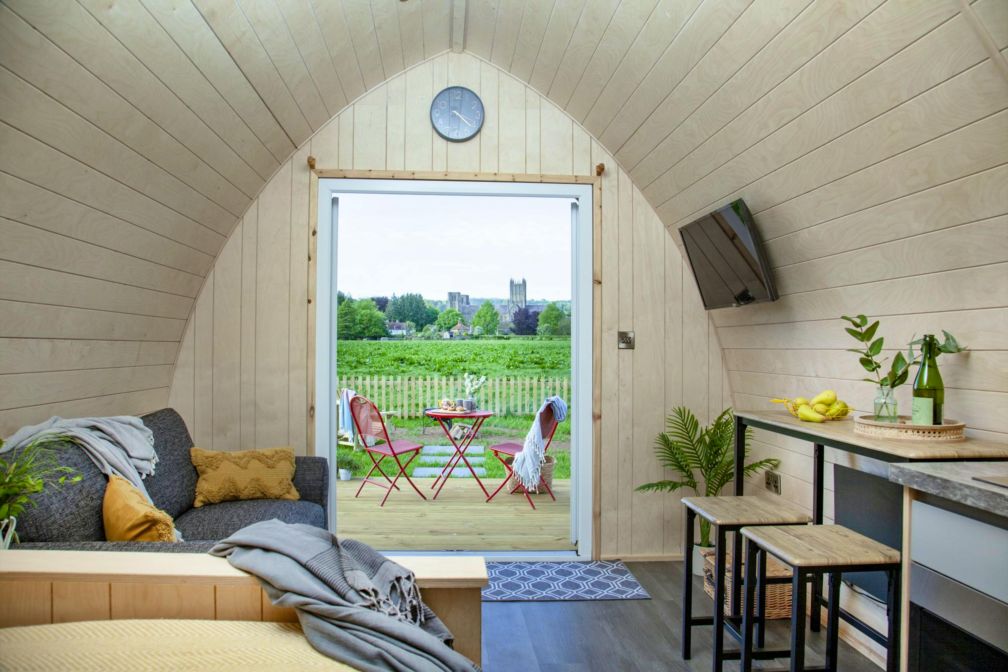 The city of Wells is by no means sprawling (in fact it's the smallest in England), however what it lacks in size it more than makes up for in sheer enchantment with its cobbled streets and market village atmosphere. It also happens to boast one of the most marvellous Medieval cathedrals in the land, and it's one that has been attracting at first pilgrims then visitors by their droves since the 13th Century. Huddled in the heart of rural Somerset at the foot of the Mendhips, Wells is a merge of two attractive worlds, one of Gothic architecture, narrow streets, pavement cafes and independent shops, and the other of countryside quiet and nature-infused pursuits. With its secluded setting and sweeping outlook over private farmland, this gorgeous glamping pod is a little slice of rural perfection, but what makes it completely unique is its staggering, uninterrupted view of Wells Cathedral. The ideal balance between countryside escapism and city break, Chapterhouse offers couples a truly idyllic place to unwind away from a busy schedule while being just a stroll from Wells city and all it has to offer. Designed with perfect proportions that feel more boutique retreat than rustic, the pod’s interior feels contemporary, spacious and airy, with creature comforts galore. There’s a dining area, living room, kitchen and bedroom all laid out as open plan and a separate bathroom which includes a large walk-in shower complete with rain head. French doors open the entire space outside to a timber deck where you’ll be able to unwind in complete solitude, barbecuing in the sunshine or indulgently soaking in the wood-fired hot tub which has been tucked away to the side of the lodge. Guests with their four-legged companions in tow will be pleased to know Chapterhouse welcomes pets, so for peace of mind, the fence surrounding the property completely encloses the space. There are also many lovely walks in the area for both humans and canines to explore including a public bridle way that lies directly behind the field. Of course, Wells is a mere stroll away, so you’ll be able to enjoy a coffee or luncheon at The Bishop’s Table within minutes of leaving your front door.