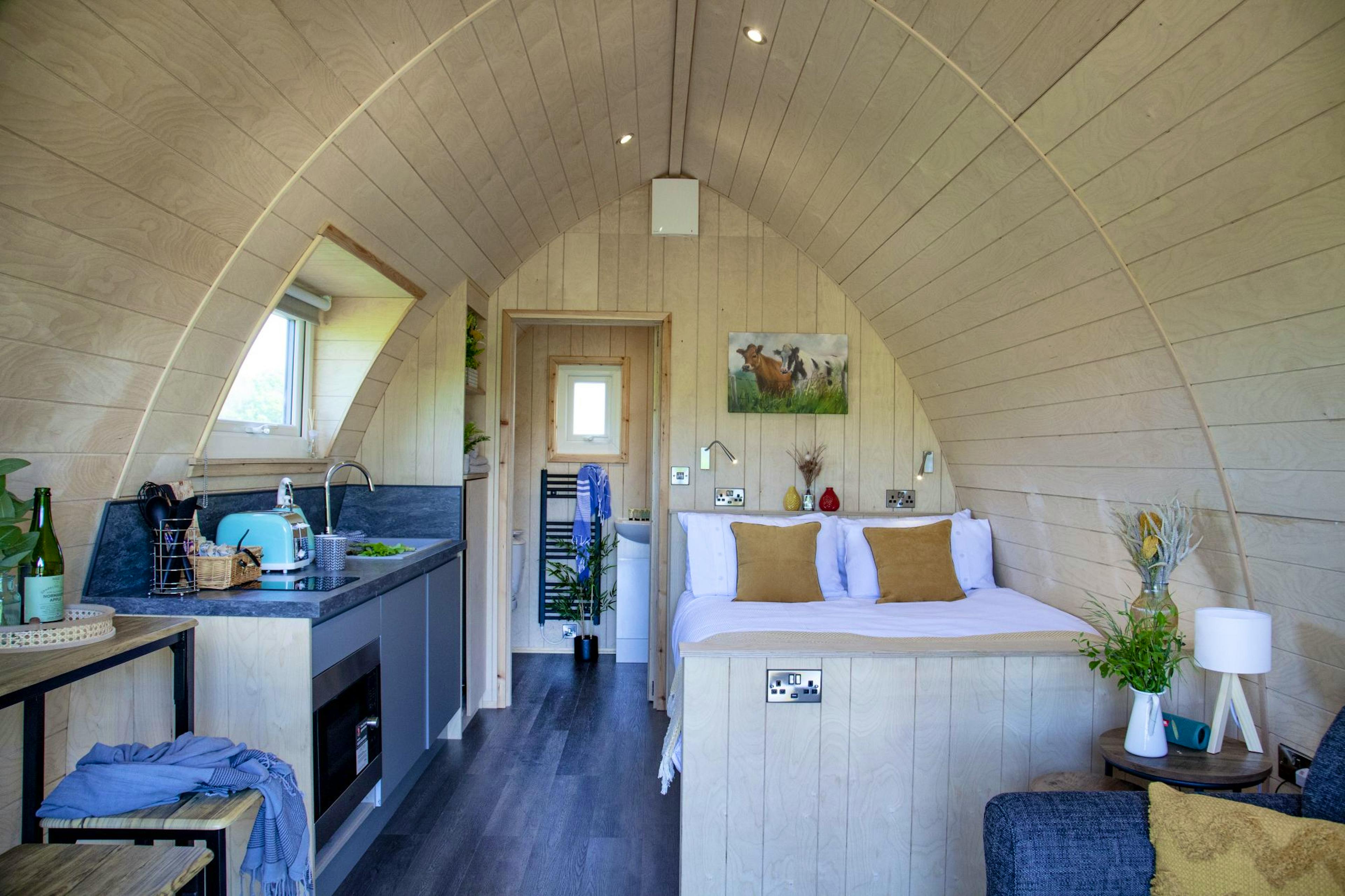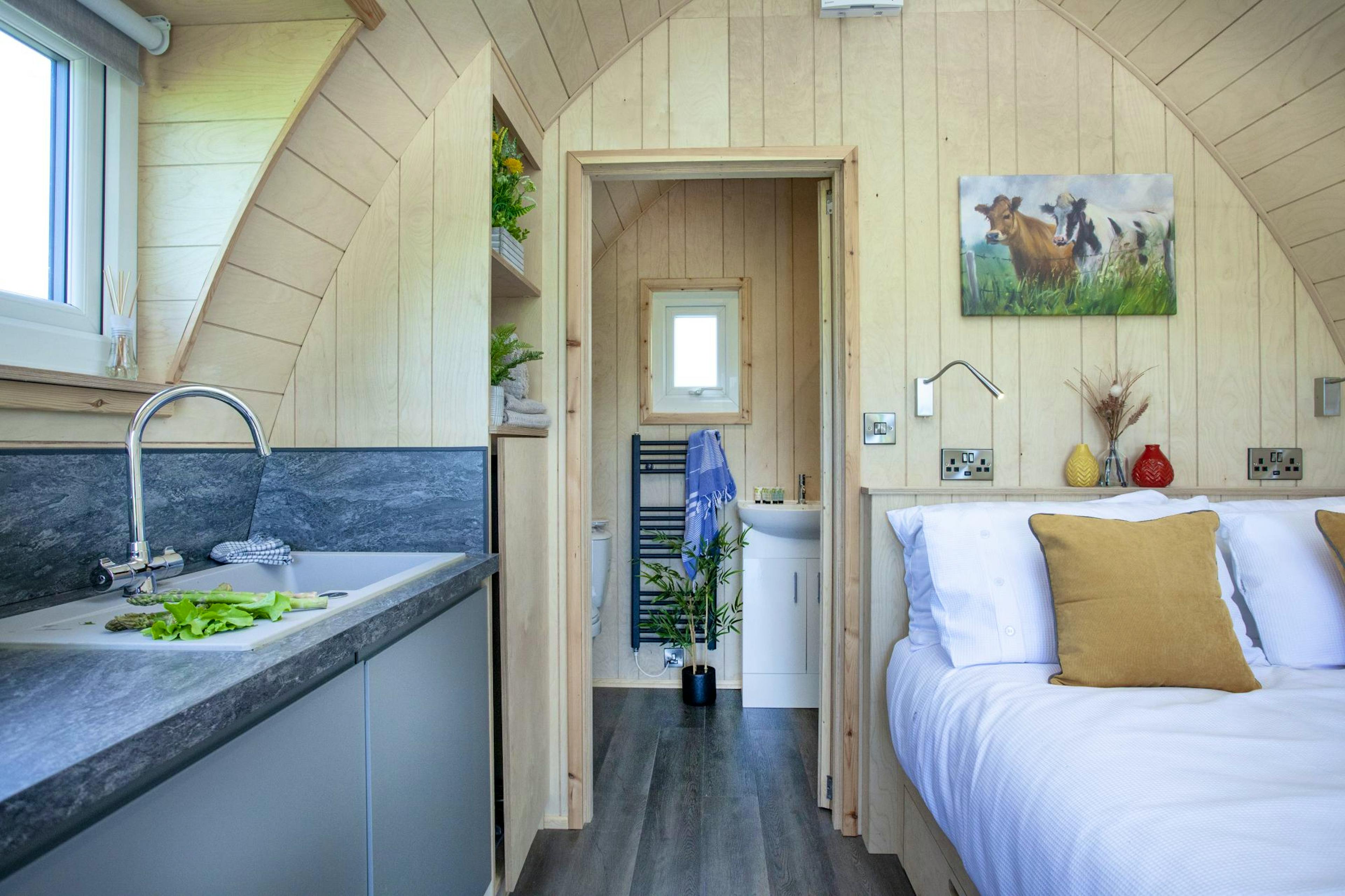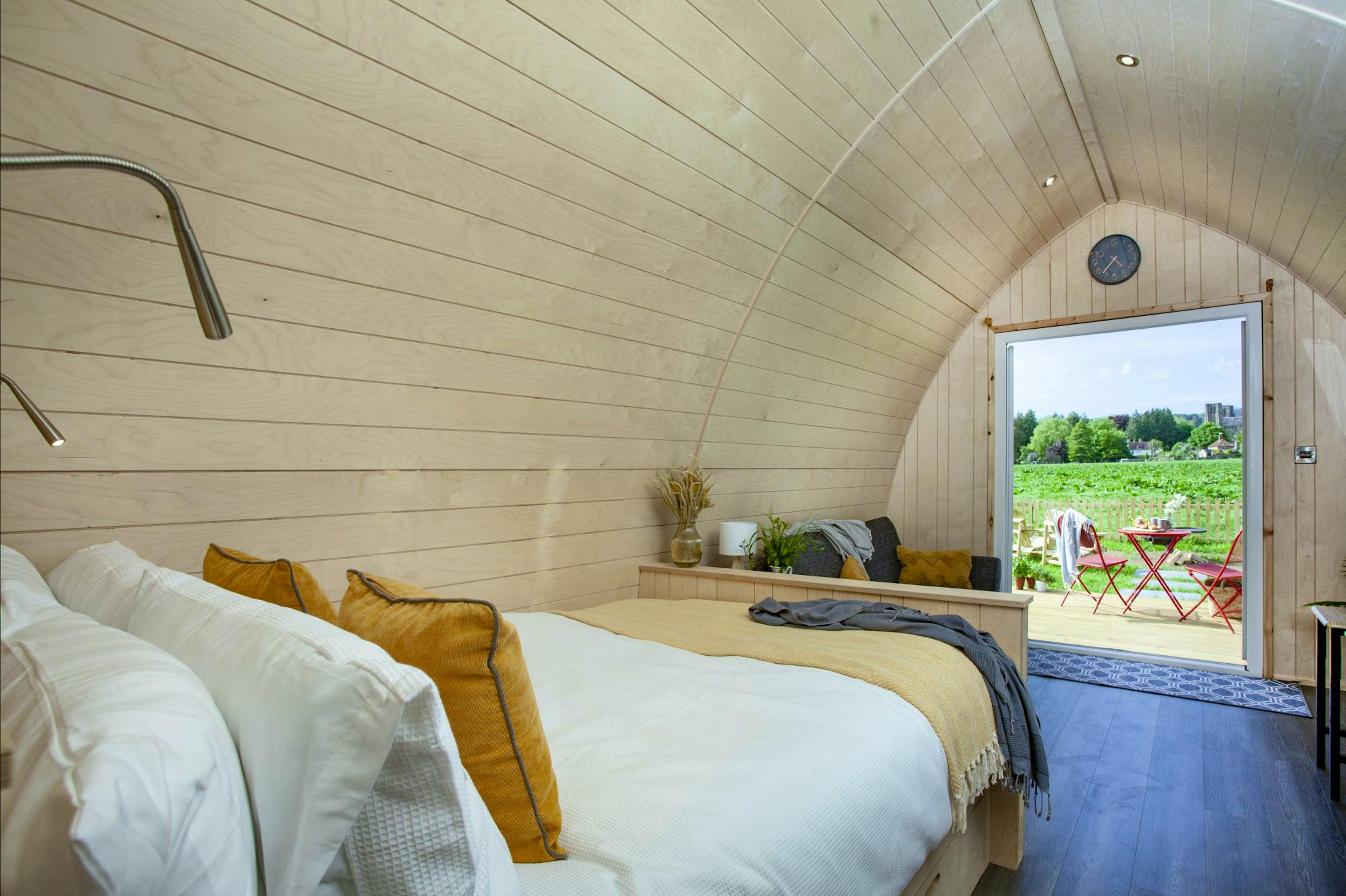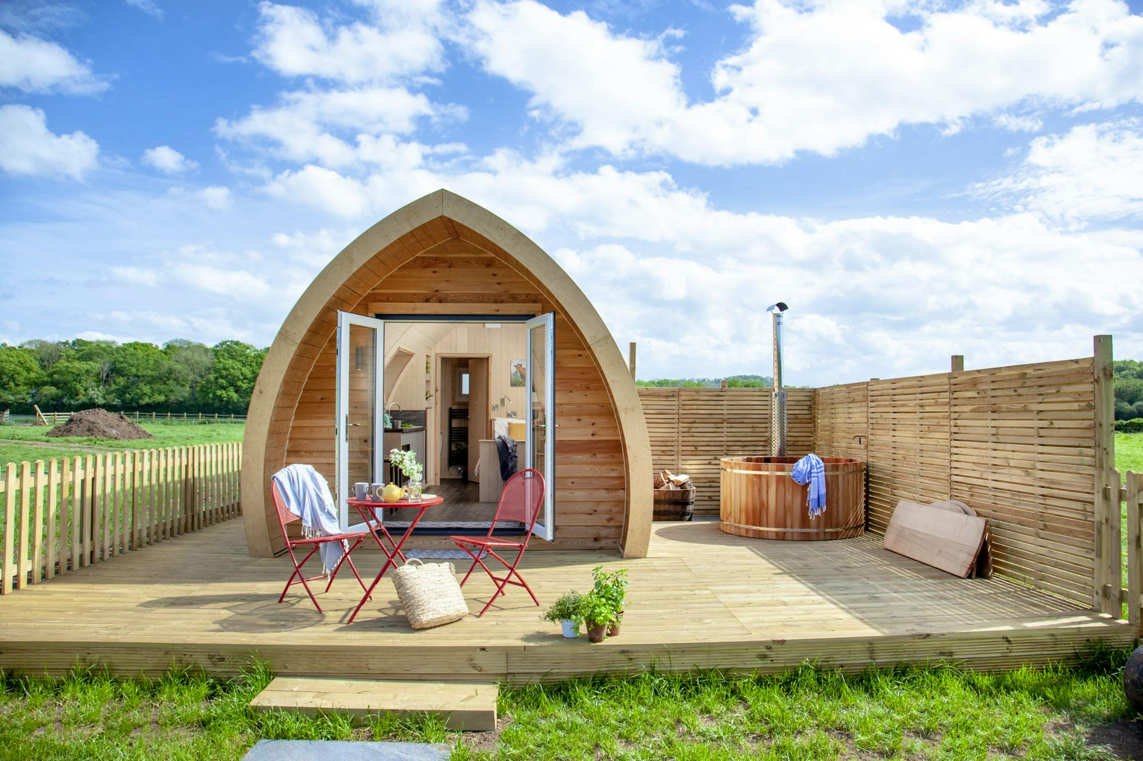 The city of Wells is by no means sprawling (in fact it's the smallest in England), however what it lacks in size it more than makes up for in sheer enchantment with its cobbled streets and market village atmosphere. It also happens to boast one of the most marvellous Medieval cathedrals in the land, and it's one that has been attracting at first pilgrims then visitors by their droves since the 13th Century. Huddled in the heart of rural Somerset at the foot of the Mendhips, Wells is a merge of two attractive worlds, one of Gothic architecture, narrow streets, pavement cafes and independent shops, and the other of countryside quiet and nature-infused pursuits. With its secluded setting and sweeping outlook over private farmland, this gorgeous glamping pod is a little slice of rural perfection, but what makes it completely unique is its staggering, uninterrupted view of Wells Cathedral. The ideal balance between countryside escapism and city break, Chapterhouse offers couples a truly idyllic place to unwind away from a busy schedule while being just a stroll from Wells city and all it has to offer. Designed with perfect proportions that feel more boutique retreat than rustic, the pod’s interior feels contemporary, spacious and airy, with creature comforts galore. There’s a dining area, living room, kitchen and bedroom all laid out as open plan and a separate bathroom which includes a large walk-in shower complete with rain head. French doors open the entire space outside to a timber deck where you’ll be able to unwind in complete solitude, barbecuing in the sunshine or indulgently soaking in the wood-fired hot tub which has been tucked away to the side of the lodge. Guests with their four-legged companions in tow will be pleased to know Chapterhouse welcomes pets, so for peace of mind, the fence surrounding the property completely encloses the space. There are also many lovely walks in the area for both humans and canines to explore including a public bridle way that lies directly behind the field. Of course, Wells is a mere stroll away, so you’ll be able to enjoy a coffee or luncheon at The Bishop’s Table within minutes of leaving your front door.