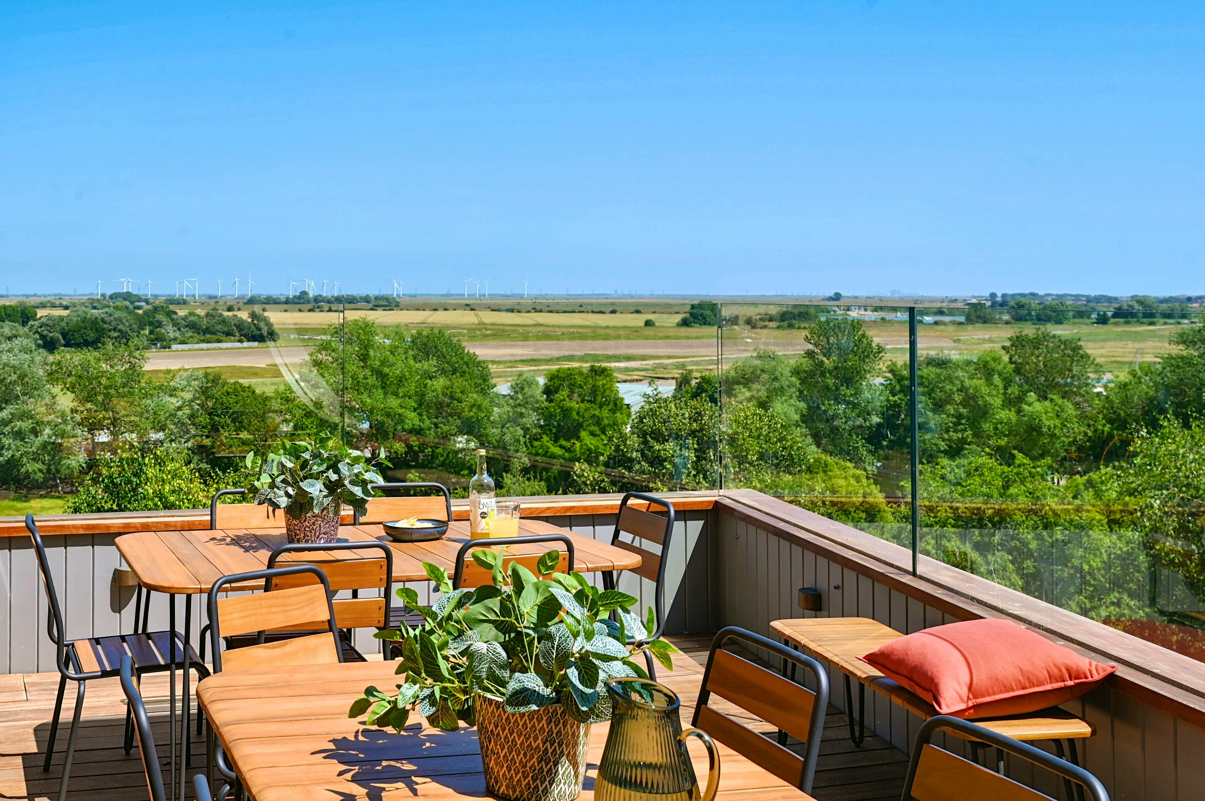 Tiered outdoor terraces with panoramic views stretching across the nature reserve to Camber Sands.