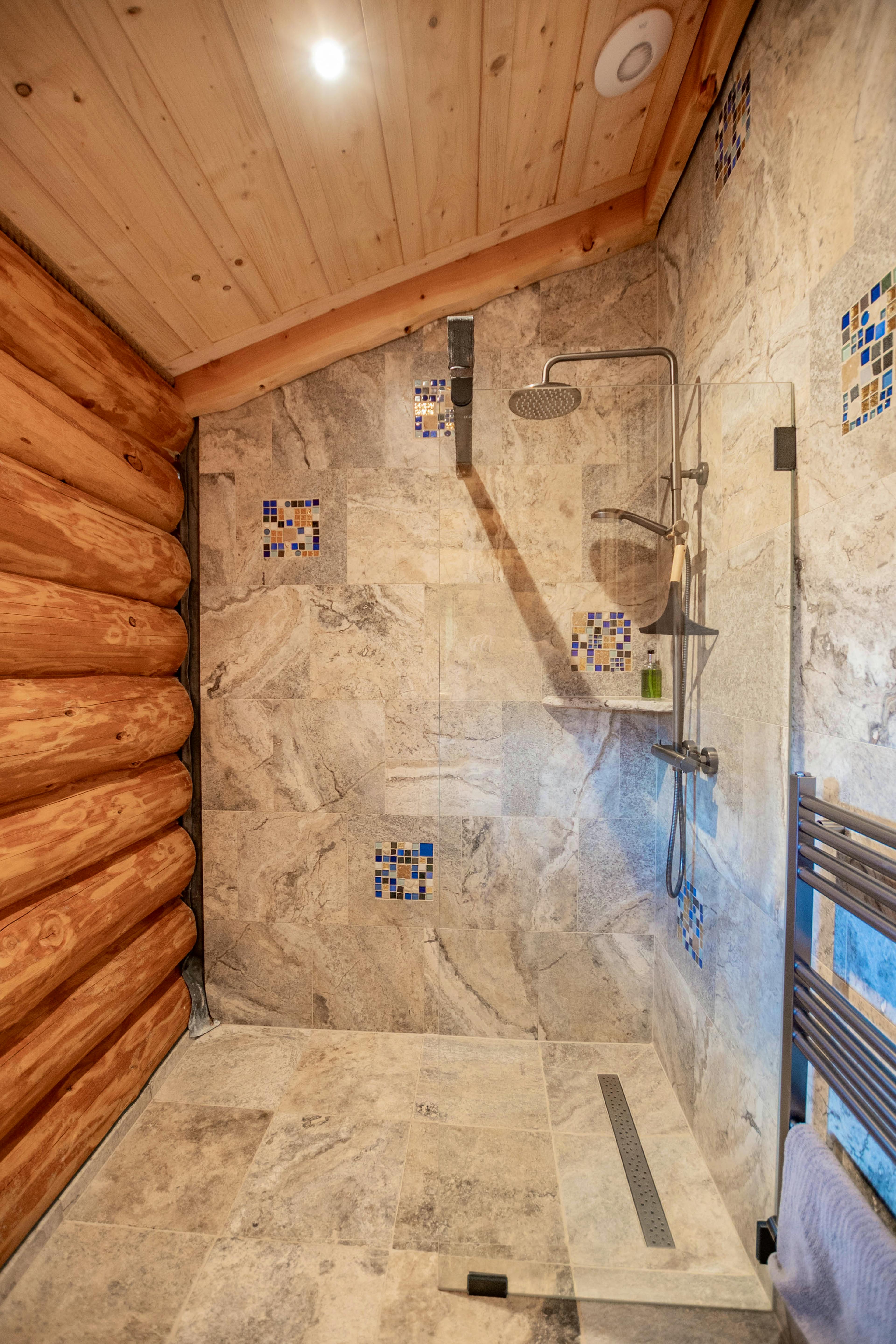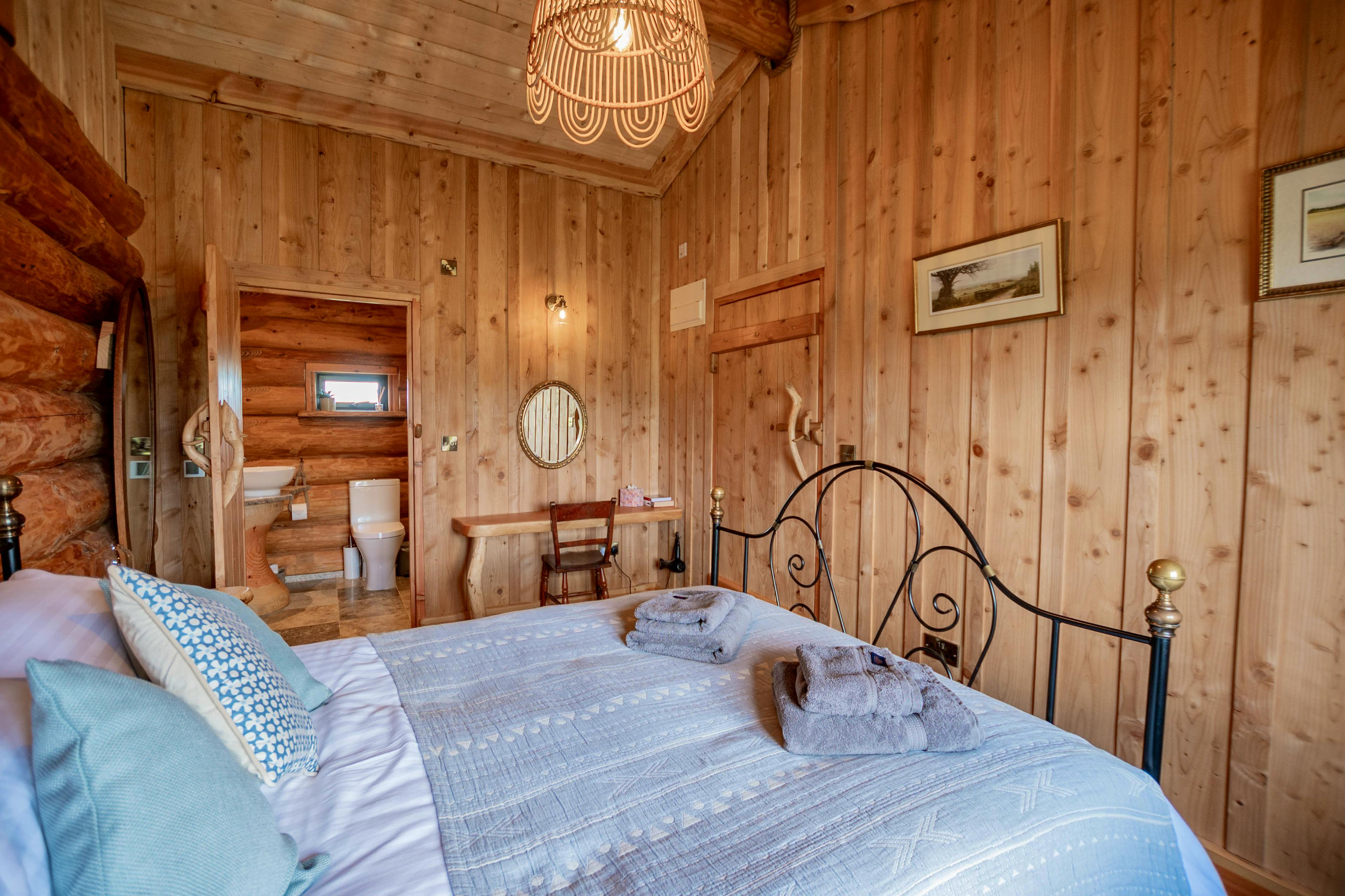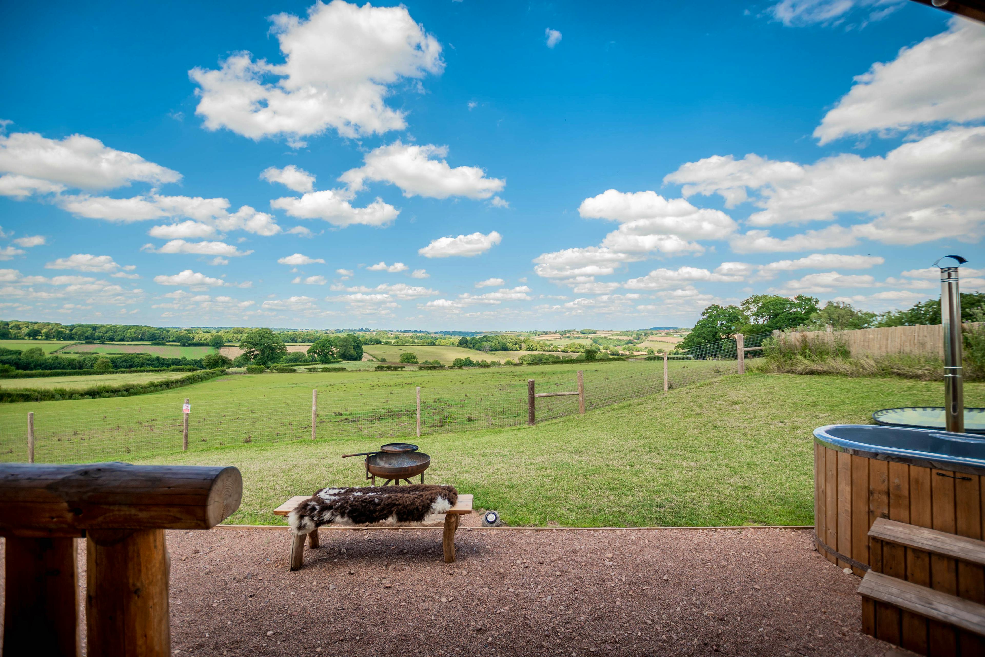 This delightful, handcrafted log cabin provides cosy accommodation for two in a beautiful location. Set on the border between Herefordshire and Worcestershire, there are stunning views over the rolling countryside. Sit out on your private patio area and soak it all up or perhaps enjoy the view from the comfort of your wood fired hot tub. Go for long walks, stopping off at the local pub along the way, or book yourselves in for some riding lessons and explore the area on horseback. The cabin is located at the Tipton Hall Riding School which offers lessons and hacks for everyone from complete beginners to experienced riders. Step inside and you’ll find yourself in an open plan living area that feels bright and spacious during the day thanks to large windows and patio doors that help you make the most of that fantastic view. In the evenings, soft lighting and the warm tones of the timber create a cosy hideaway where you can snuggle up with a glass of wine in front of the smart TV. To one side of the space, you’ll find a well equipped kitchen with everything you’ll need to rustle up a hearty dinner after a long walk in the countryside. To the other side, there’s a big squishy sofa to sink into, the perfect spot for a game of cards after dinner or for a movie night. The bedroom is tucked away at the back of the cabin featuring a luxurious king size bed and plenty of charming handmade features, such as the bedside tables and the wardrobe. There’s also an ensuite with a shower and fluffy towels waiting for you and central heating throughout the cabin to keep you cosy at any time of the year. On sunny days, open up the patio doors onto your private terrace and extend your living space outdoors. There’s a covered area to provide a bit of shade and some seating, making this a great spot to sip a cup of coffee in the morning or a cocktail before dinner as you take in the scenery. Fire up the hot tub and rest any aching legs after a long walk or ride through the countryside. There’s also a fire pit that doubles as a BBQ so you can cook outdoors and stay out late into the evening watching the sunset and doing a bit of stargazing. There’s plenty of exploring to be done in the area with long walks along the River Frome, across the Bromyard Downs or even over the Malvern Hills. Book yourself in for a riding lesson or a hack through the countryside to see it all from horseback. The bustling market town of Bromyard is less than five miles away where you’ll find independent shops, galleries and a few good pubs. For a bit of culture visit Brockhampton, a medieval manor house, head to the cathedral city of Worcester or visit Hereford where you’ll find some great dining options.