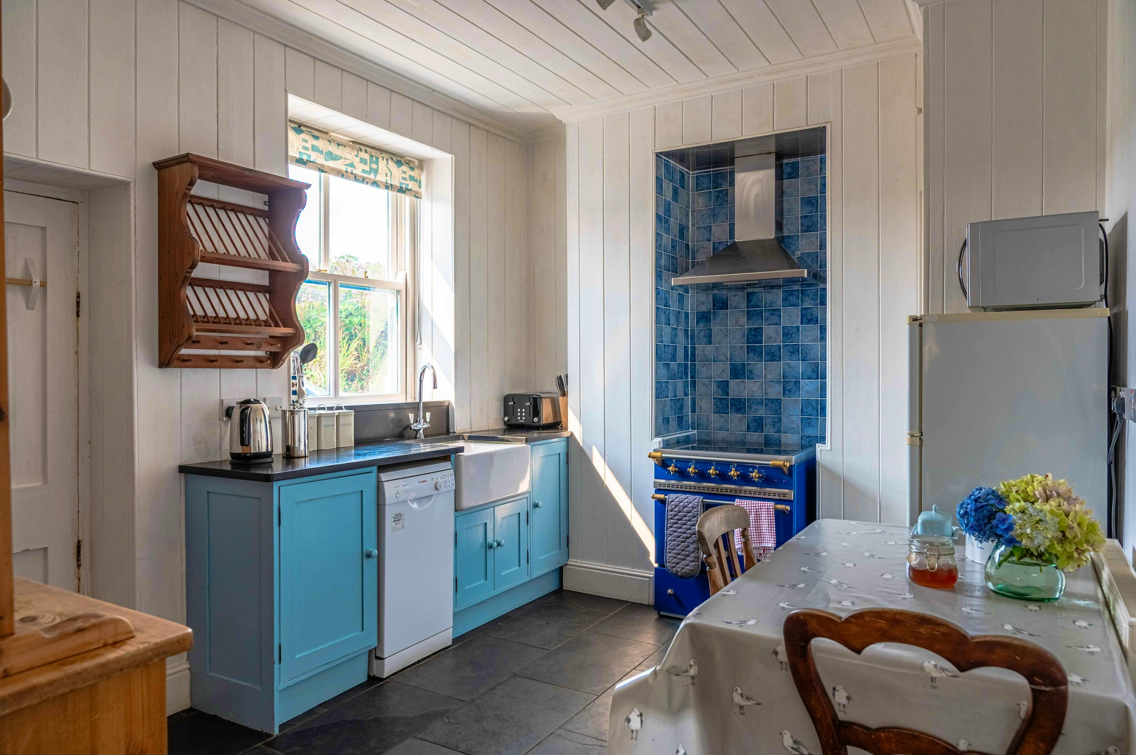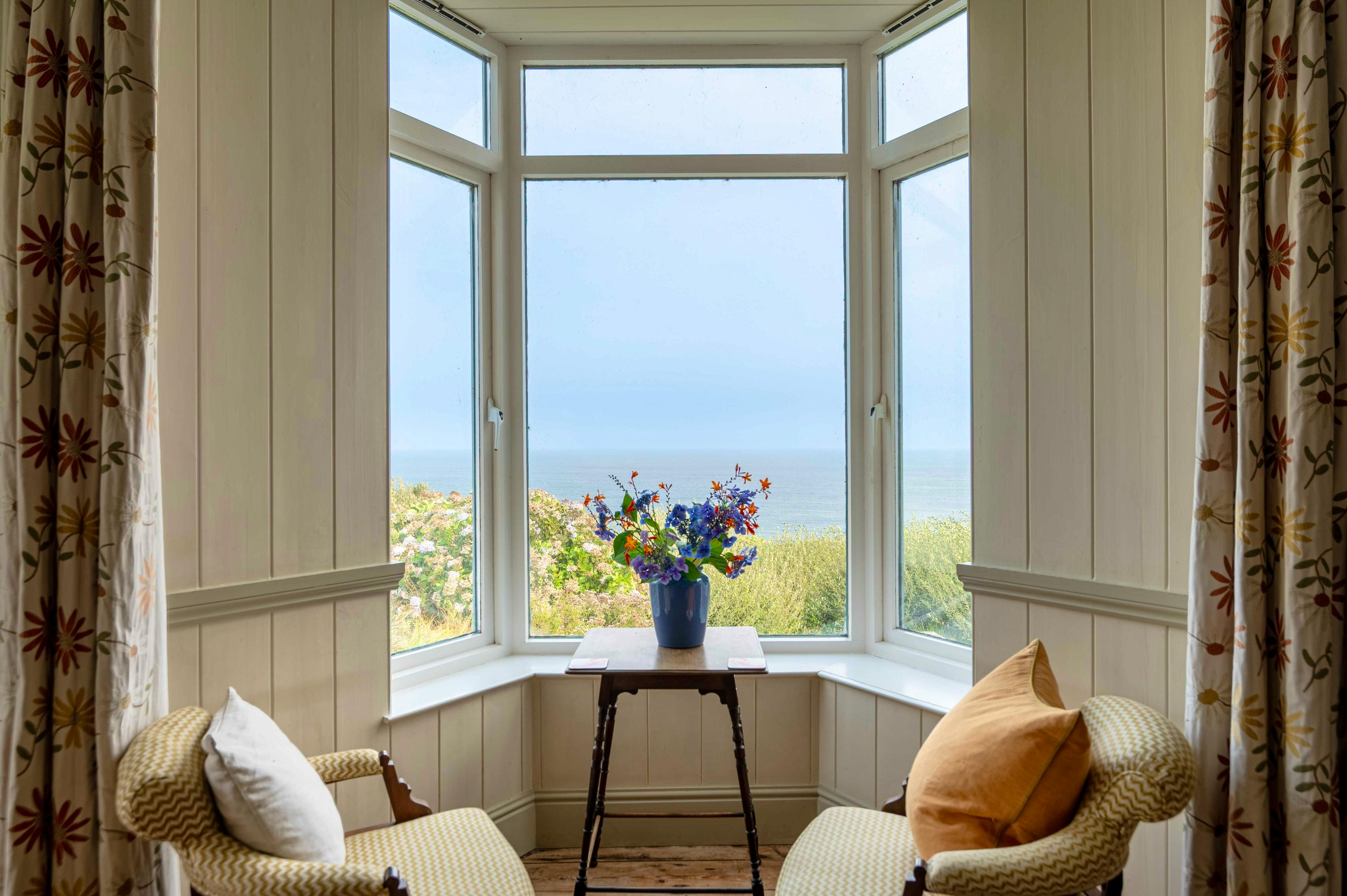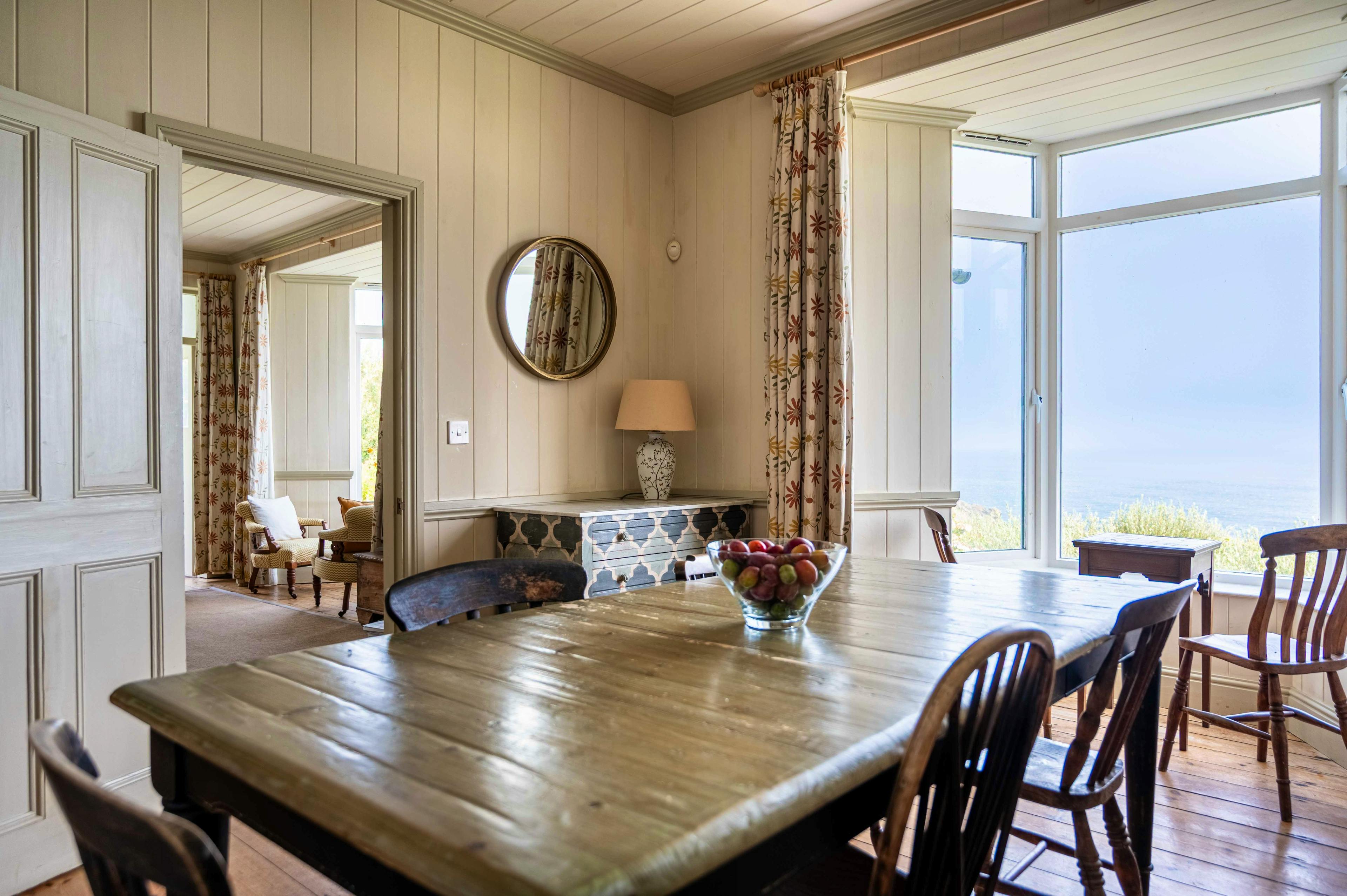 Stylish seaside holiday home situated atop a cliff, with pretty kitchen, rustic interiors and a delightful dining room.