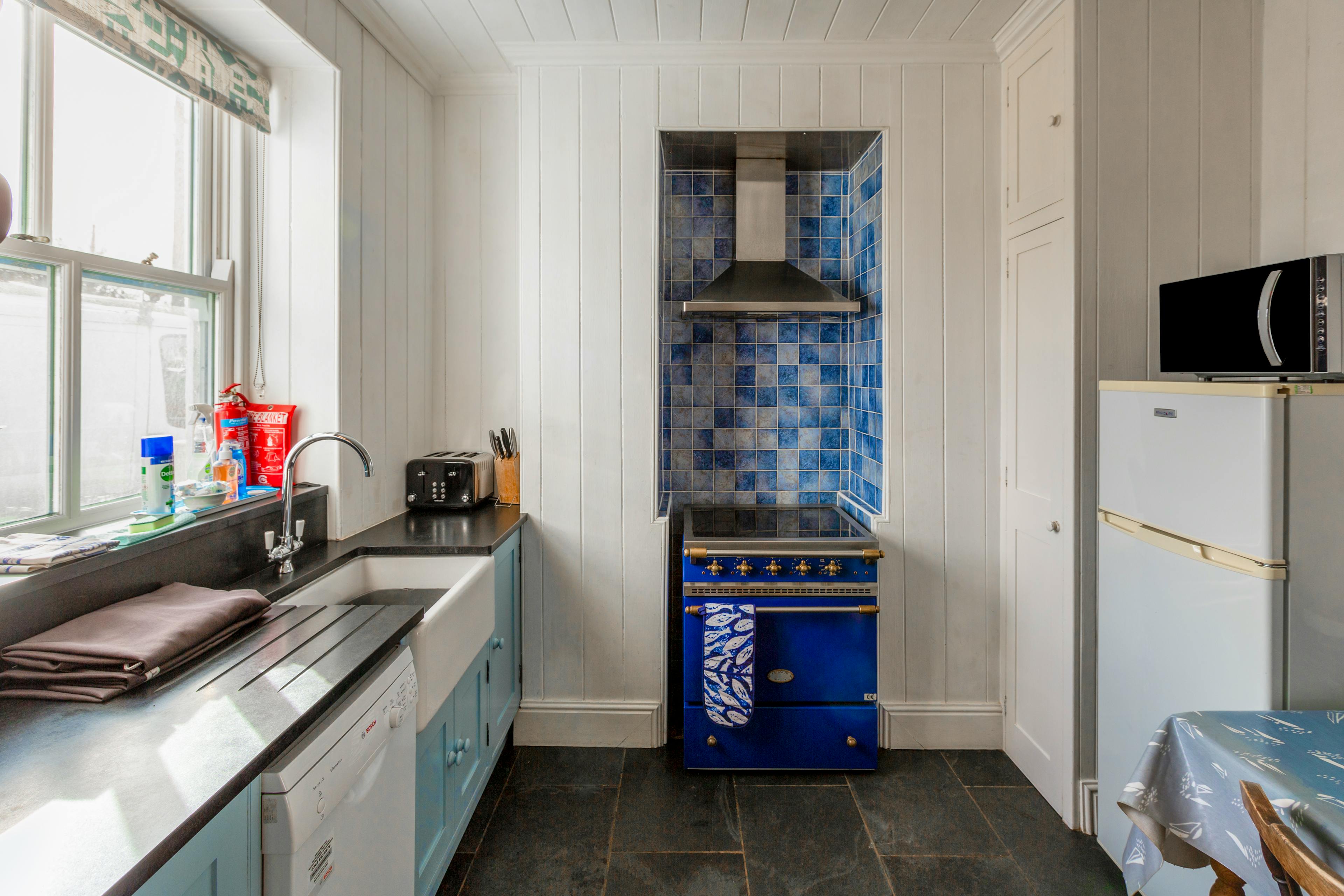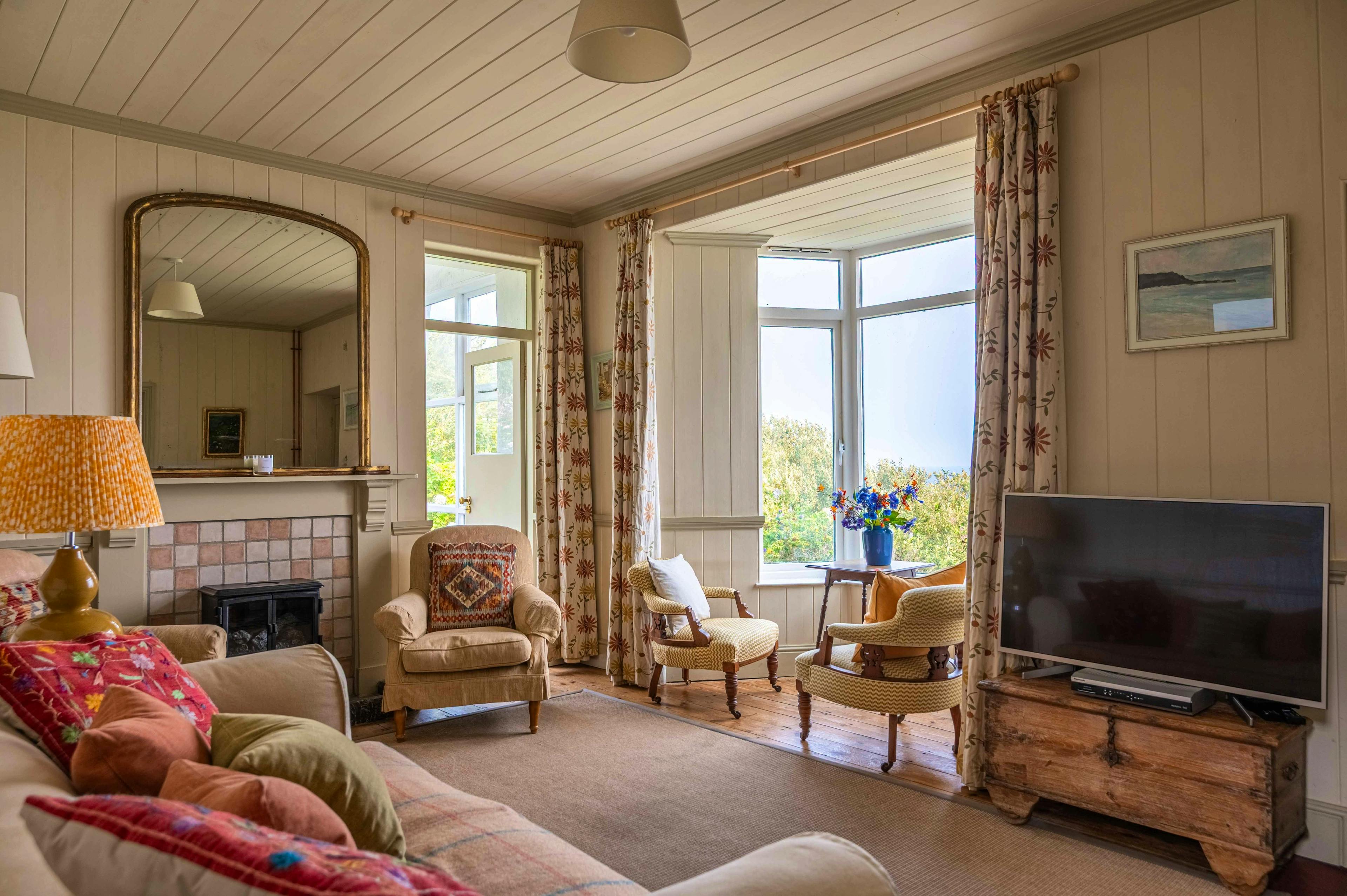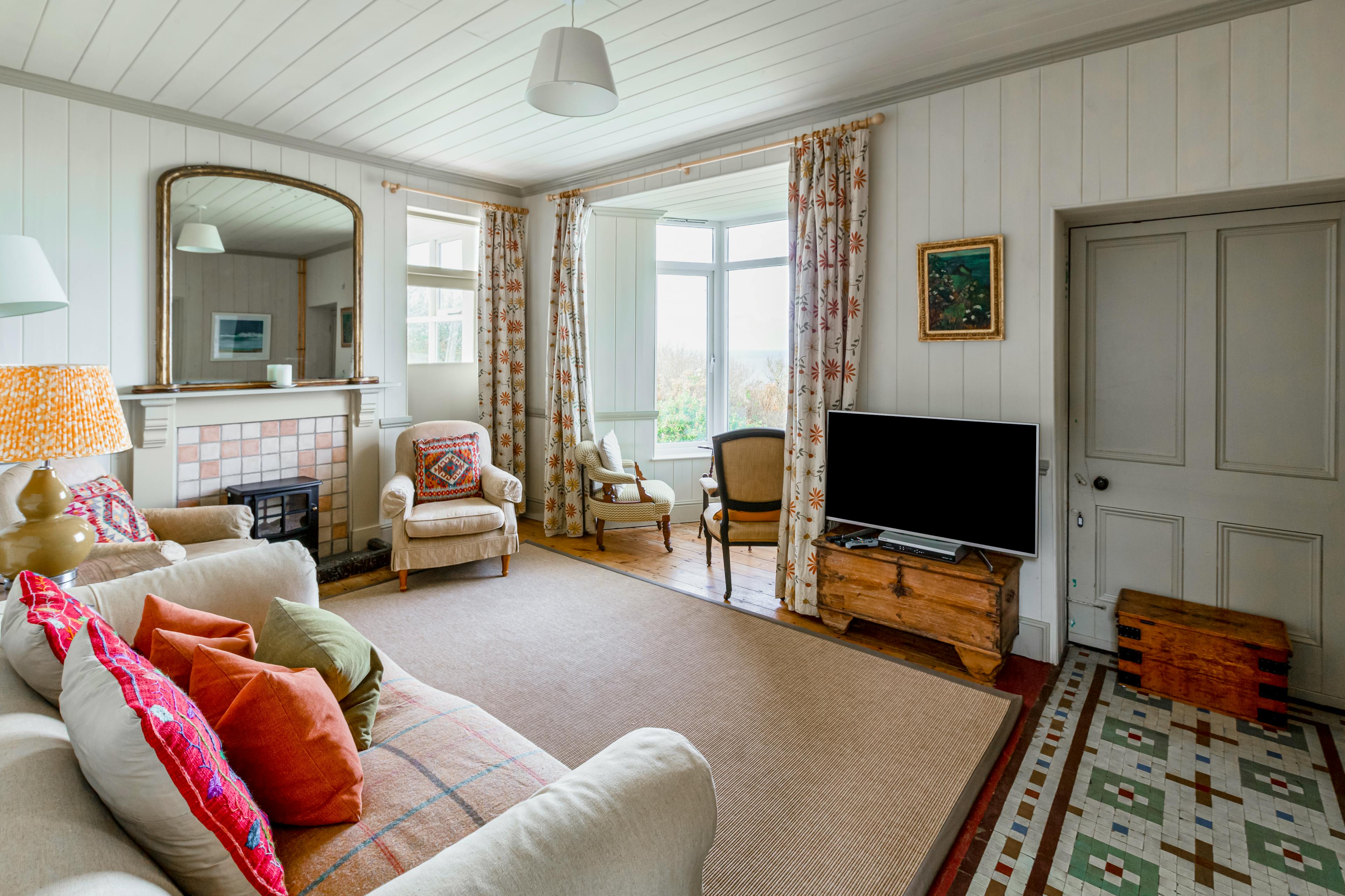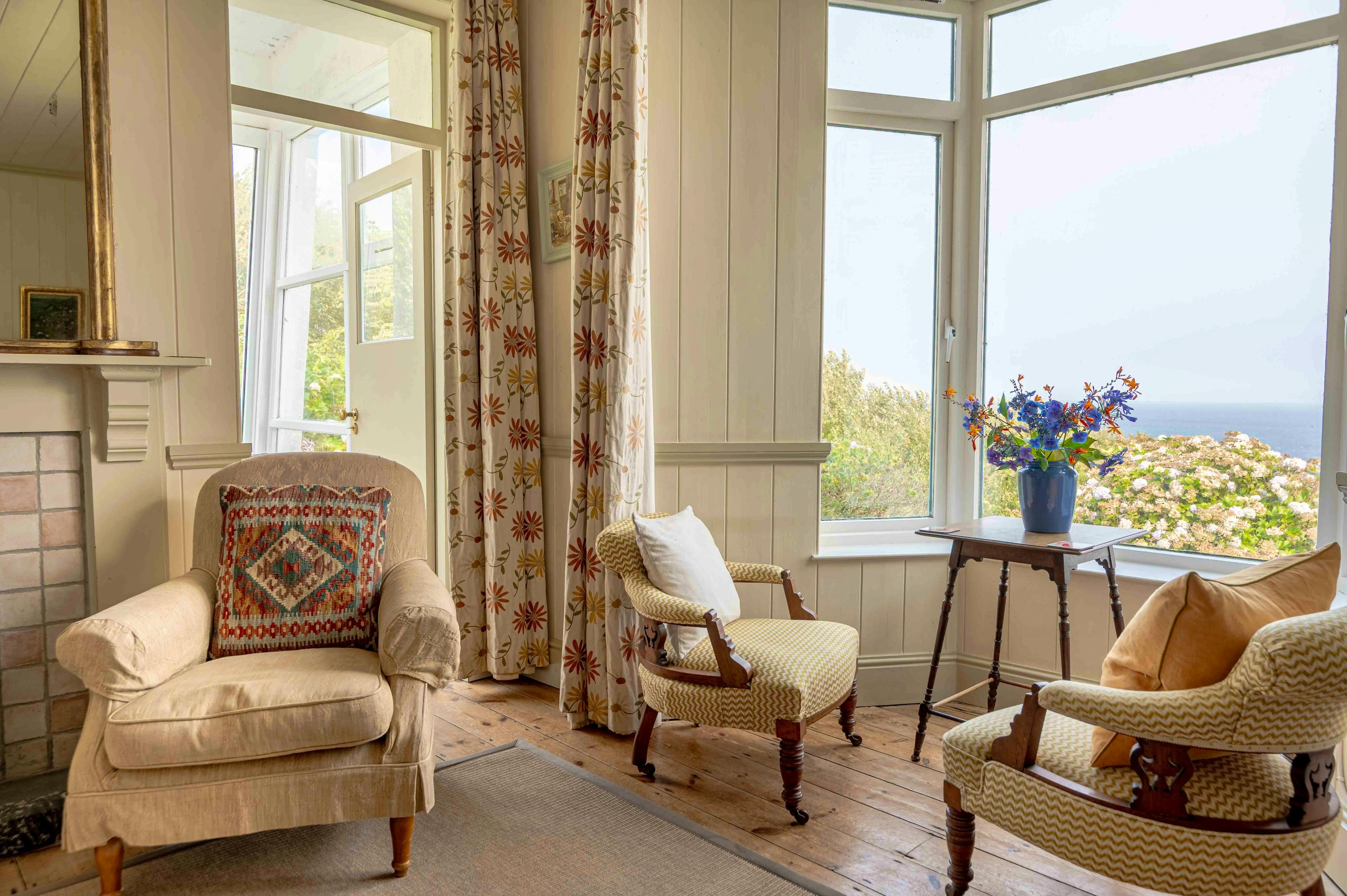Stylish seaside holiday home situated atop a cliff, with pretty kitchen, rustic interiors and a delightful dining room.