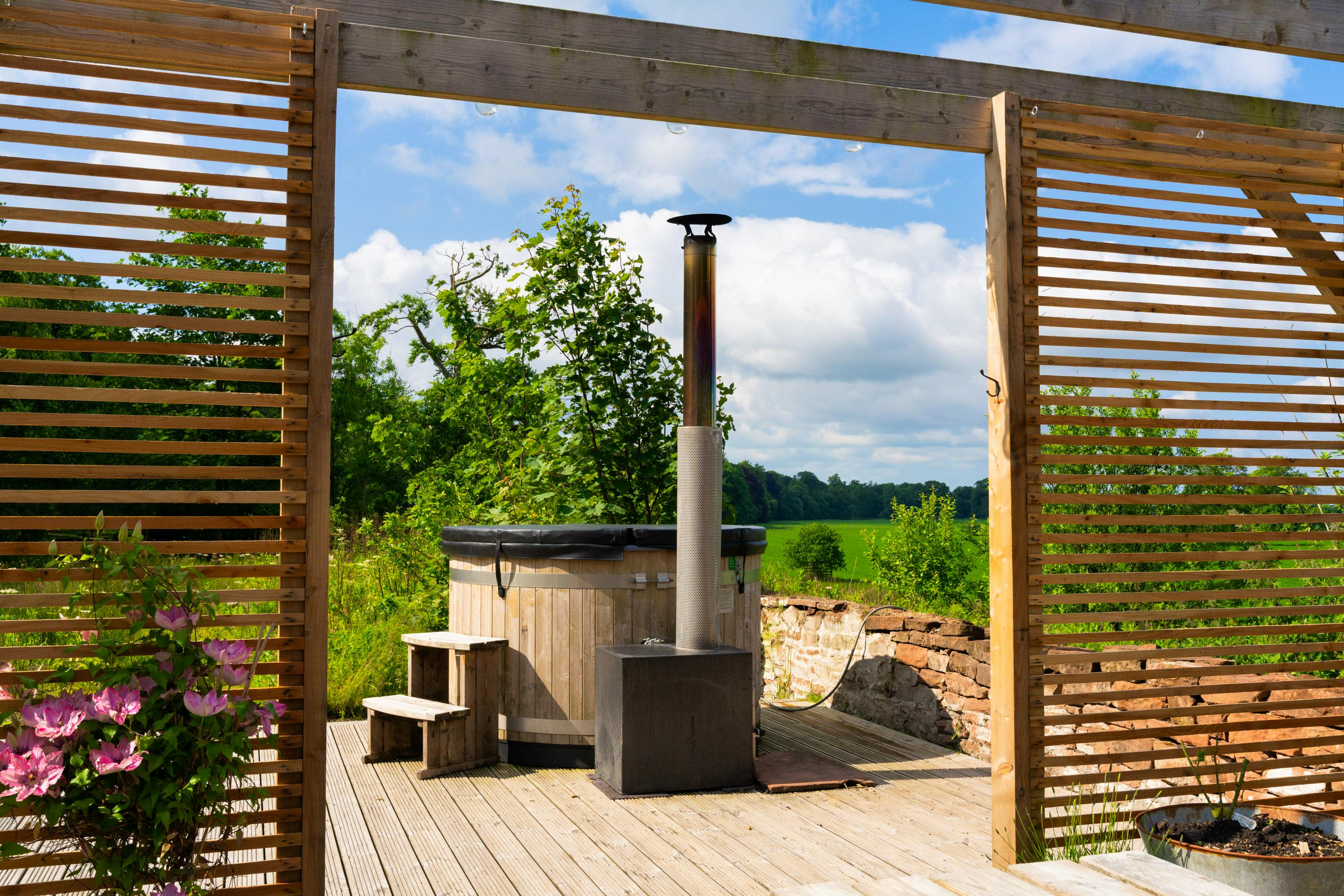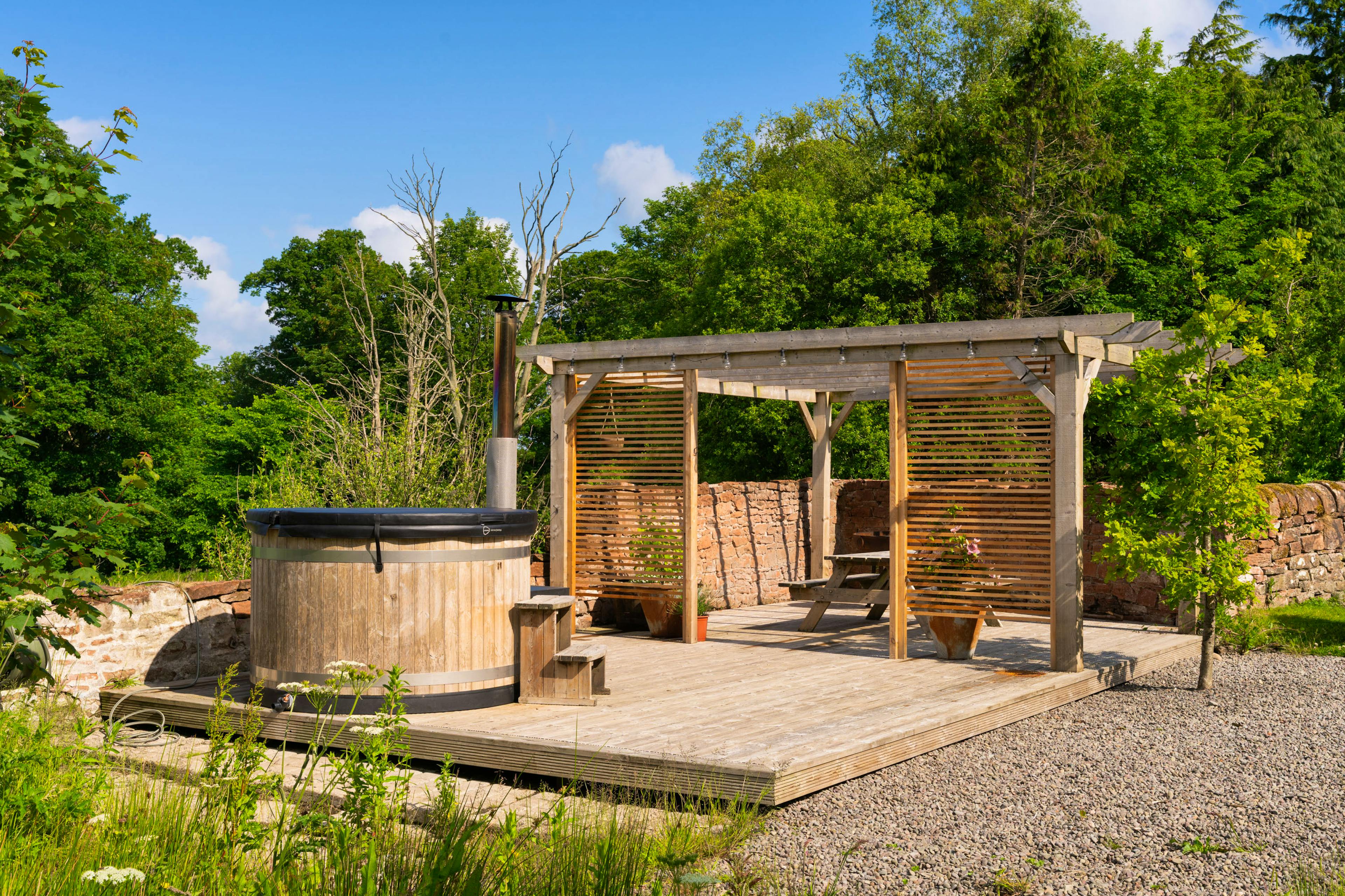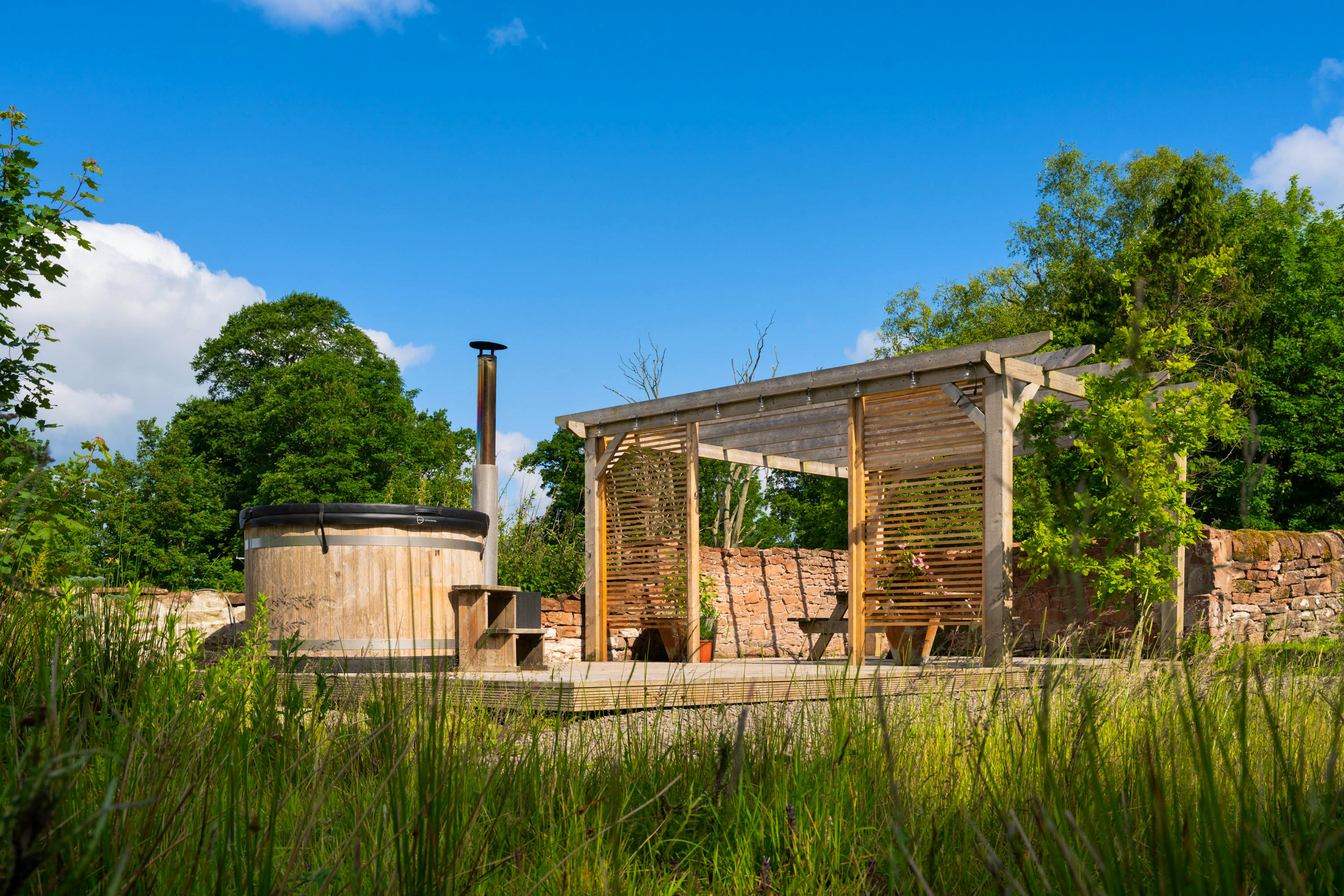 Charming three bedroom Bolthole in Cumbria complete with wood-fired hot tub, overlooking the River Esk and acres of lush private parkland.