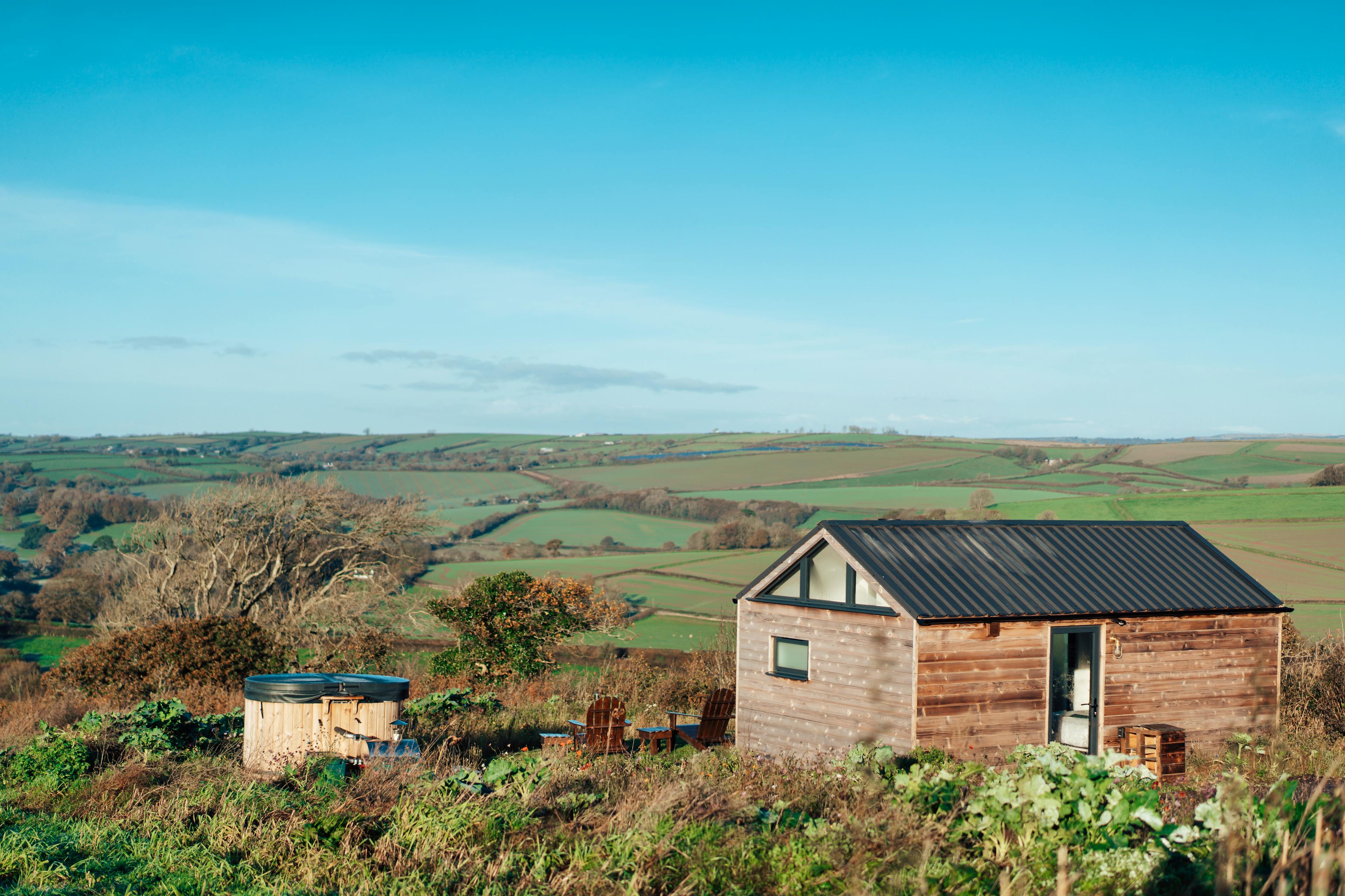 Charming cabin with stunning views and a hot tub, perfect for a romantic break in the Devon countryside.