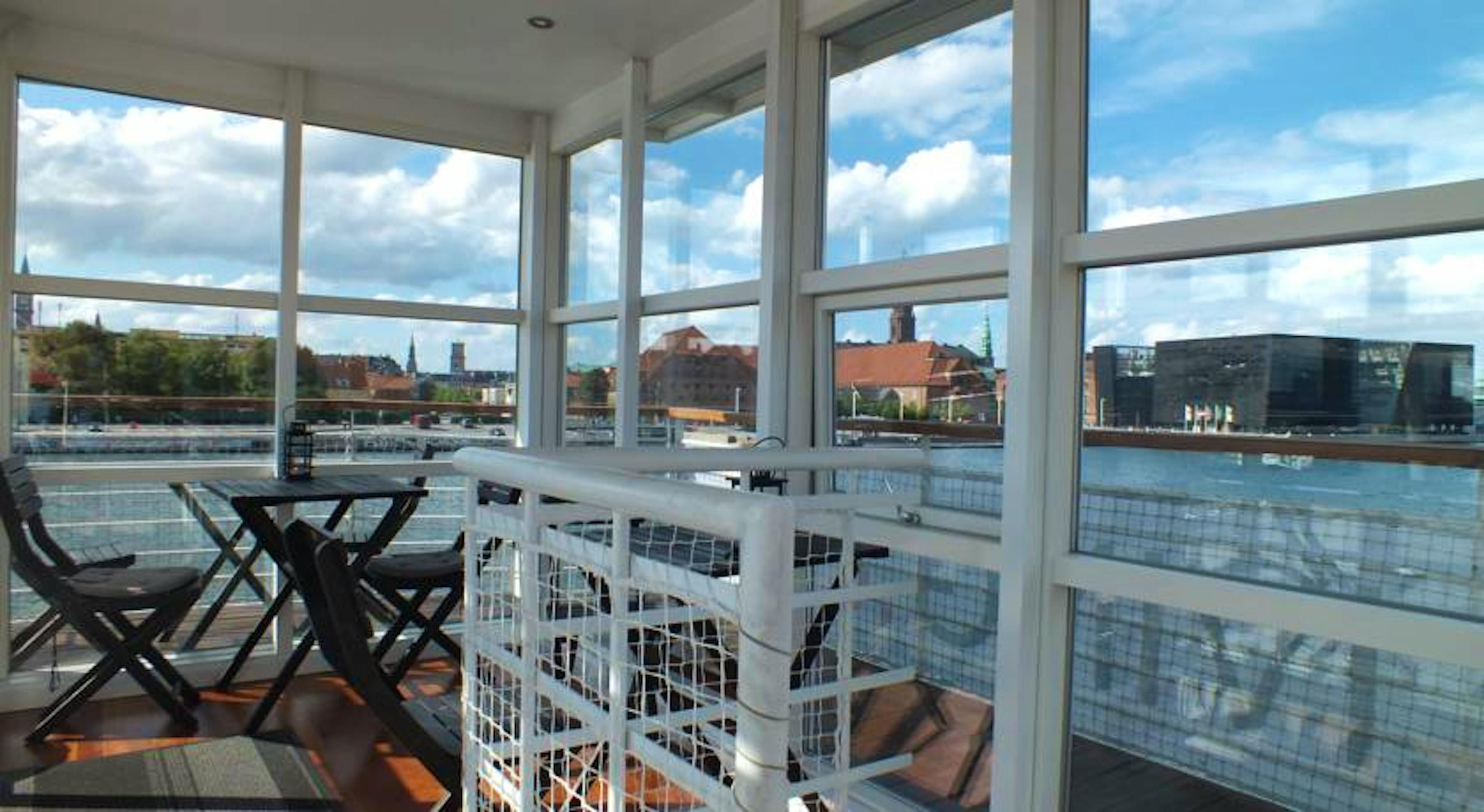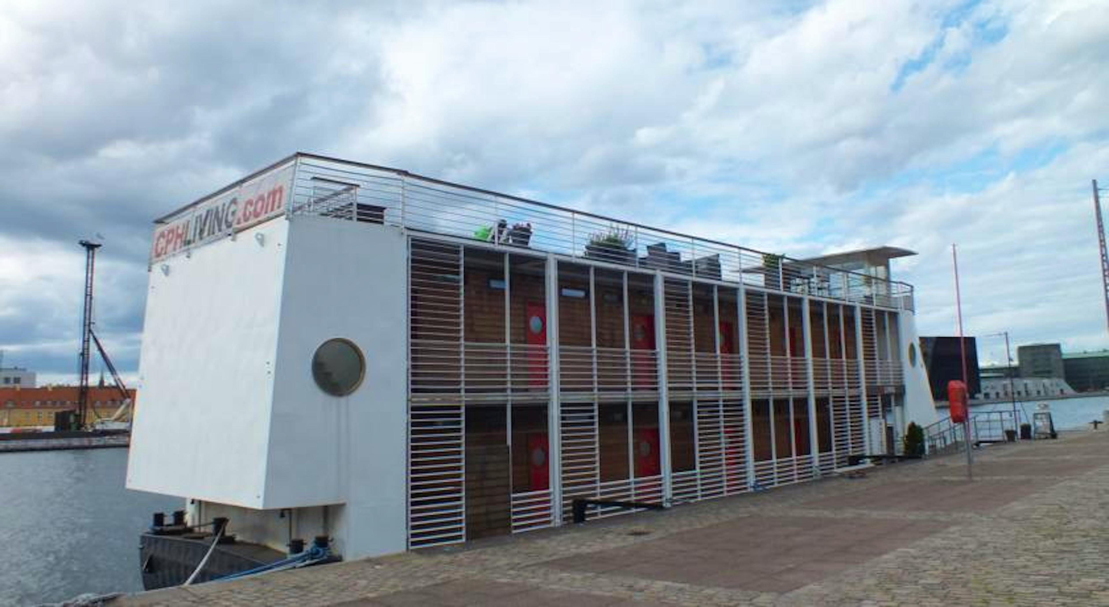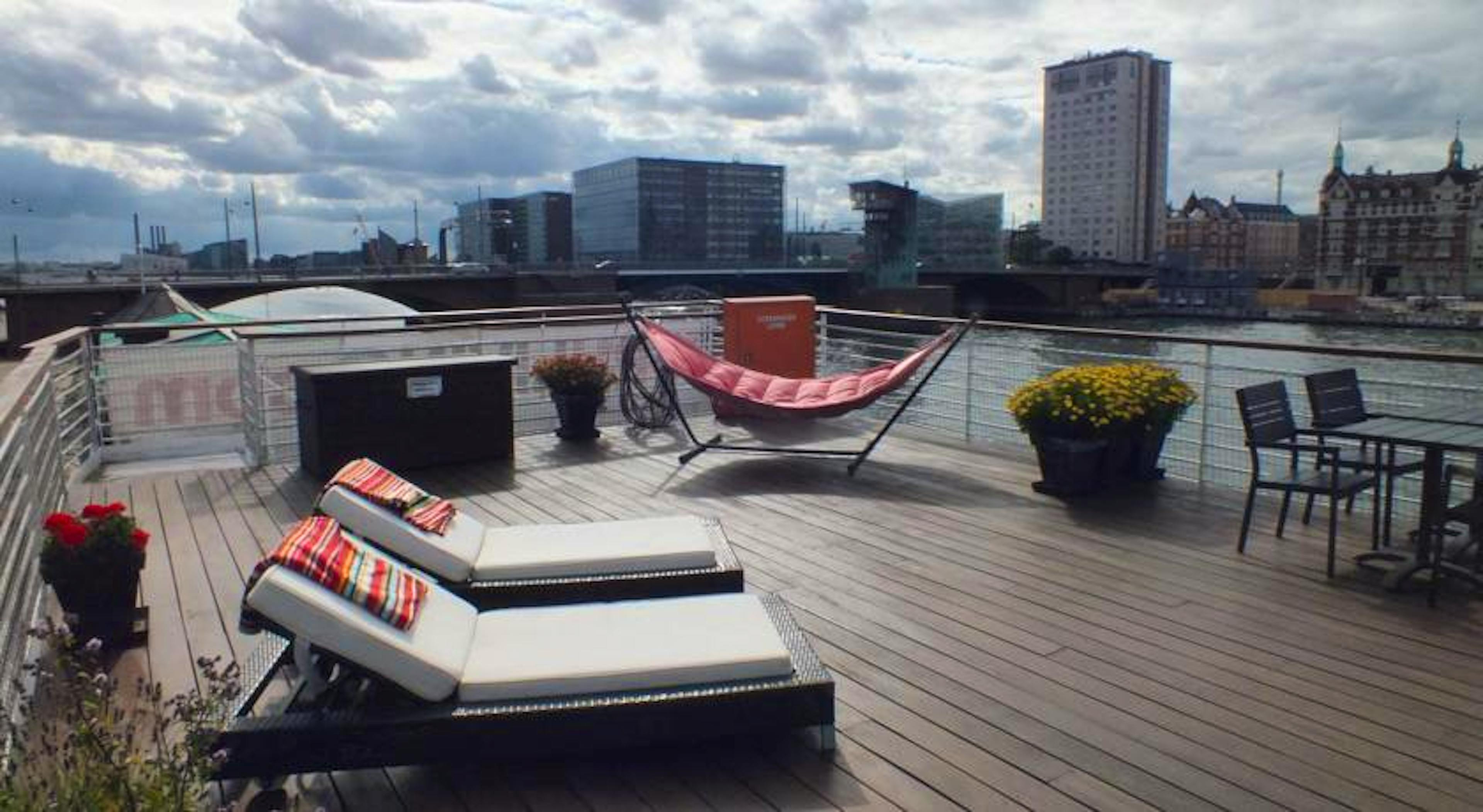 CPHLIVING floating hotel is located in the centre of Copenhagen, within walking distance of everything the city has to offer. All 12 double rooms have panoramic views of the harbour and Copenhagen city center. Listen to the sounds of passing ships, water and the seagulls, as you contemplate your next adventure in the city. Following the Scandinavian tradition, rooms have a clear and simple look, with entirely glass wall facing the water, to let in all the light and allow you to fully enjoy the view. Rest assured every room has a panoramic view of the harbour and city centre beyond. The furniture is unique in its design, and you’ll find plenty of precious wood used in the floors, windows and furniture of all rooms. Details in red are used consistently on board the ship. The bathroom is designed in sea colours with glass elements in green and blue, and with the use of chrome fittings throughout. In order to draw the view of the harbour into the bathroom, rooms are equipped with a large window made of blue glass between the shower cabin and the room – so that you can see the water and the city while you shower. All rooms have a TV, Wi-Fi access, heated floors, and a hair dryer. Sit outside with a beer on warm evening on the huge rooftop terrace that offers you great views of the city skyline and the harbour itself. The terrace is equipped with tables, chairs, plants and even sun beds should you wish to soak up some spring or summer rays. A traditional, Danish breakfast is provided every morning and you can also enjoy free coffee and other hot drinks at any time of day. From the vending machine you can purchase snacks and soft drinks, and you’re welcome to use the hotel’s fridge to store your own food and drinks if you like. Bikes are available for hire. The area of Christianshavn is a great choice for travellers interested in admiring traditional, Danish design and enjoying some delicious, local cuisine at the many nearby restaurants. The Klaksvigsgade bus stop is only 350 yards from the hotel, while Christianshavn Metro Station is within 10 minutes’ walk. Staff will be happy to recommend local attractions, such as the Tivoli Gardens, which is only a 15 minute walk away.