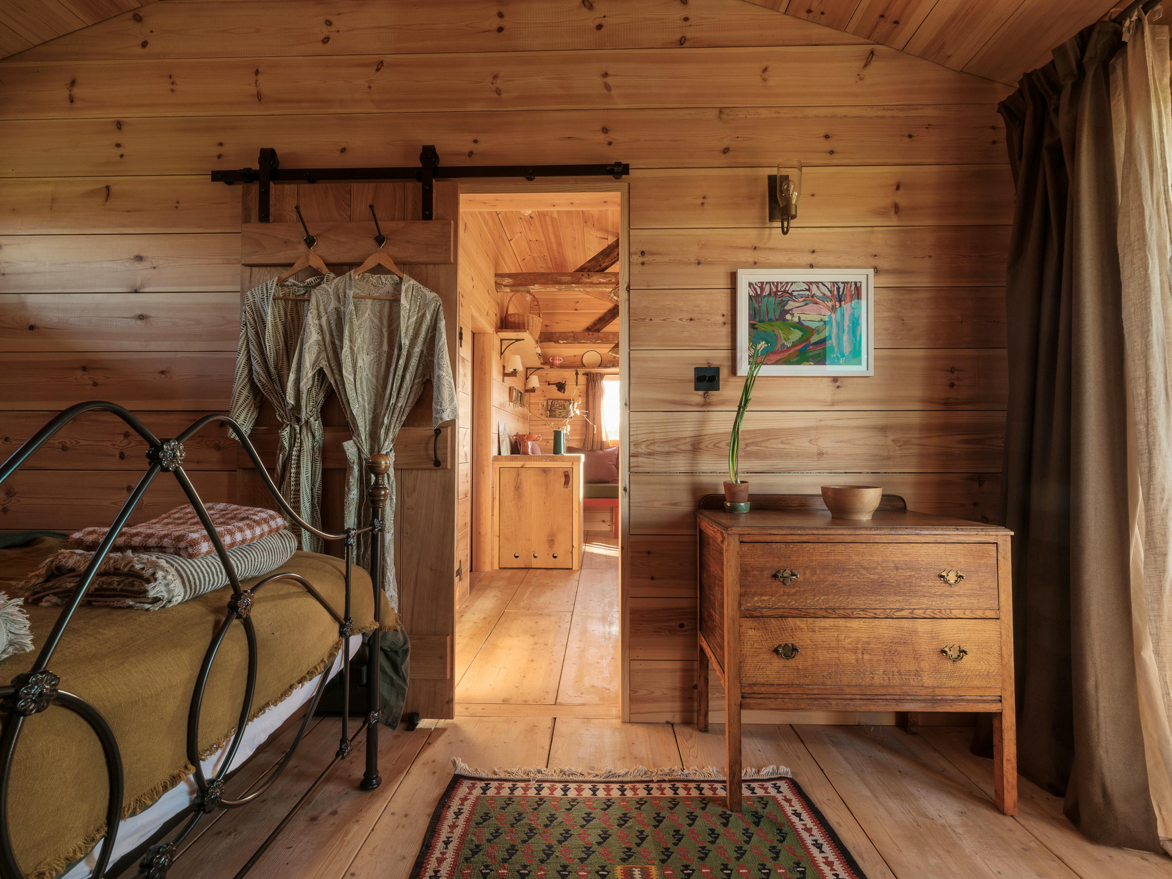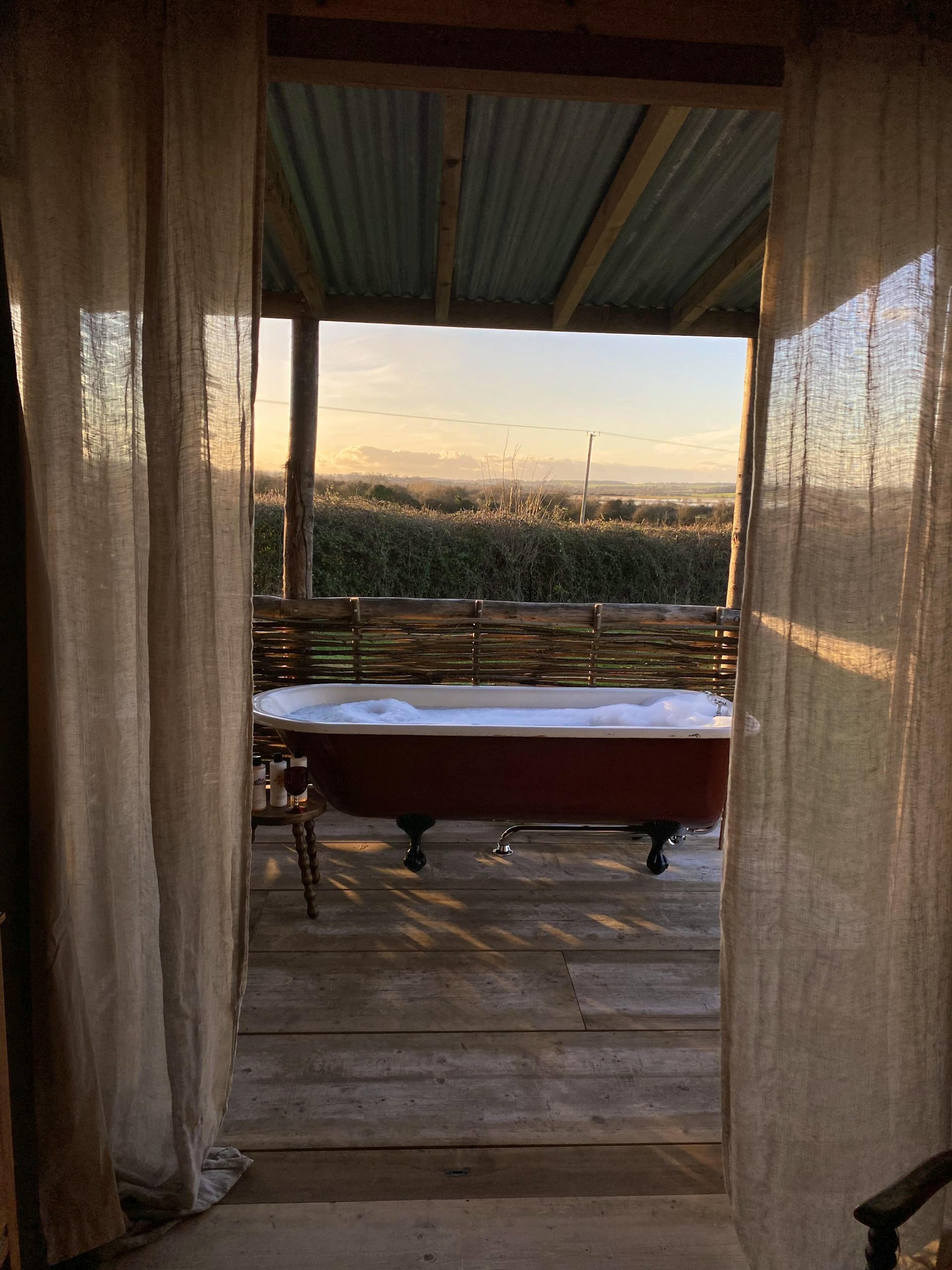 Beautiful, hand-crafted cabin in rural Somerset with a fabulous outdoor bath, lovely terrace and amazing views of the surrounding countryside.