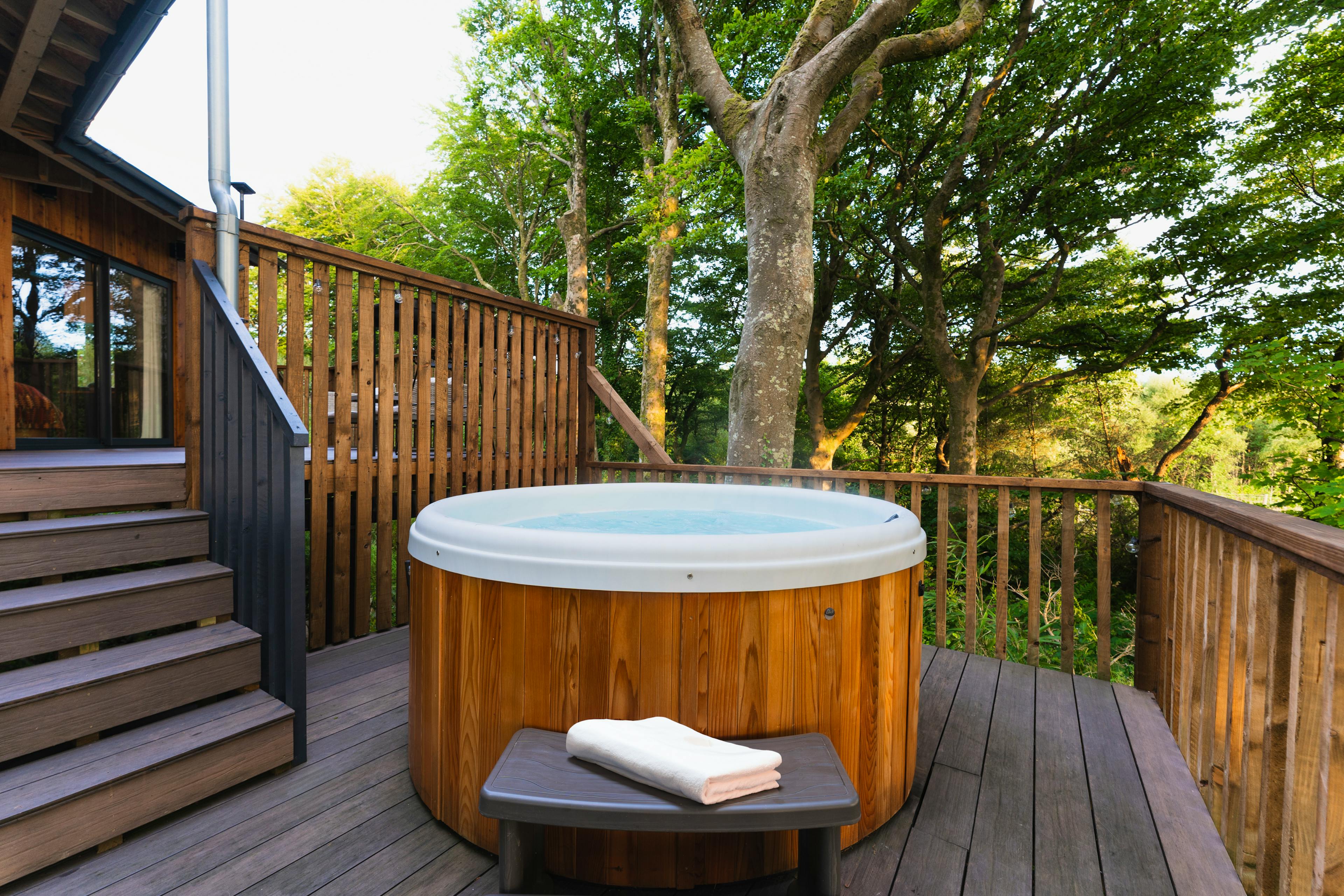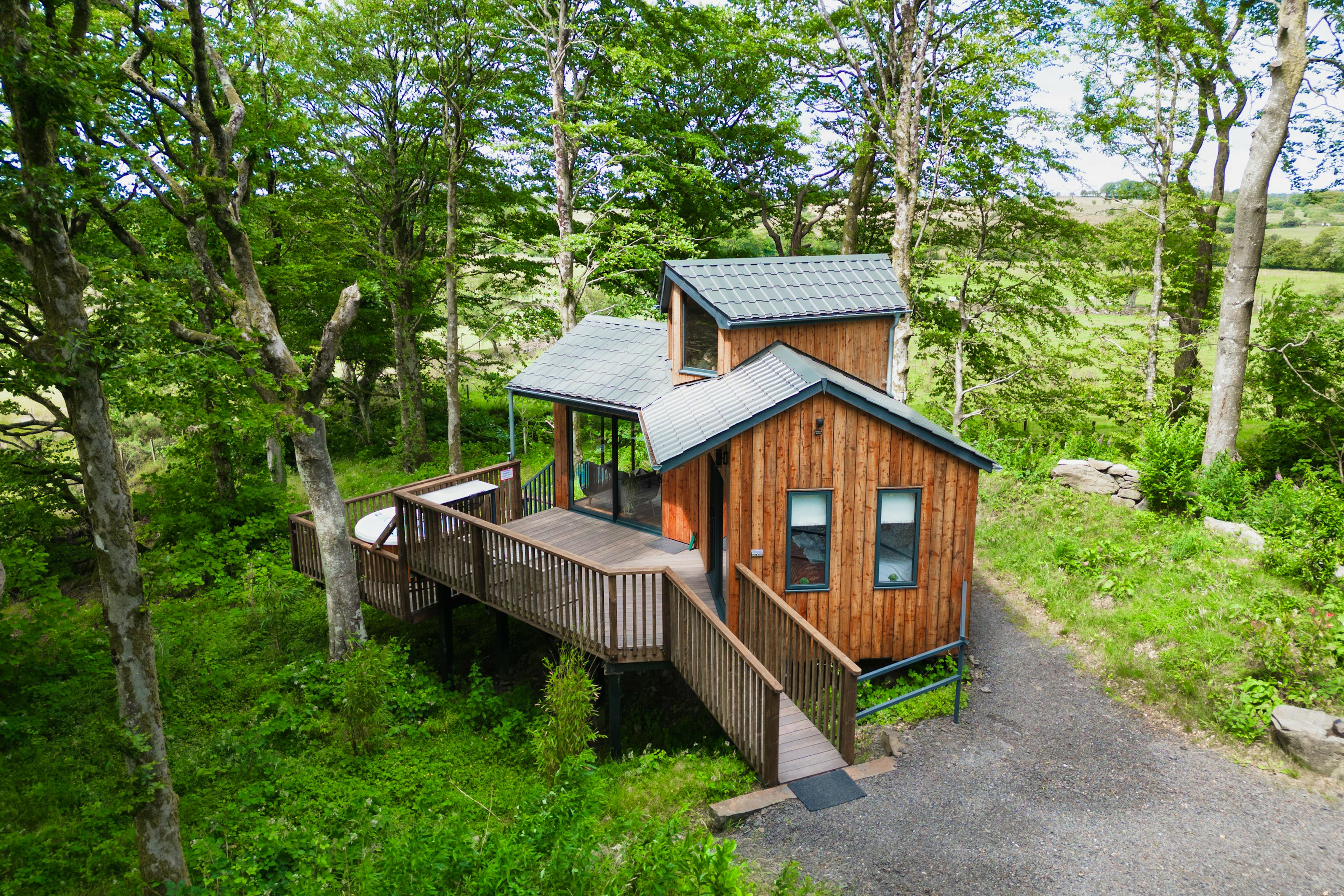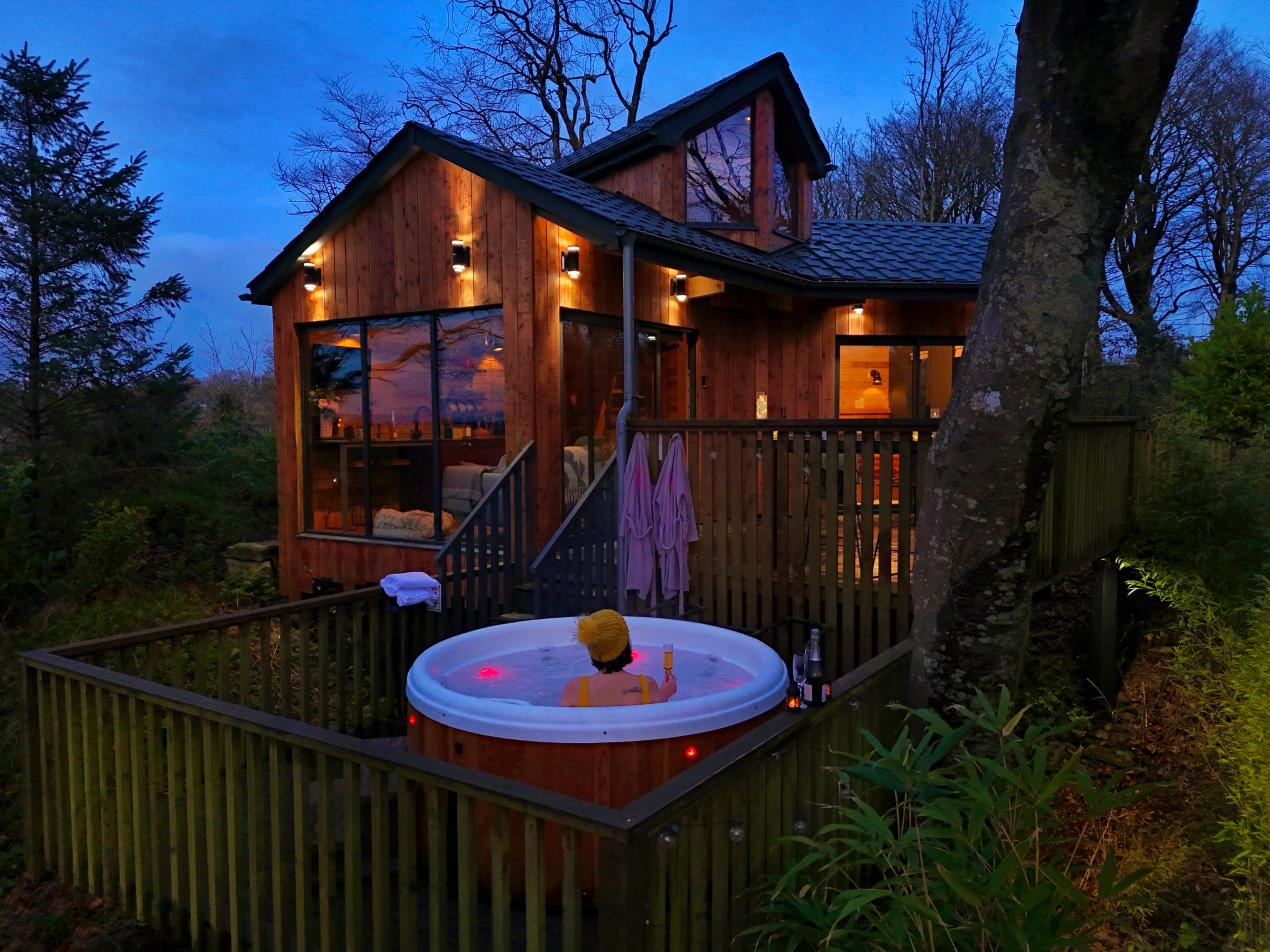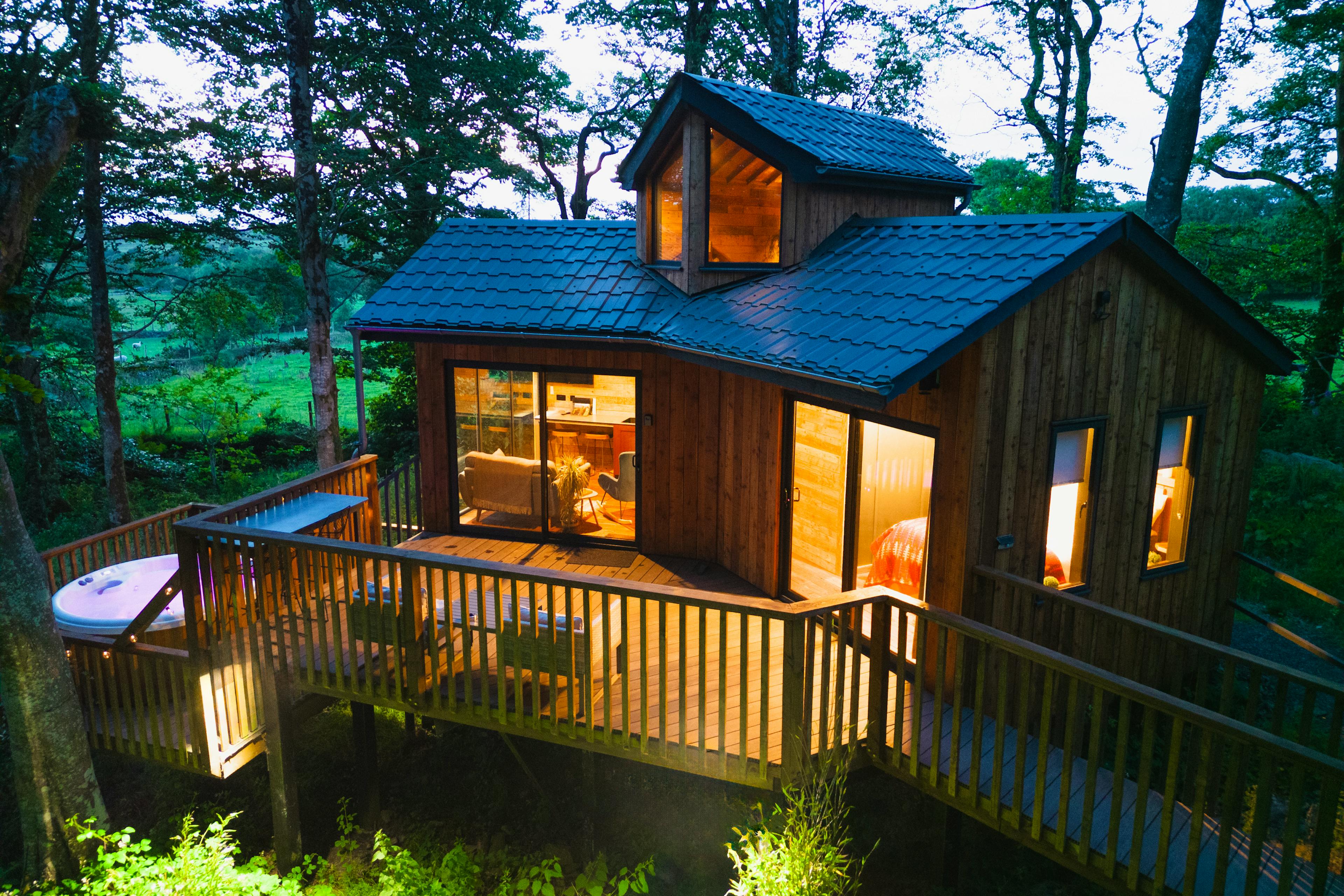 Luxurious treehouse with stunning views and a hot tub near the Ceredigion coast in Wales, a secluded and romantic hideaway for couples.