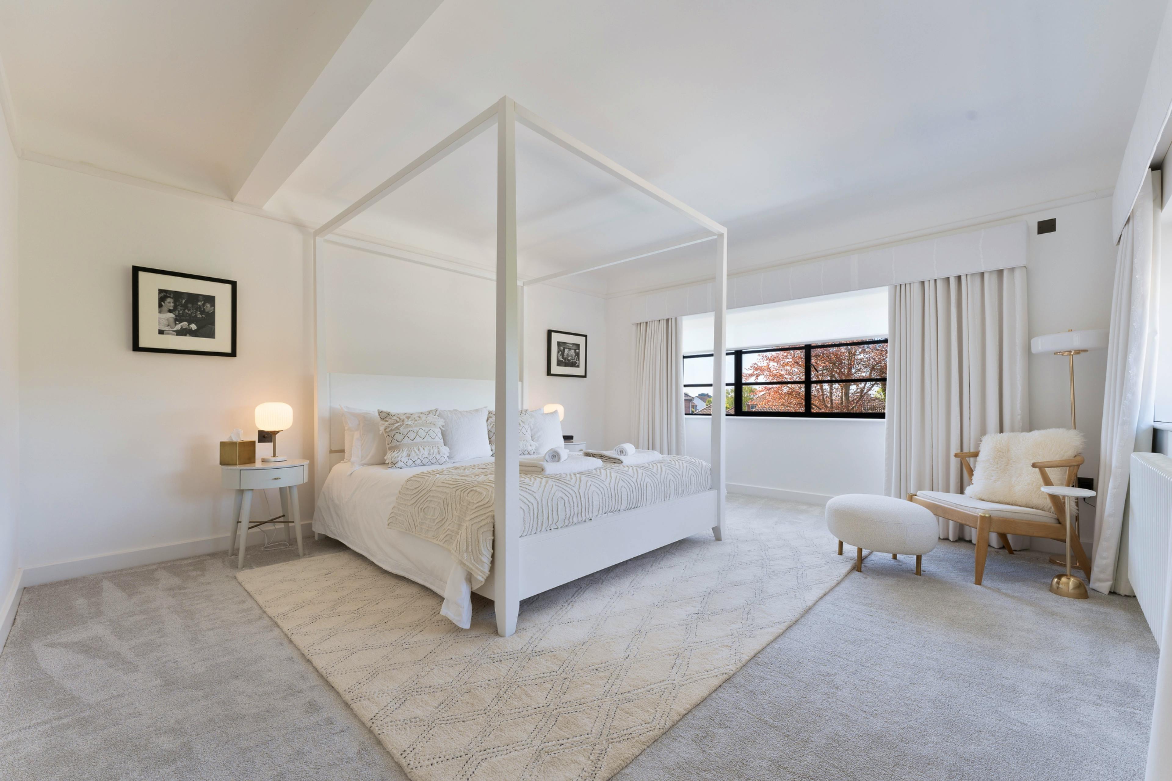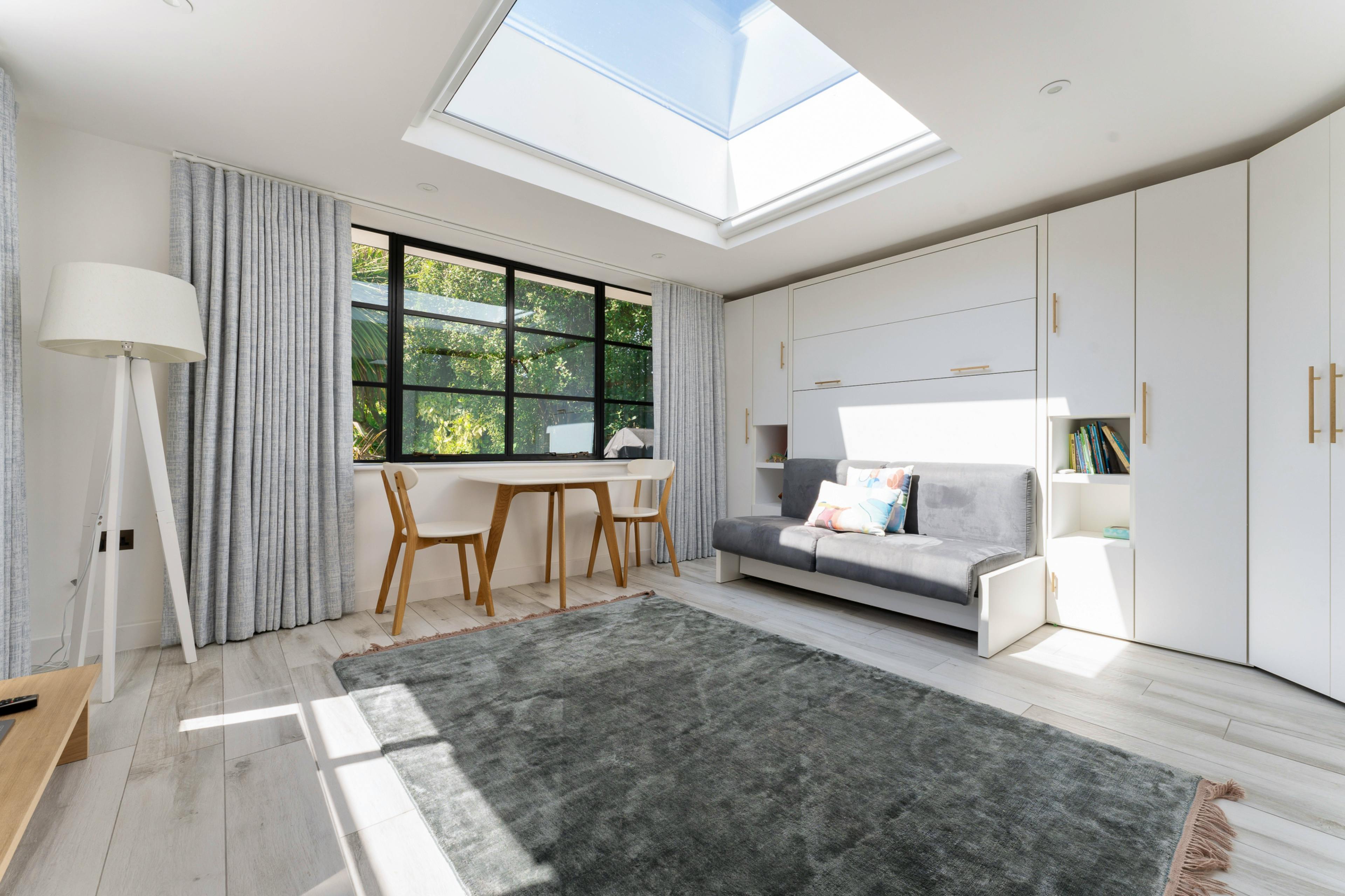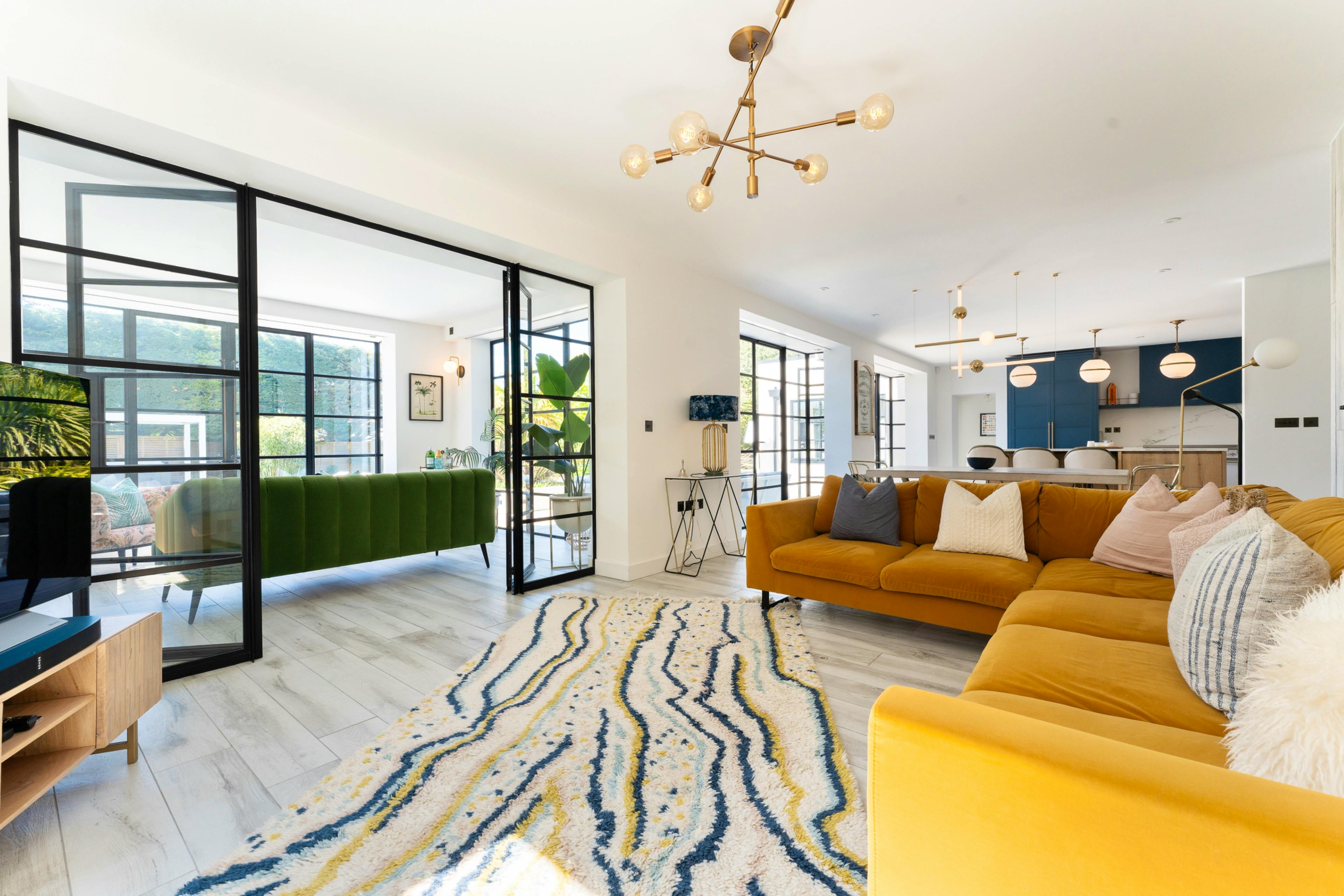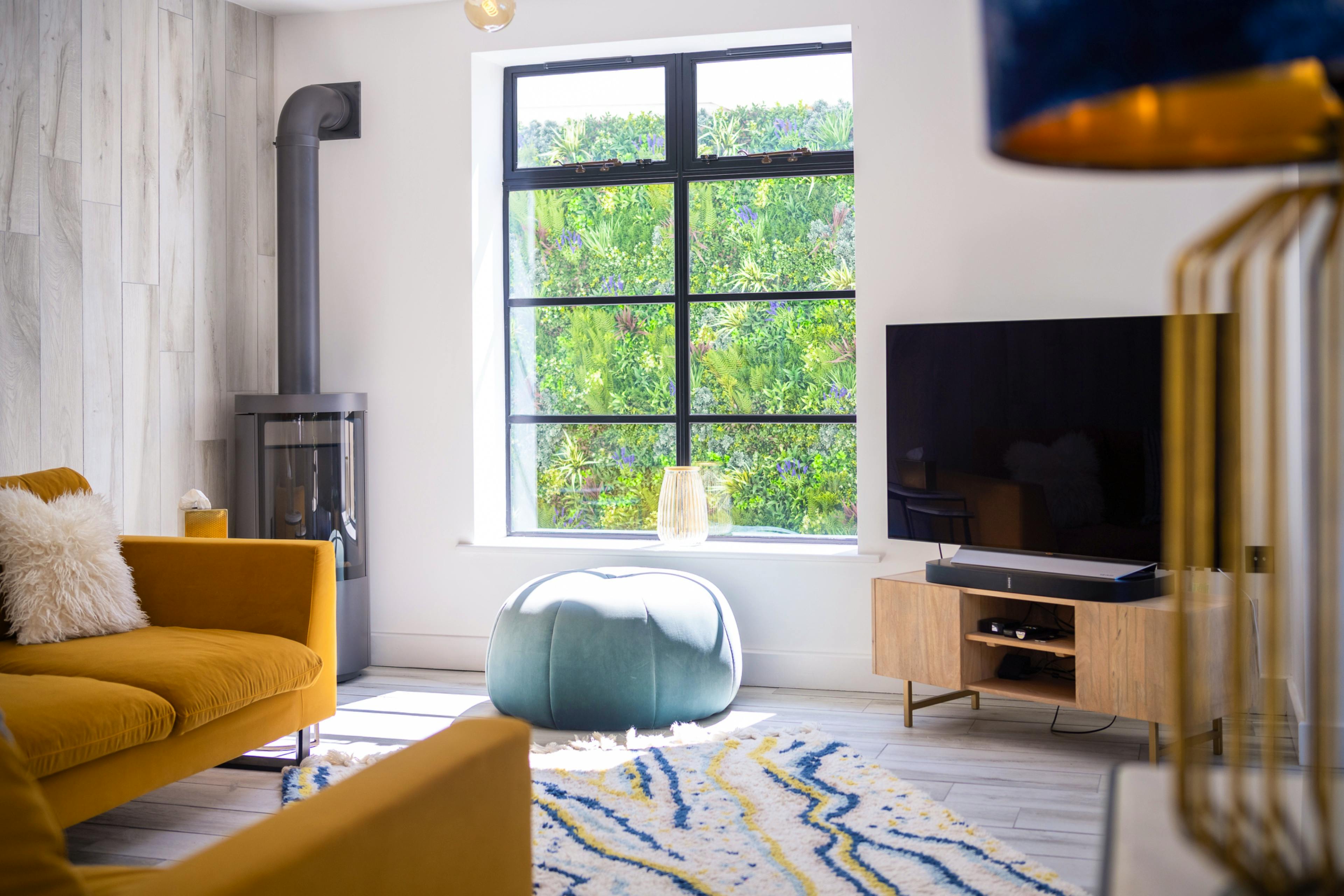 Clean white walls combine with bold colours and touches of gold to create a stylish and unique home from home.