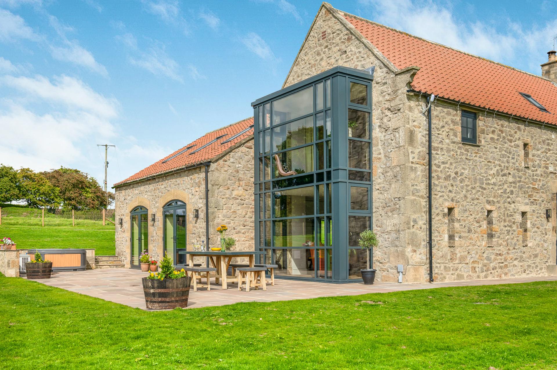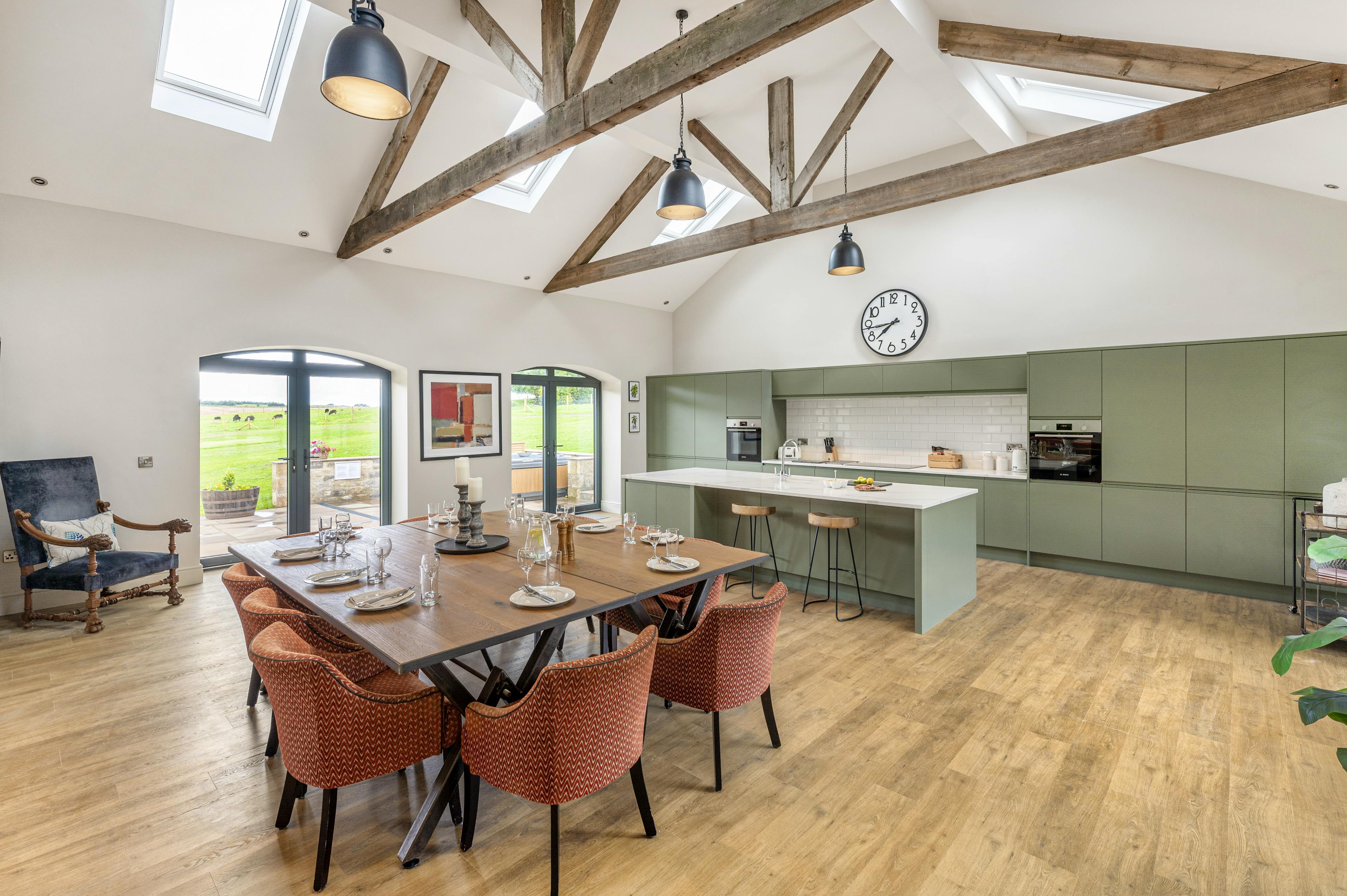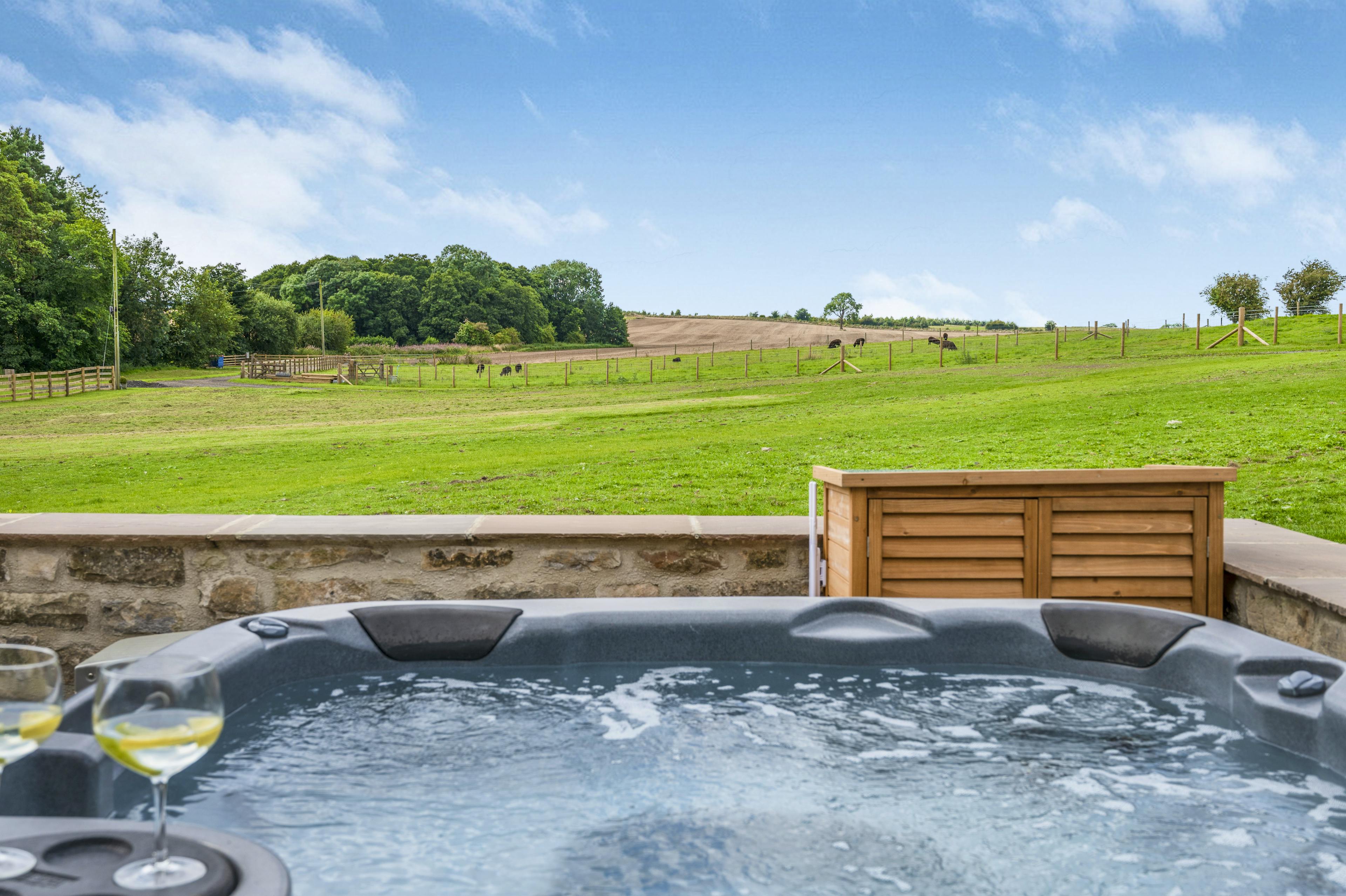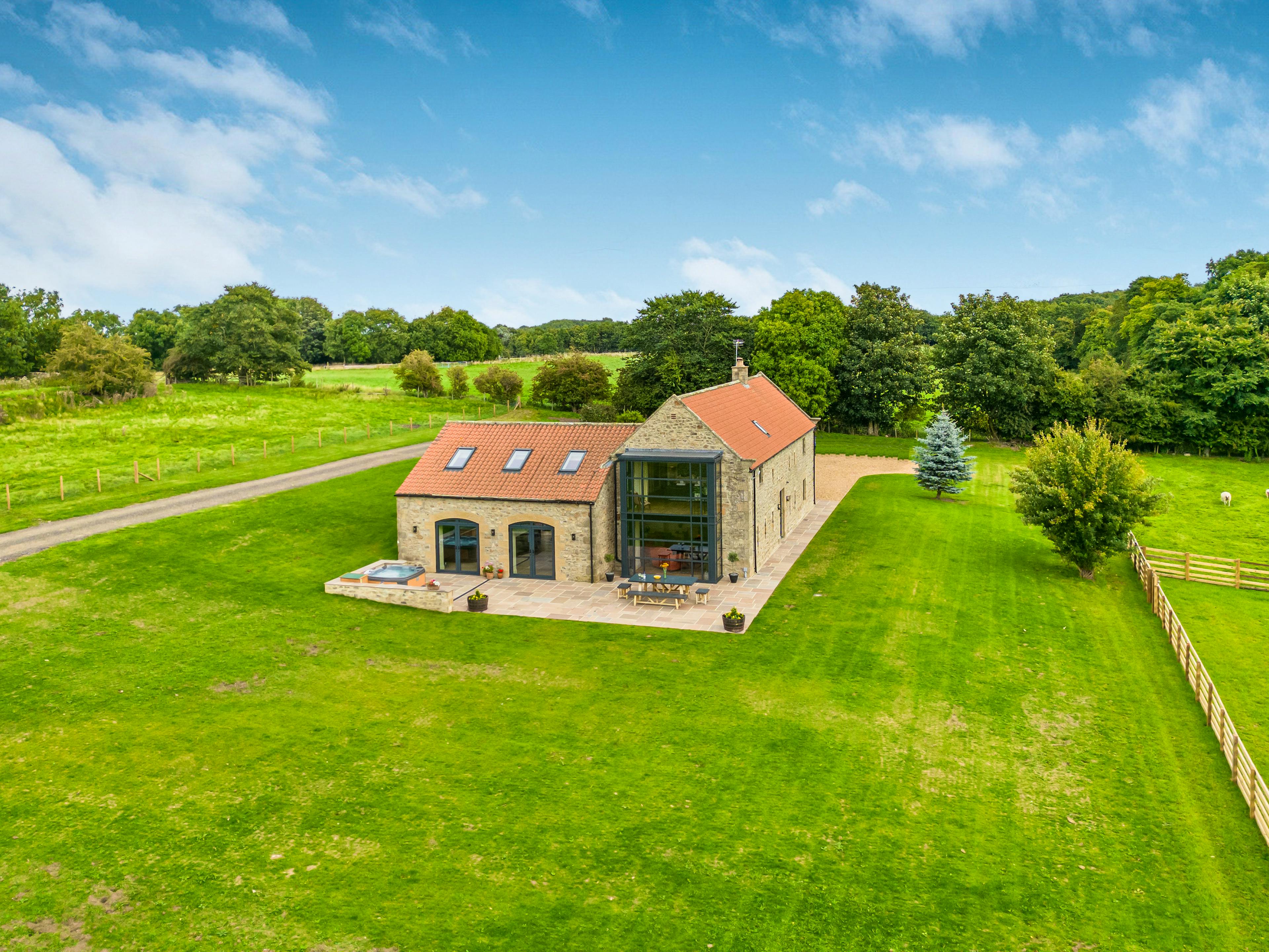 Contemporary farmhouse with views of North Yorkshire’s countryside from the hot tub, perfect for groups of friends or family holidays.