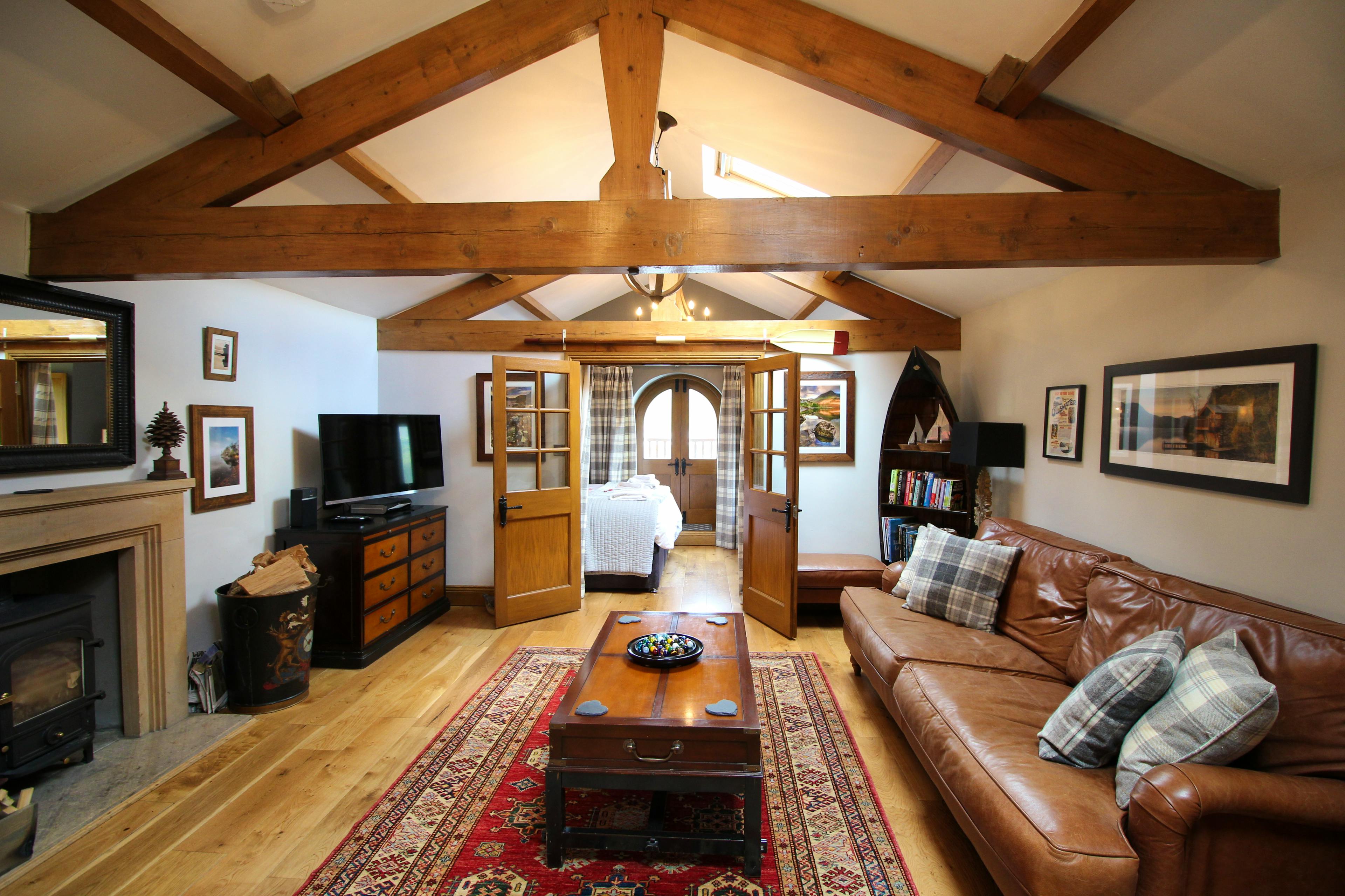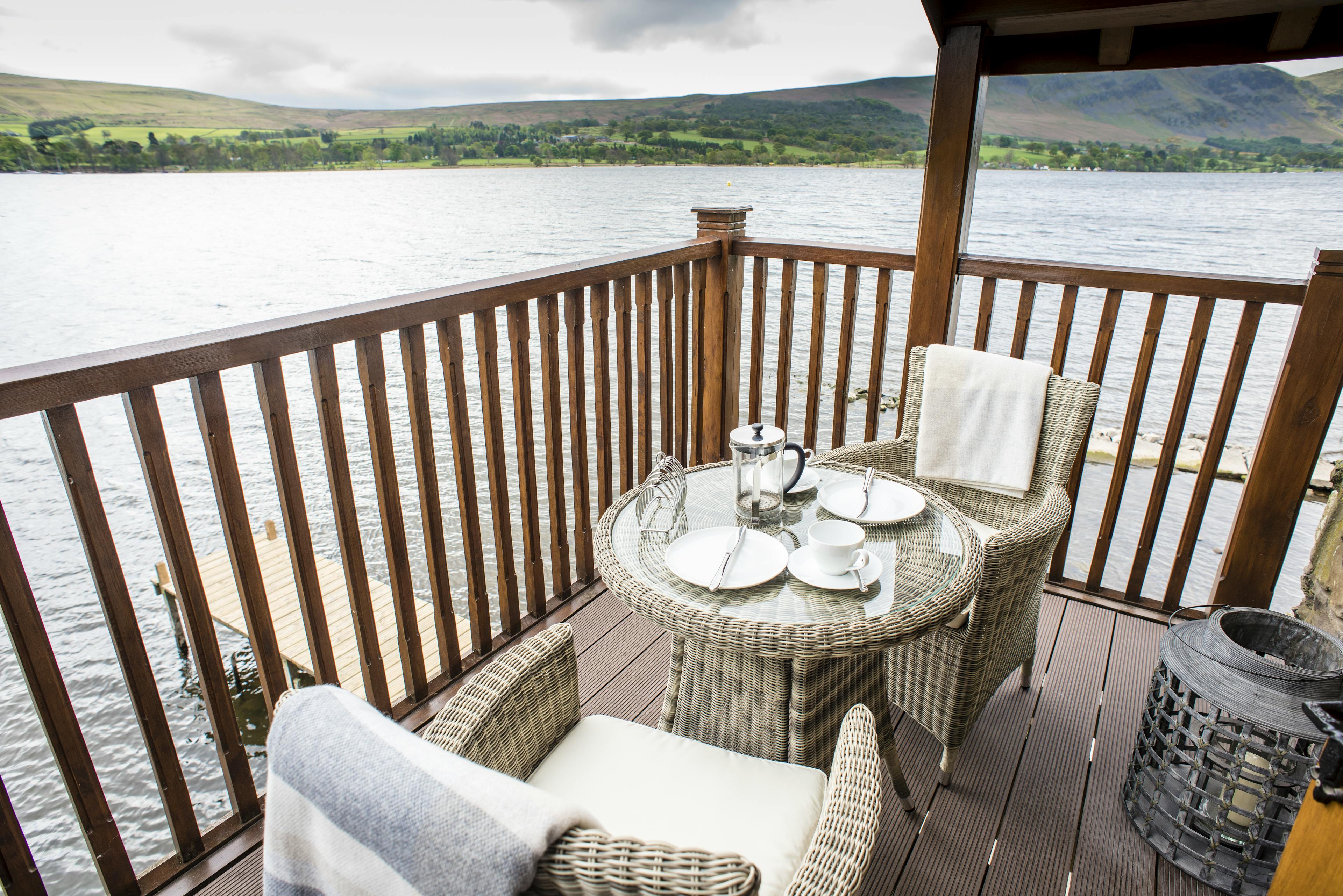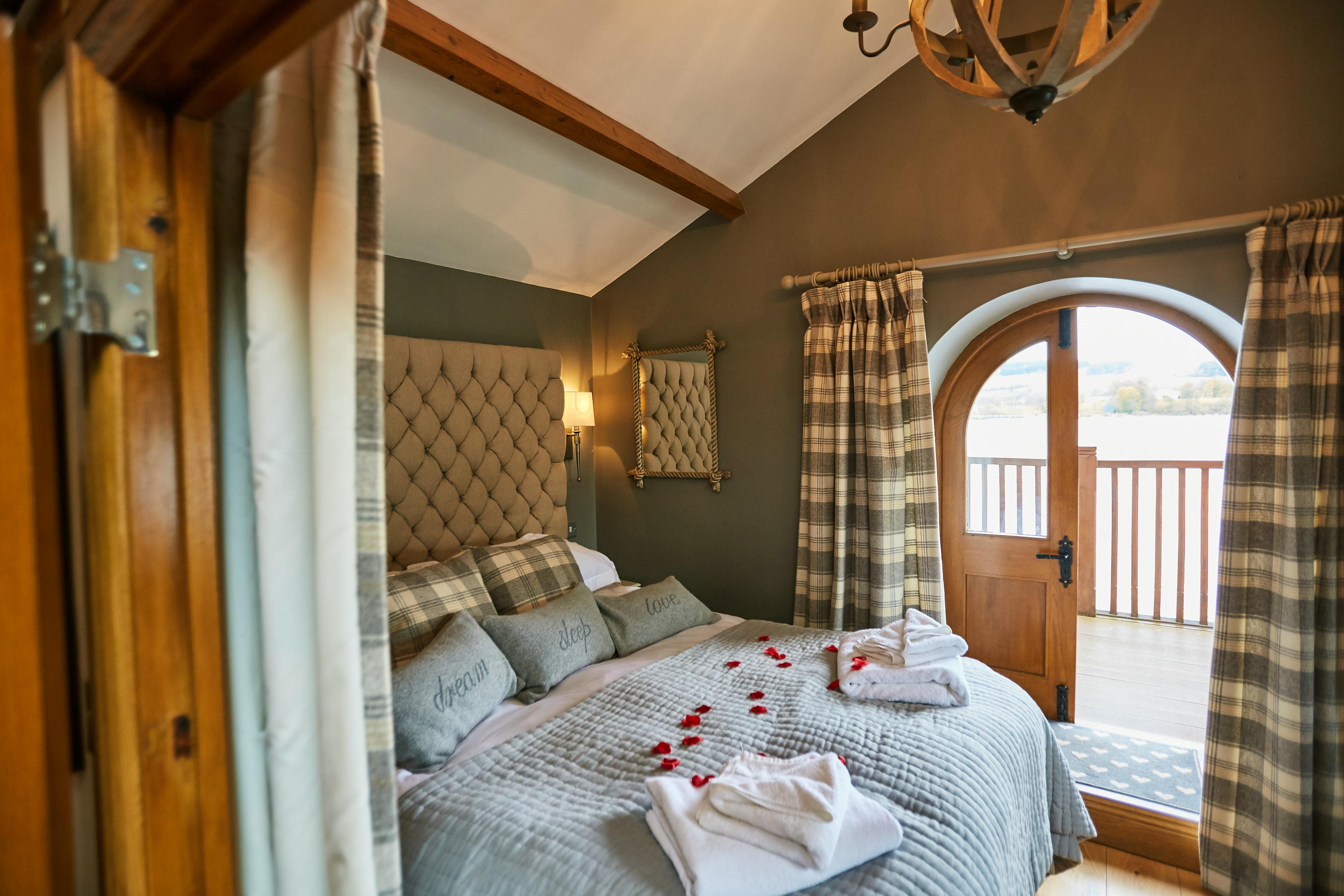The bedroom features a roll top bathtub and double doors leading out to the balcony which protrudes over the lake, offering spectacular and unique views of Ullswater with mountains to the south and rolling hills to the north.