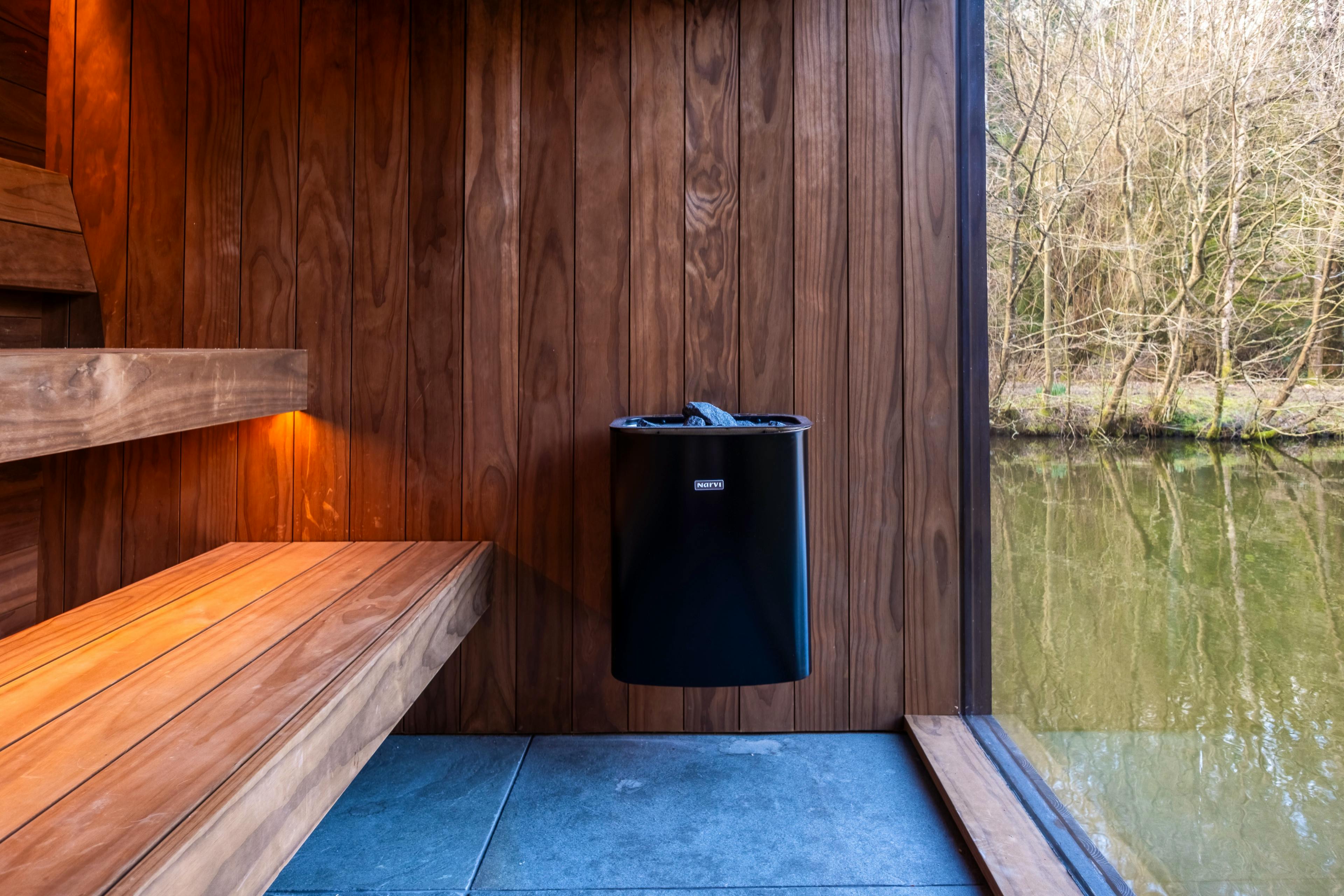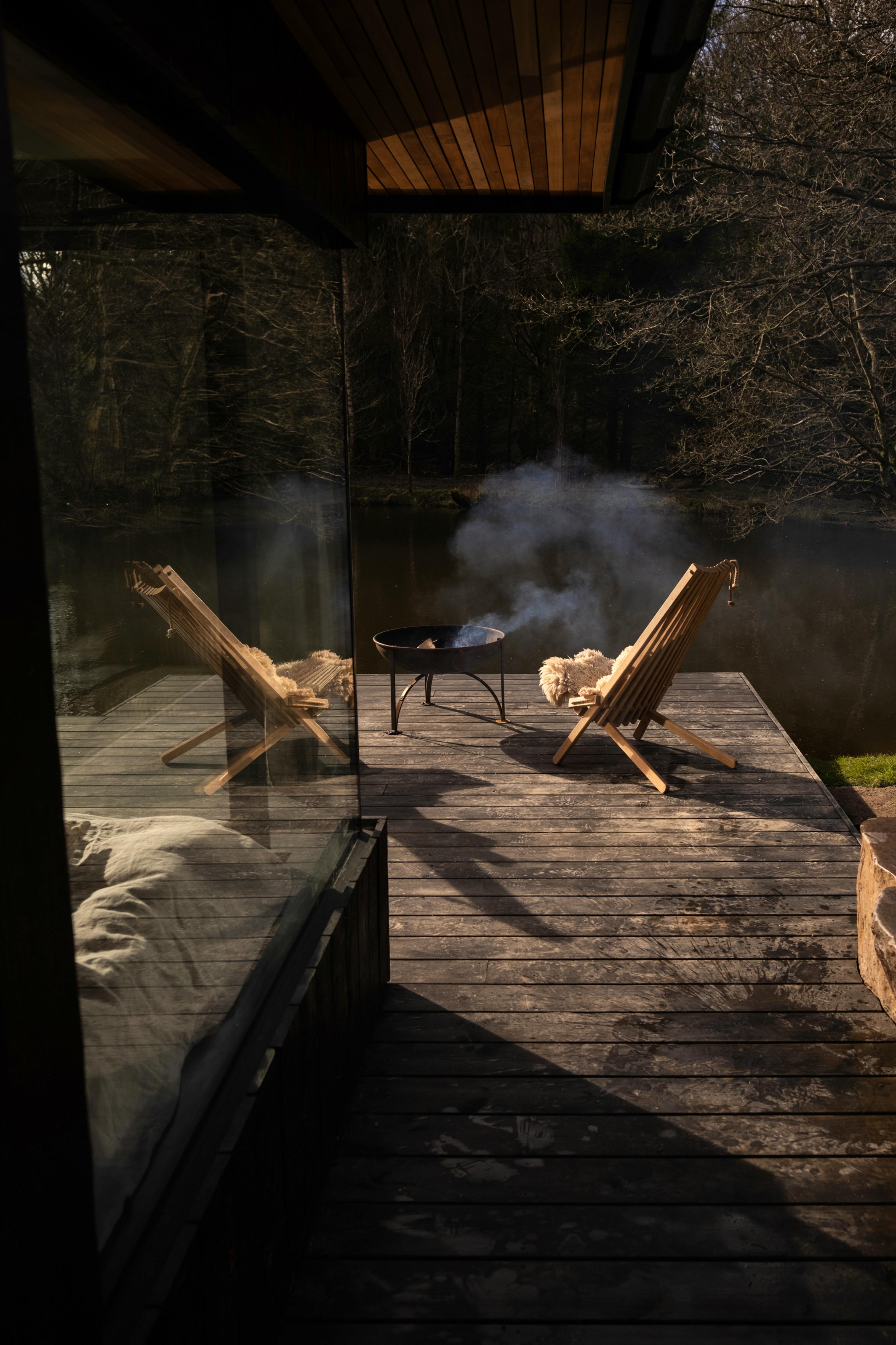 Magical lakeside retreat in rural Herefordshire with a floating sauna, hand-carved outdoor bathtub and beautifully thought out interiors.