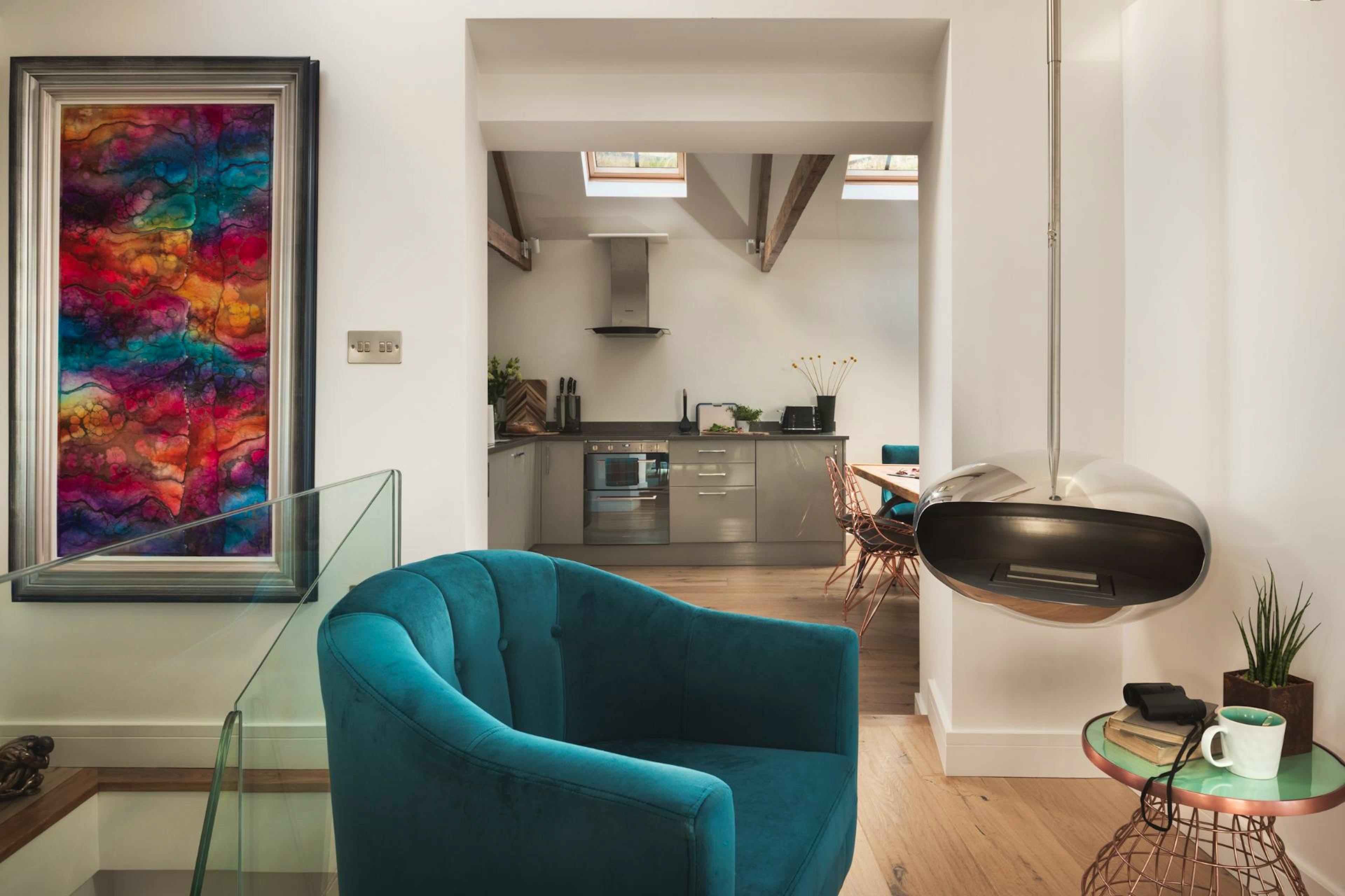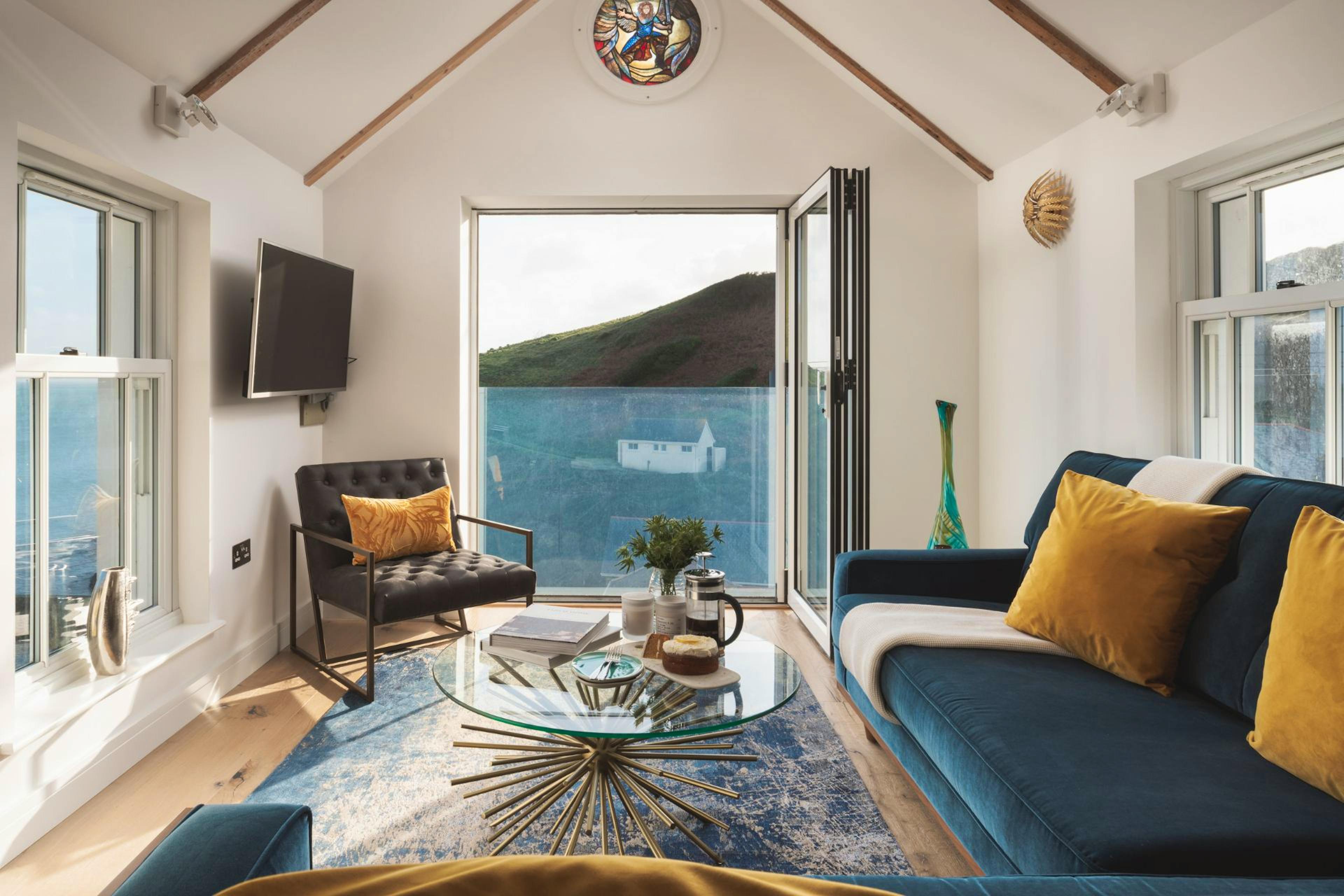 Light-filled lounge with tall sash windows, a large L-shaped sofa and a Cocoon bio-fuel burner for cosy evenings.
