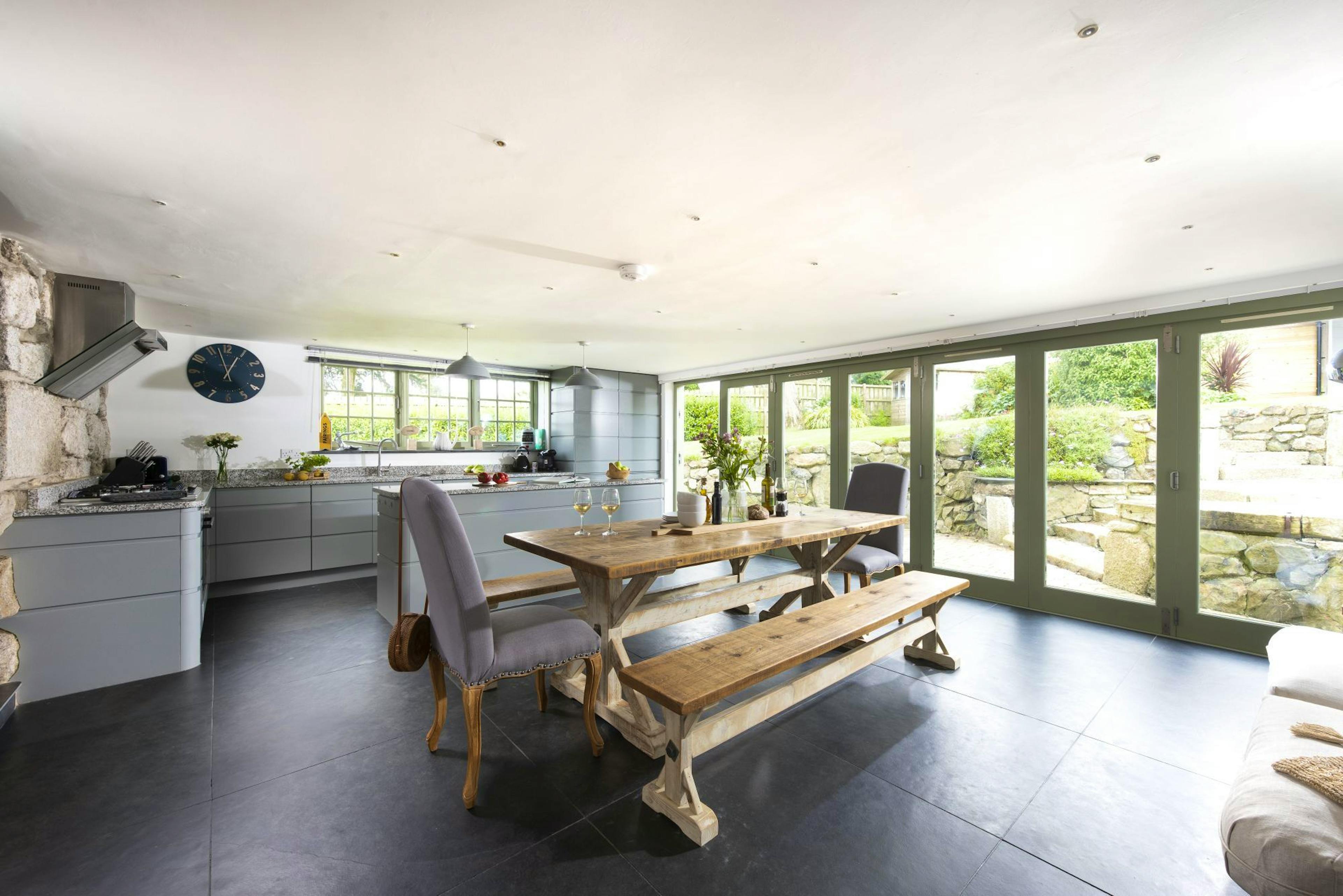 The open-plan kitchen/diner has slate flagstone flooring, full-width bi-fold doors and a snug area, creating a perfect space for indoor/outdoor entertaining.