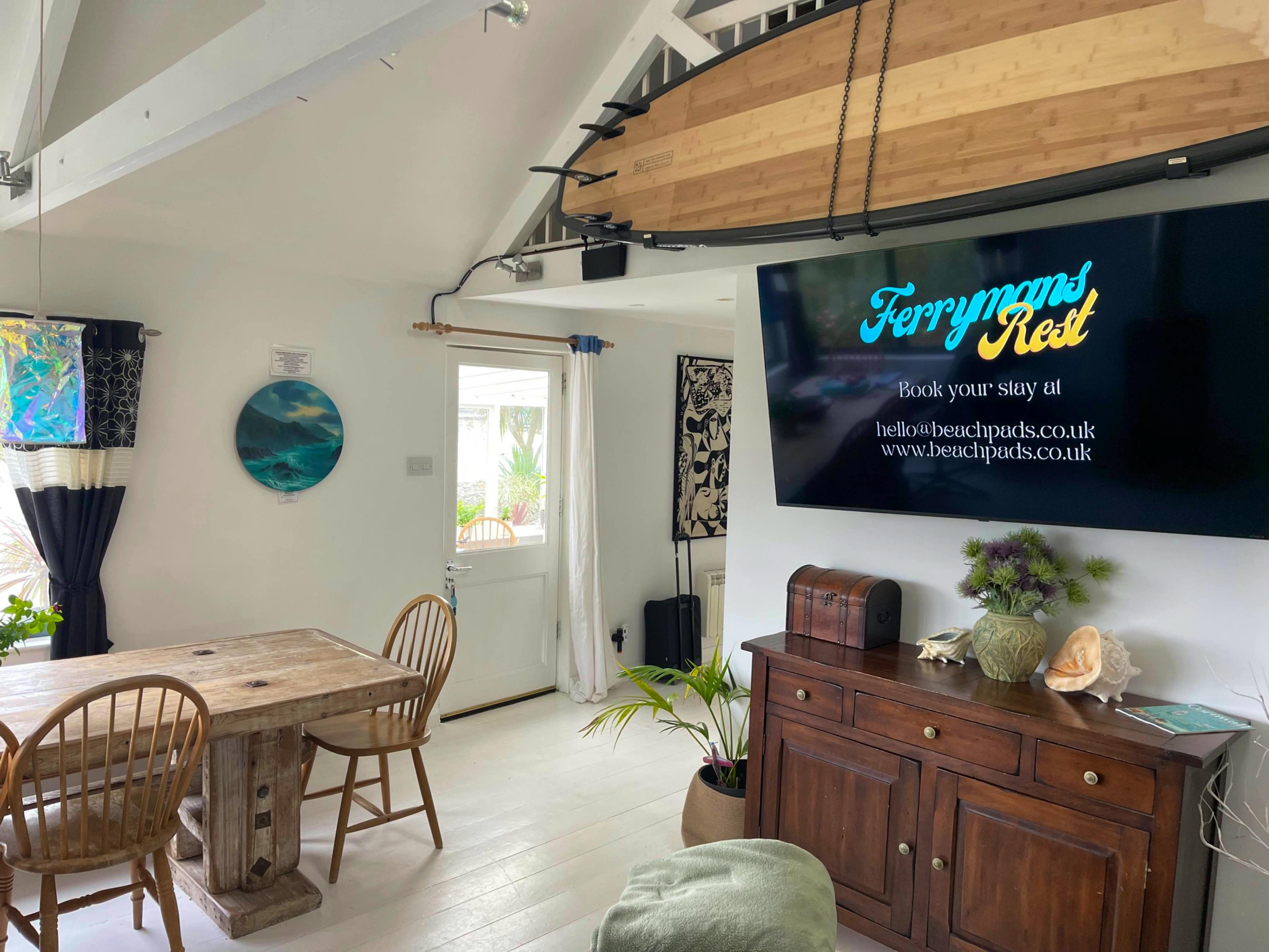 This wonderful Cornish holiday home overlooking St Ives Bay and Godrevy Lighthouse in Lelant is everything you could hope for in a seaside house and would be perfect for up to 10 people. This home by the sea is ideal for friends or family, seeking sunshine, sea and fresh Cornish air. When you walk in to Ferryman's Rest you'll be delighted by how light, cheerful and welcoming the space is. There's a long fully equipped galley kitchen with patio doors opening onto the terrace, it's open plan and connects to a large dining and living area with a big table where you can enjoy long lazy suppers. The living area has a big comfy sofa and a wood burner for cooler evenings in watching movies or playing games. This area also leads into a big sun room with another large dining table that provides a great view of the bay and would be perfect for bustling breakfasts and evenings tucking into some fresh local shellfish with crisp white wine. The décor is very seaside-centric with white wooden floors, high beamed ceilings and beach inspired art and ornaments dotted around. If you're visiting in the summer you'll probably want to spend the majority of your time out on the gorgeous terrace. This is a wonderful treat with a BBQ for alfresco dining after a day on the sandy Lelant beach, which can be accessed via a flight of steps directly from the terrace. Famous for its crystal clear waters, this beach is also dog friendly all year and a great way to start the day with your furry friend. Enjoy a day of swimming, strolling and sandcastle building before heading back to the terrace for a cold drink, something hot off the BBQ and the sound of the sea lapping gently below. As if this weren't enough, there's also a hot tub from which you can watch the stars come out at night. When it's time to sleep you have four great rooms to choose from. One has up to four singles which would be good for children or friends sharing and there are a further two king size rooms and a triple bunk room consisting of double below and single above. The décor in the rooms is simple, clean and cool and you'll find the beds very comfy and decked out with high quality linens and fluffy pillows promising a peaceful night's rest with the sound of the sea for company. In the morning you can make use of the white-quartz tiled family bathroom which has a big bathtub with a shower overhead and heated towel rails to keep things warm and fluffy. There's also a separate shower room so no need for queues in the morning! Ferrymans Rest is ideal for dog owners as it sits on an amazing dog-friendly beach. The beach is beautiful and dog-friendly all year round, so you can take your canine companion out for lovely walks throughout your stay. Enjoy breakfast out on the terrace with that special St Ives light and make your plans for the day. You might not want to leave this idyll by the sea, but if you do, there is plenty to be enjoyed in the area. Make use of the West Coastal Path and enjoy a morning walk with fabulous views. Lelant is a peaceful village and has two pubs and a bistro where you can stop off at for a pint and a bite to eat, or take a longer walk along to St Ives where you'll find a pretty harbour and some famous sandy beaches. There's also the Barbara Hepworth Museum, the former home of the leading Sculptress Barbara Hepworth, and the Tate where you can take in some lovely artwork. There is also the Leach Pottery in St Ives as well! If you fancy trying some water sports Hayle is great choice for kayaking, paddle boarding and surfing. If you're here for the food, head to Carbis Bay which has some excellent modern restaurants. The hosts also recommend a day trip to The Eden Project.