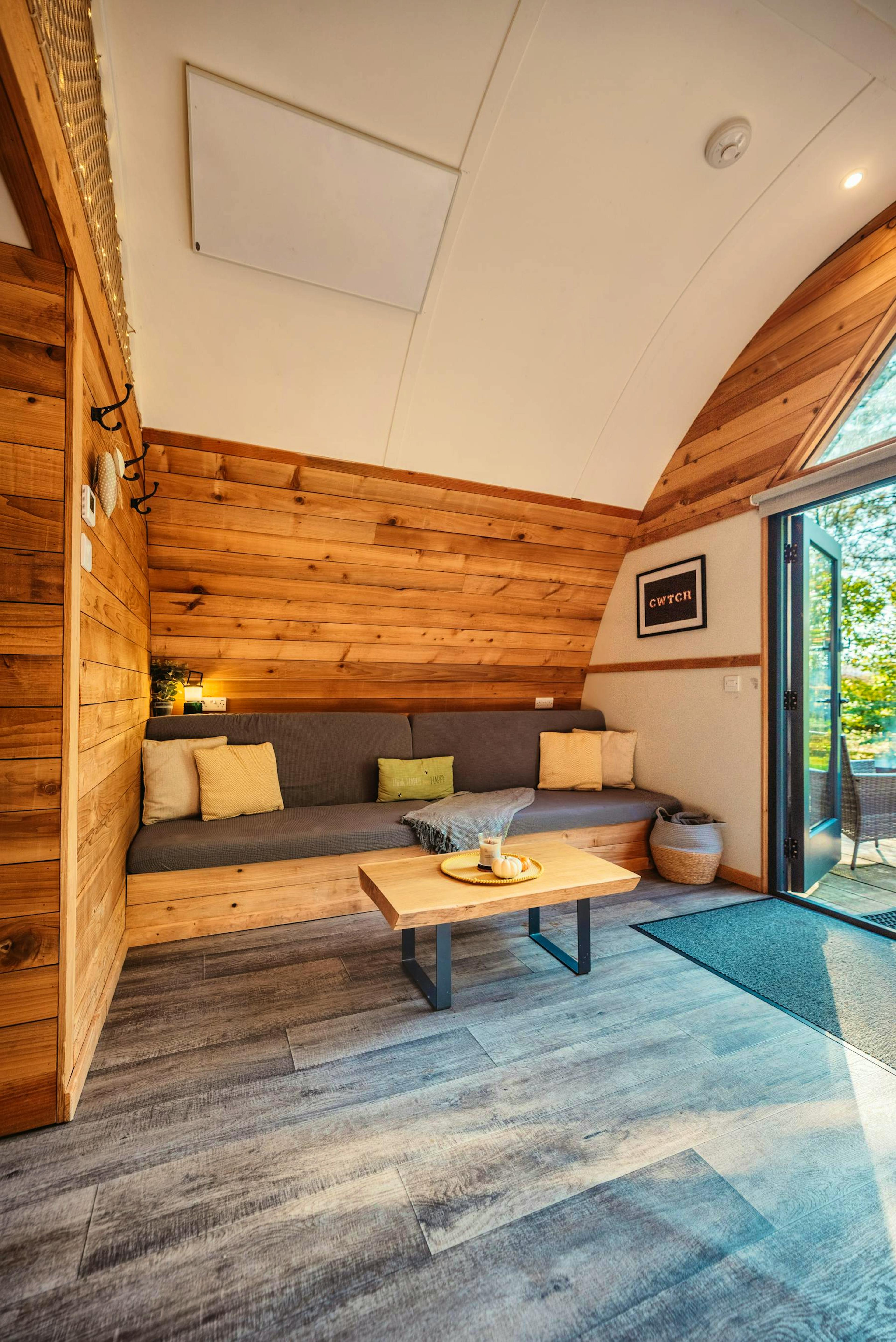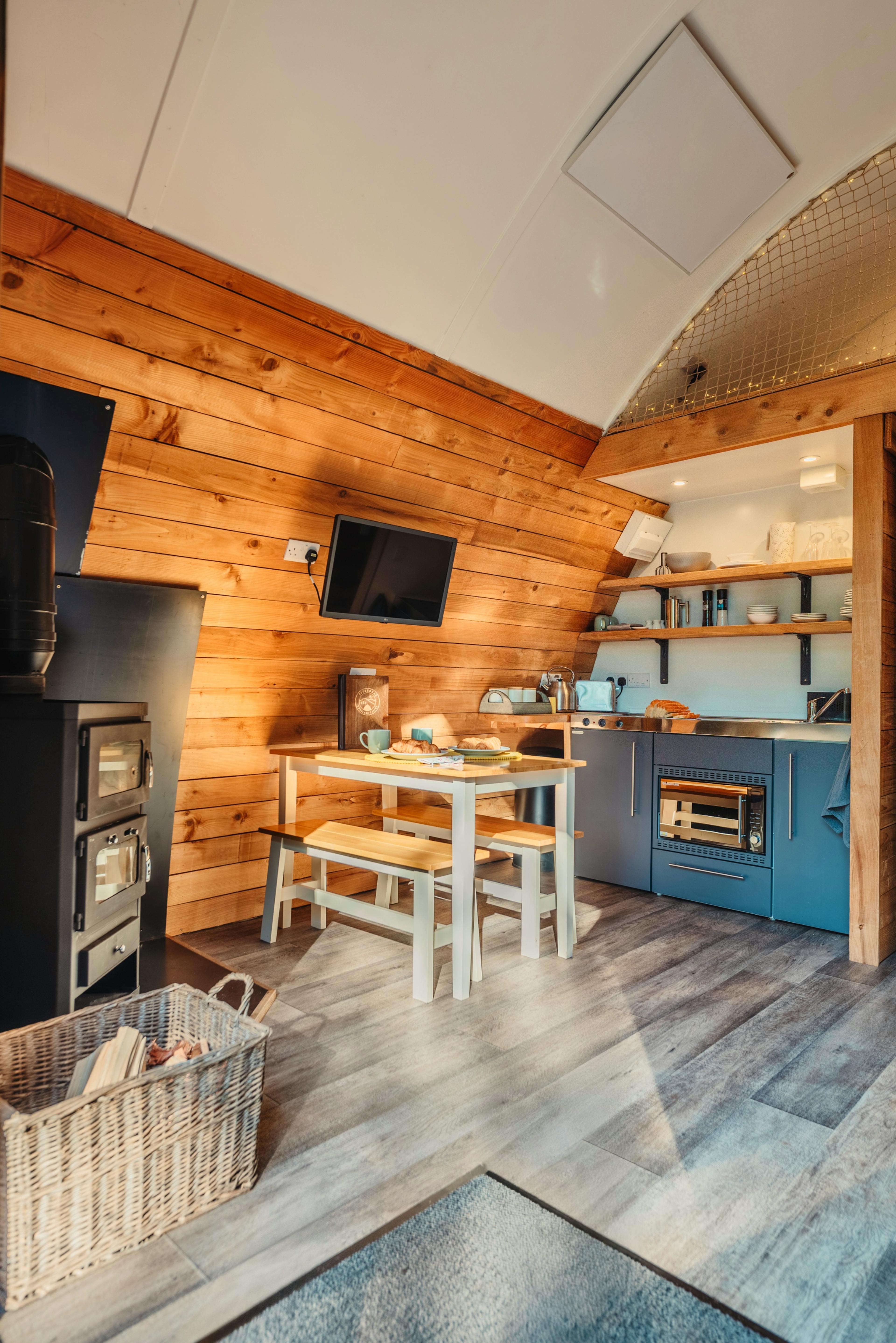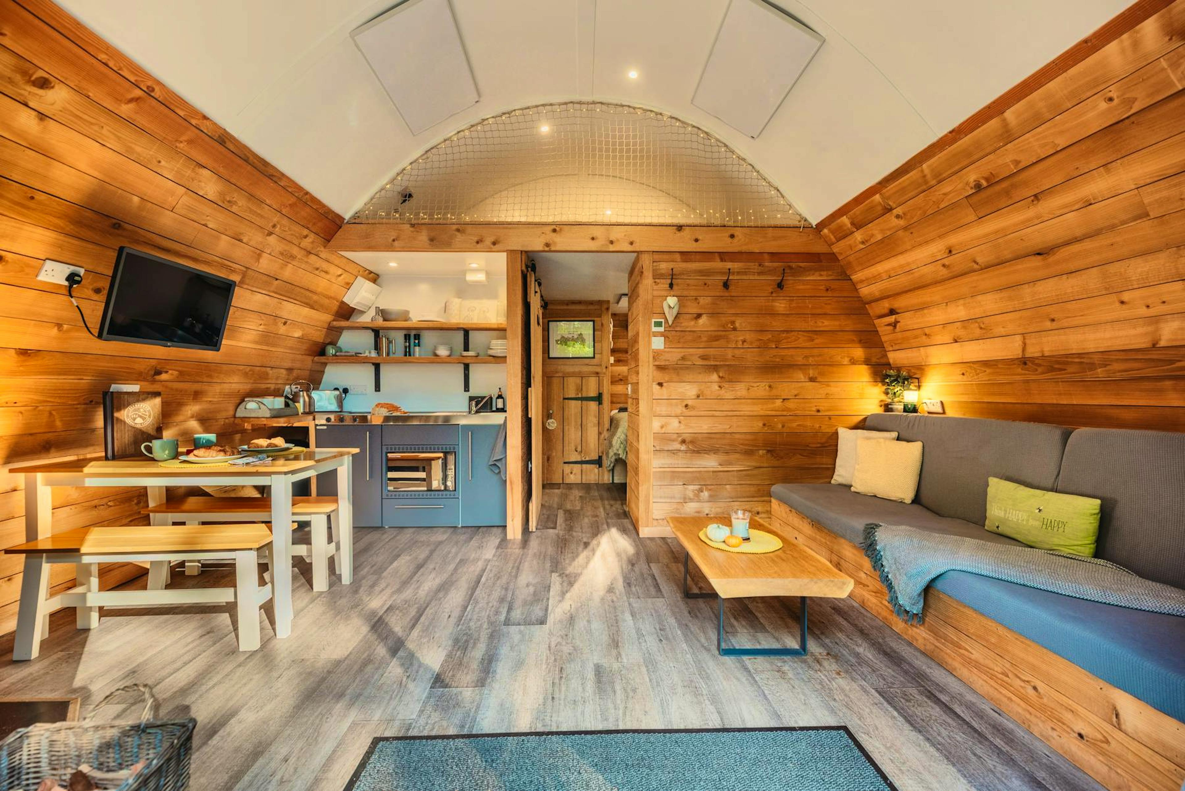 Step inside to find a charming living space with a comfy sofa, Smart TV with Netflix and large glass doors that frame stunning woodland views.